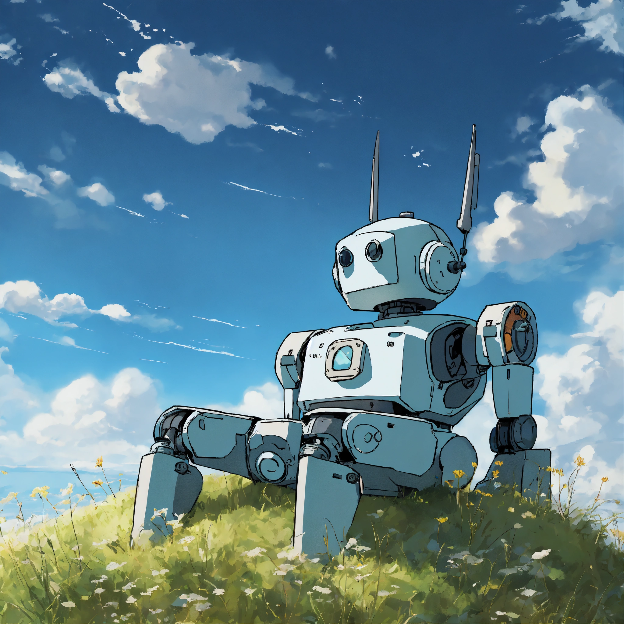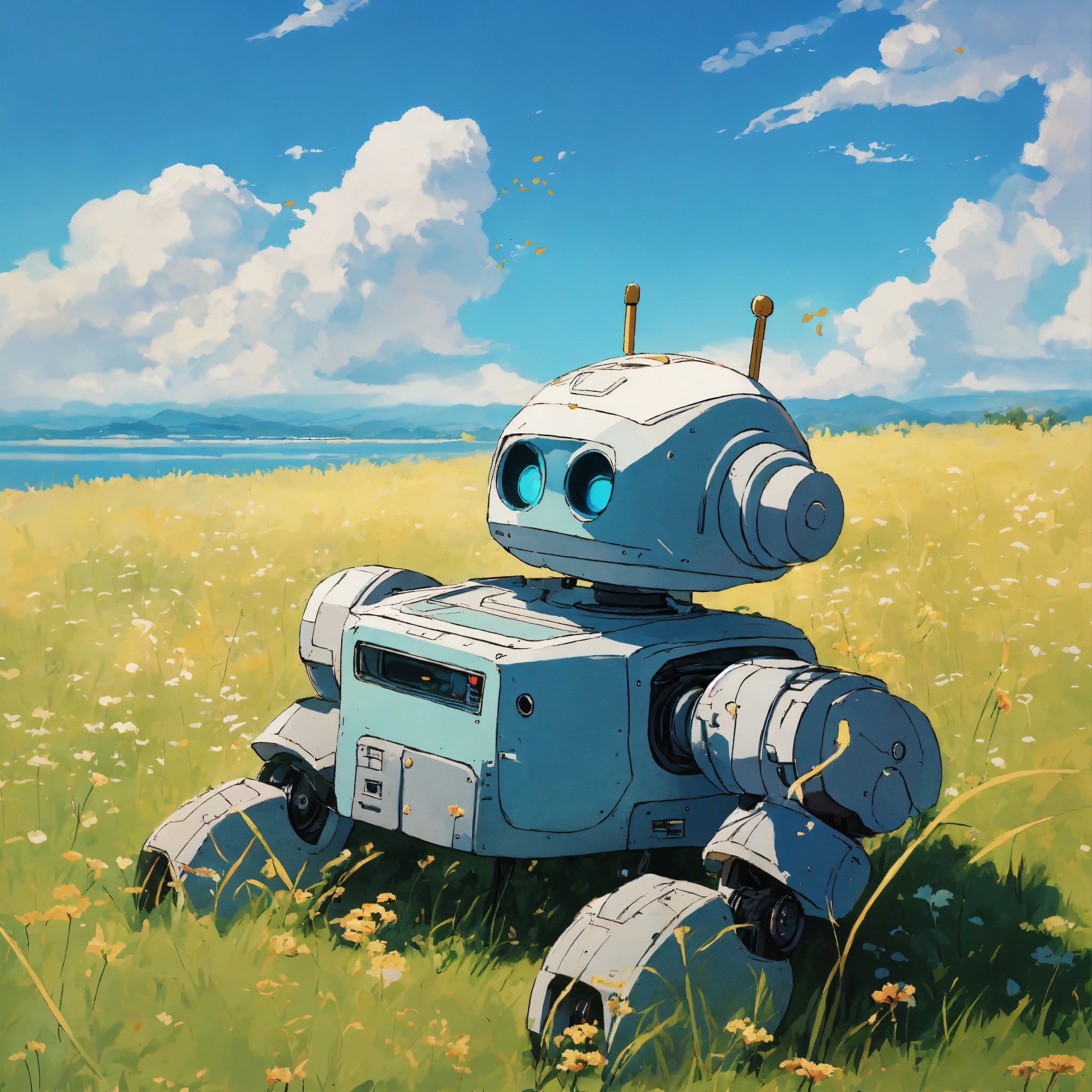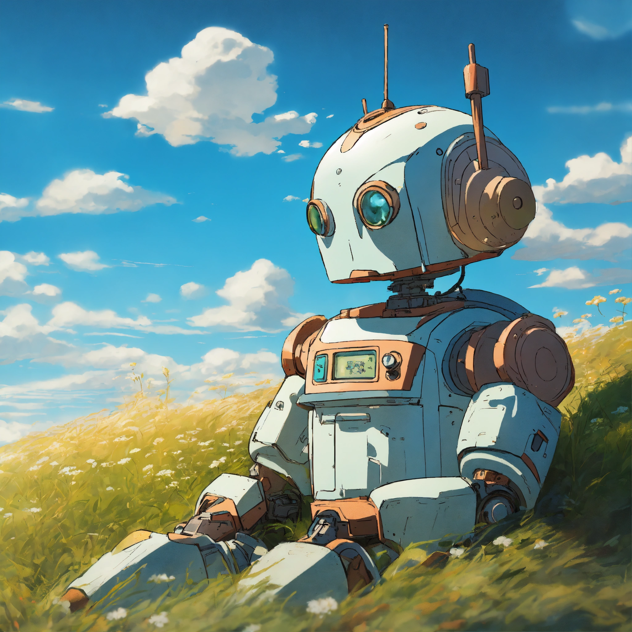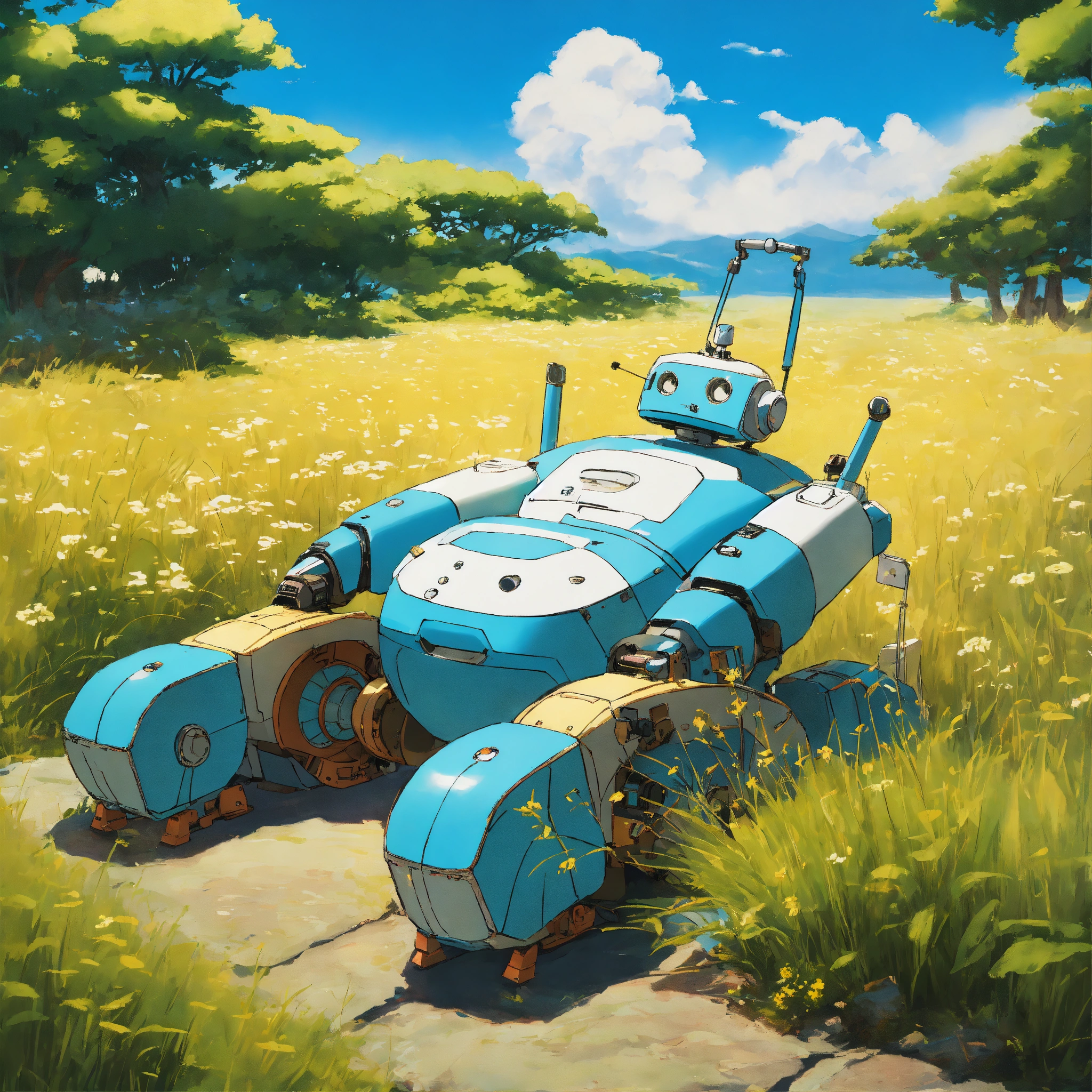 Japanese miyazaki hayao style art of a robot sleeping peacefully, the sky is blue with a few white clouds, a few grasses on a short step, 8k studio ghibli art