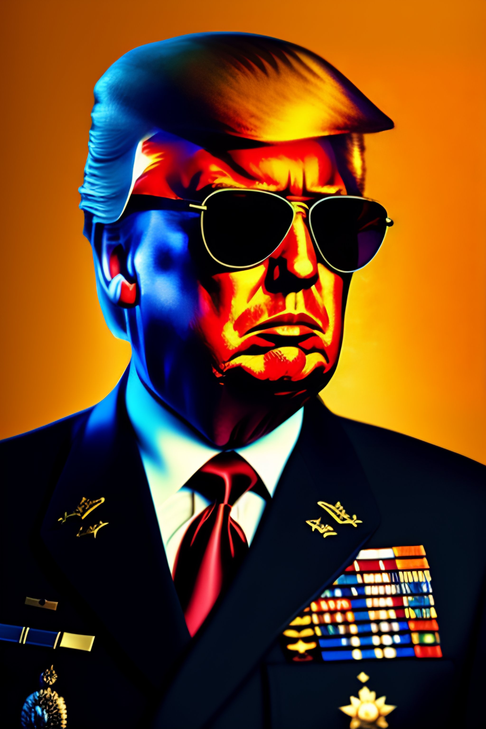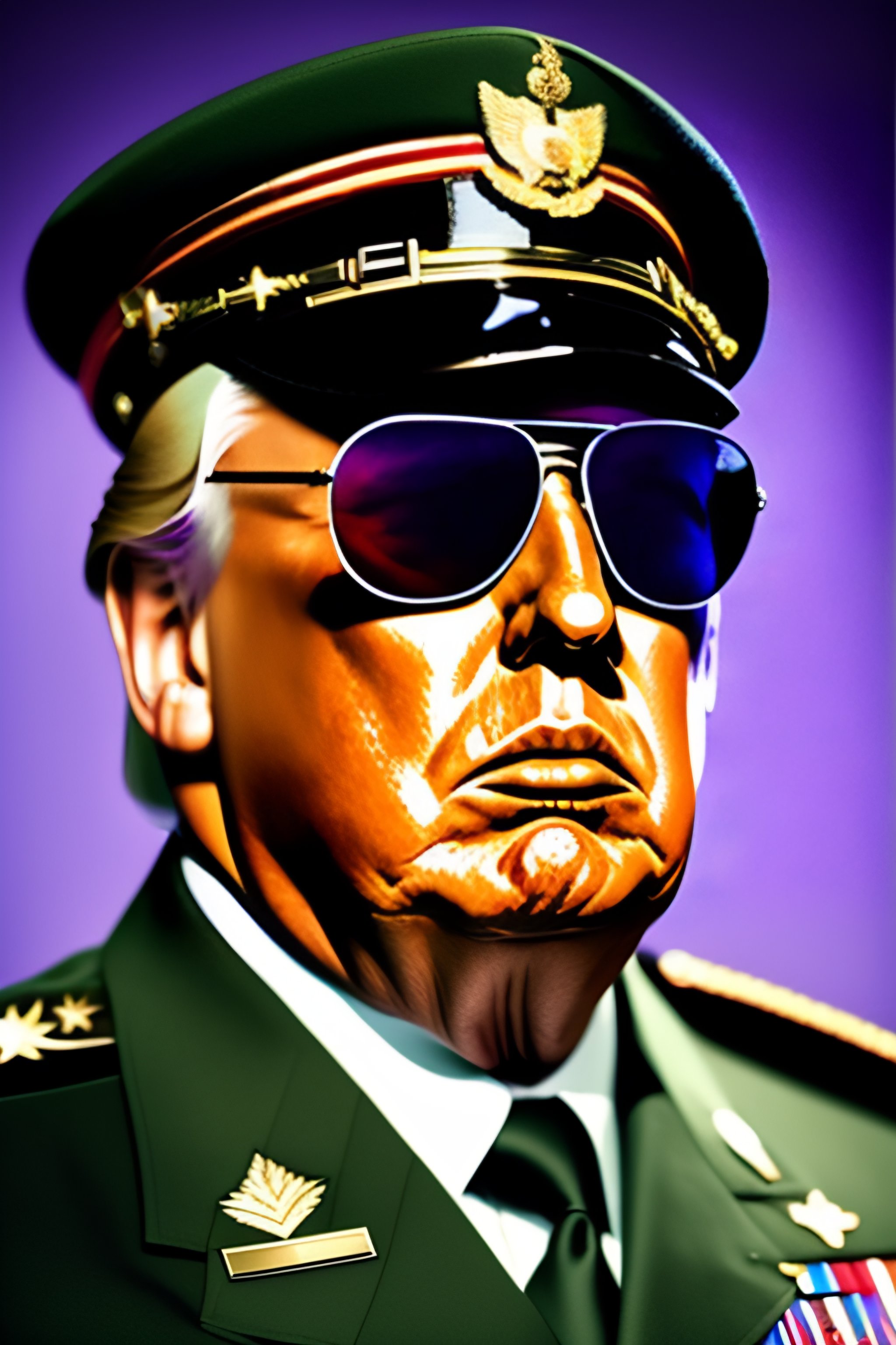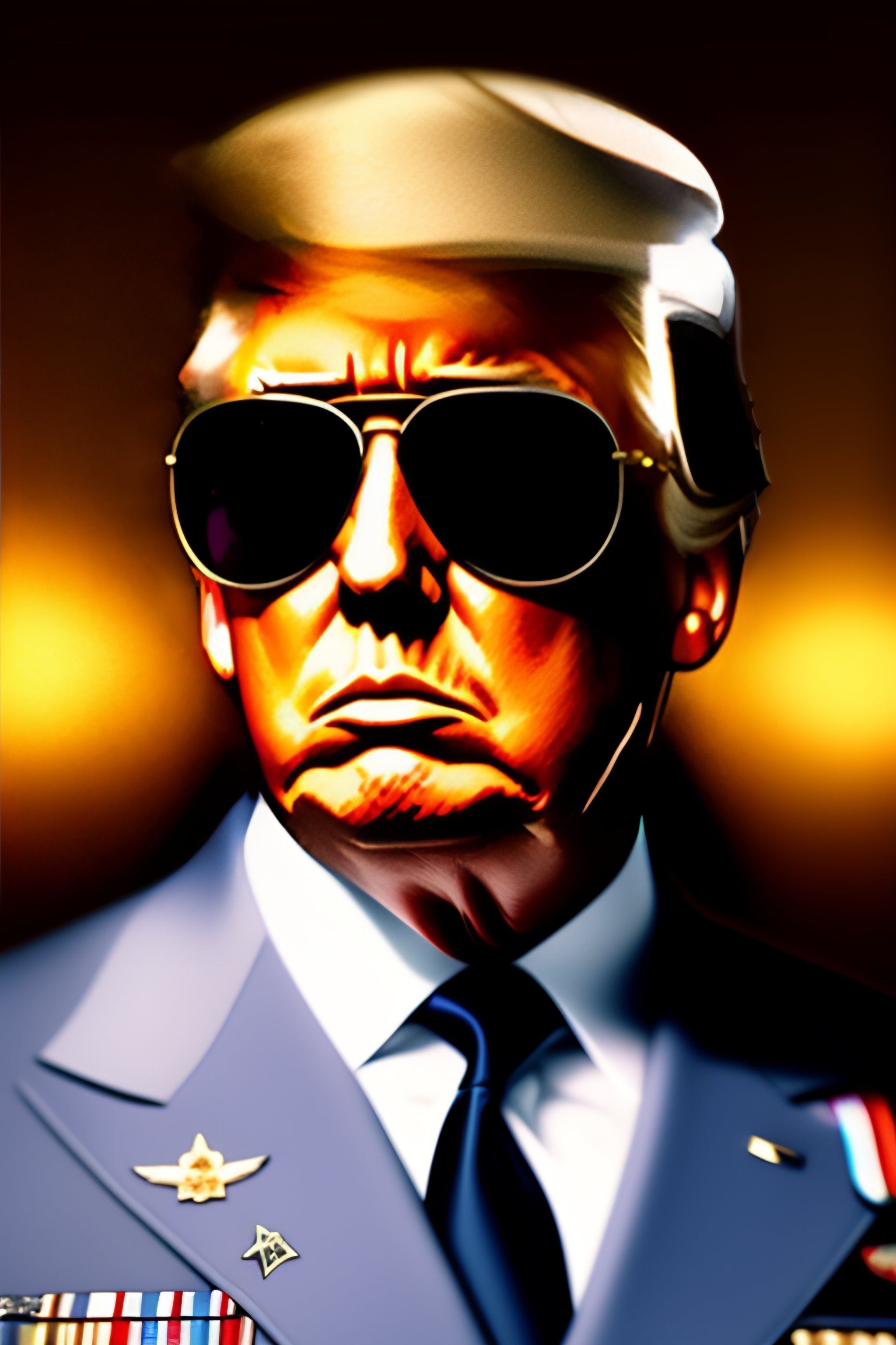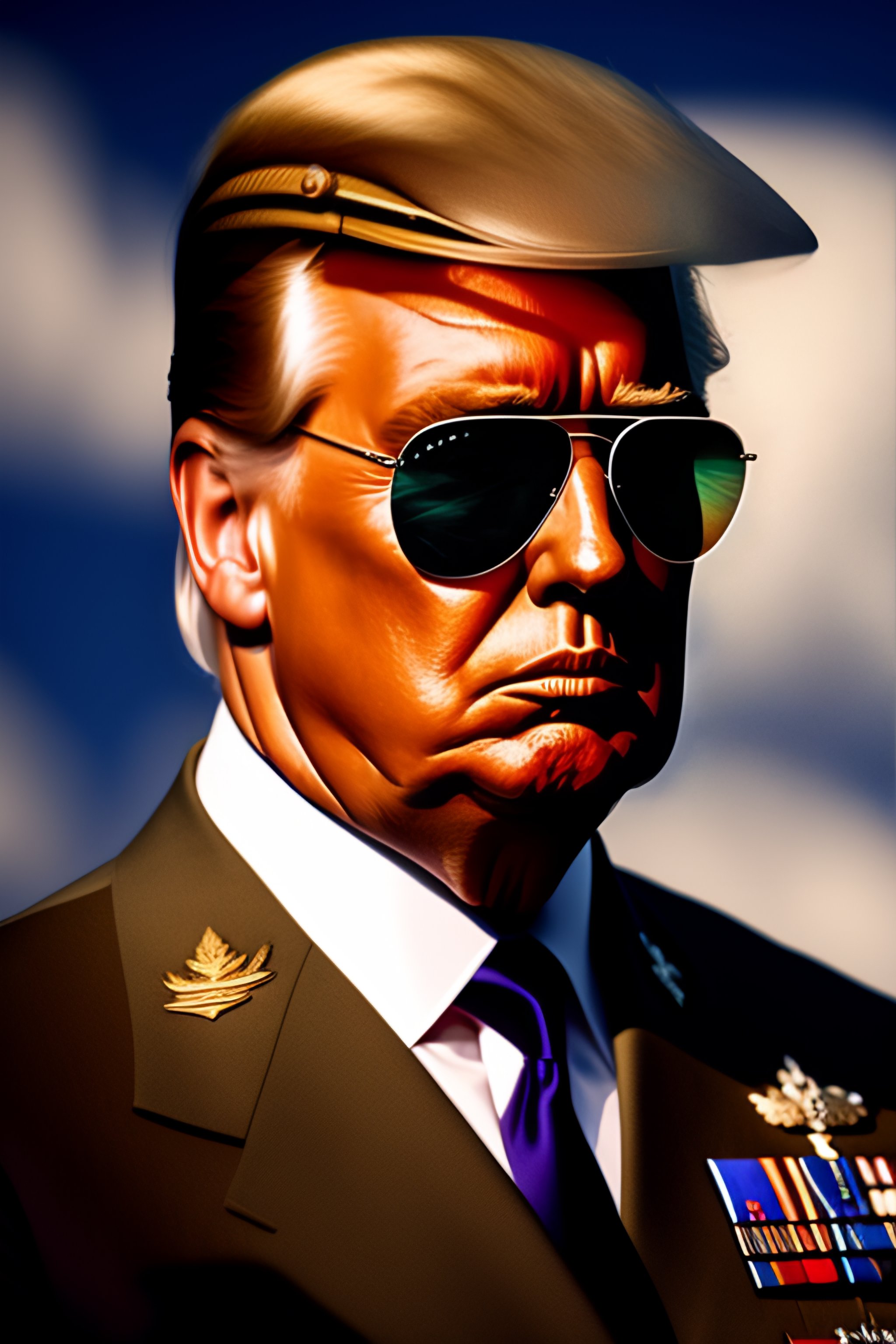 Portrait of donald trump in military uniform wearing aviator sunglasses