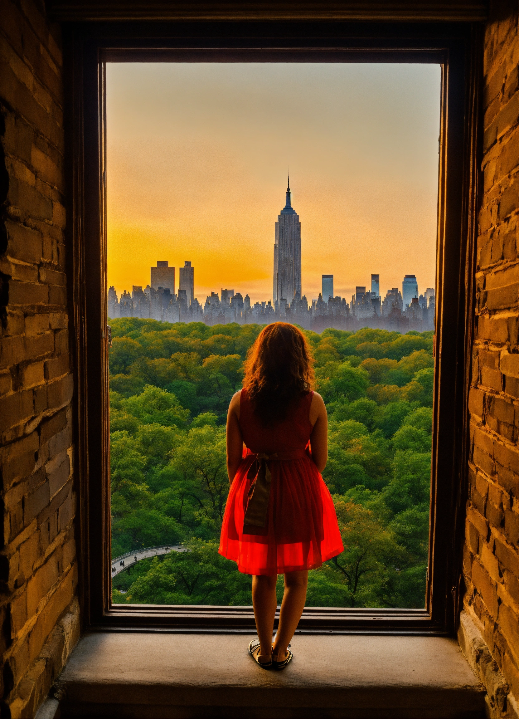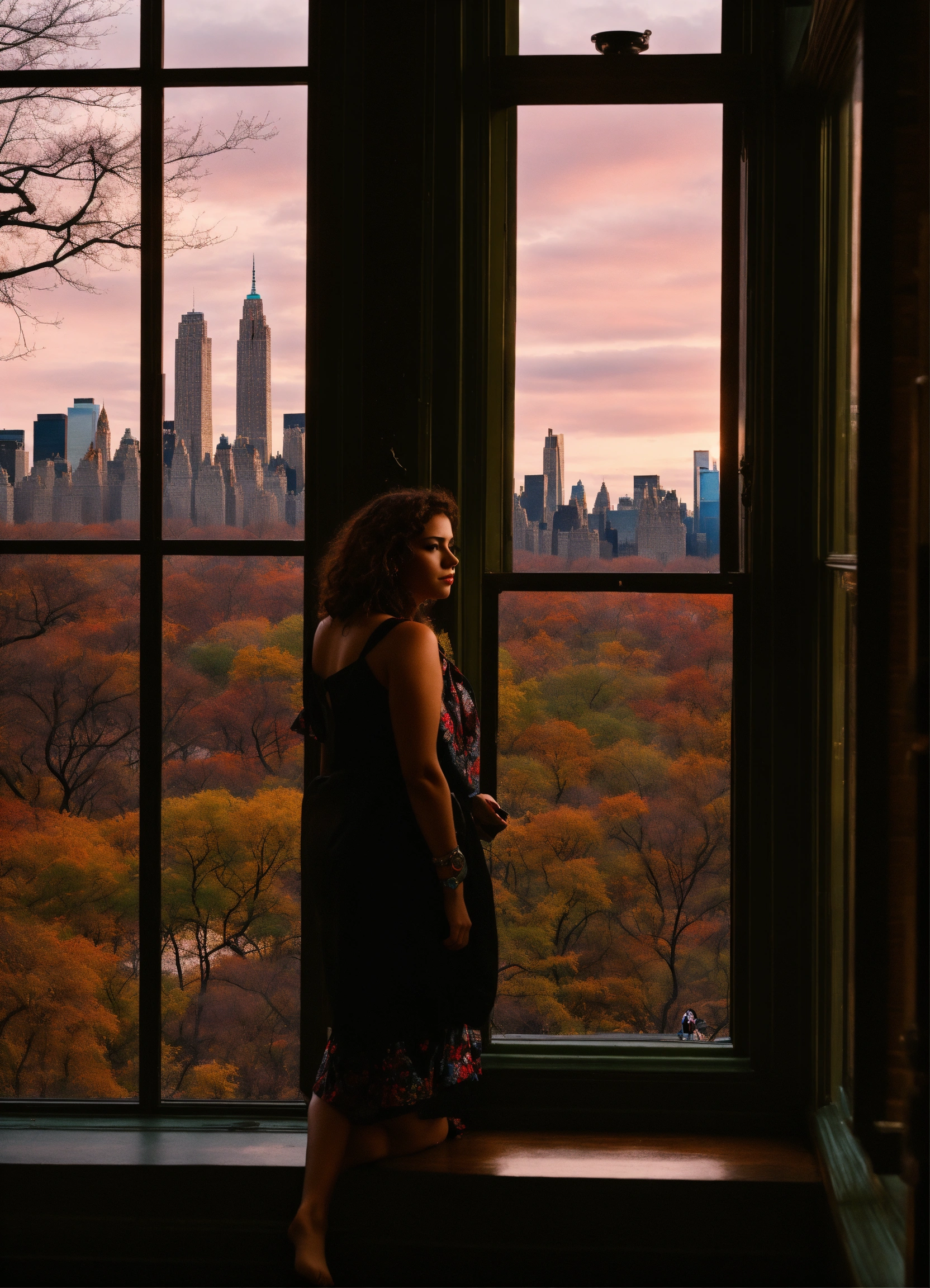 La silueta de una muchacha pensando acerca de la vida mirando su ventana en su apartamento en central park new york