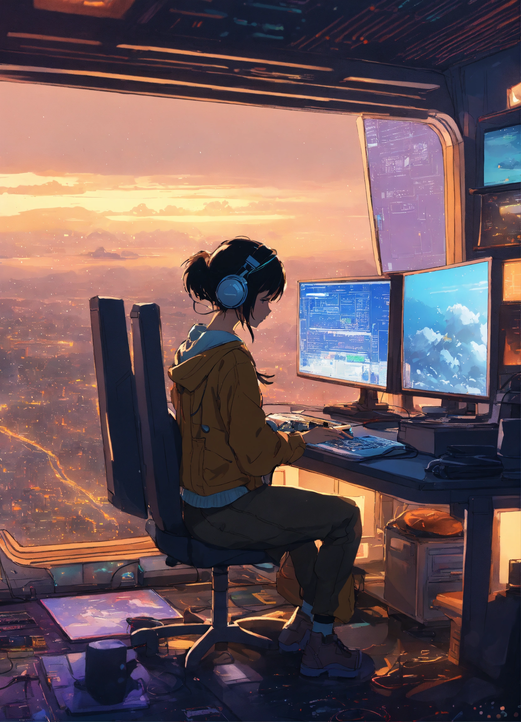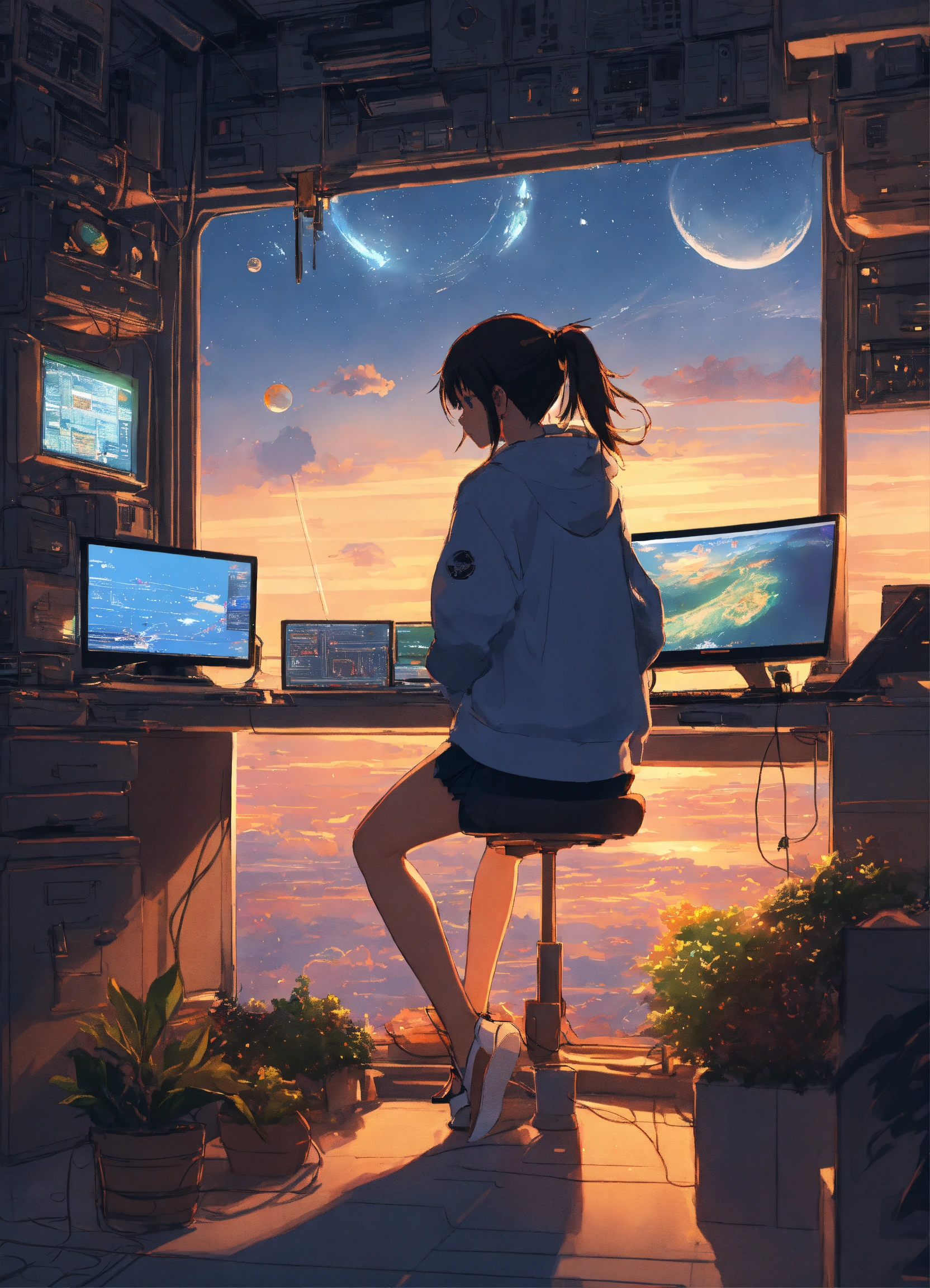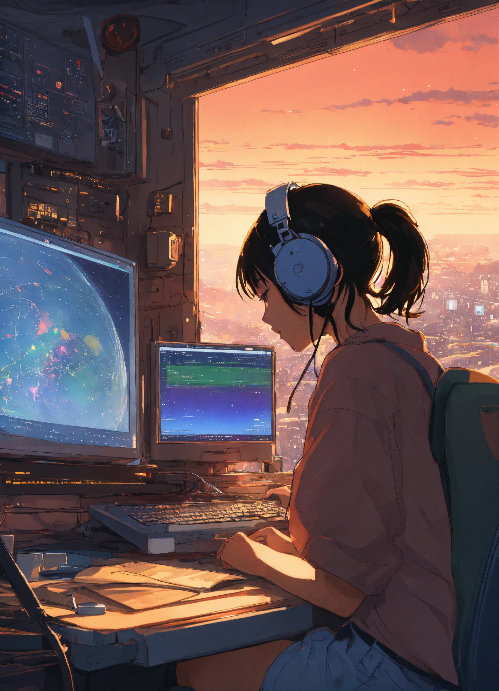 Create a high resolution artwork of lo-fi hip hop, anime girl is programming at a computer in a spaceship, artist, by makoto shinkai and ghibli studio, outlined silhouettes, dramatic lighting, highly detailed, incredible quality, trending on artstation, masterpiece, 8k, 2 monitors, book and a pen, saturn in the background