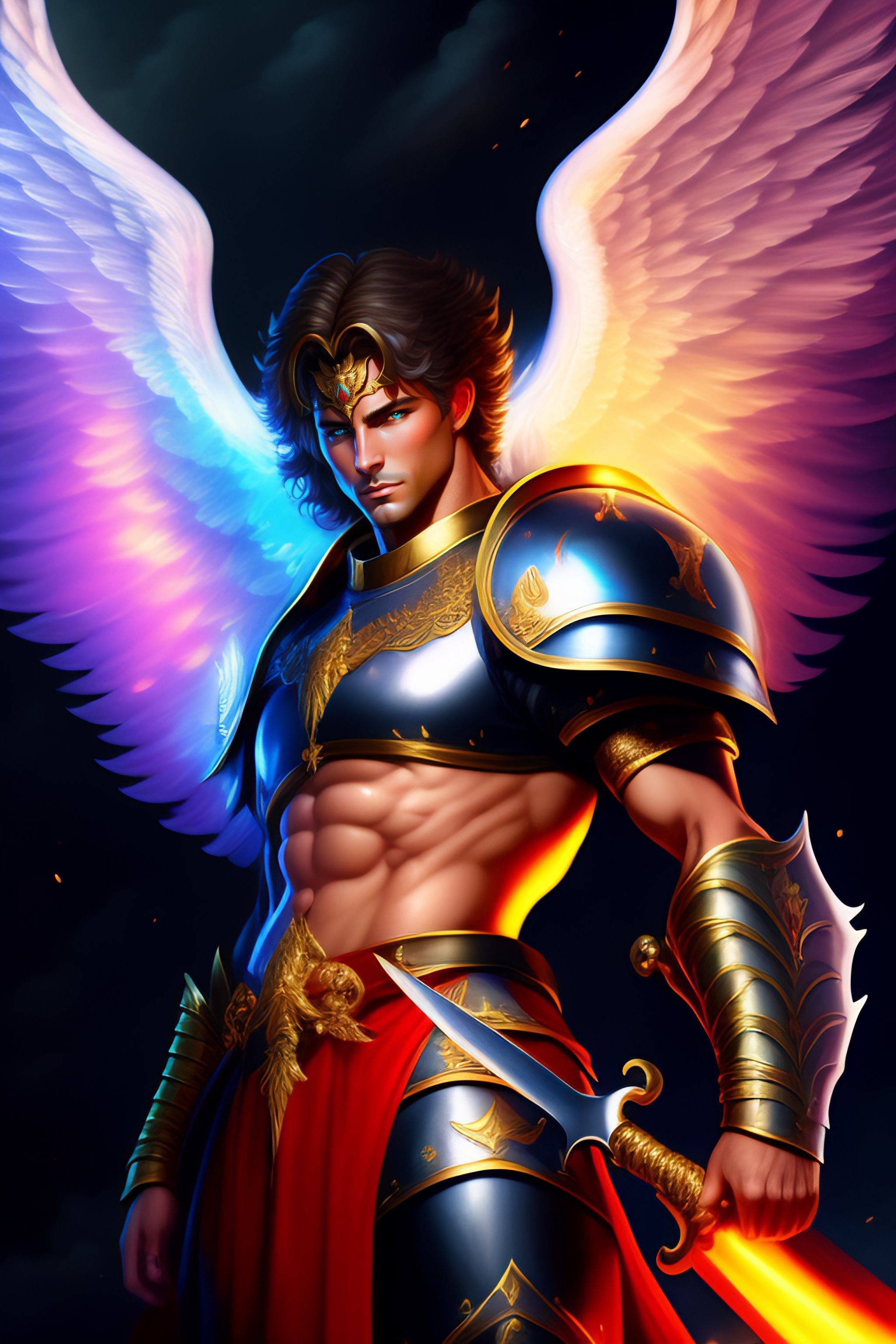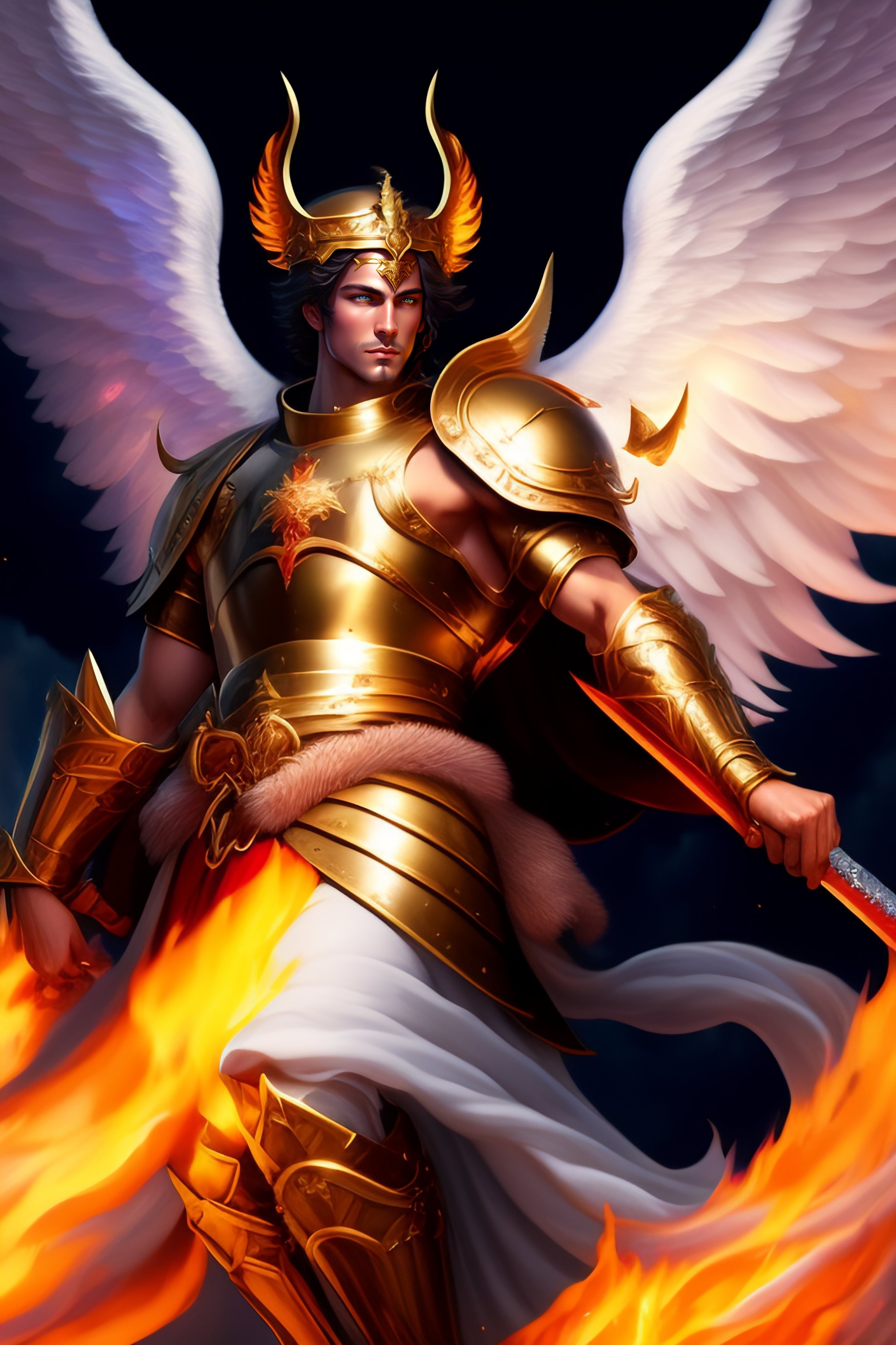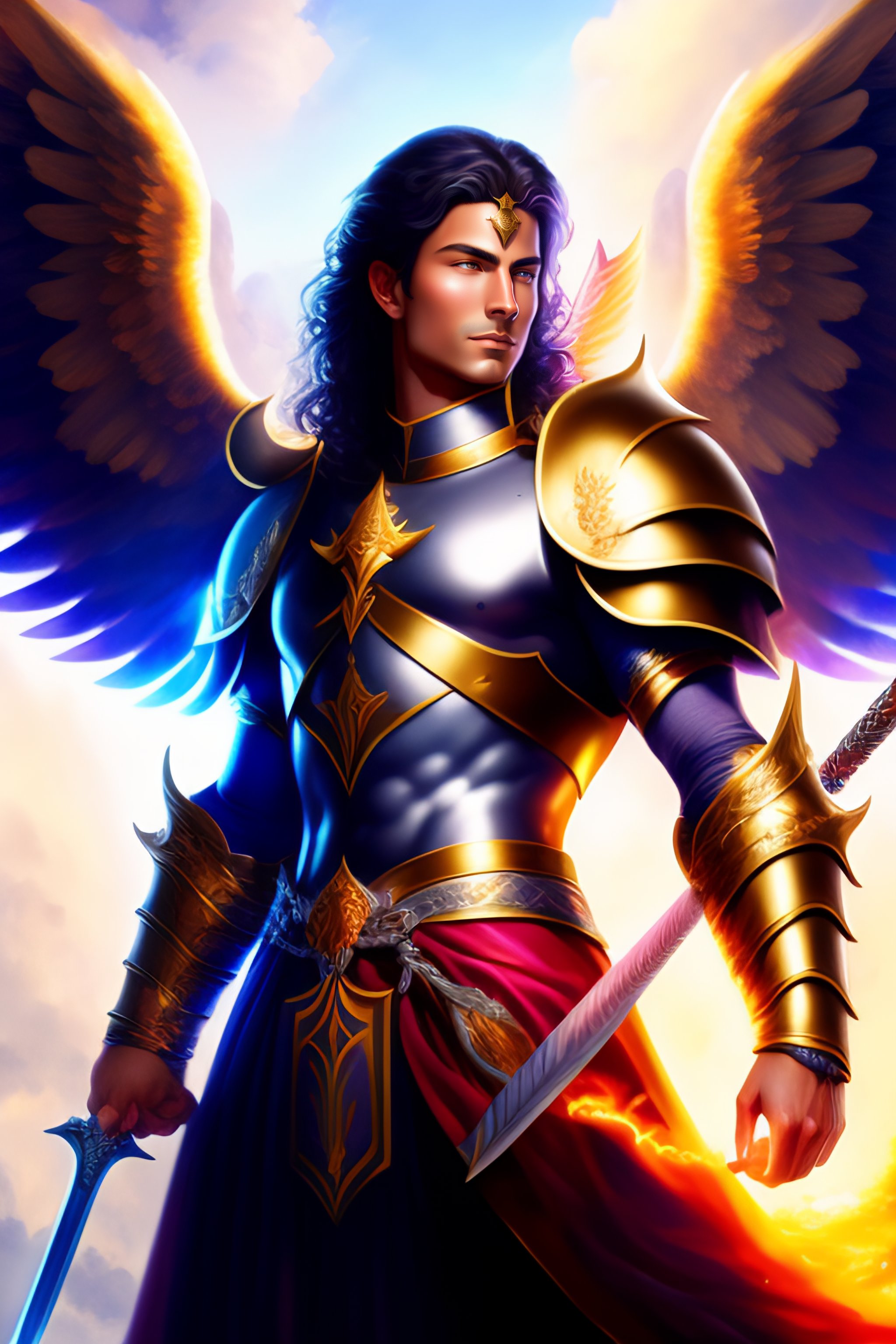 Saint michael archangel according to the bible, with sword, slaying the dragon, epic portrait of an angel, flaming above his head, flying in the sky, full body, with armor, best quality, ultra detailed, anime illustration, digital painting, shine, clouds, above the dragon