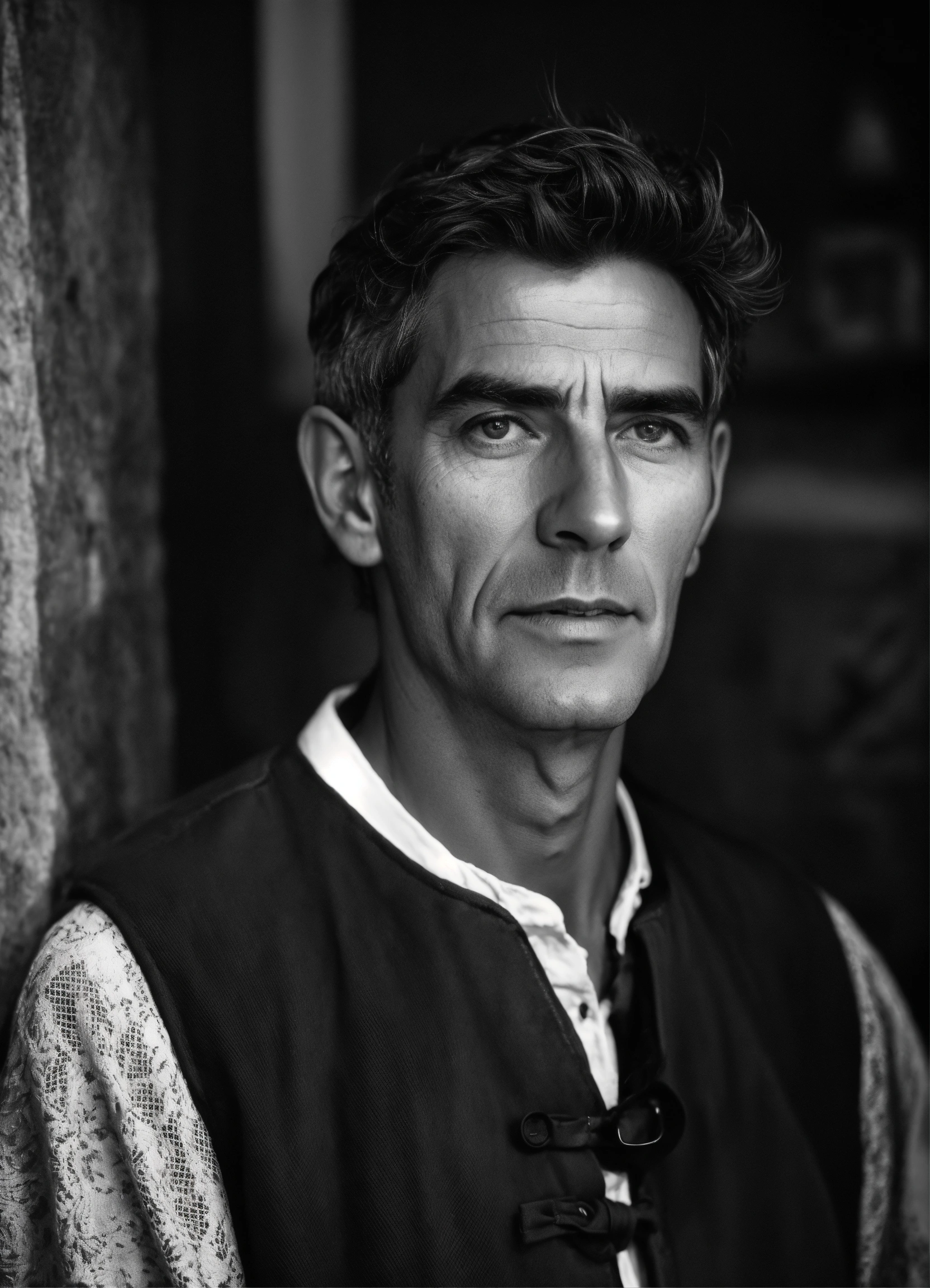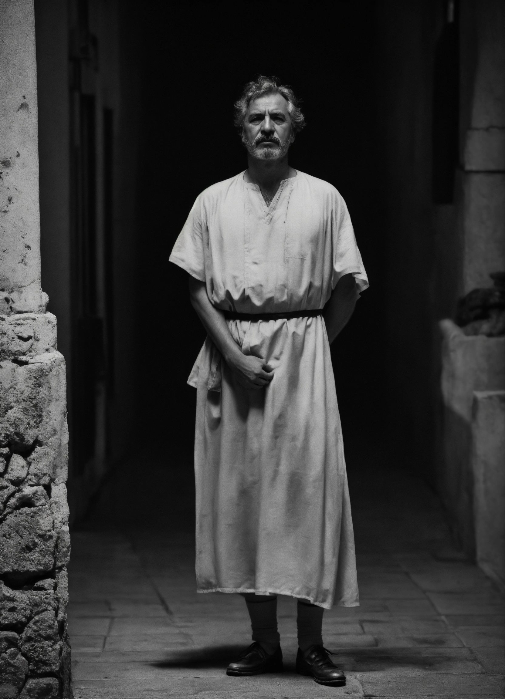 Genera una fotografía en blanco y negro del psiquiatra que vive en murcia y se llama félix crespo, vistiendo un mandil de masón, de maestro masón, del rito francés