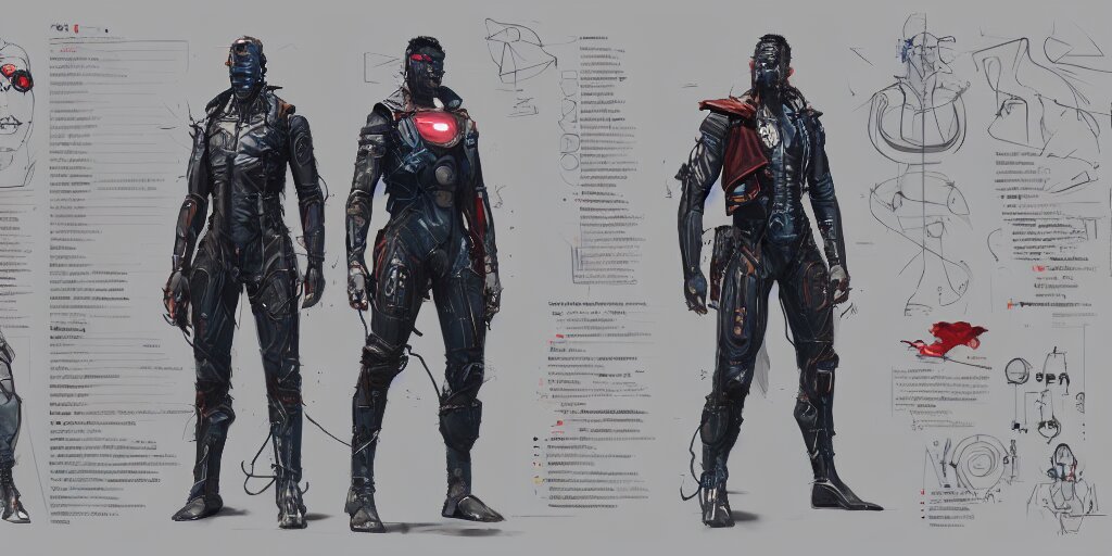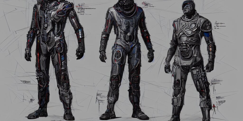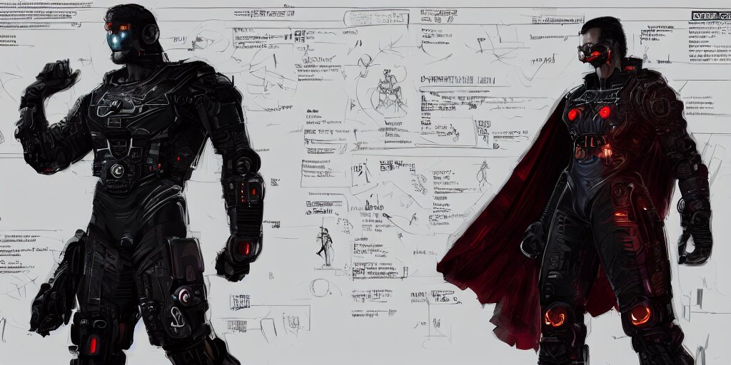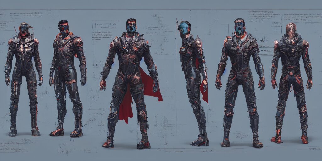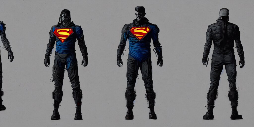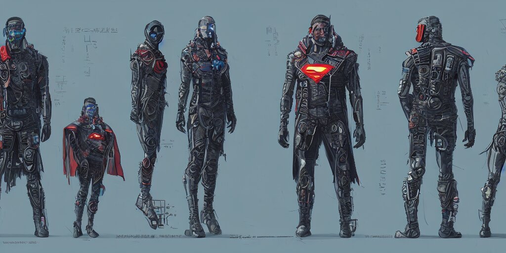 Cyberpunk superman, character sheet, concept design, contrast, kim jung gi, greg rutkowski, zabrocki, karlkka, jayison devadas, trending on artstation, 8 k, ultra wide angle, pincushion lens effect