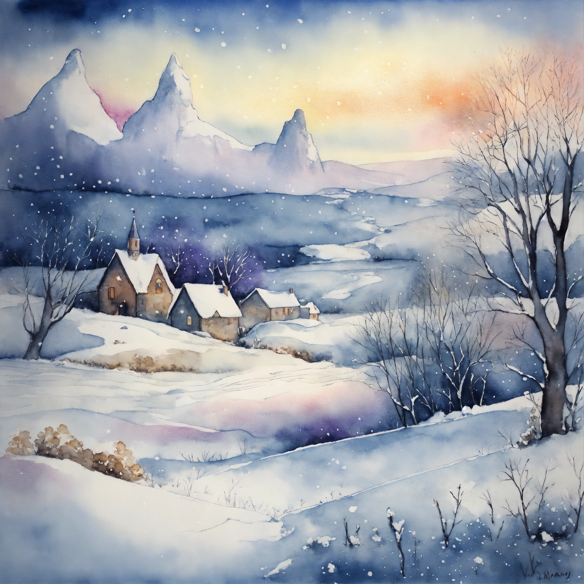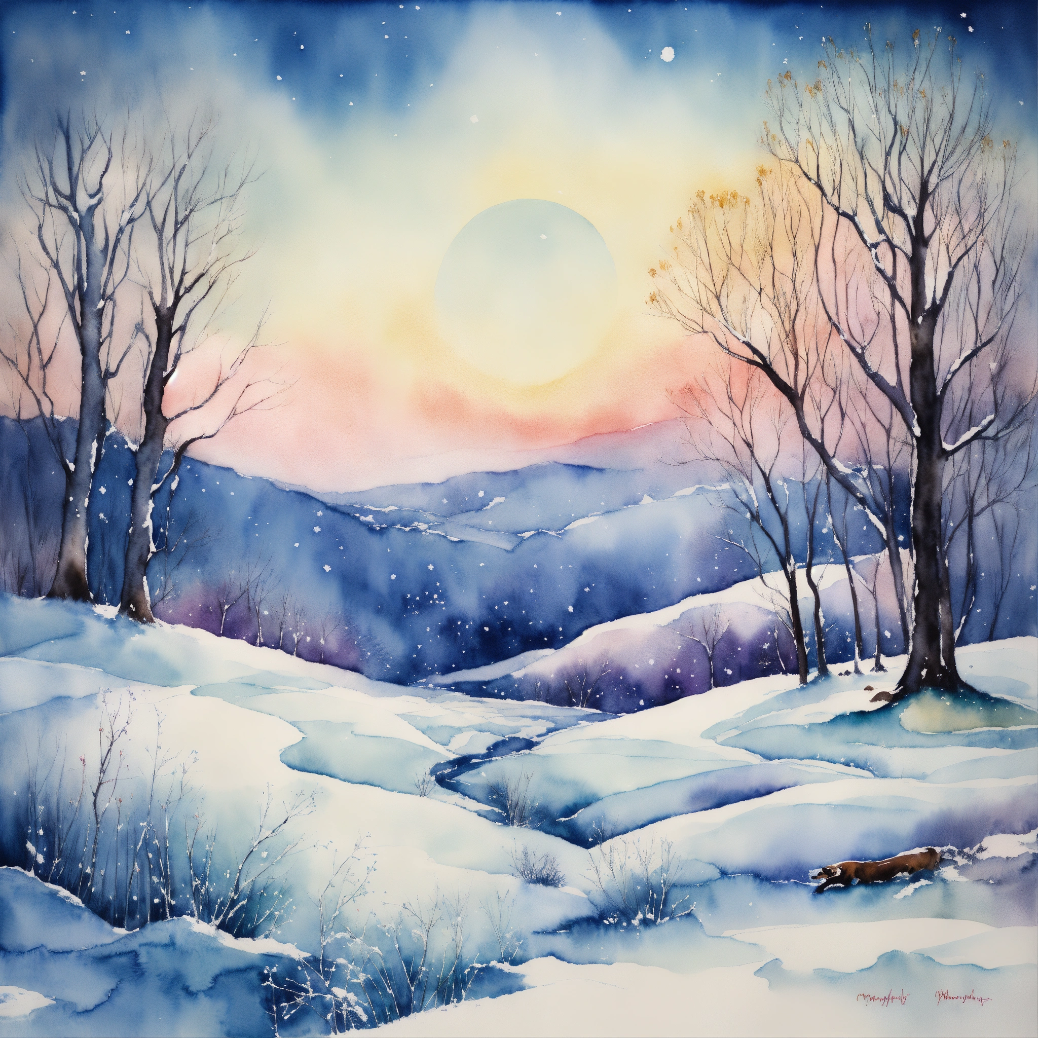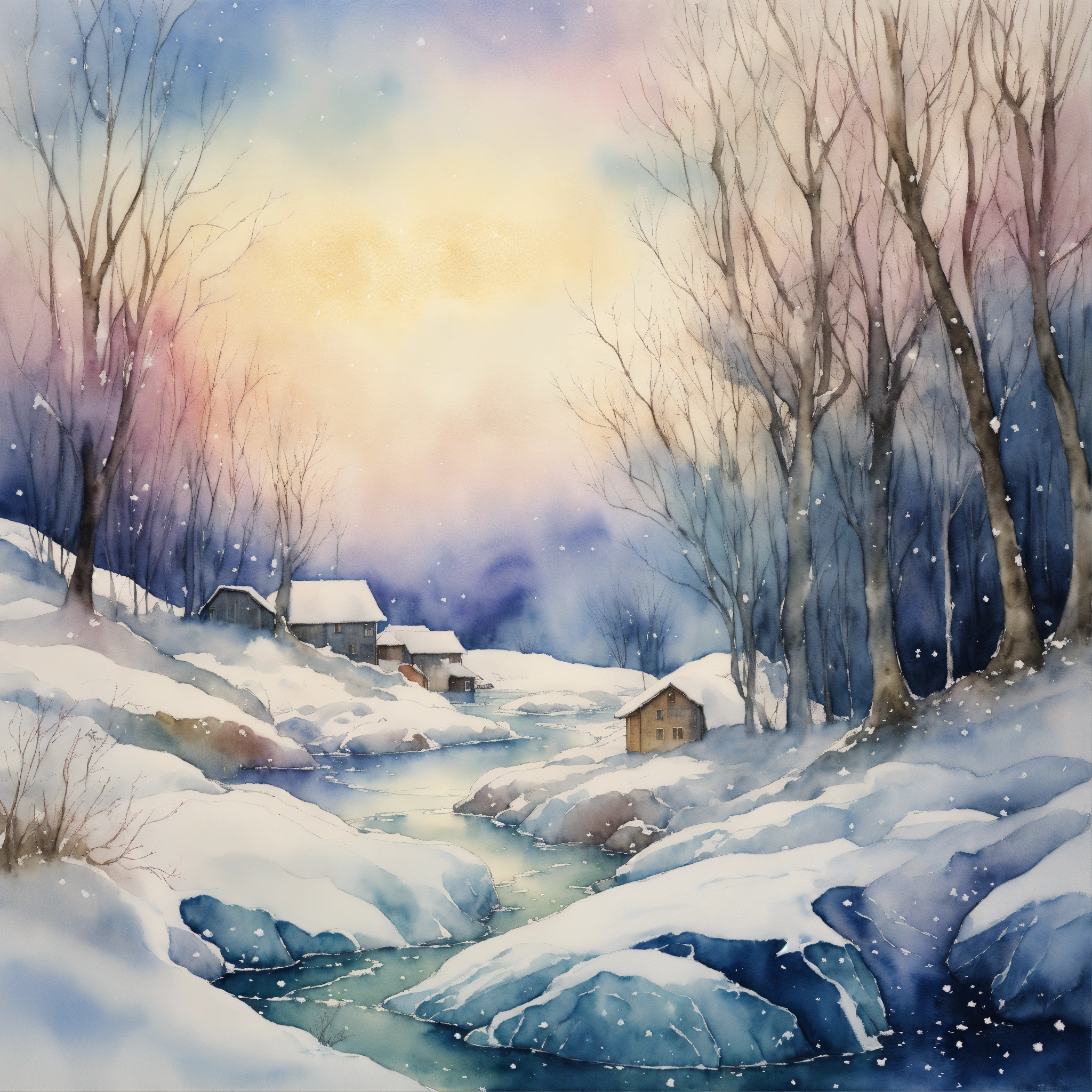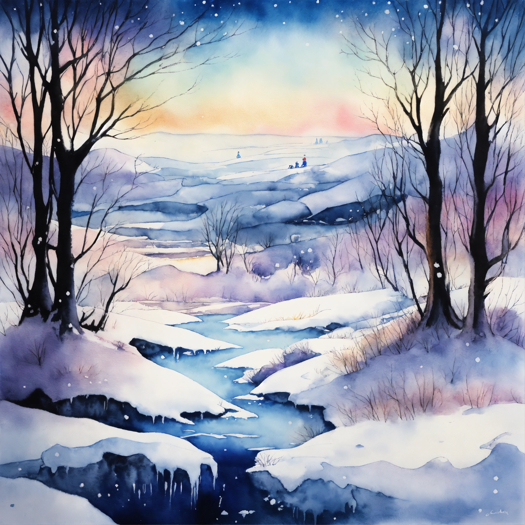 White background, "immerse viewers in a captivating fantasy realm. depict an otherworldly landscape teeming, with frozen flat ground, icy, cold, winter, and magical falling snow. the image should evoke a sense of awe and wonder, inviting viewers to embark on an imaginative journey. watercolour and ink by cicely mary barker