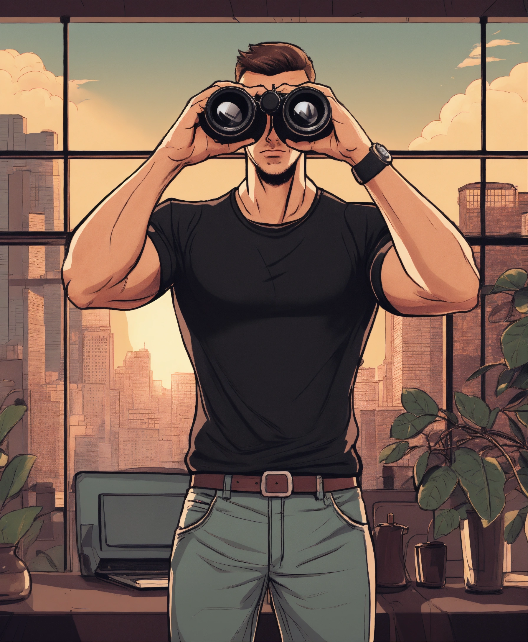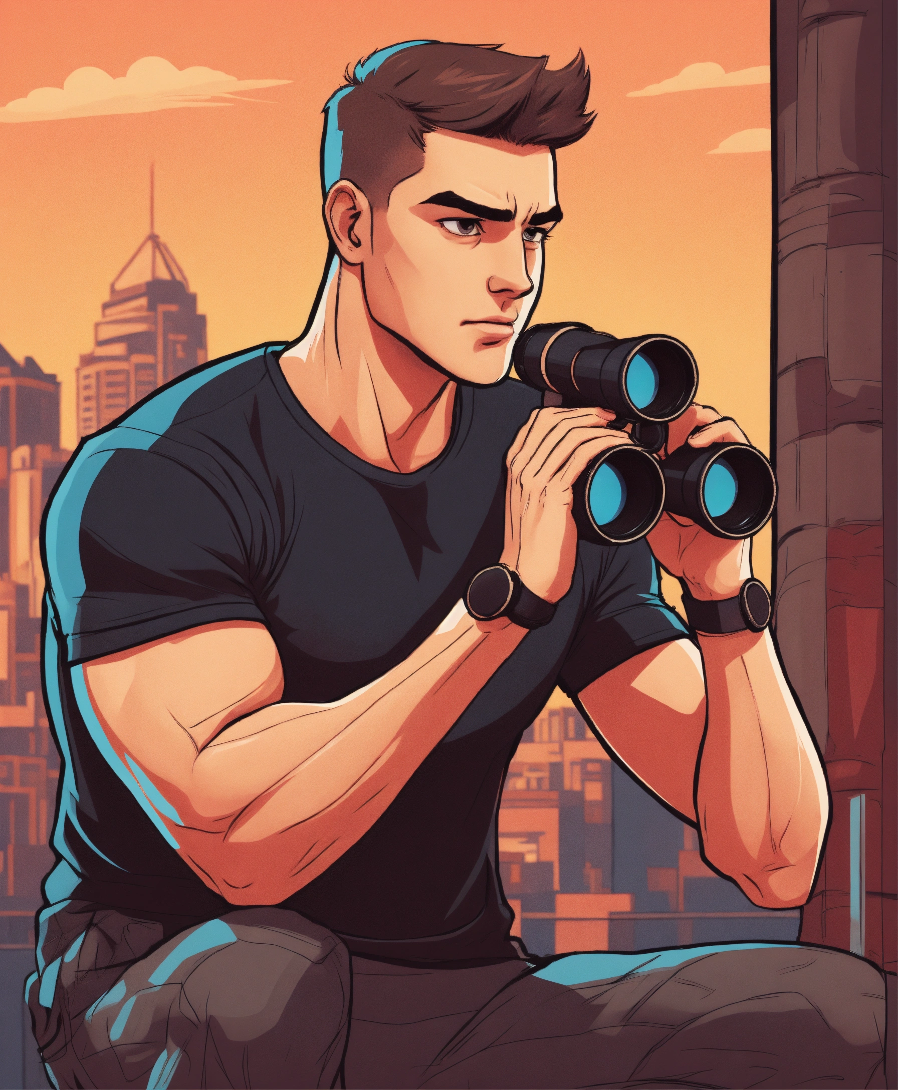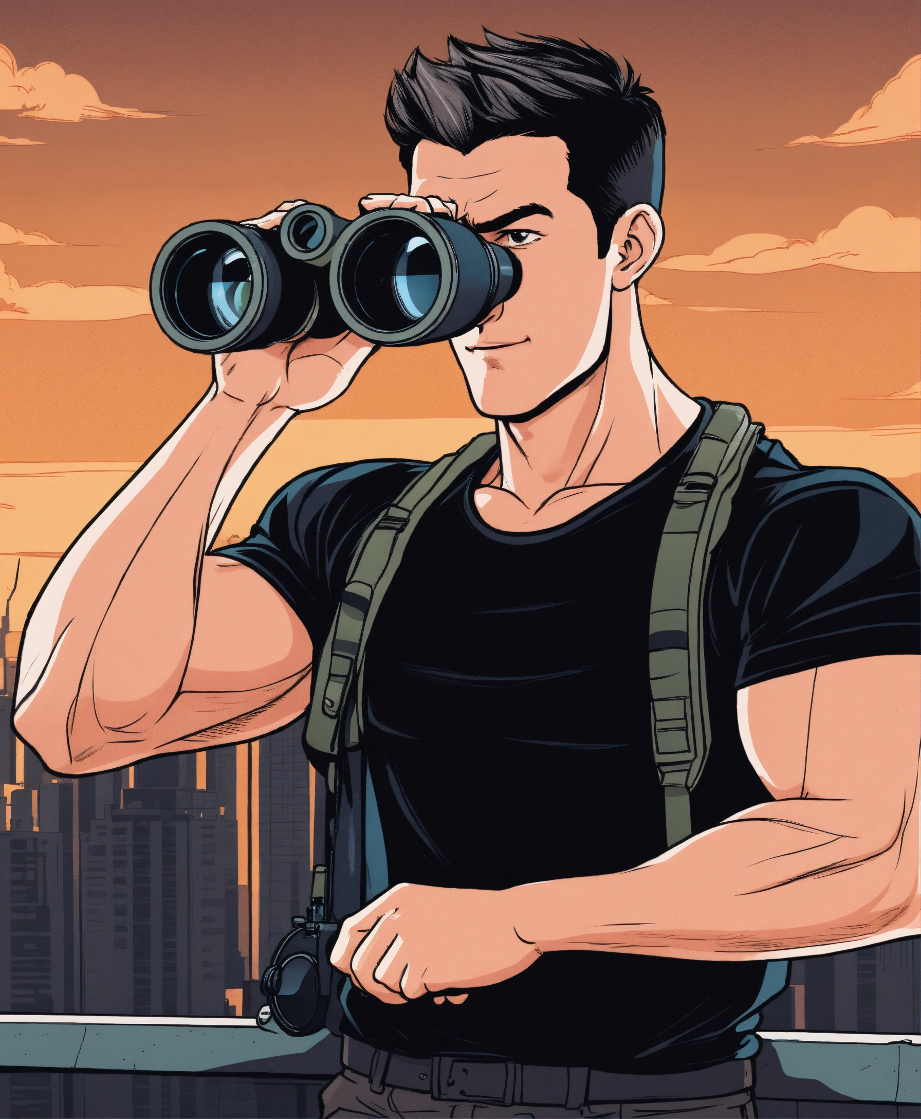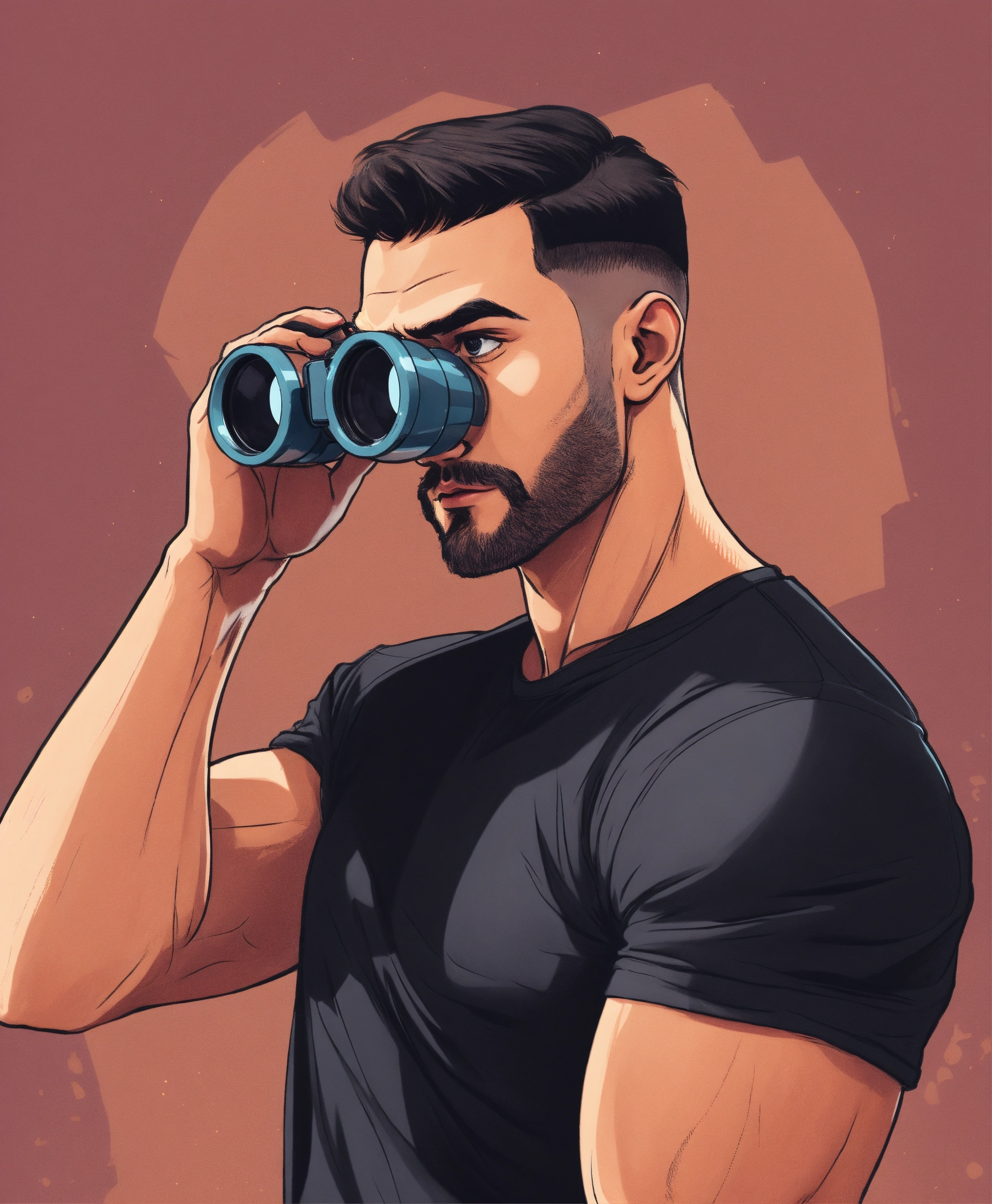 Muscular guy in black t-shirt with short hair looking into binoculars