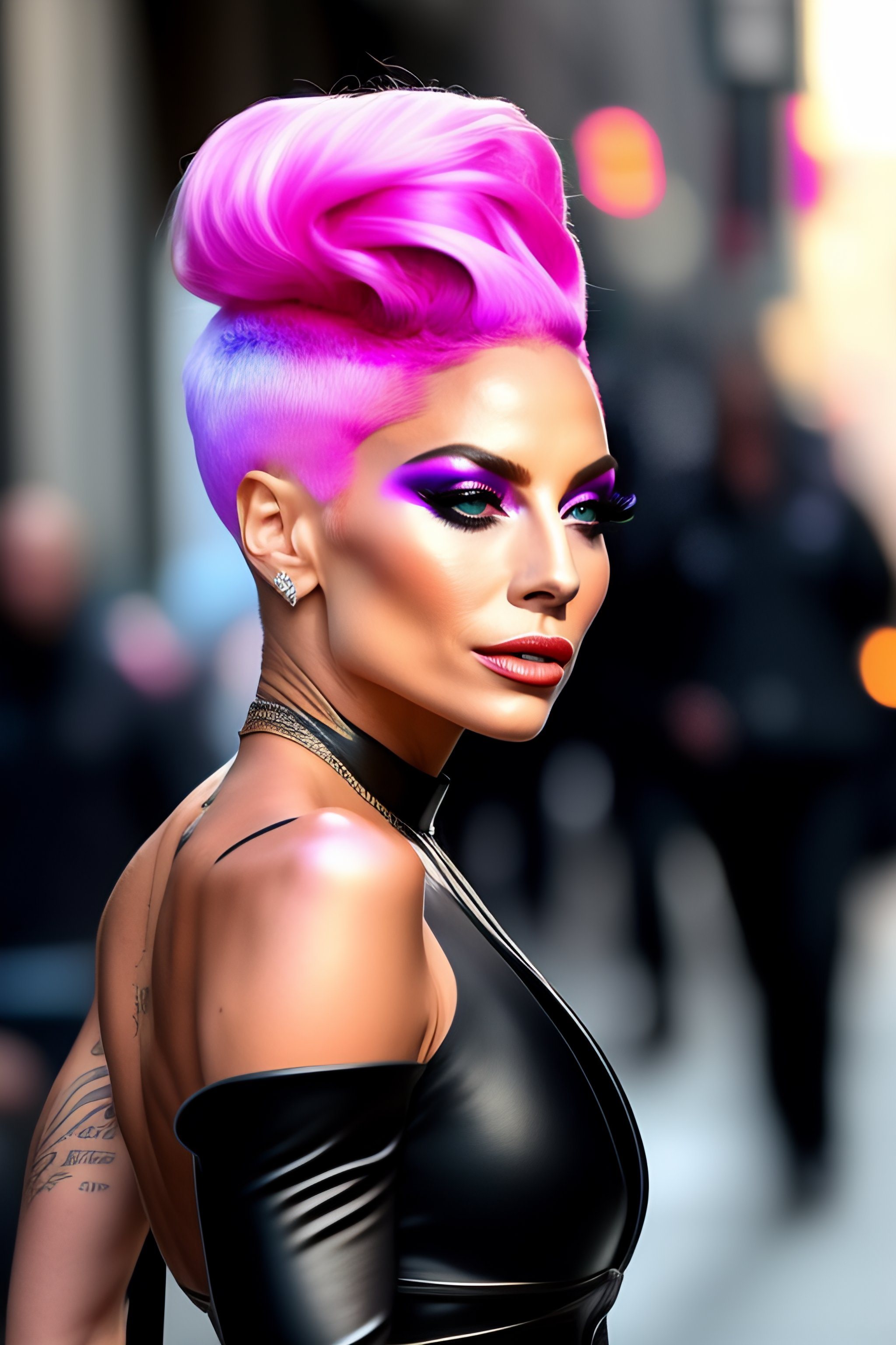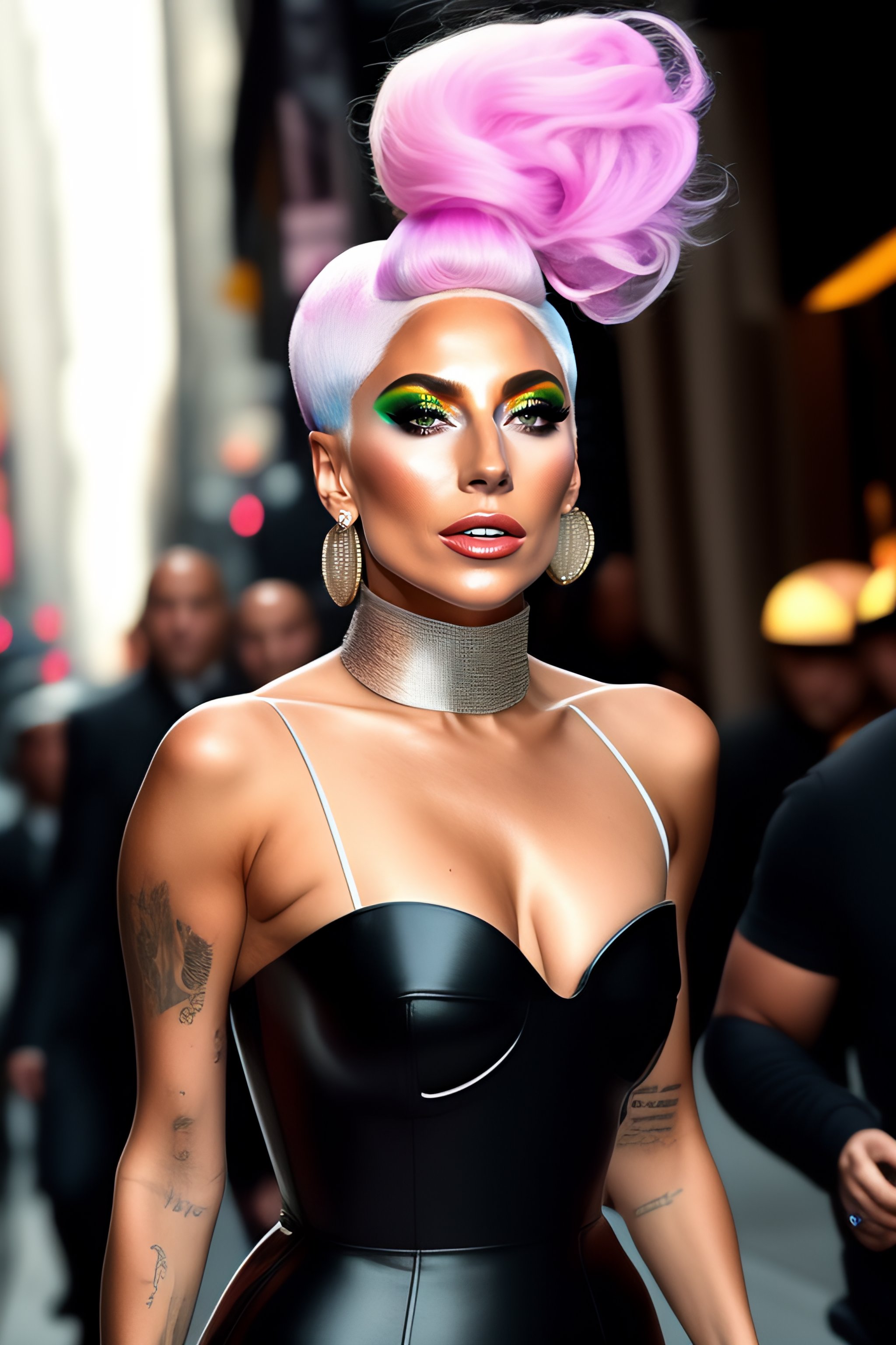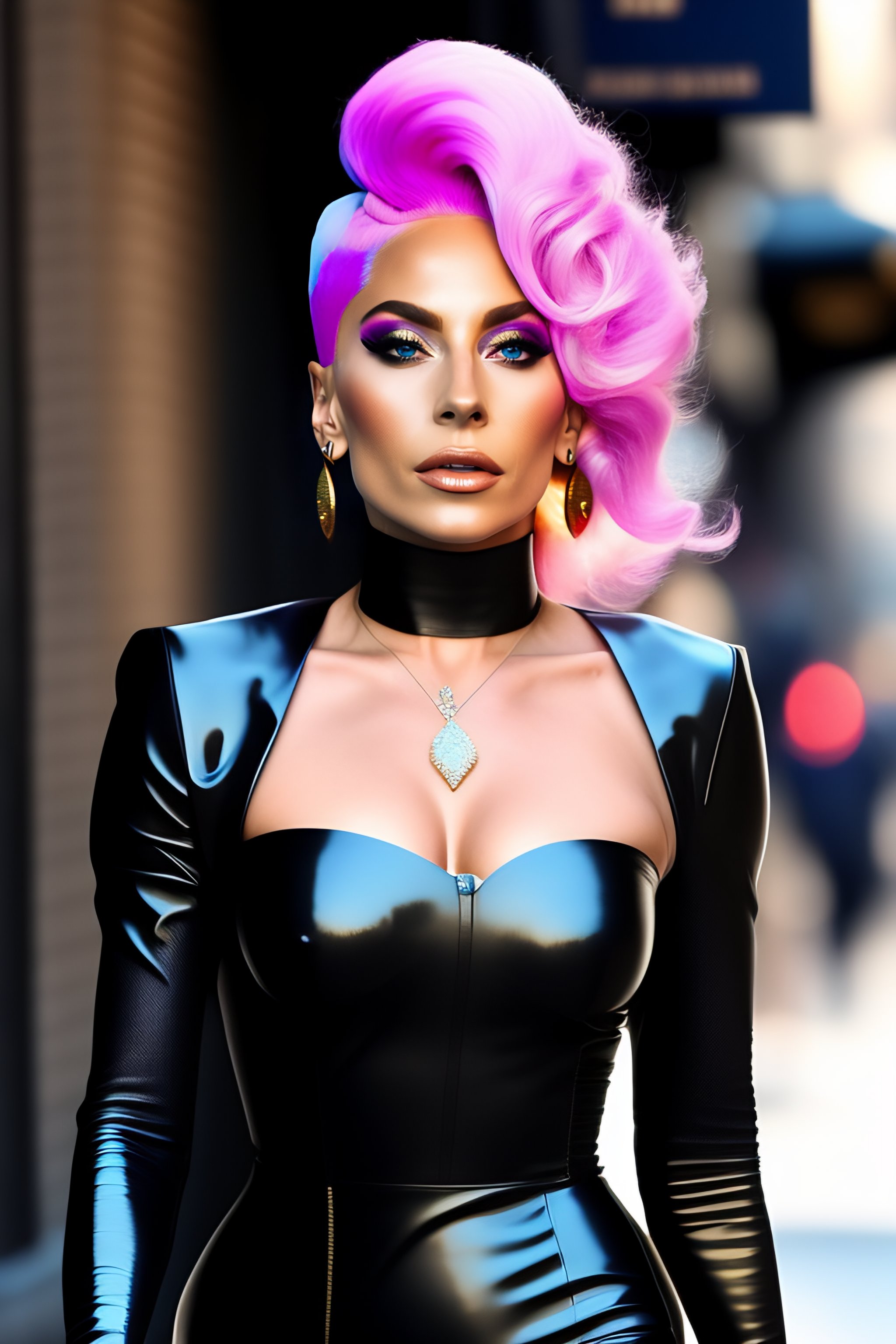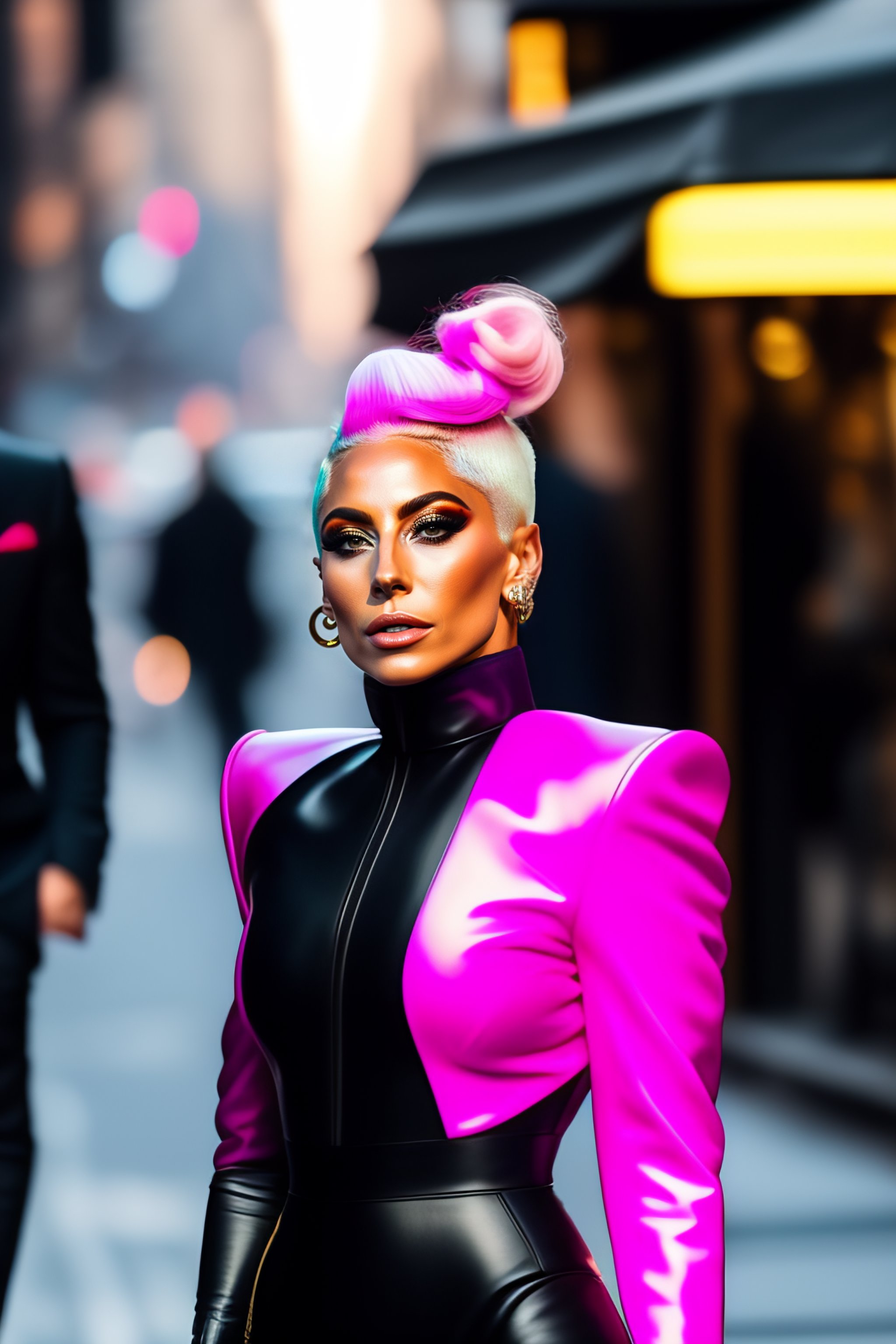 Skinny lady gaga walking down the street in new york city with pink hair and white eyelines wearing a black leather tight dress