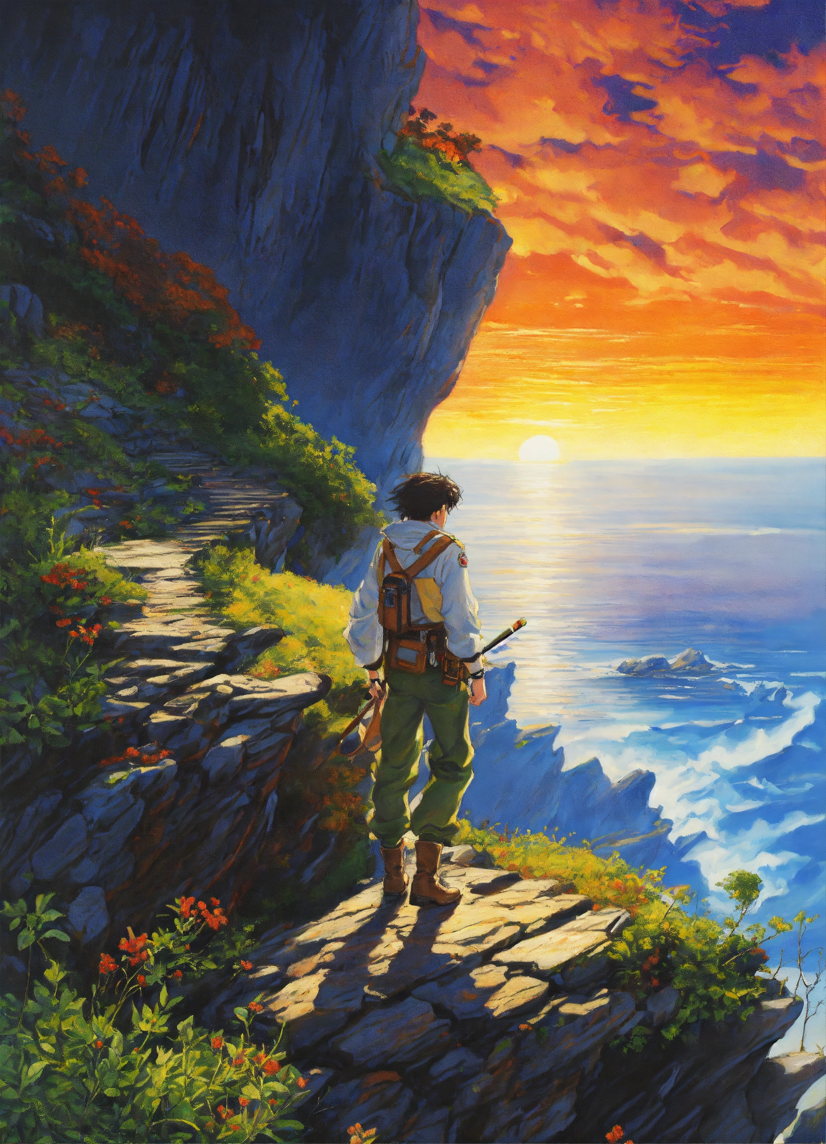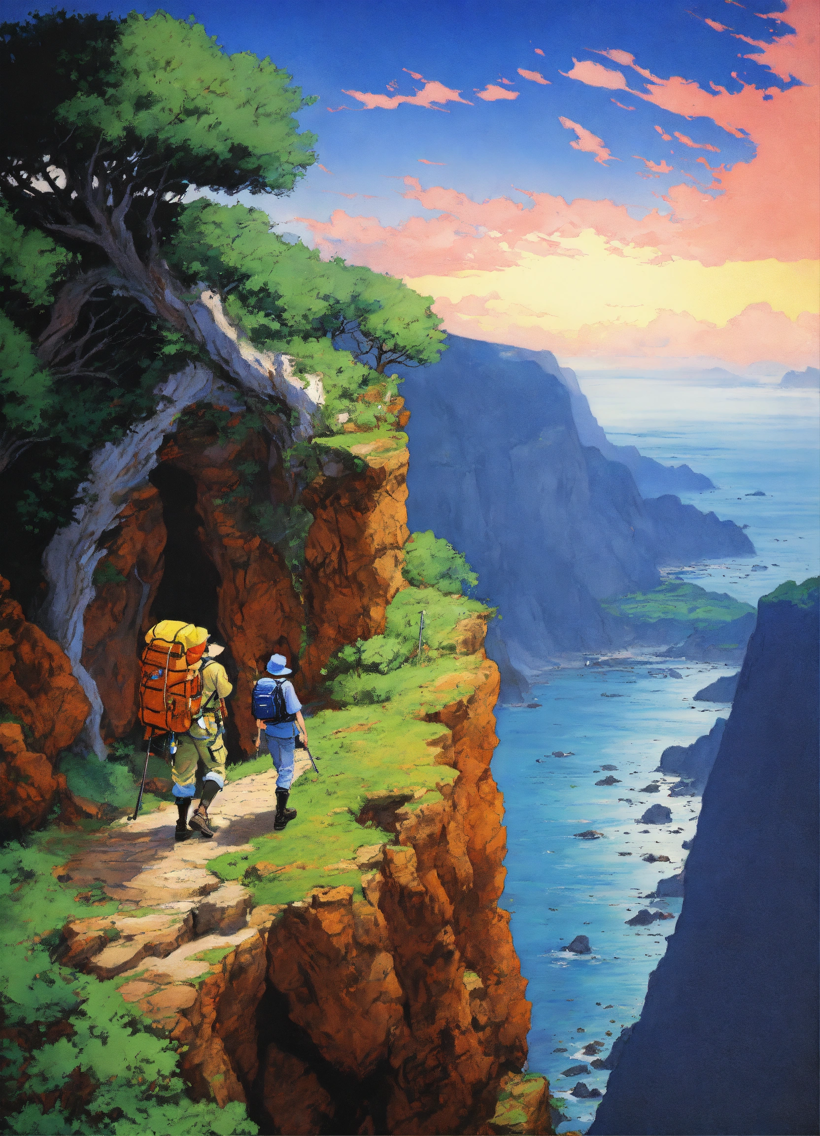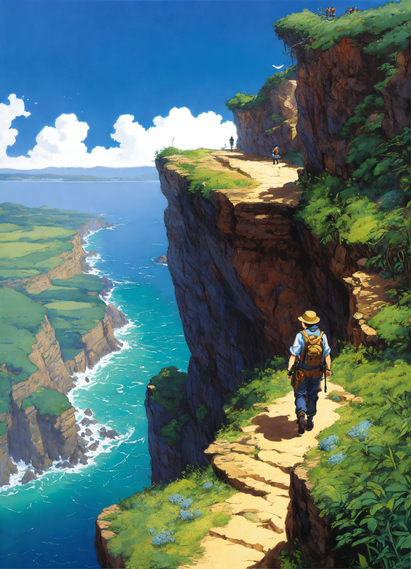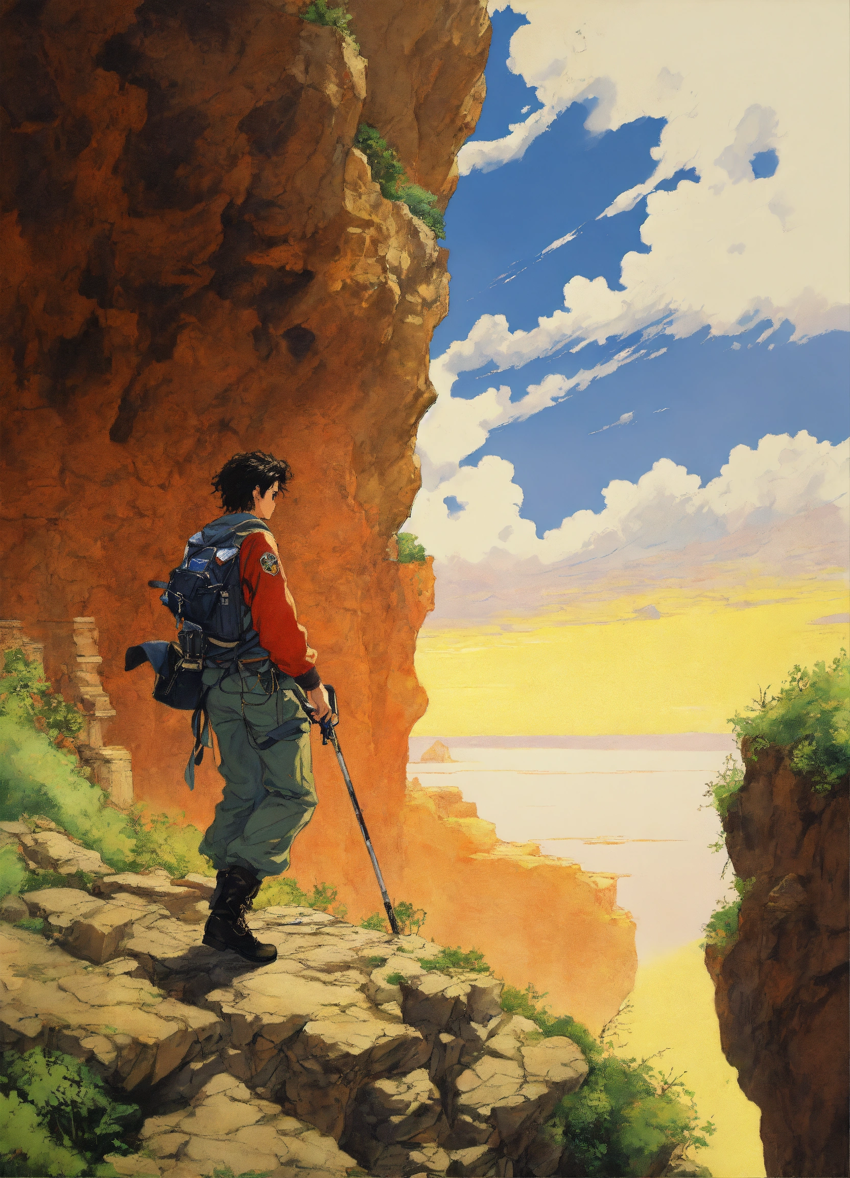 An explorer walks along a cliff, a detailed painting by hirohiko araki, featured on pixiv, analytical art, detailed painting, 2d game art, official art