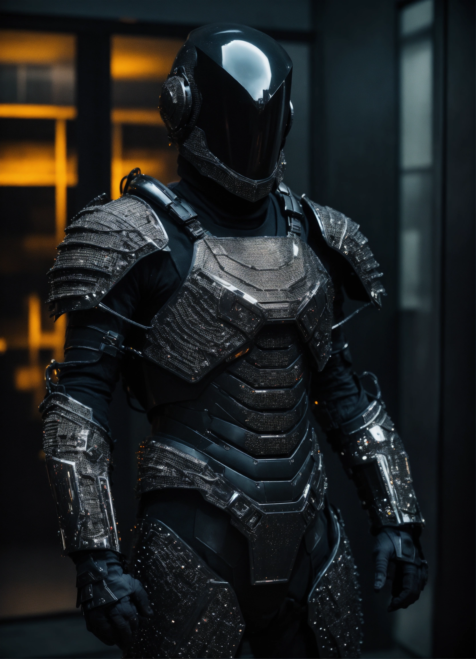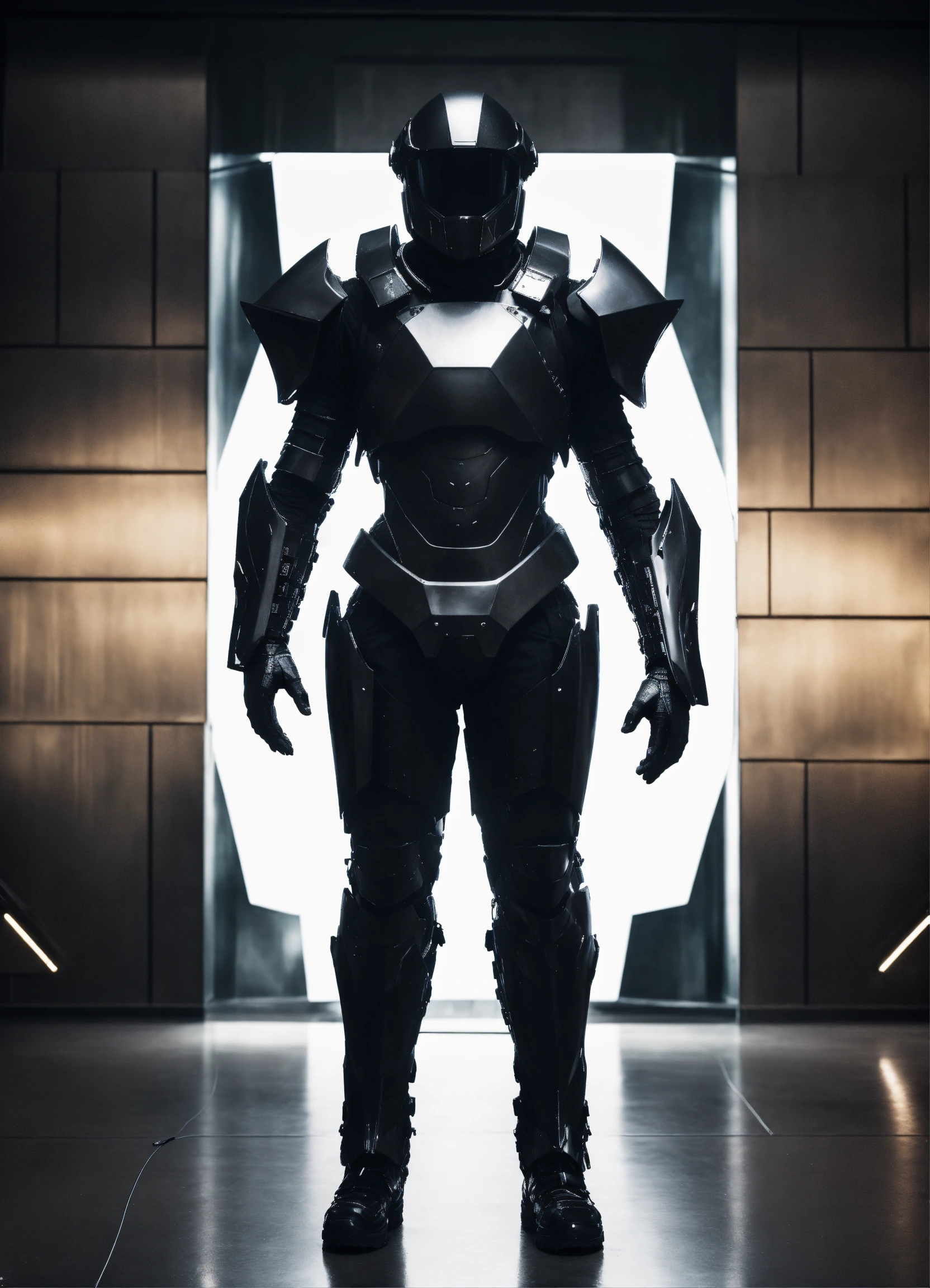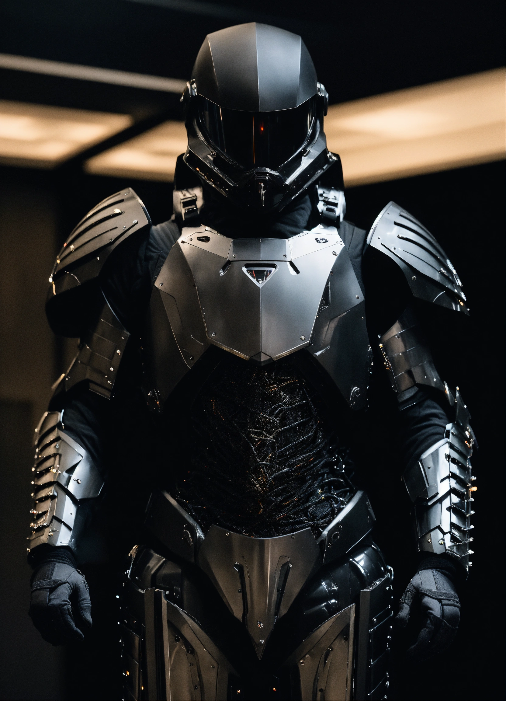 An ultrarealistic full body photograph from the front of a futuristic full body armor made of smoth black polymer and black metal, smooth, fully crystal hull, for a man, visible wires, mate black torso, imposing, elegant, modern minimalism, dreamy, dystopia, godlike, mysterious, scary. a dark room in the background.