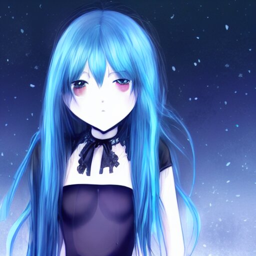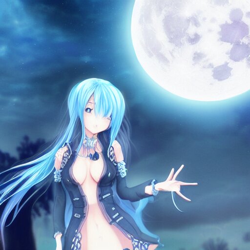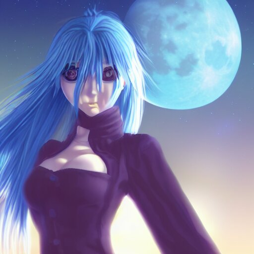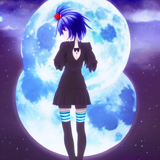 A girl with blue hair is standing in front of a full moon, a screenshot by jin homura, featured on pixiv, gothic art, gothic, anime, official art