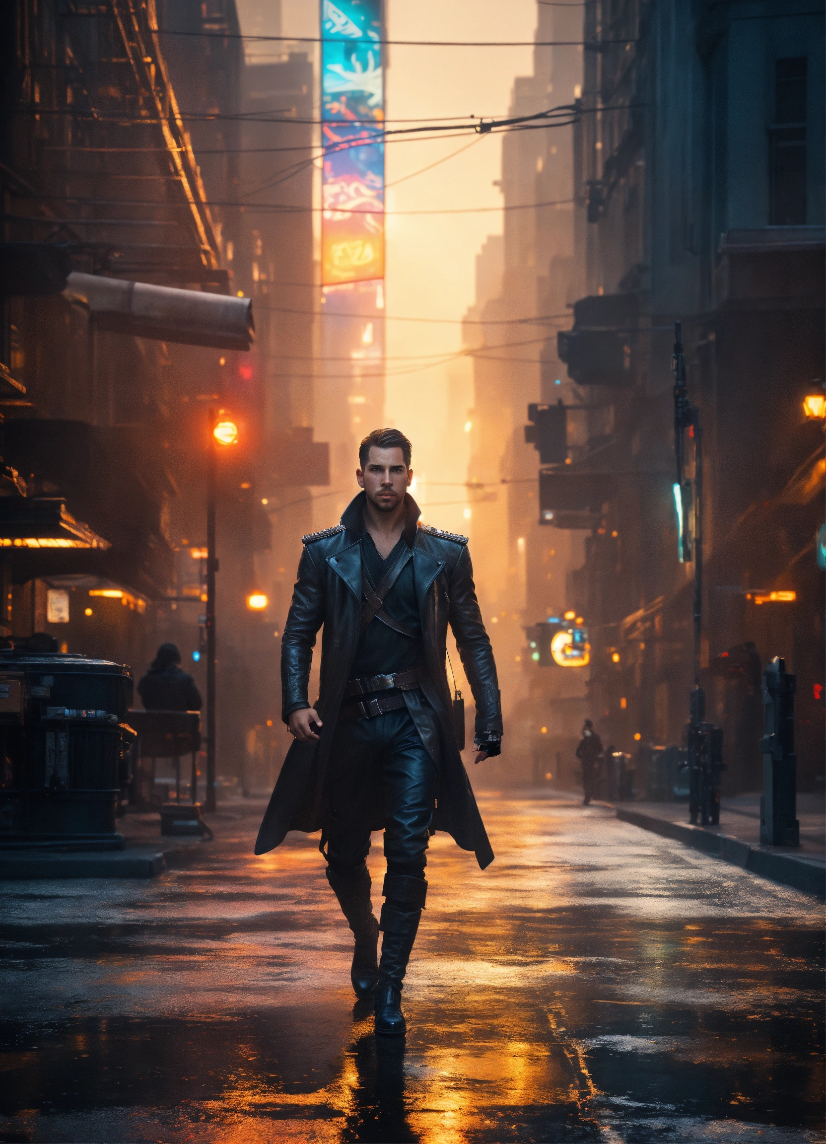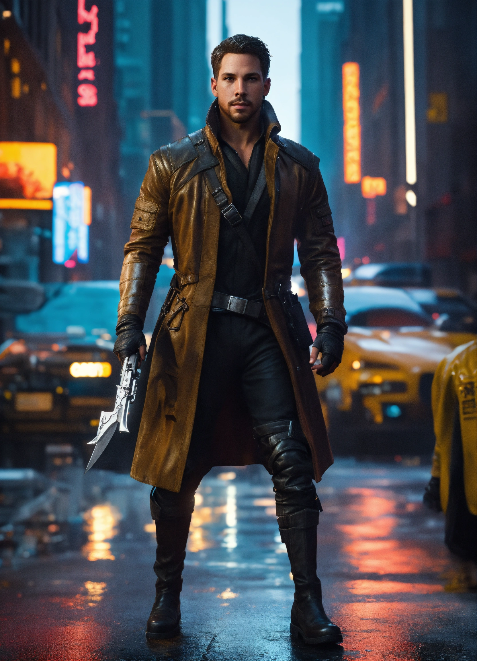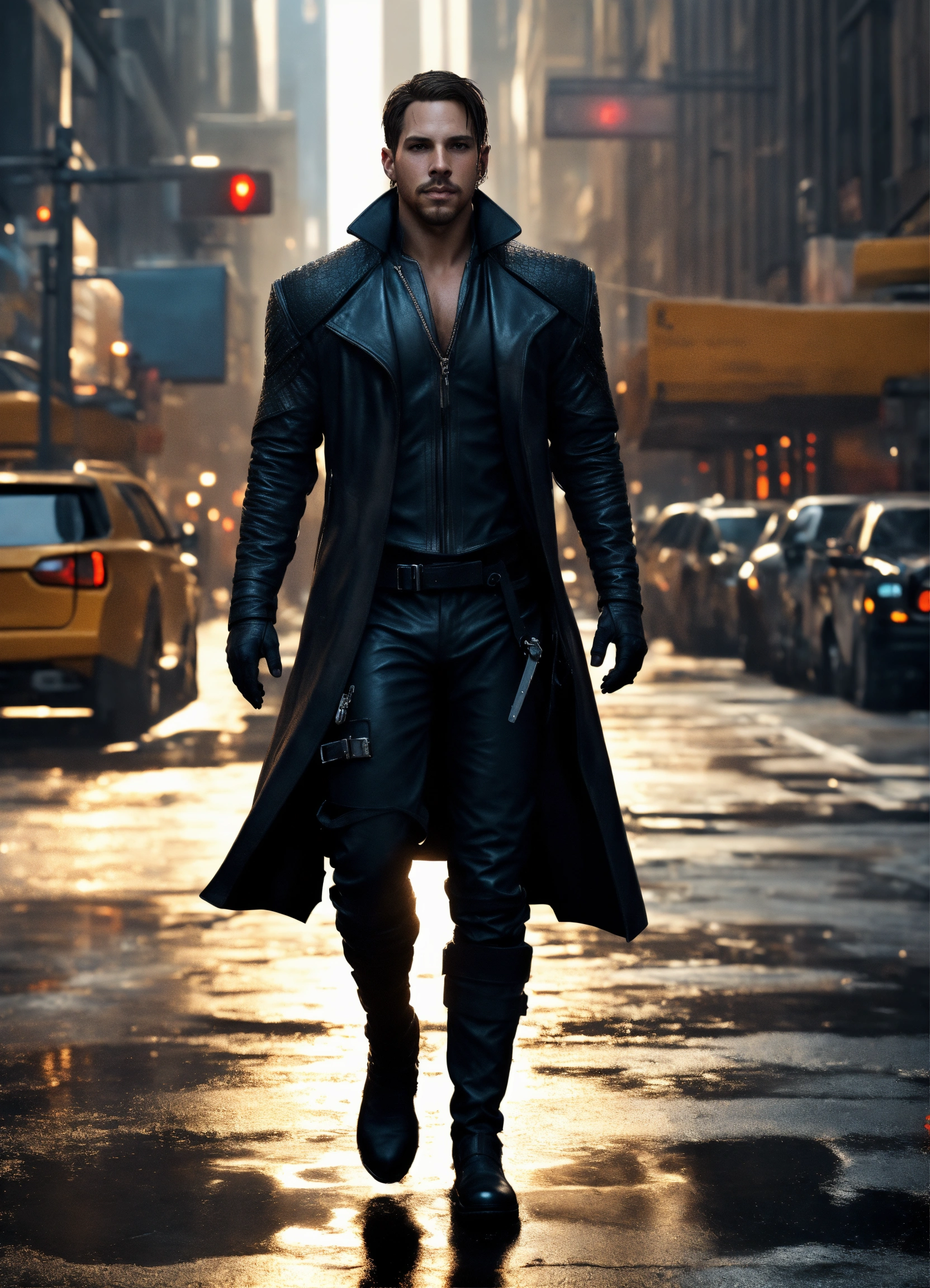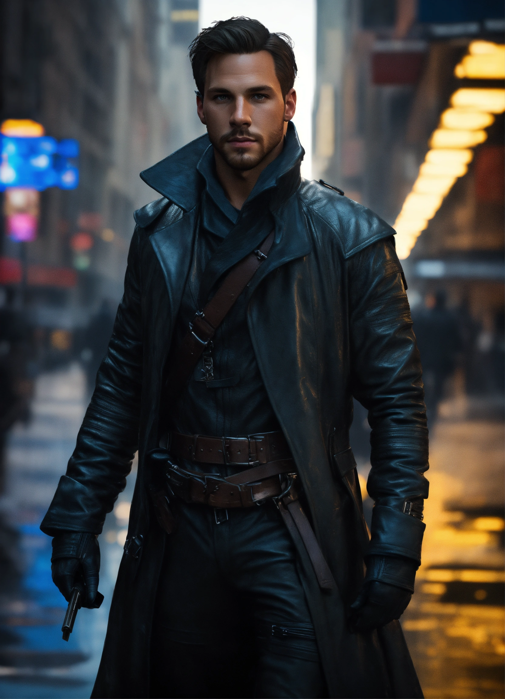 Full body of a handsome athletic white man with shoulder length dark hair and cool, short beard, he's a futuristic swashbuckler, a blade runner 2049 swashbuckler, a dashing athletic man, a scoundrel wearing long leather coat and a black and silver super spy stealth suit, in new york city streets, full body, 8k resolution concept art portrait dynamic lighting hyperdetailed intricately detailed splash art trending on artstation unreal engine 5 volumetric lighting