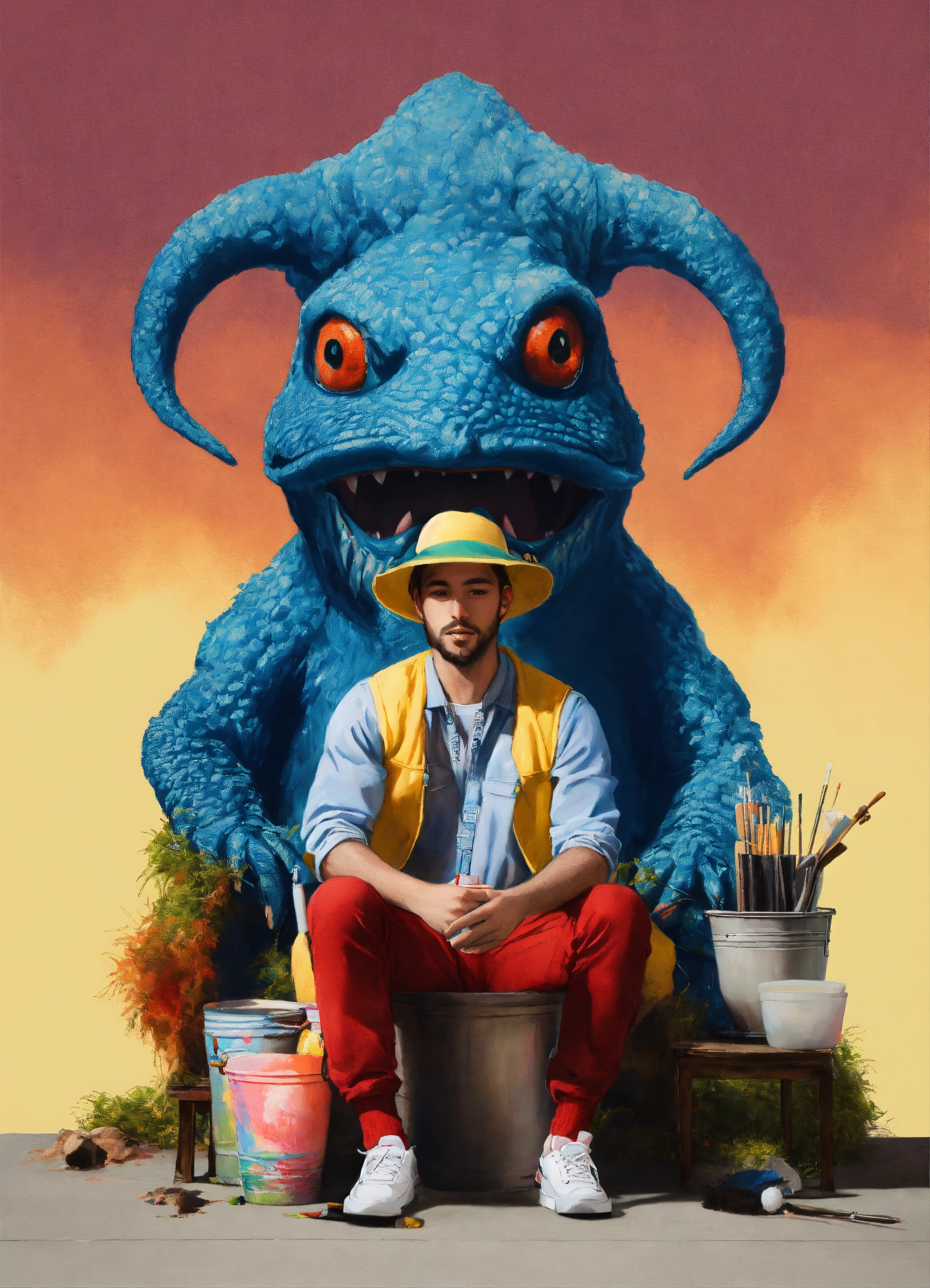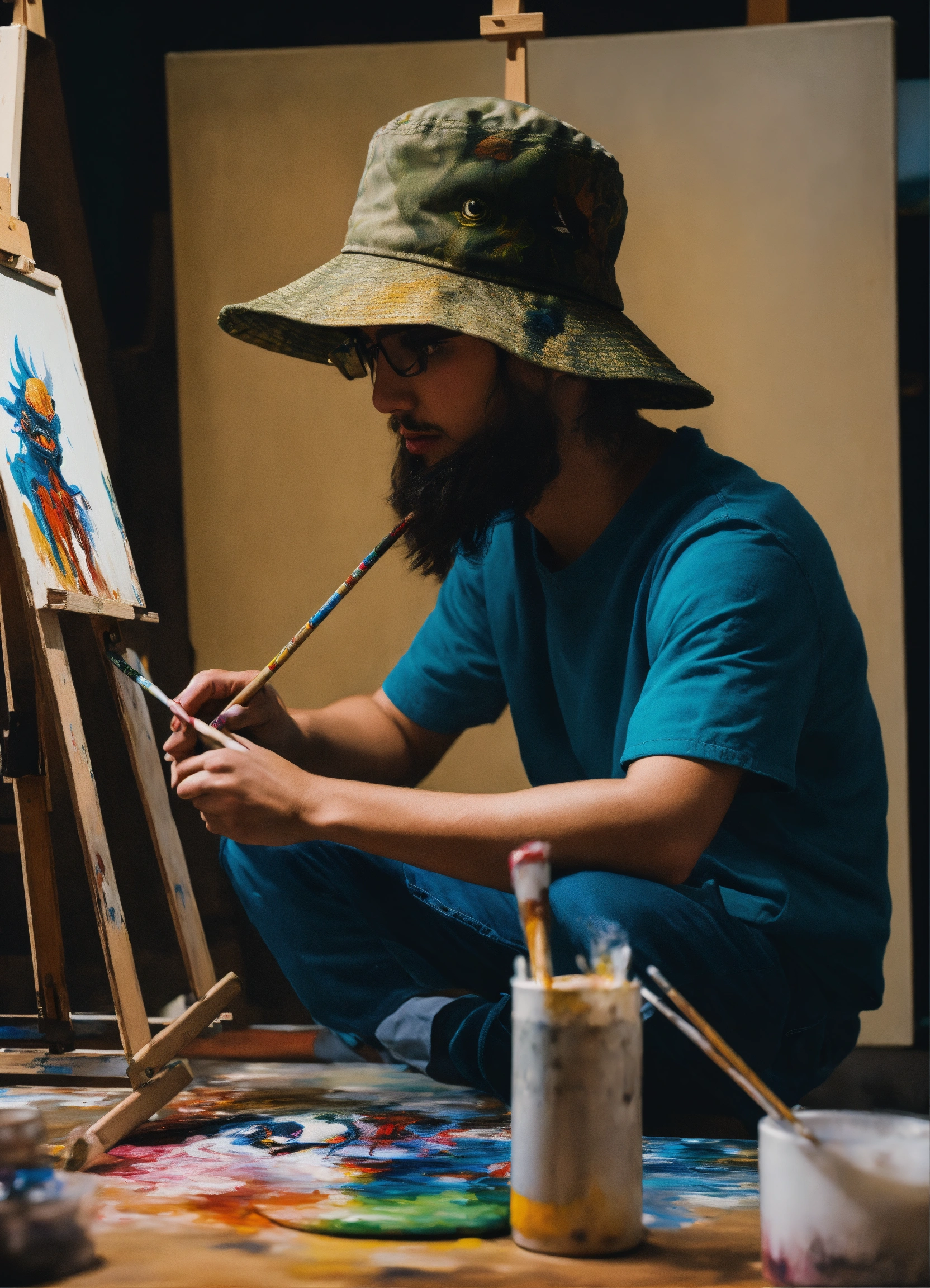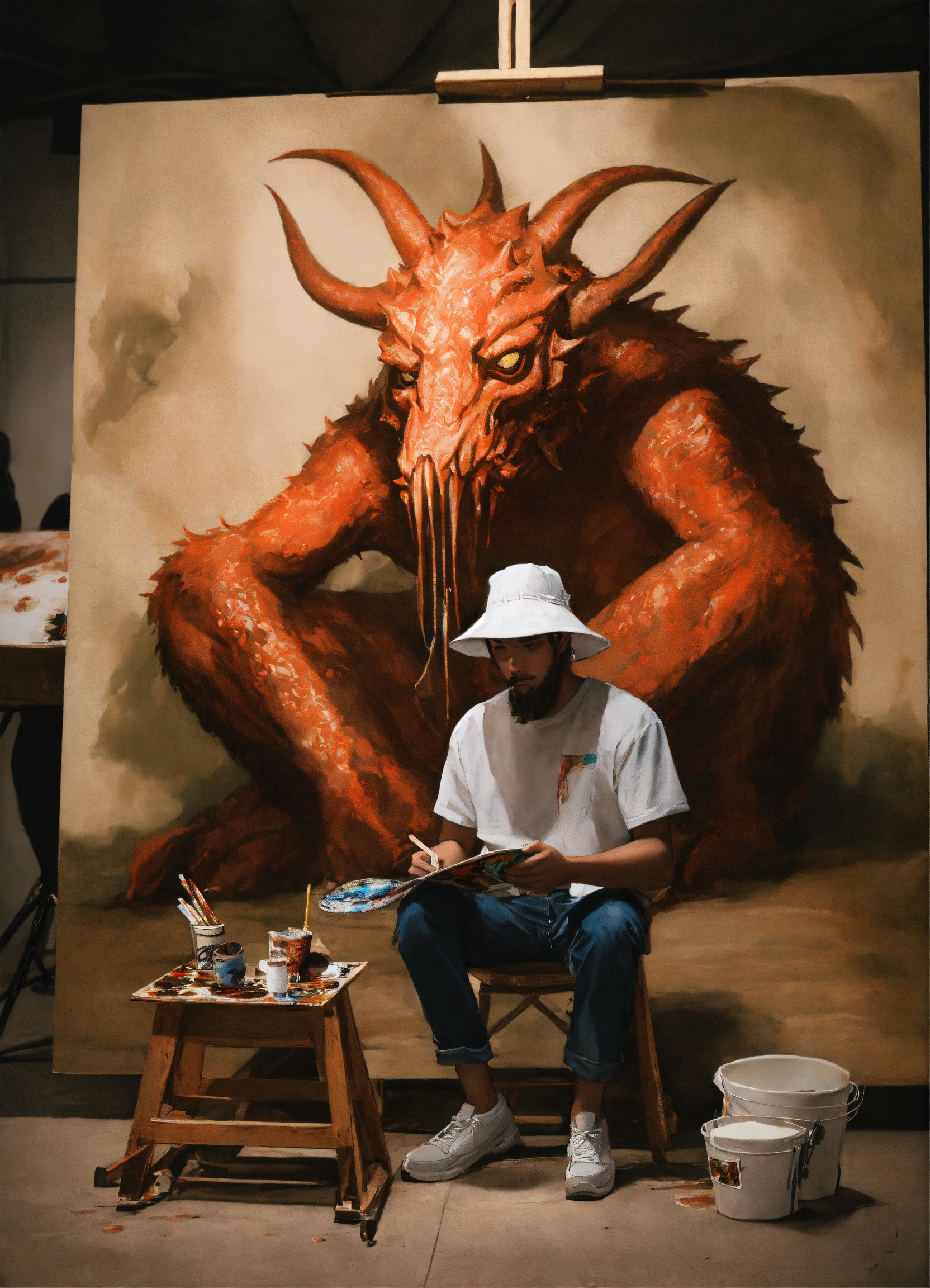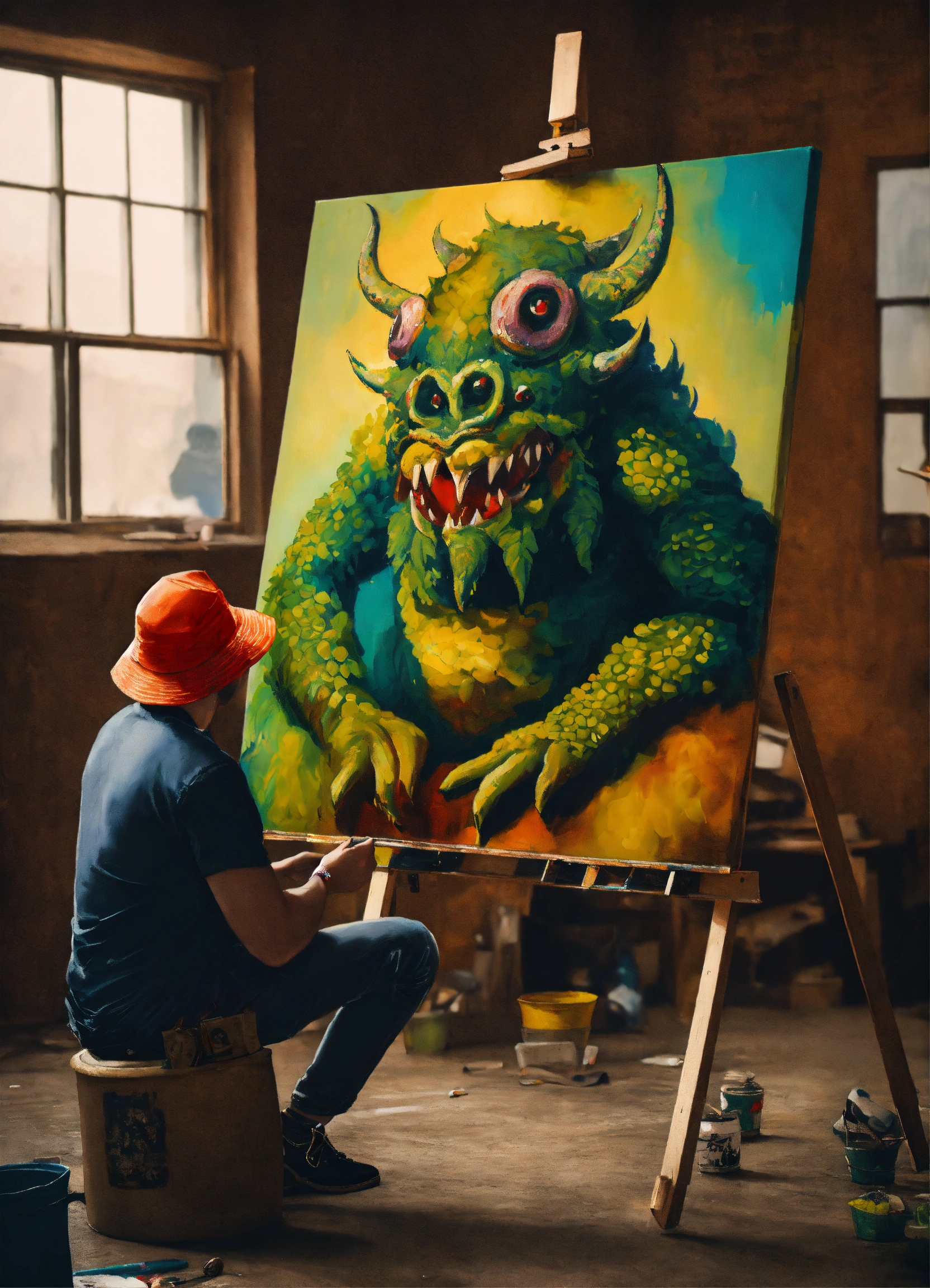 Create an image of a sitting artist wearing a bucket hat painting a three headed monster on canvas