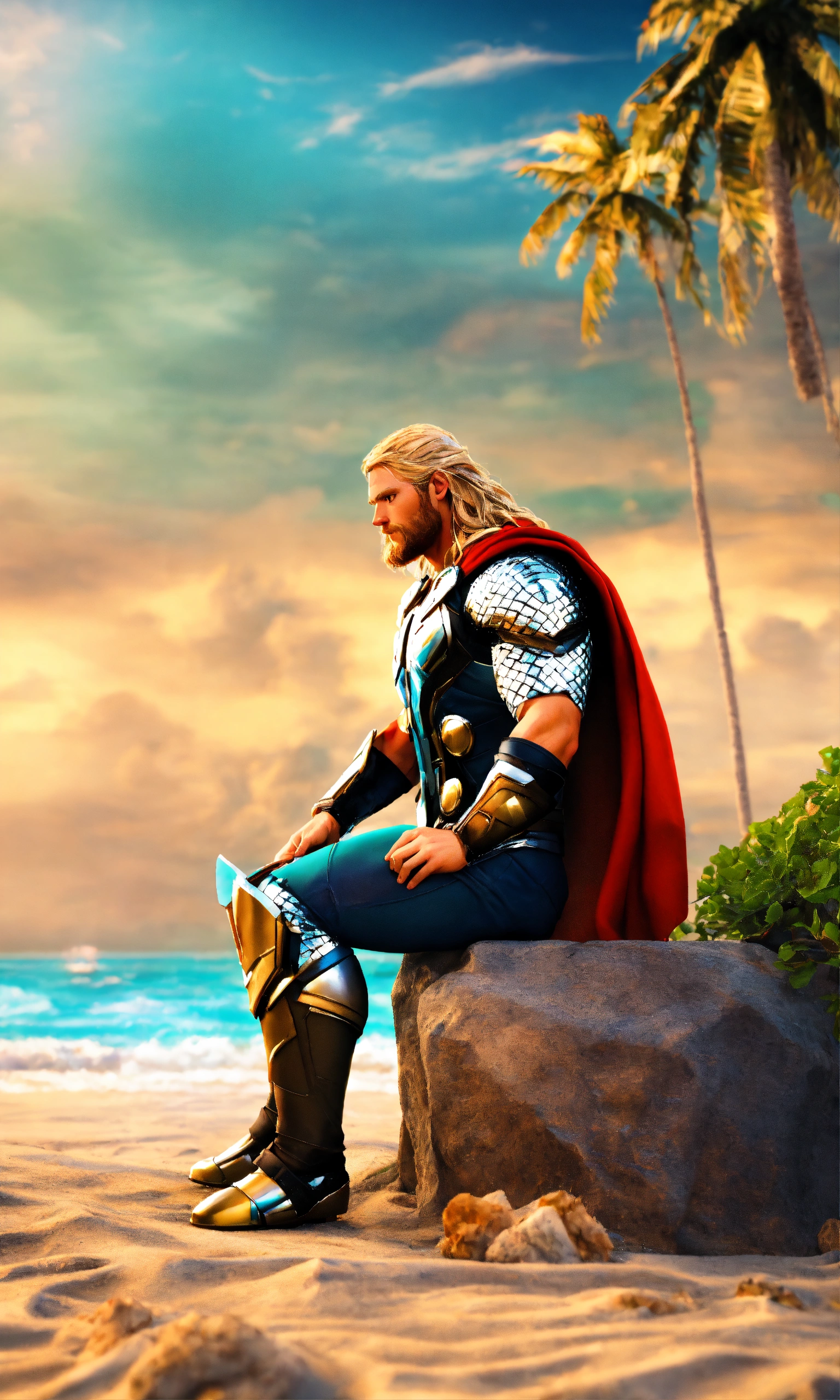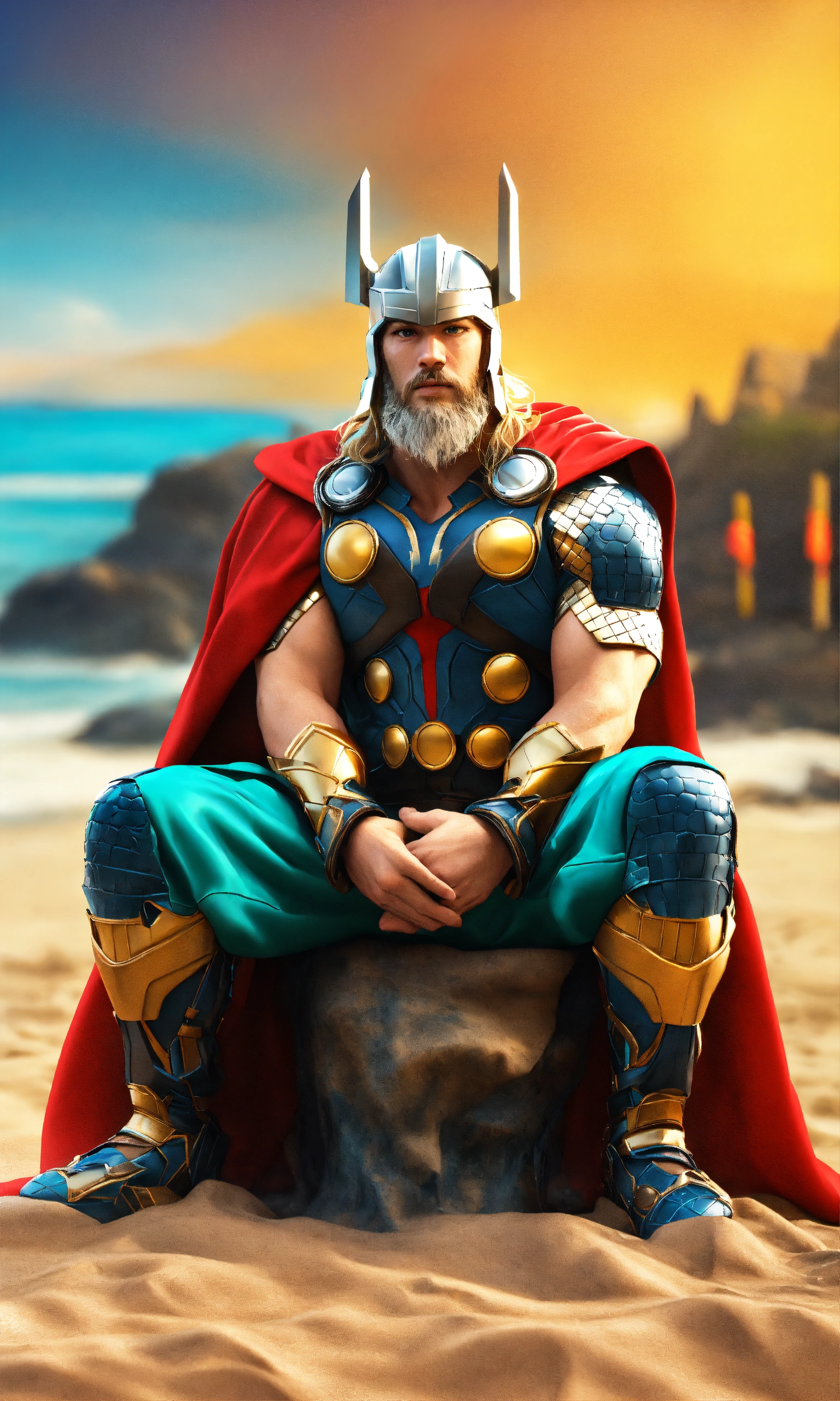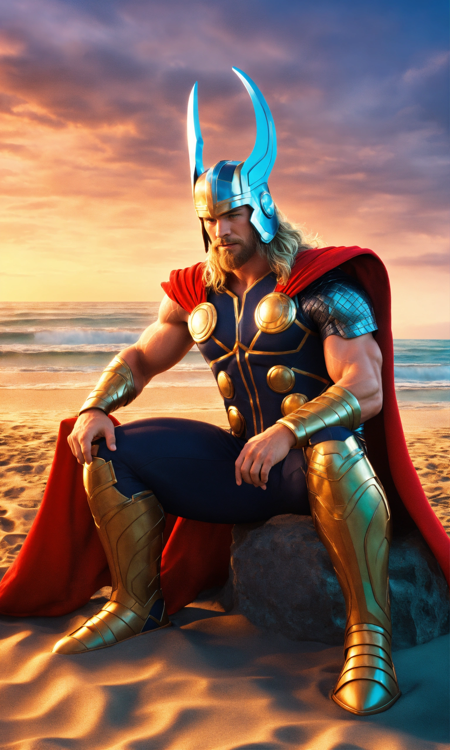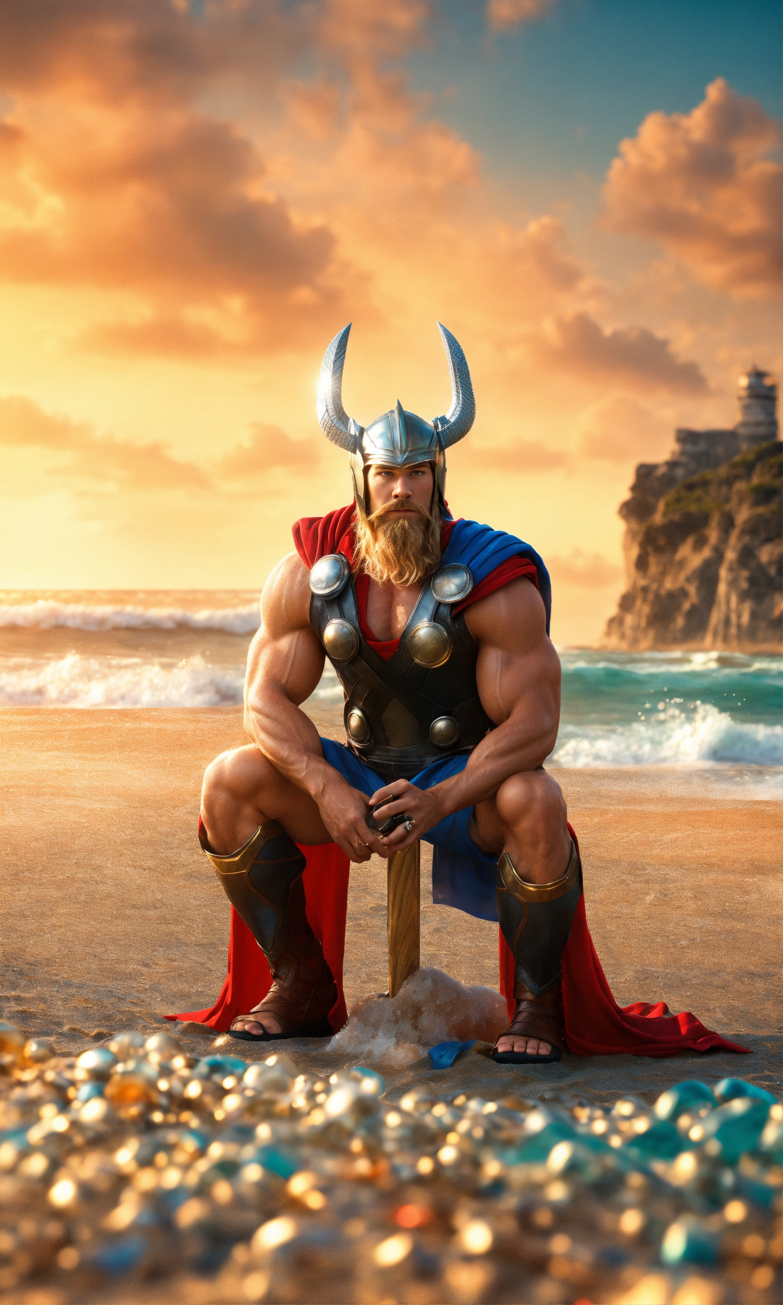 Thor at the beach preparing for swim full-body