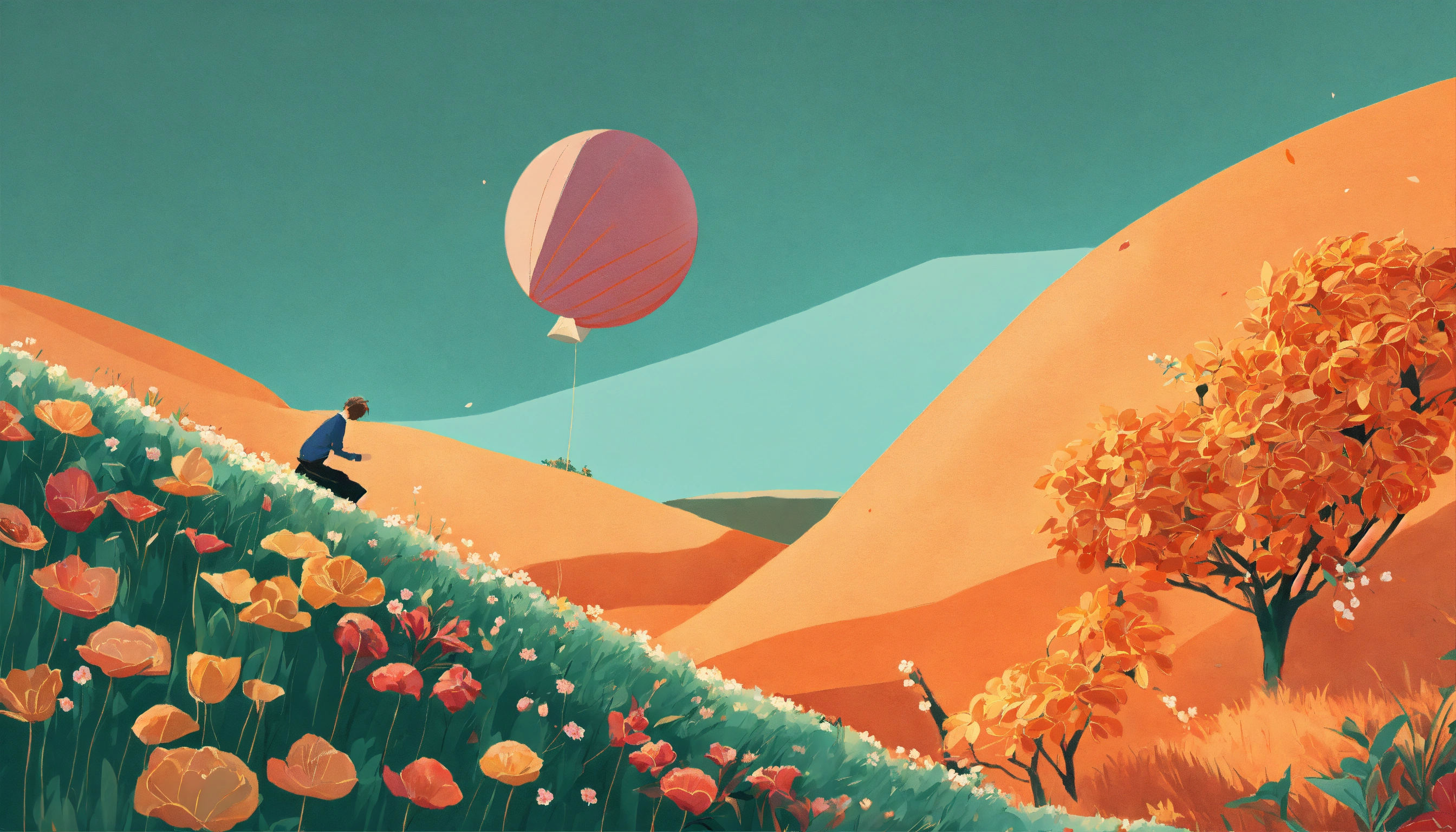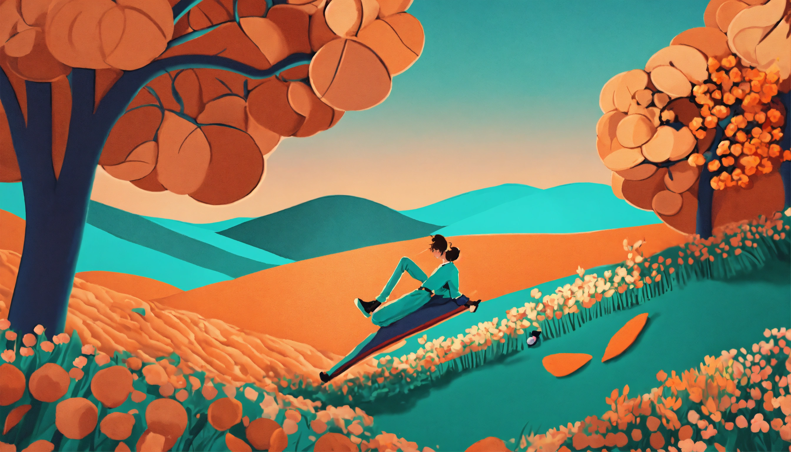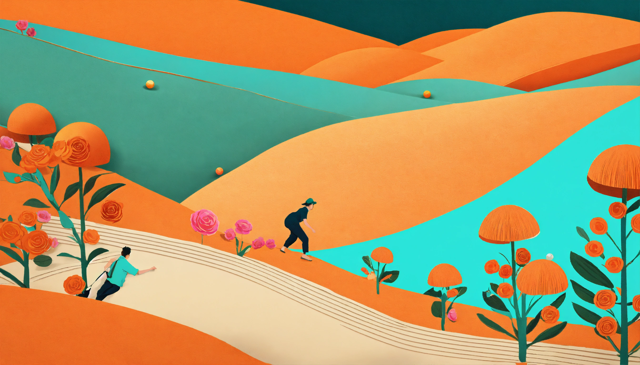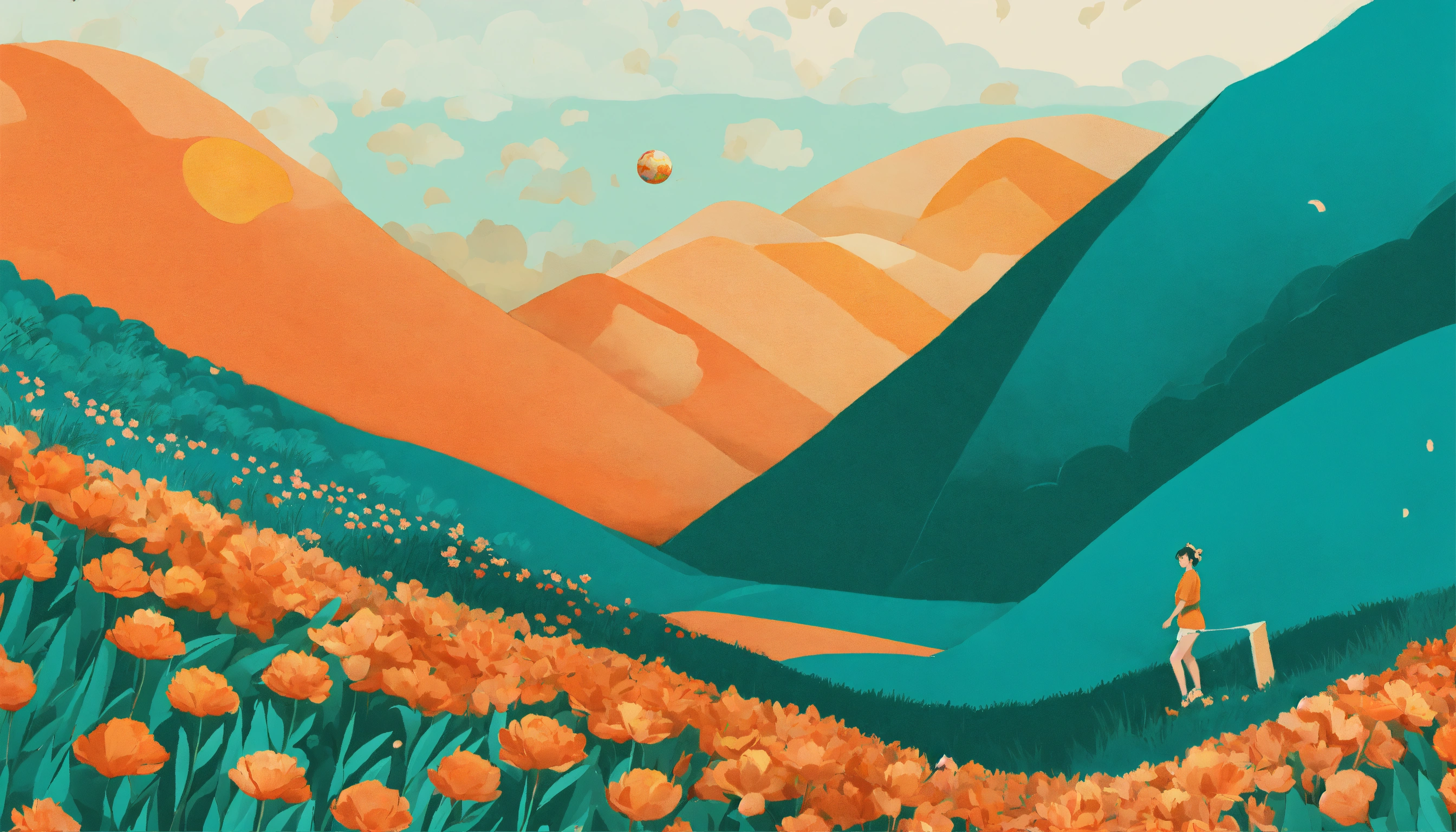 Person lying on a hill, paper ball rolling down the hill, paradise garden, hills, flowers, relax painted, tringle, quebe, minimal style, art lines, two colors, 2d illustration, orange türkis, flowers