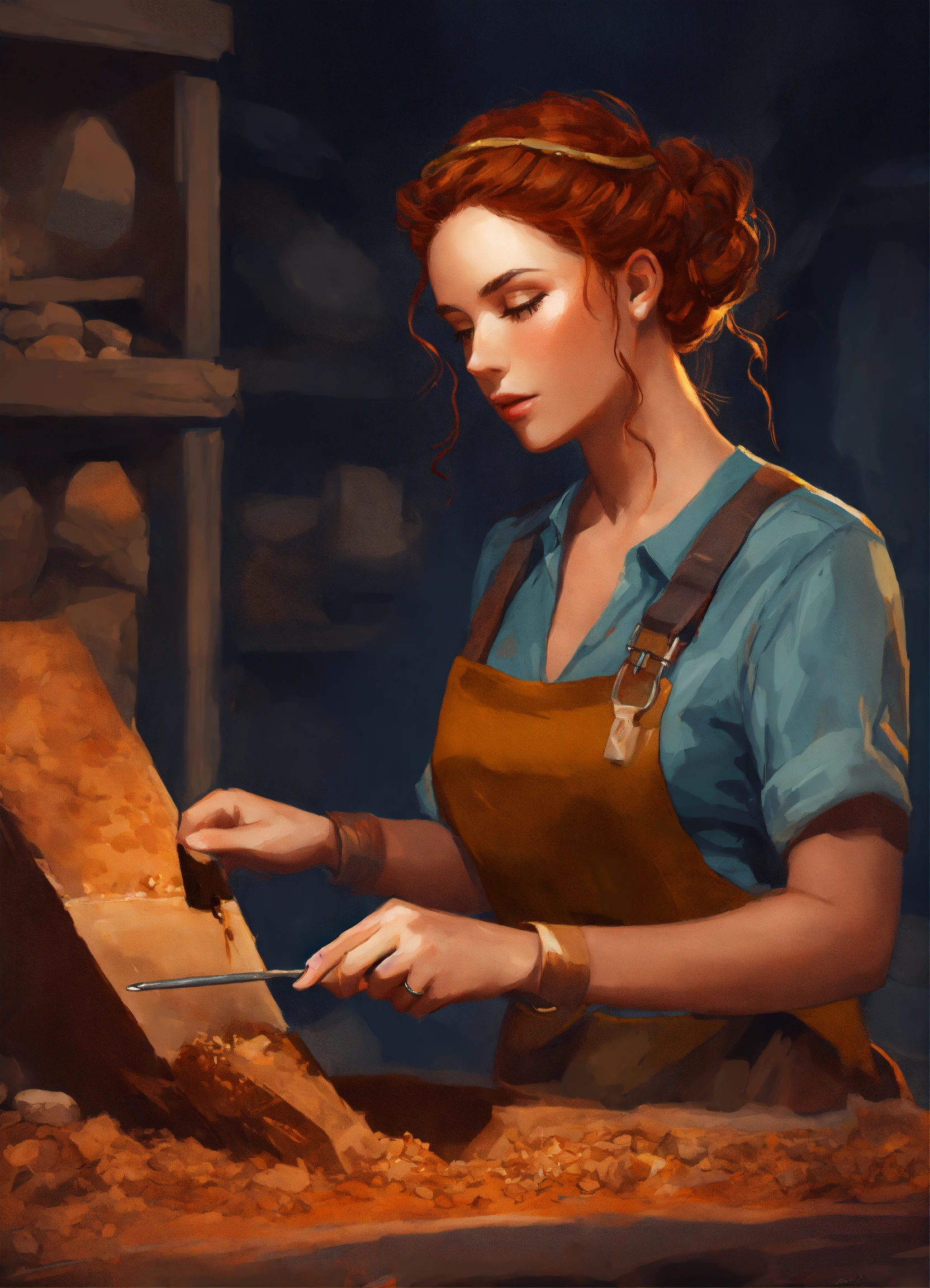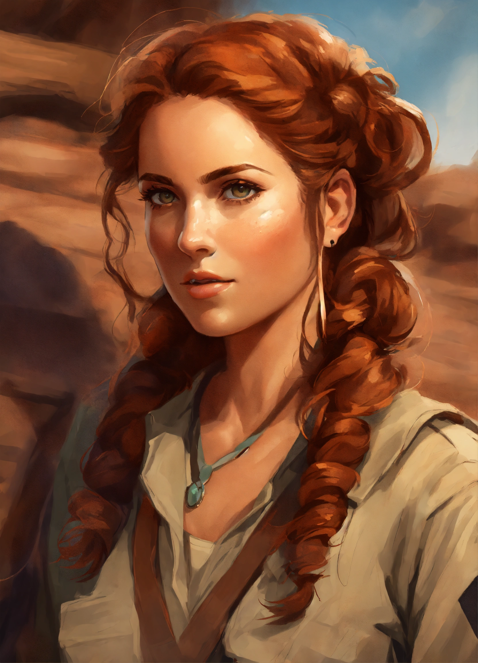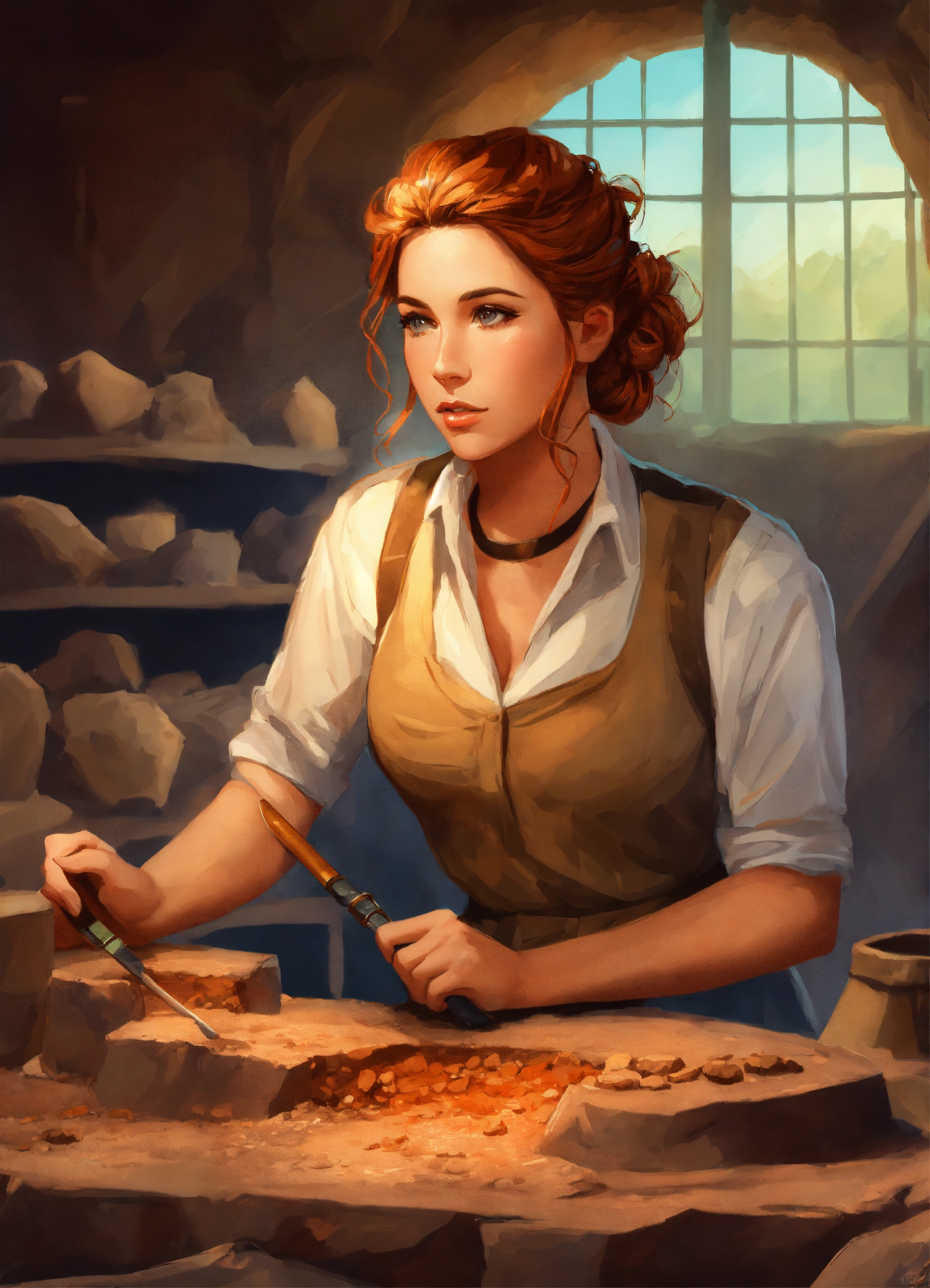Digital art painting of a beautiful archaeologist woman with ringlet copper hair in an updo, she is working at an archaeological dig site