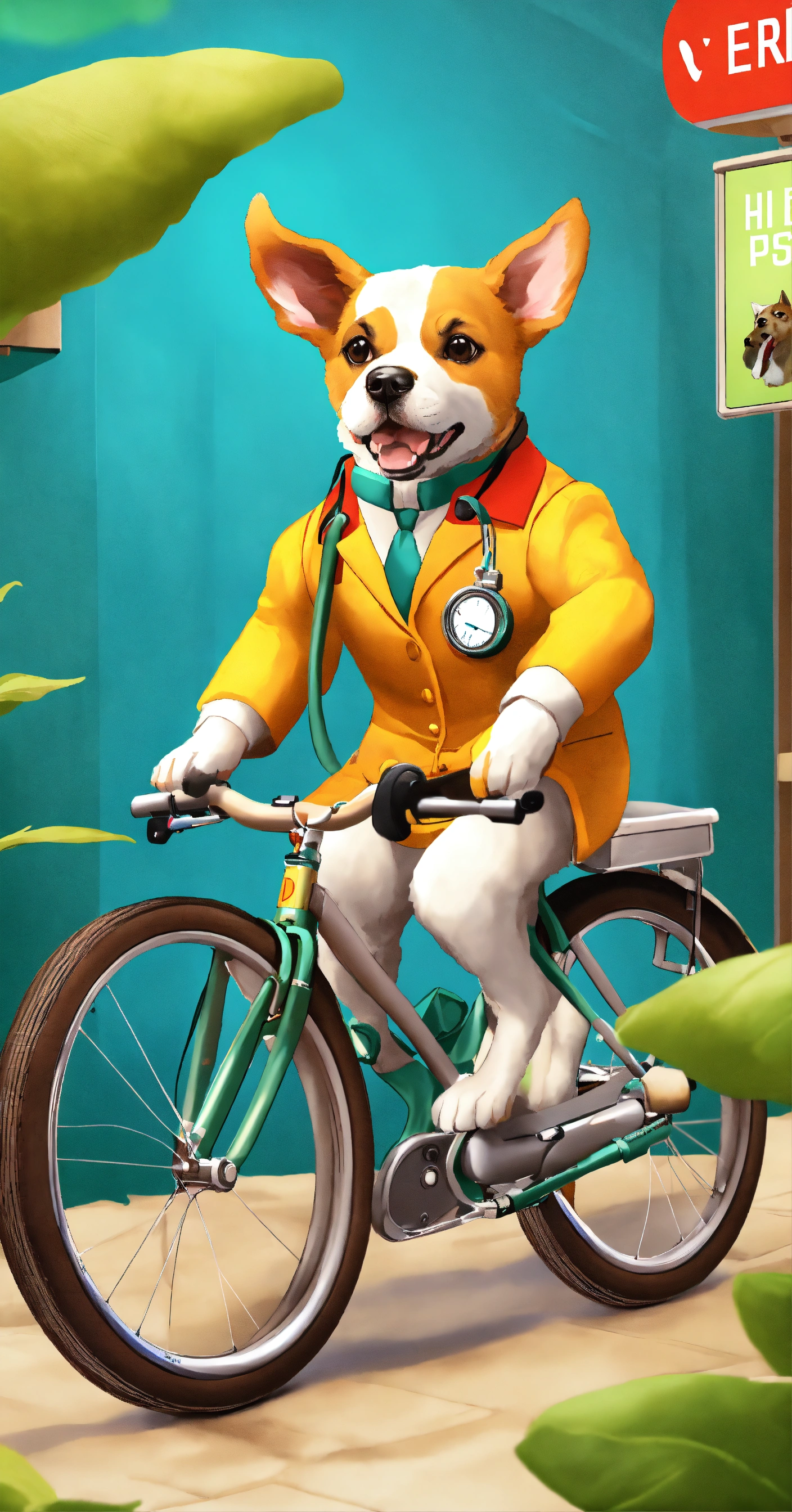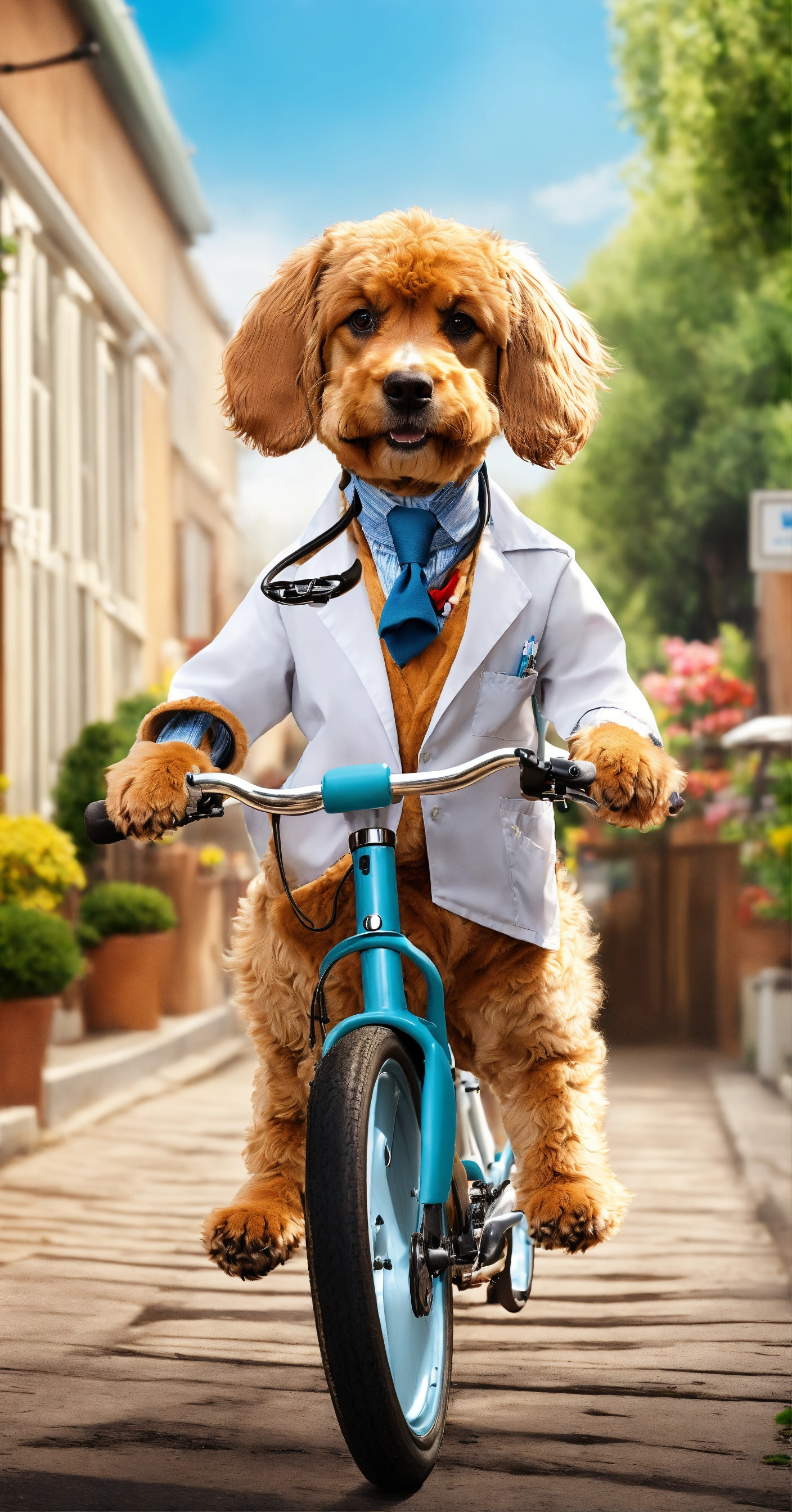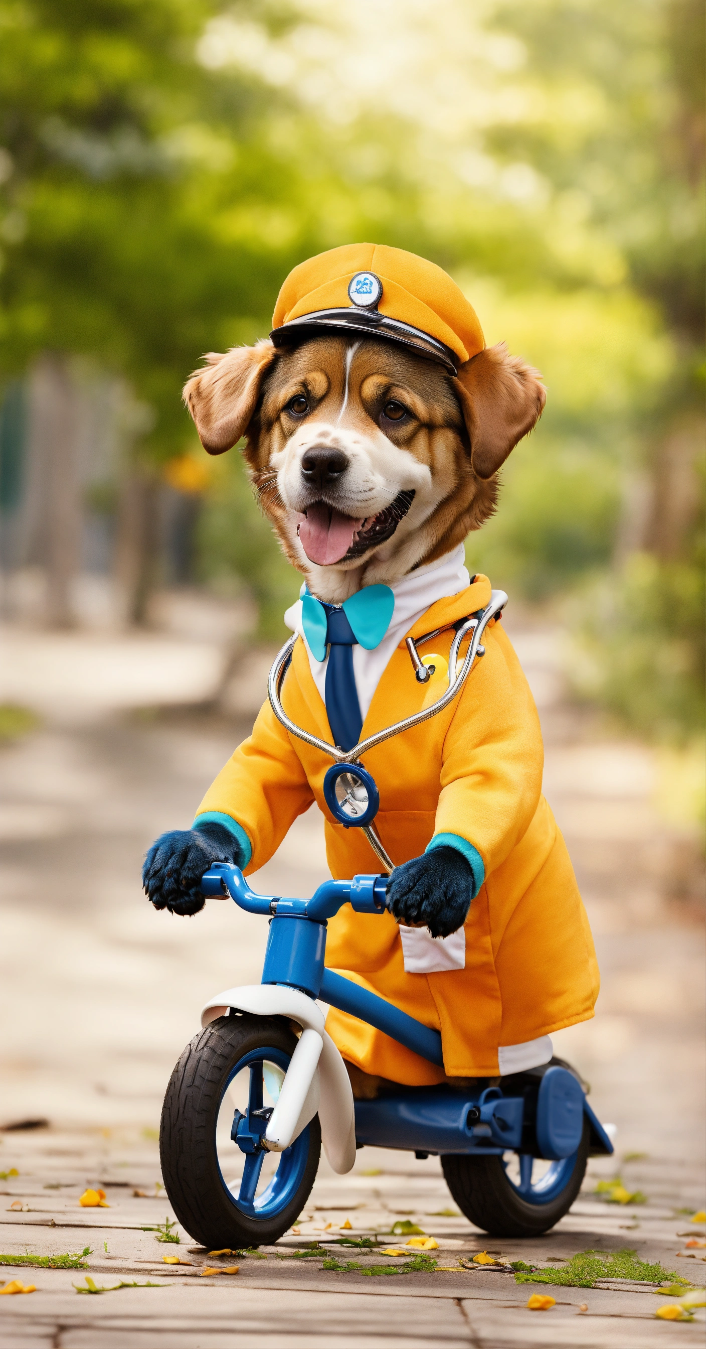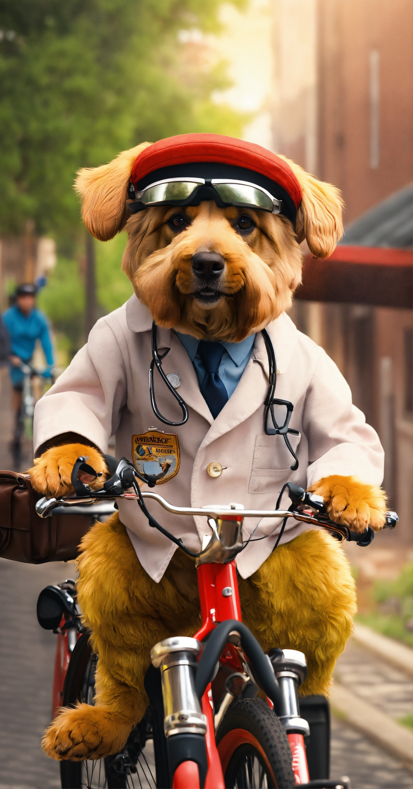 Generate an image of a dog dressed as a veterinarian, riding a bike to a pet clinic to help furry patients.