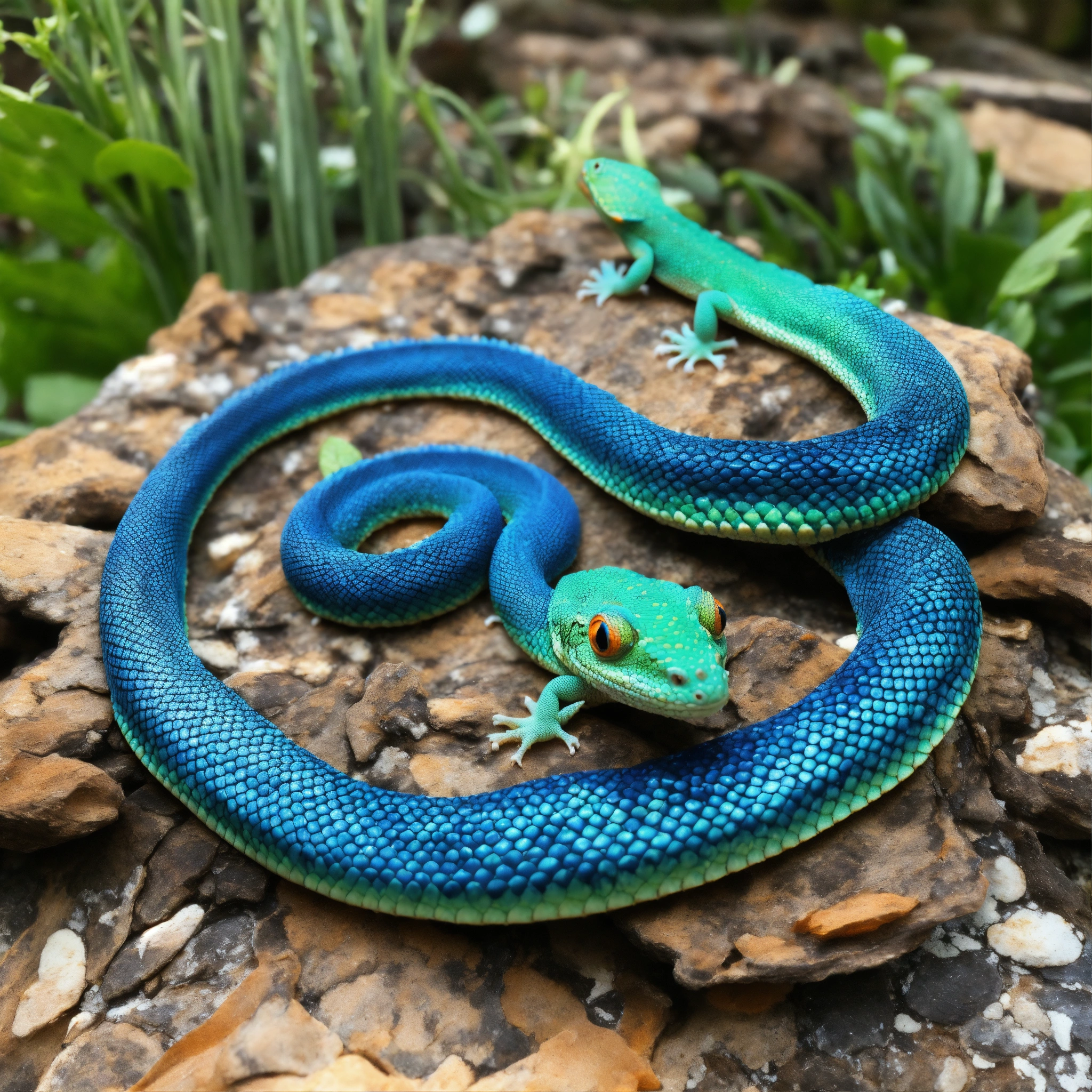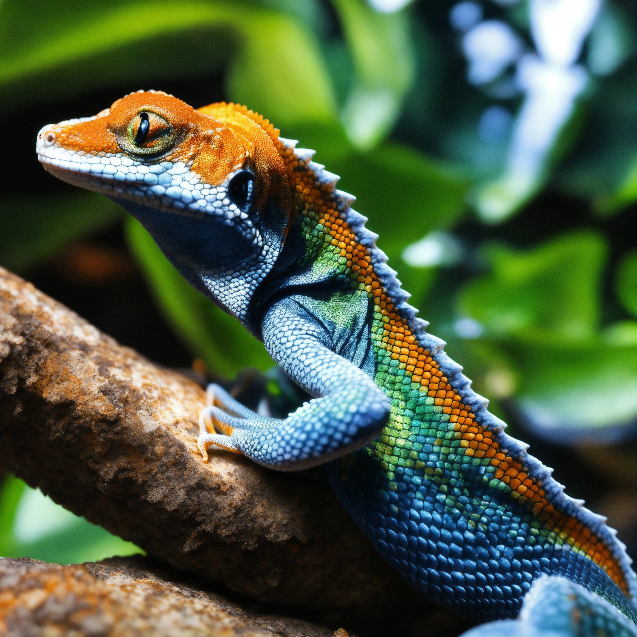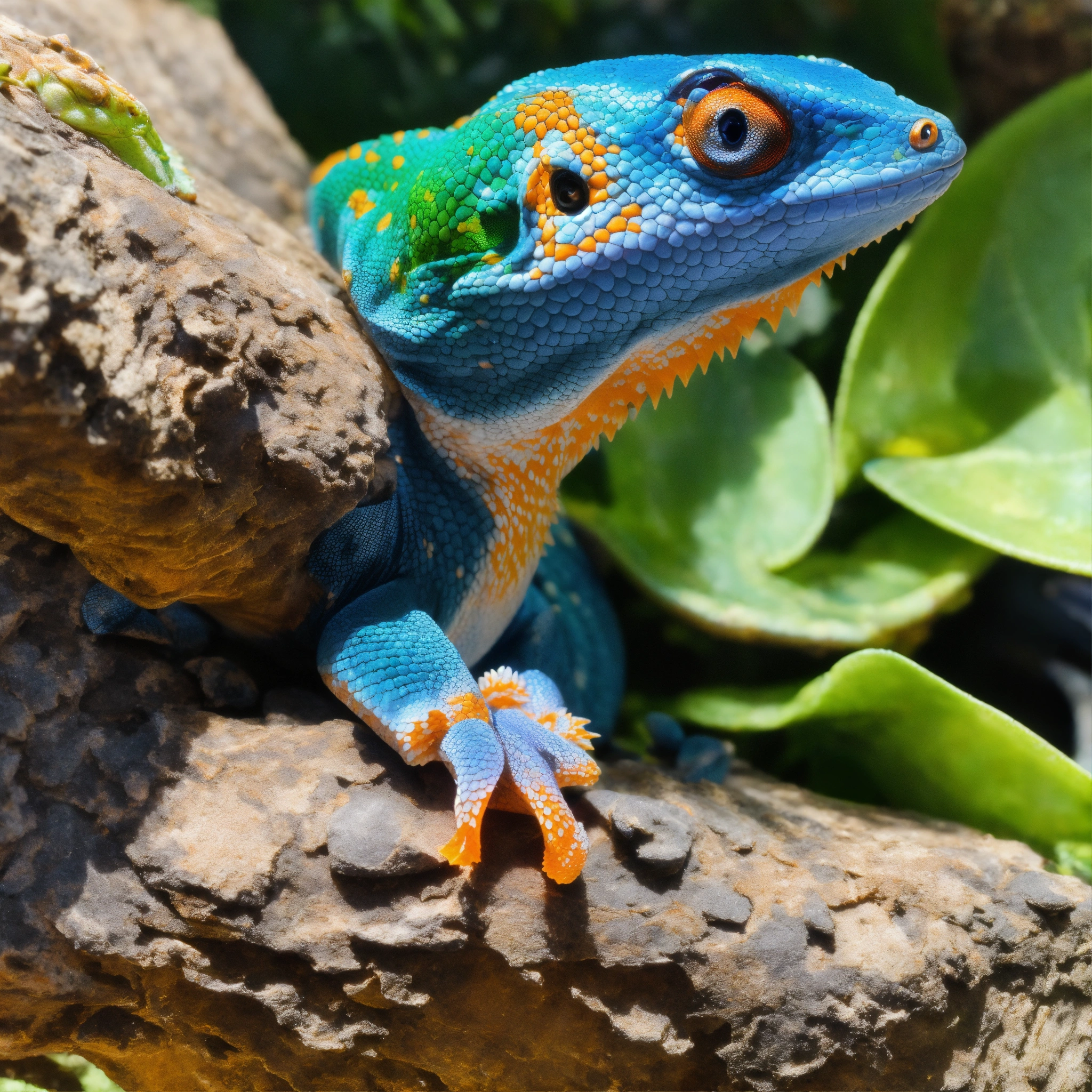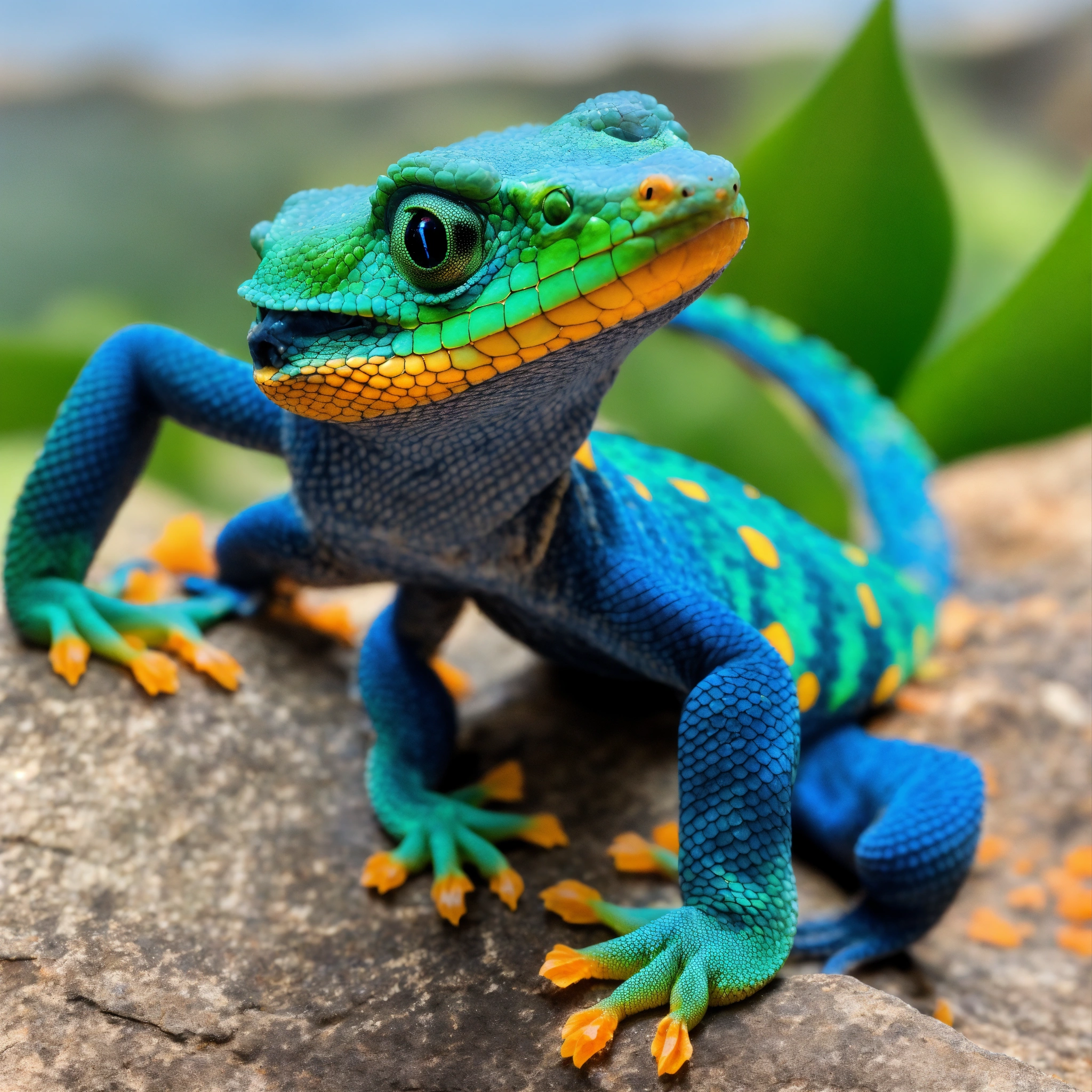 Celestial gecko (dark blue scales, orange scales, aether green scales around the neck, one foot is white scaled)
