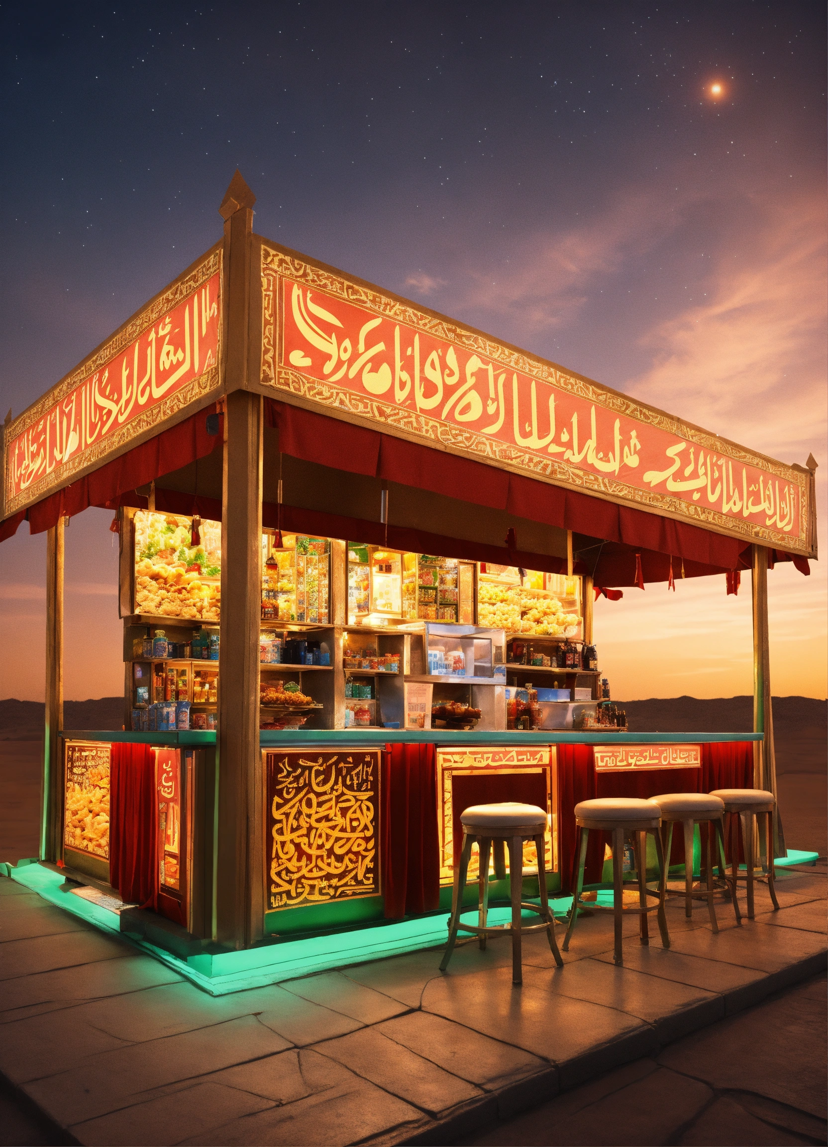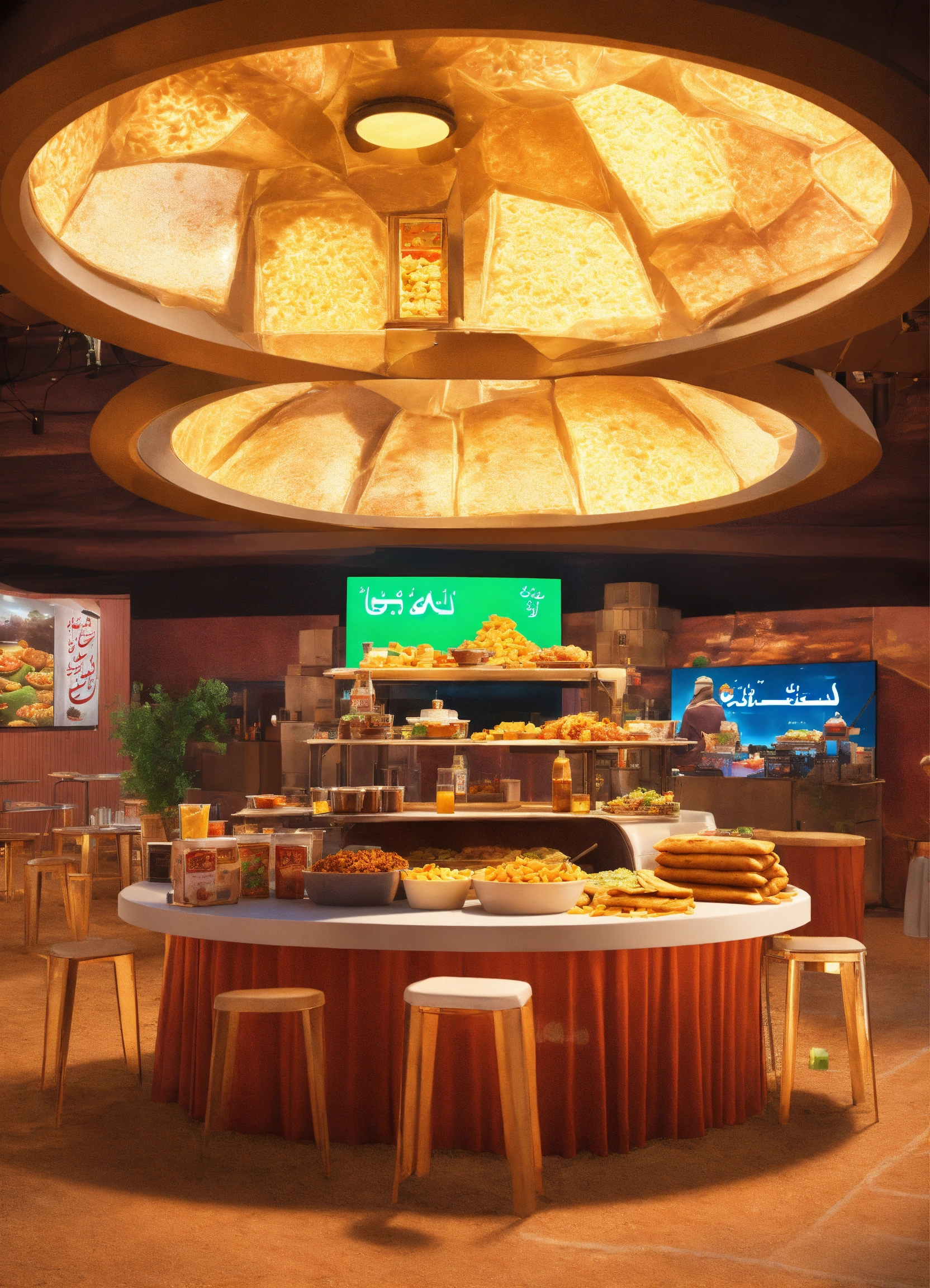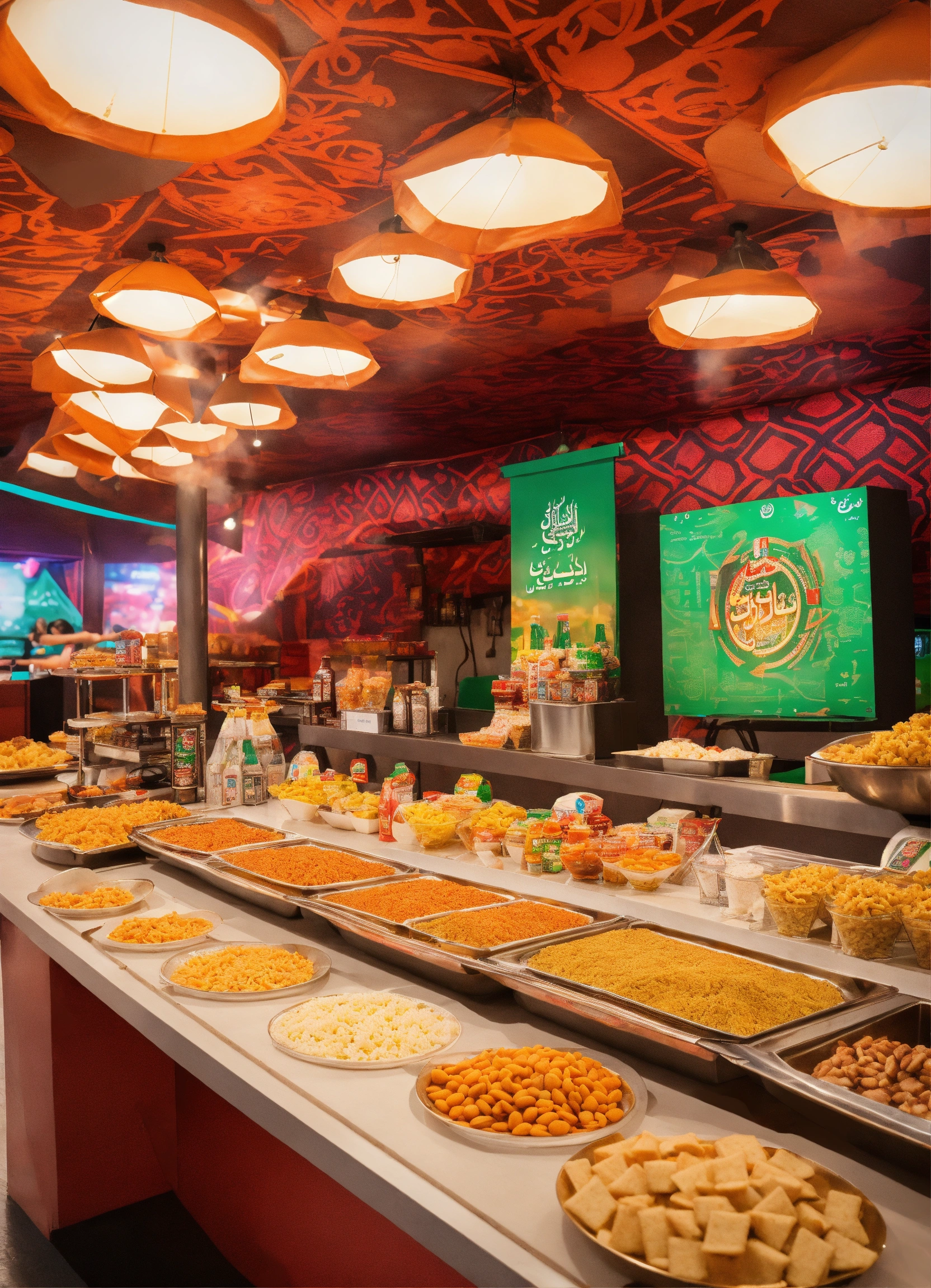 Generate an image of the concession stand with a blend of traditional saudi food and gaming-themed snacks. in a futuristic arabic saudi theme tents, indoor