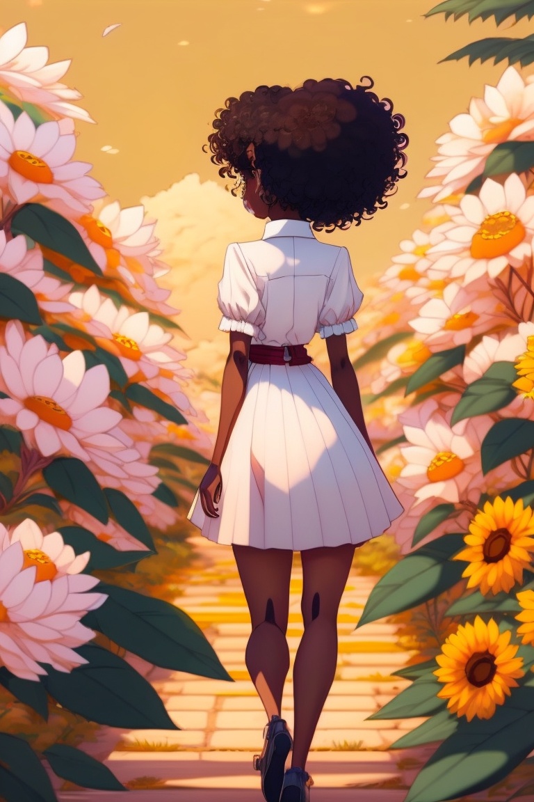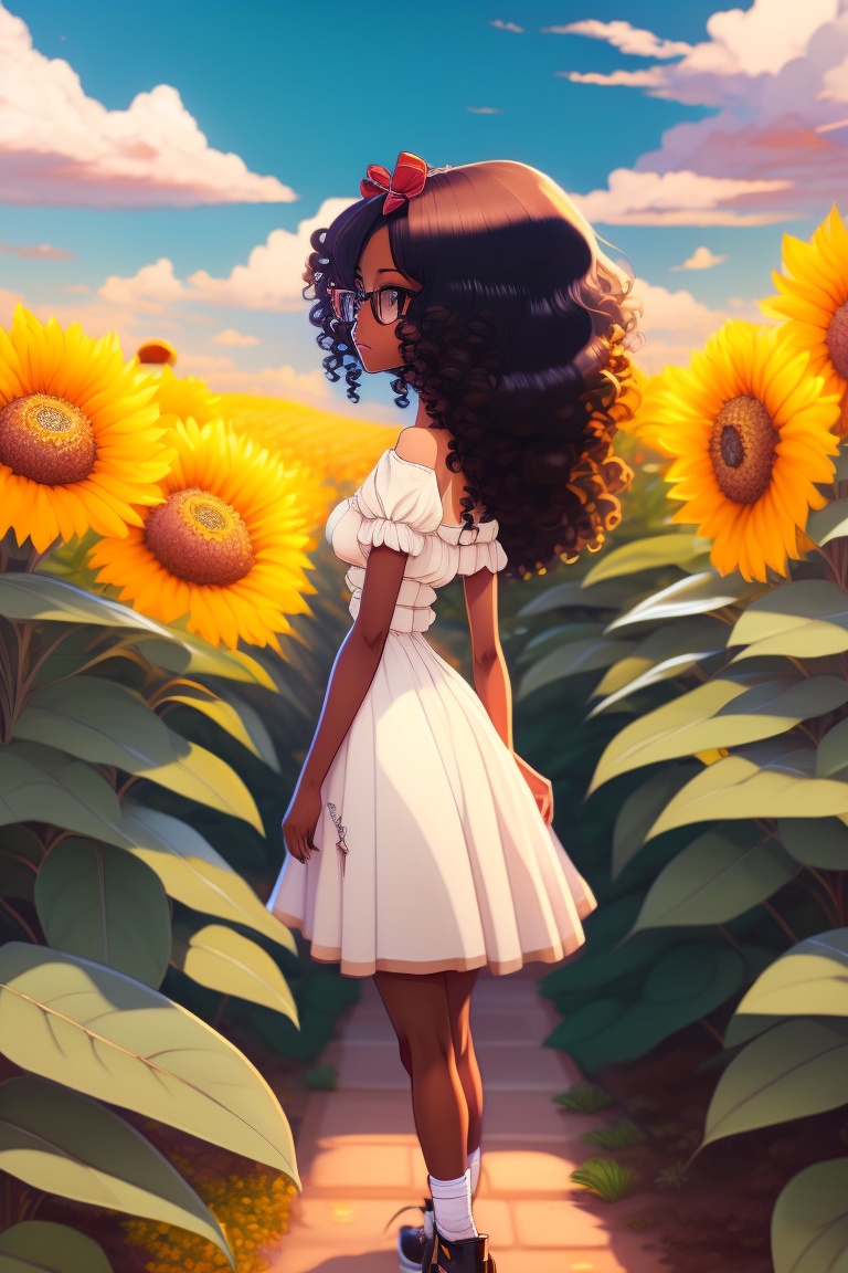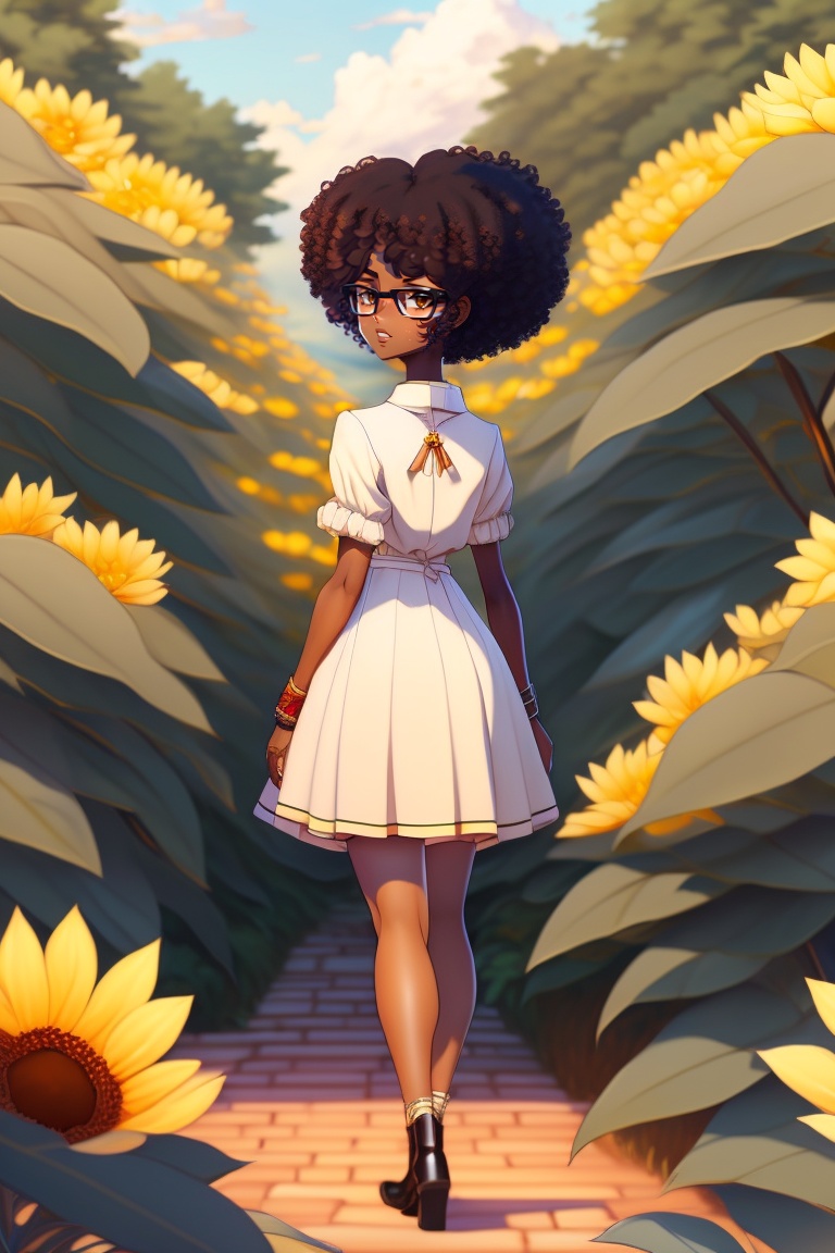 Black girl of 90's vintage anime style, cute anime girl, anime line art, 27 years old, thick body, wearing a medium white dress, far from camera, medium afro hair black, dark brown eyes, thin frame glasses, back visible, walking on the sunflower garden