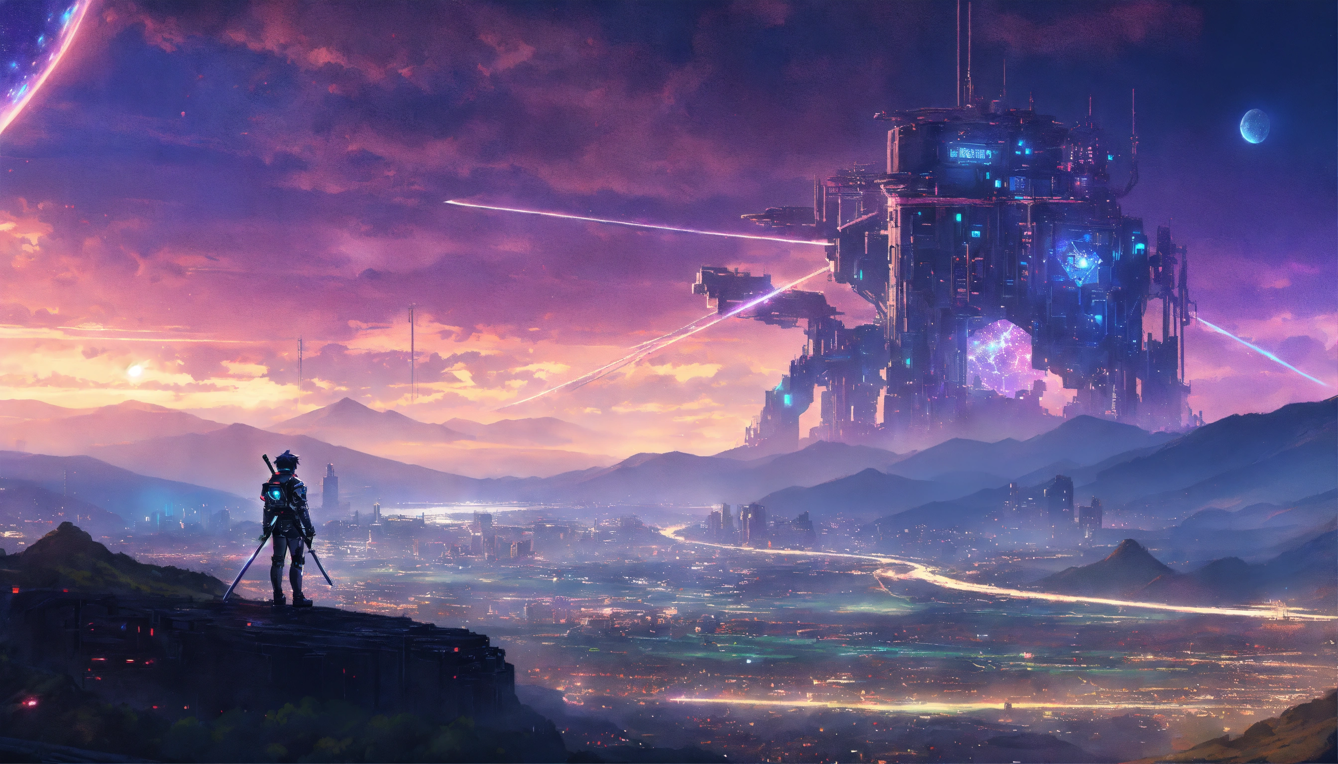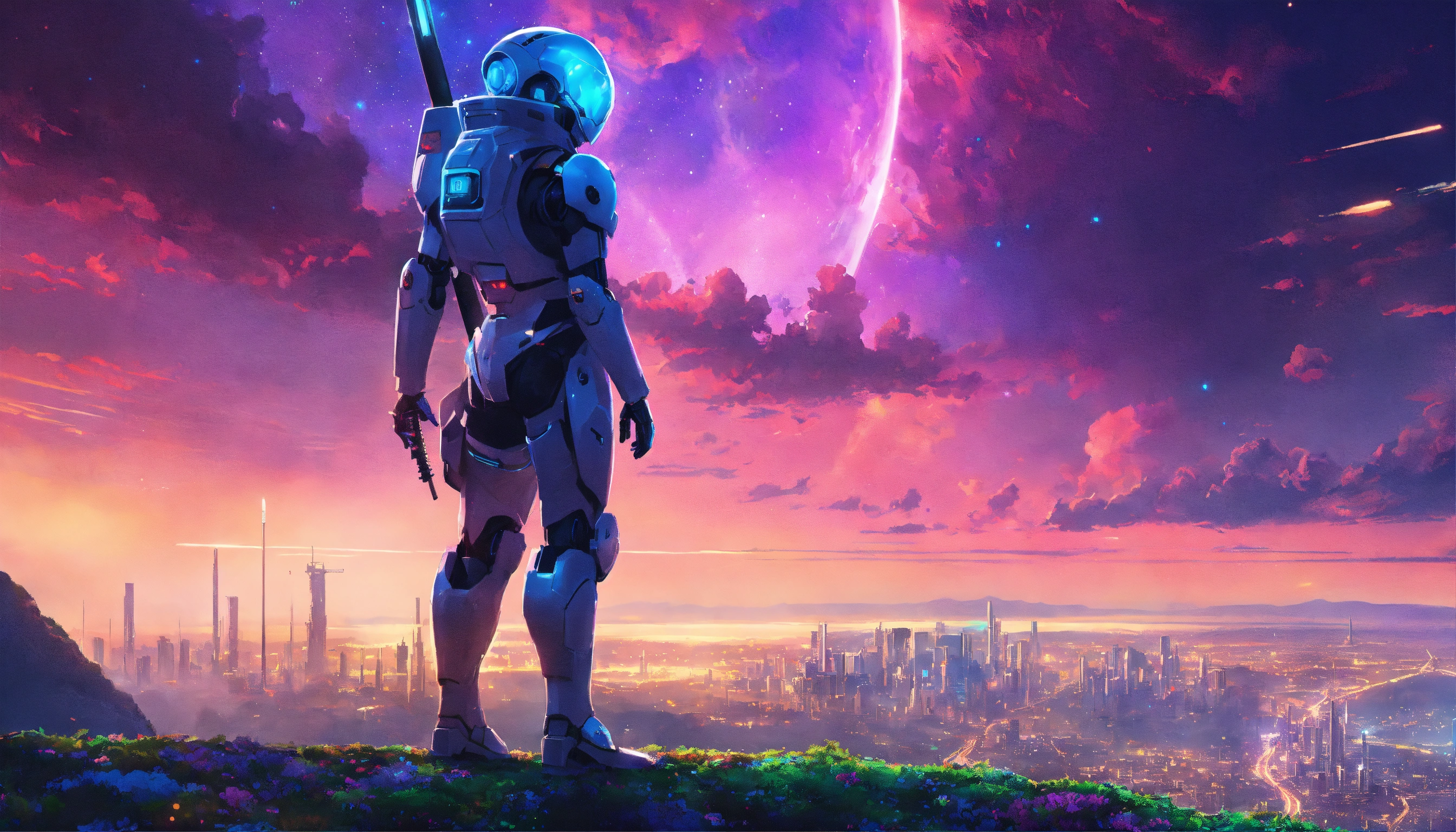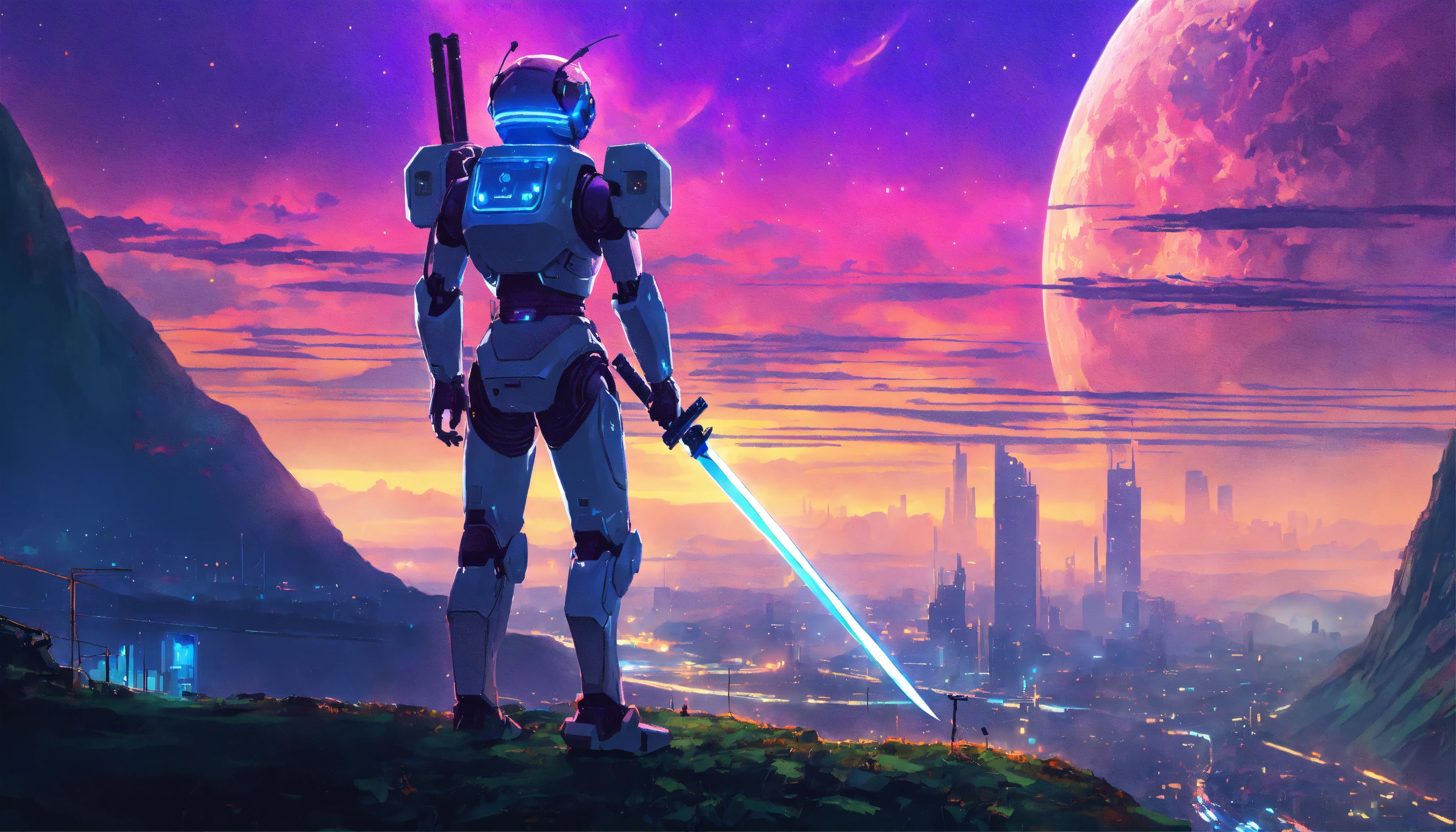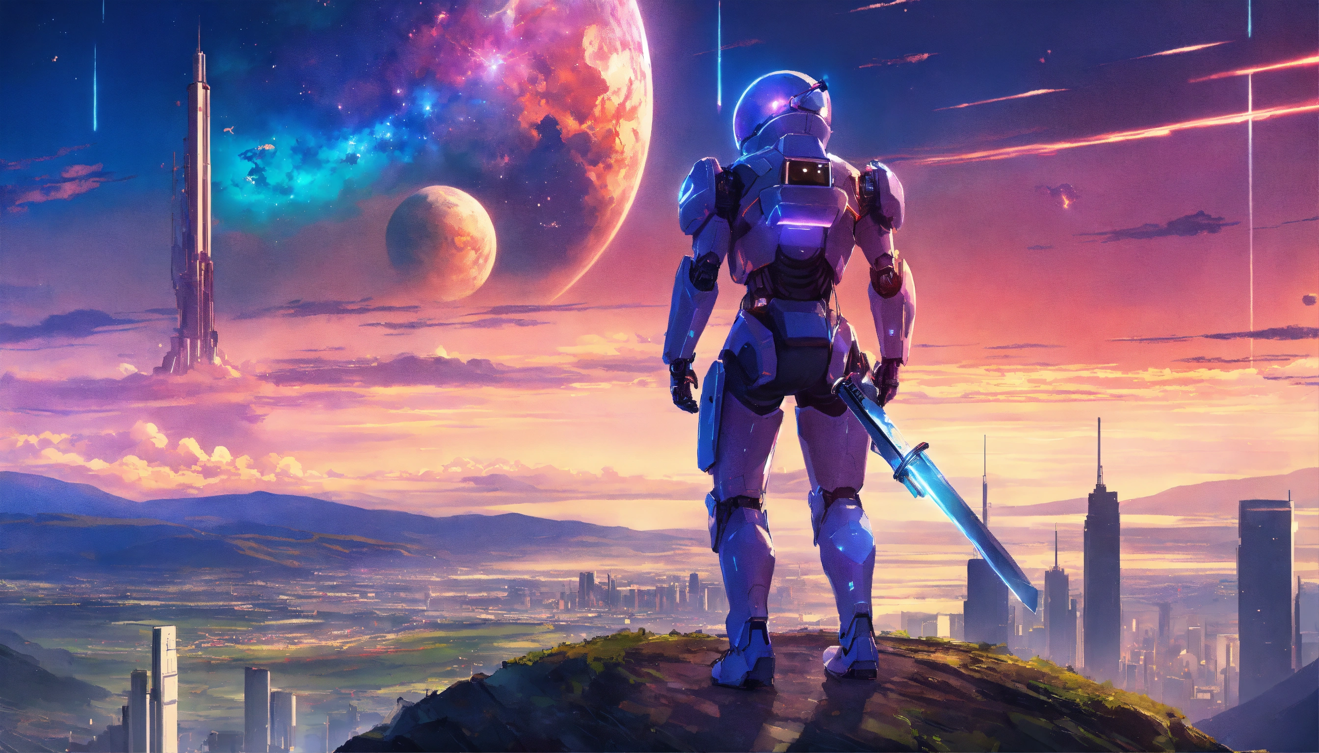 Makoto shinkai, small robotic android man with katana in spacesuit on the right of the image, futuristic cyberpunk dystopia city in a valley, vibrant nebula sky, blue and purple hazes
