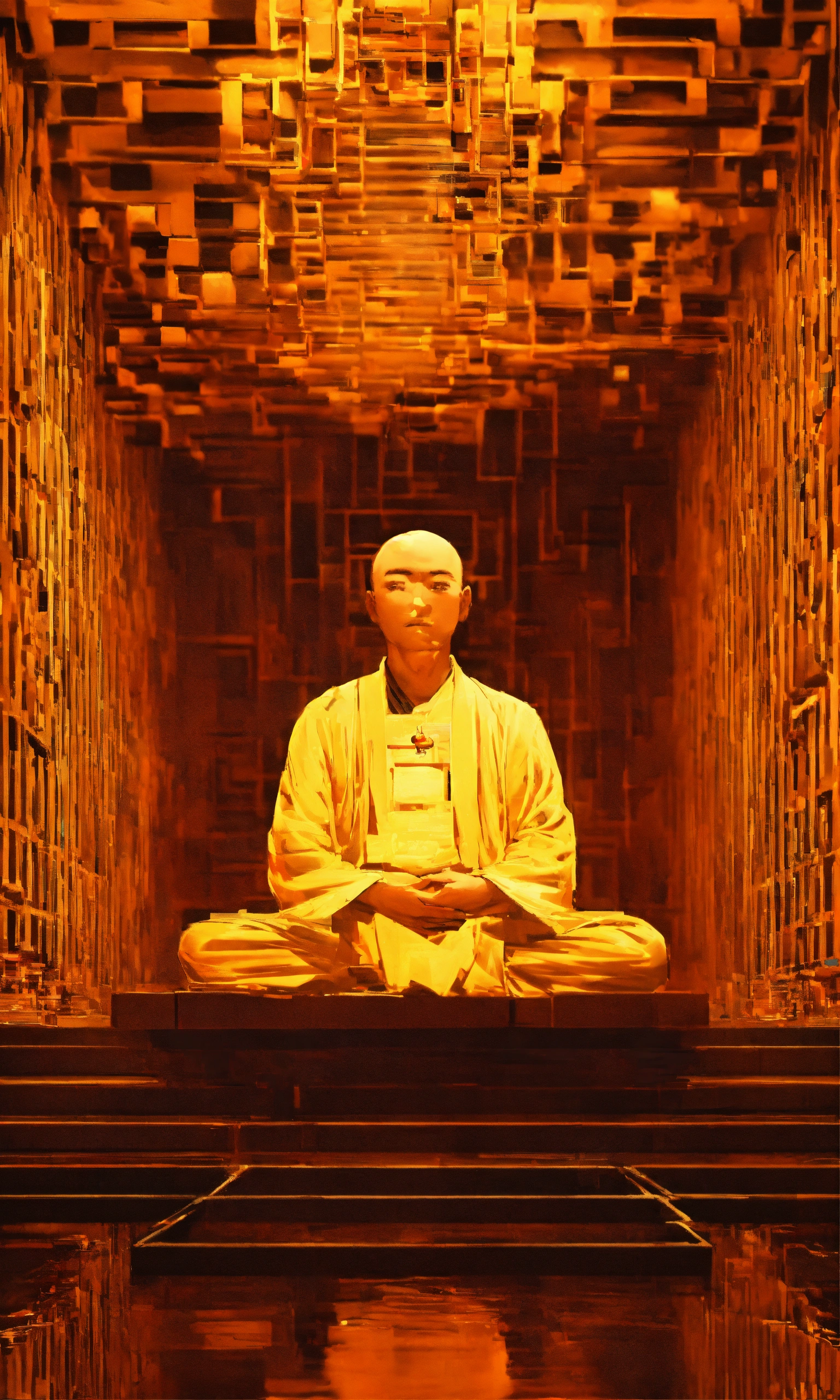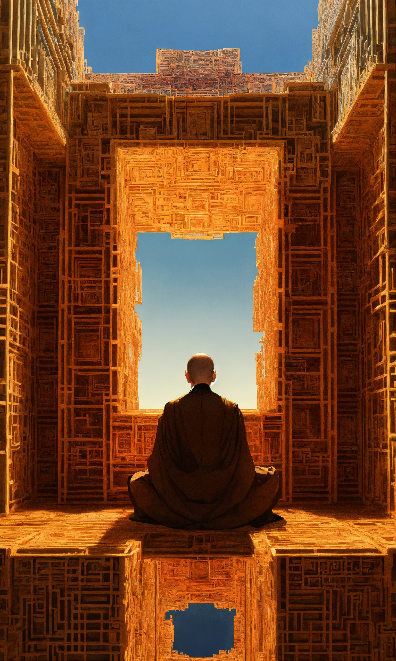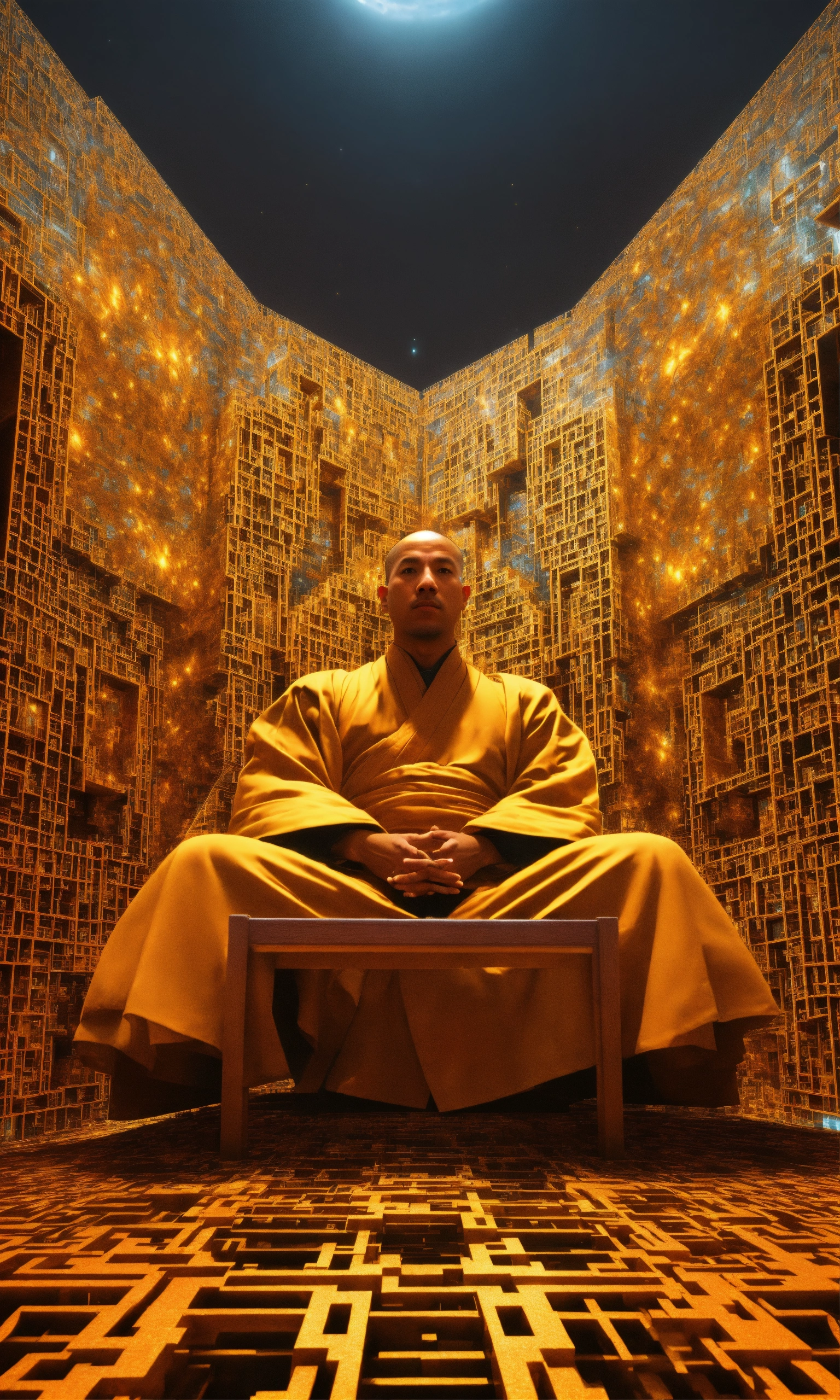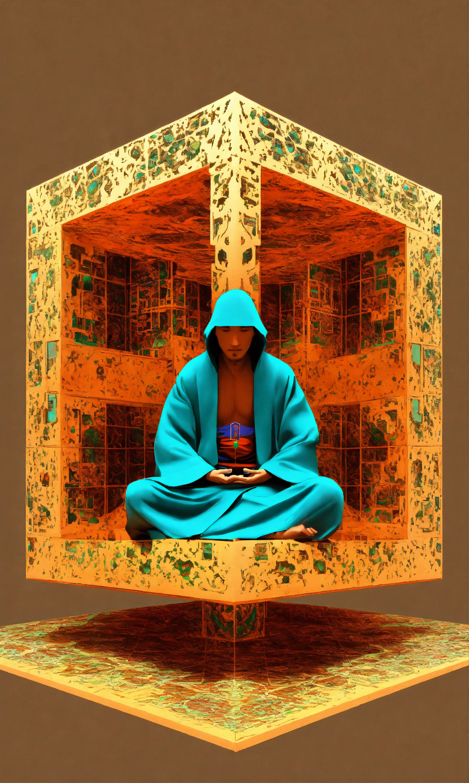 Sitting taoist monk tesseract body fractal three point perspective hypercube melting mandelbrot