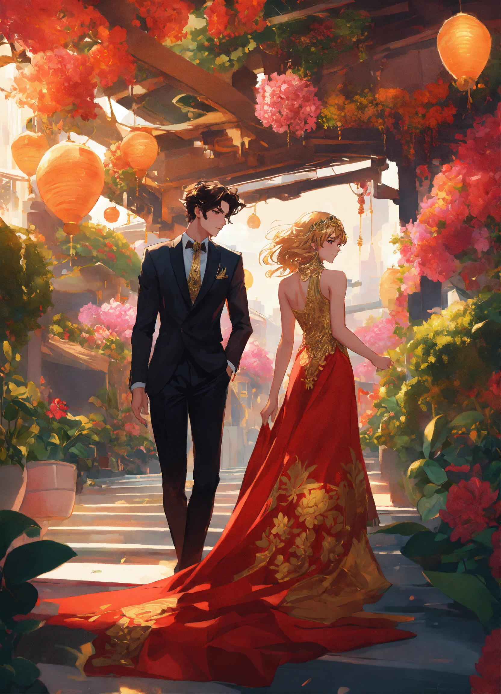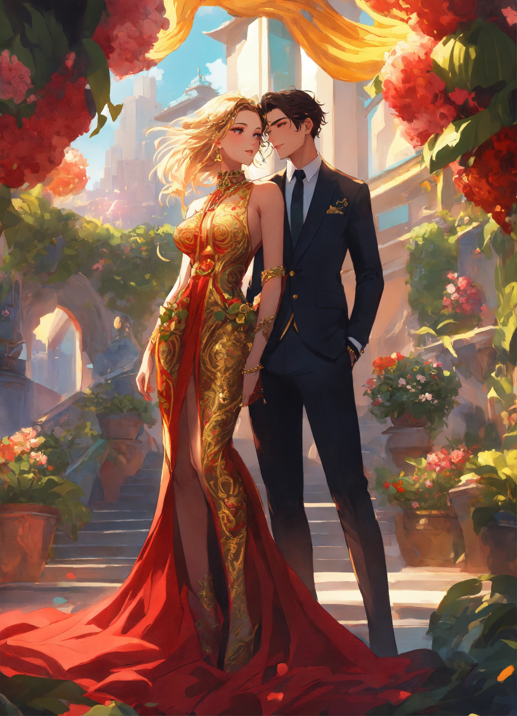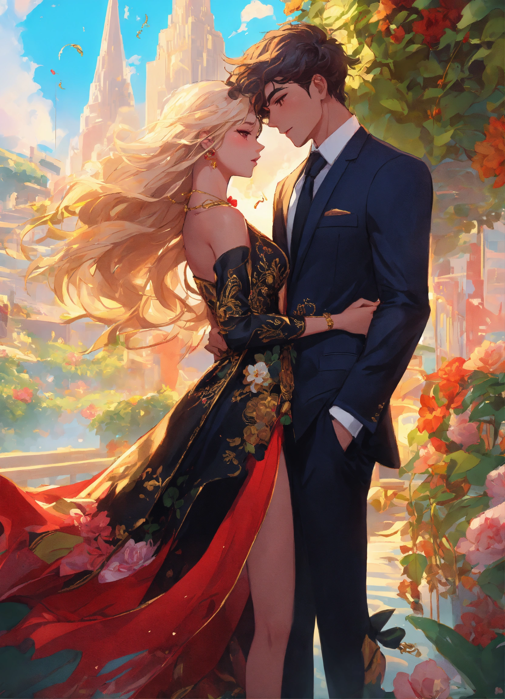 Illustration of beautiful city of towering skyscrapers, islands, vibrant colors, fair skin, the young man wears a intricate black suit with gold ornaments, has wavy black tousled hair, the golden haired woman wears a red intricate dress with gold adornments that shows legs, maximalist, 8k photo, animestyle, by artgerm, by rossdraws, trending on artstation, garden, windy, flowers, circular perspective, romantic