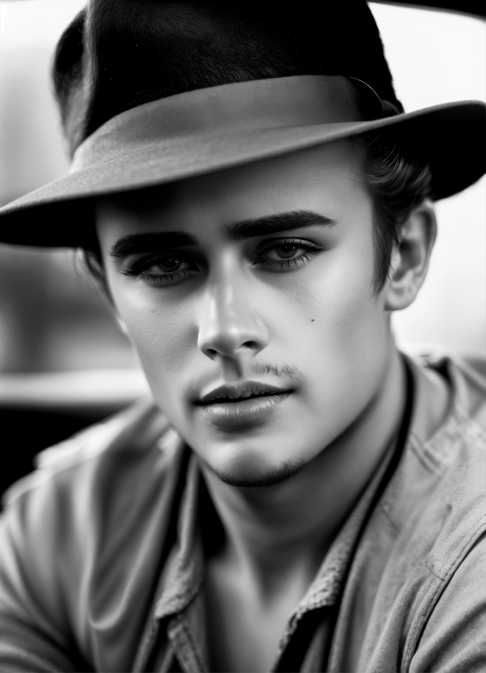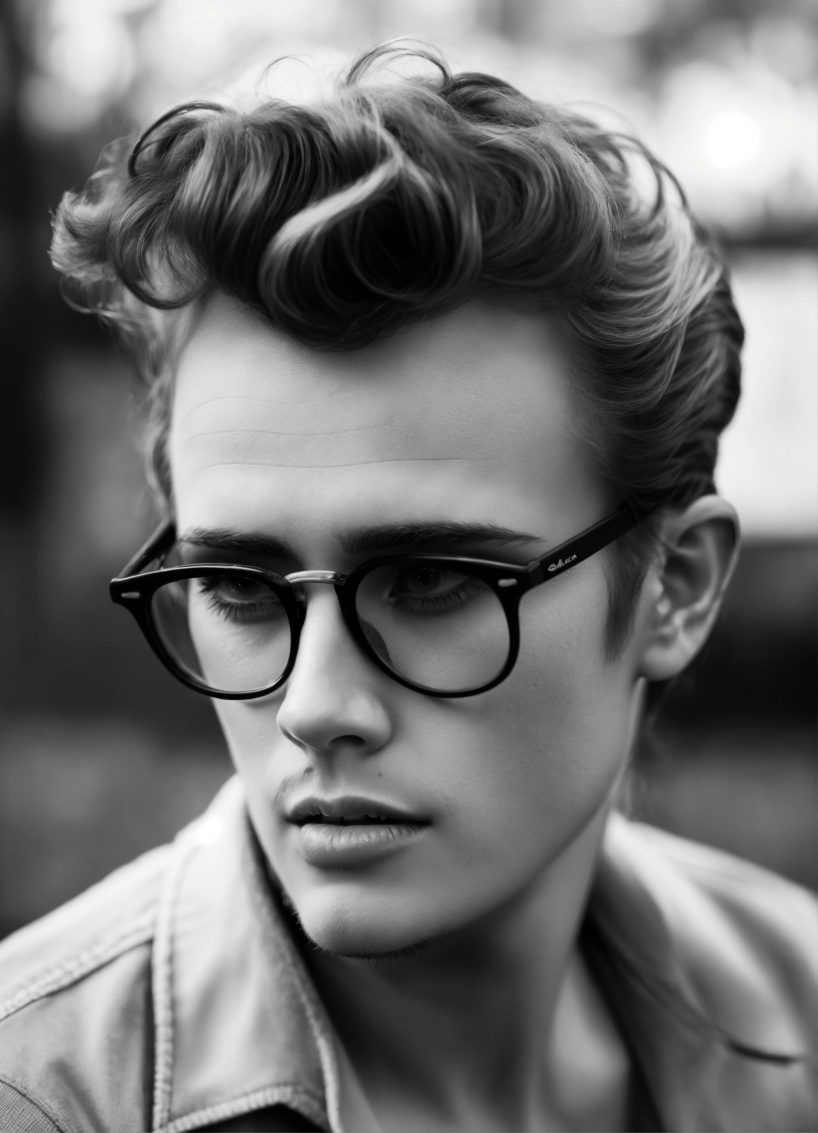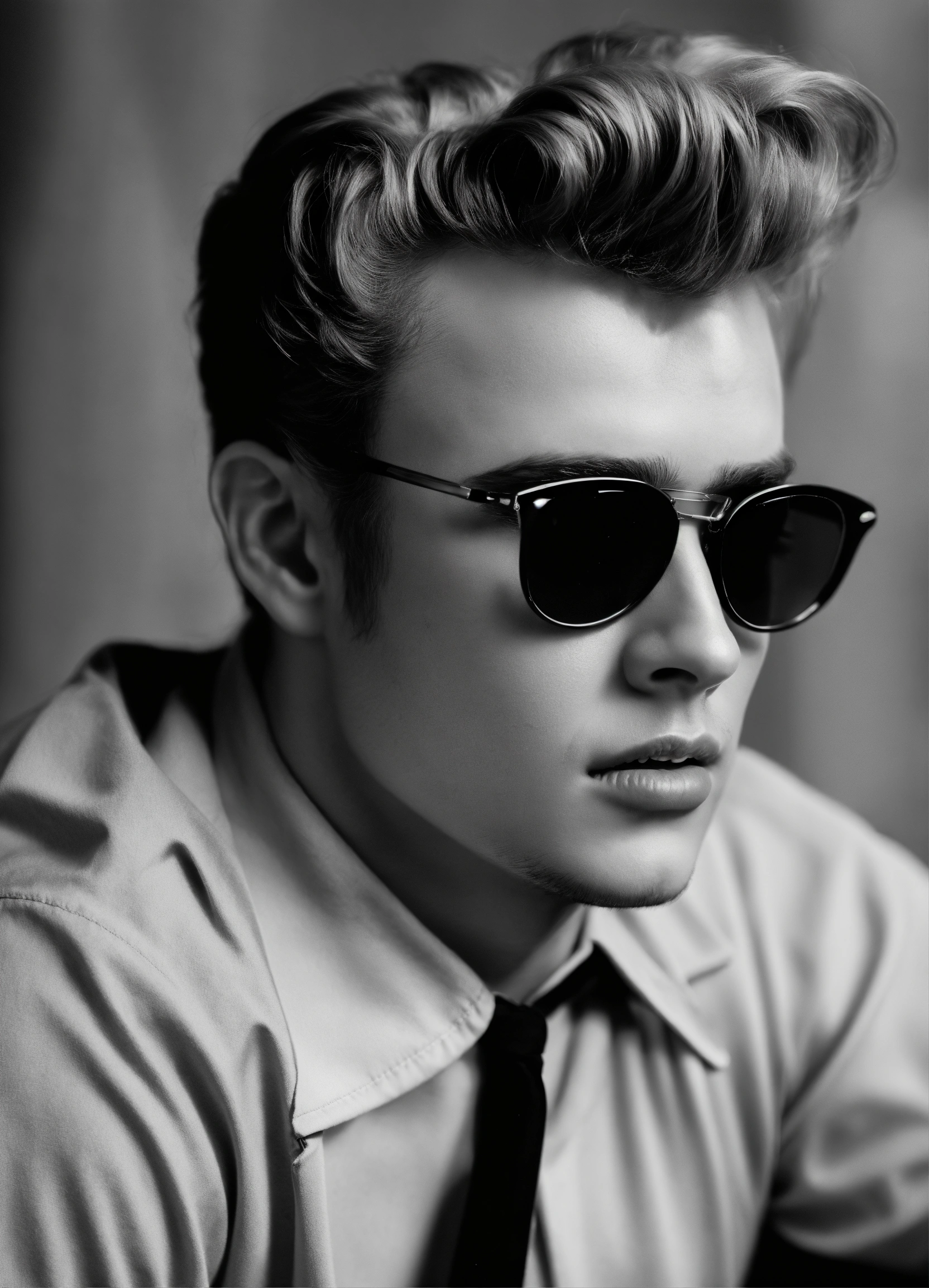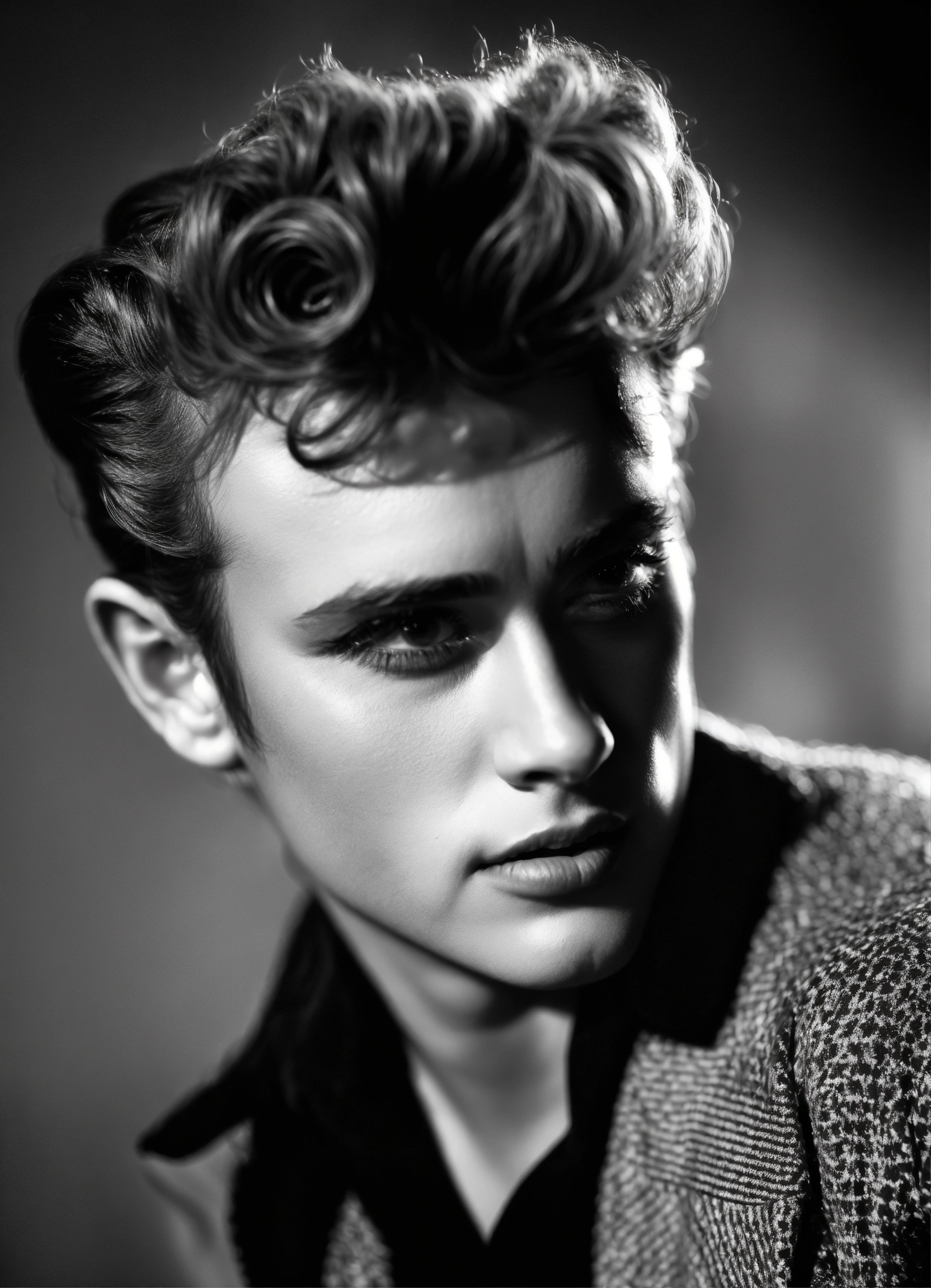 Photorealistic, blackandwhite photo, james dean, red lips, 50s style, cool and classy attitute, pin up, soft focus, set card, moviestar, detailed, soft focus, 8k, q2