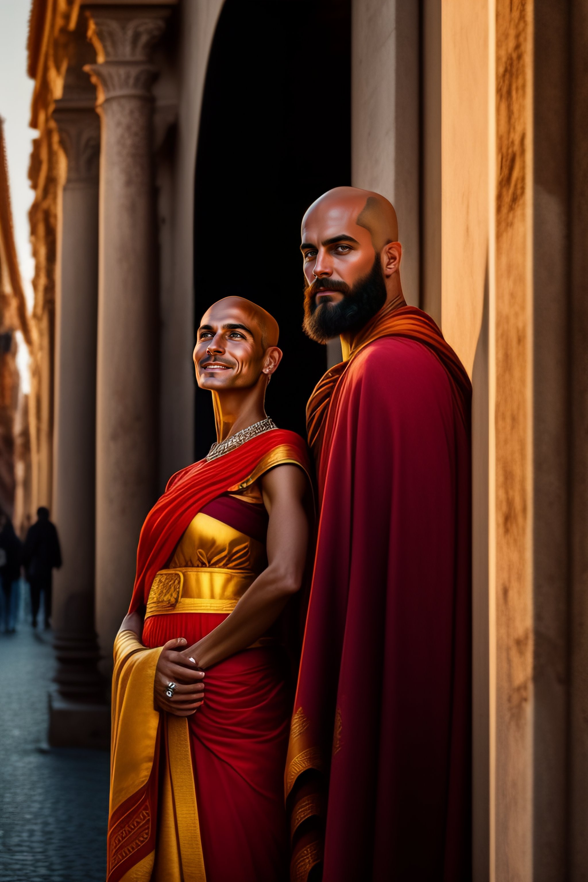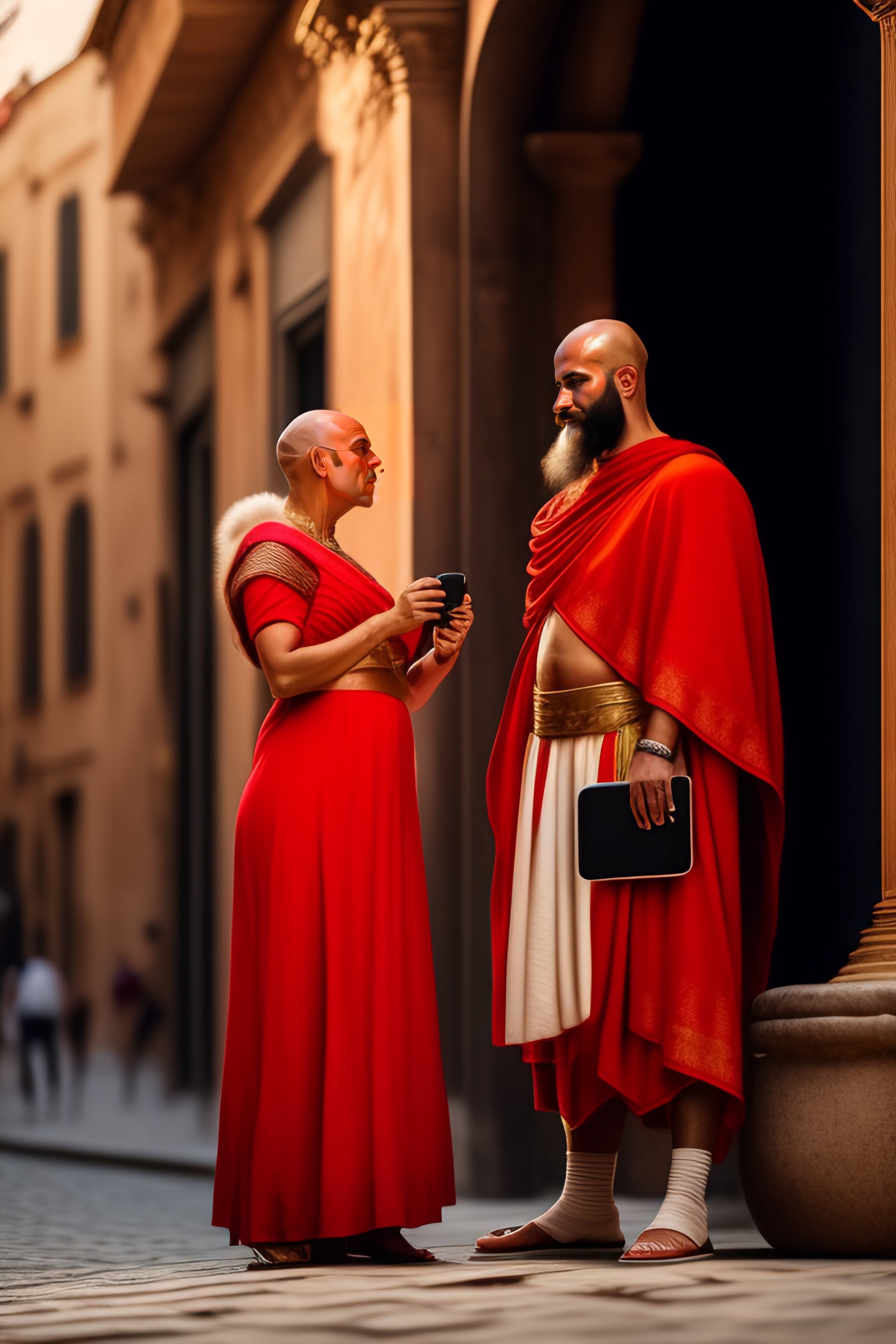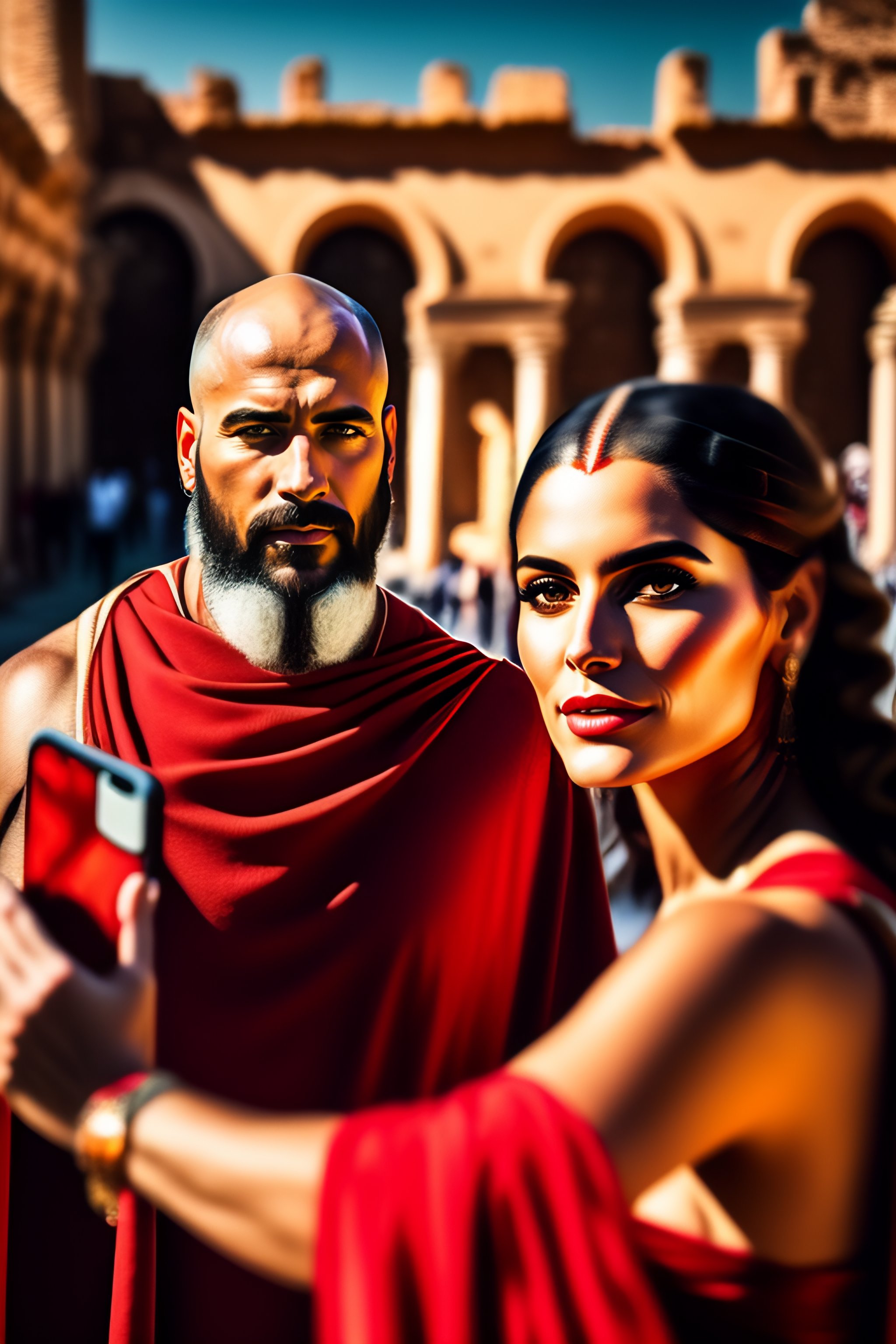 Portrait of a bald roman man taking a selfie in a street of antique roma, coliseum, 46 before christ, in a red roman toga, while a beautiful roman blond woman staring at him with surprise