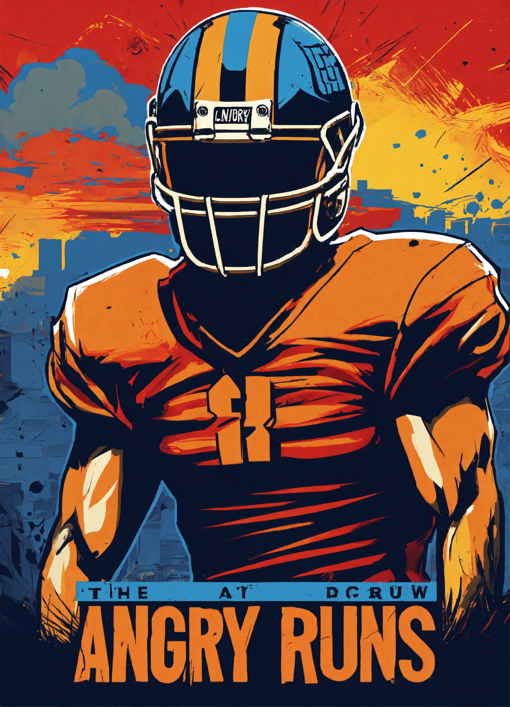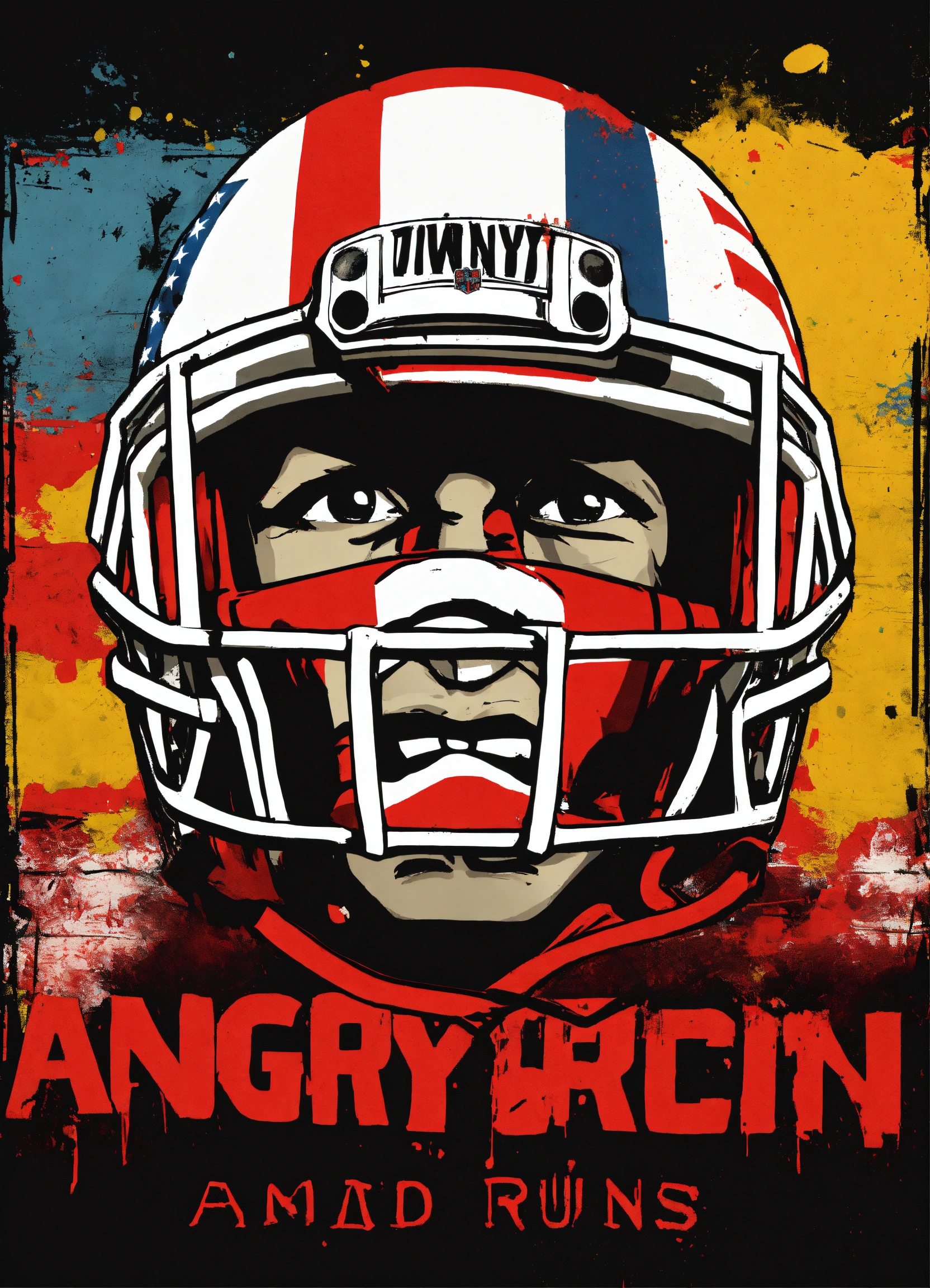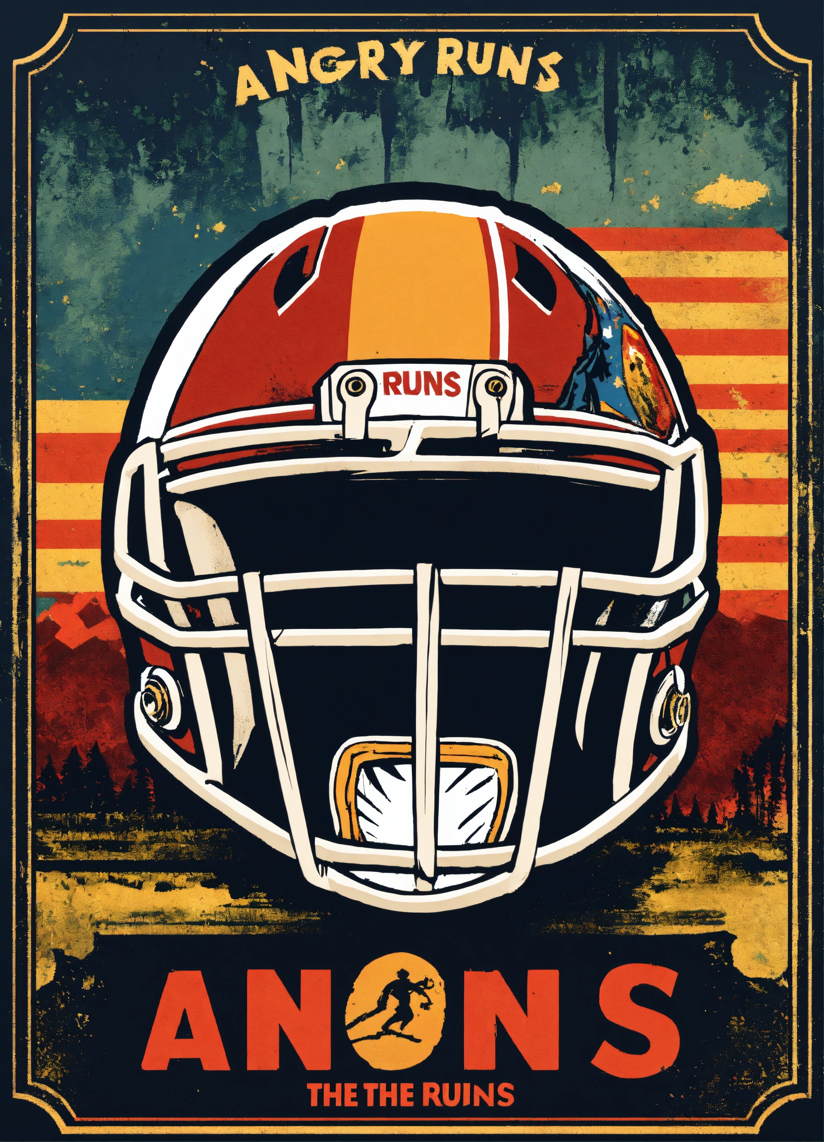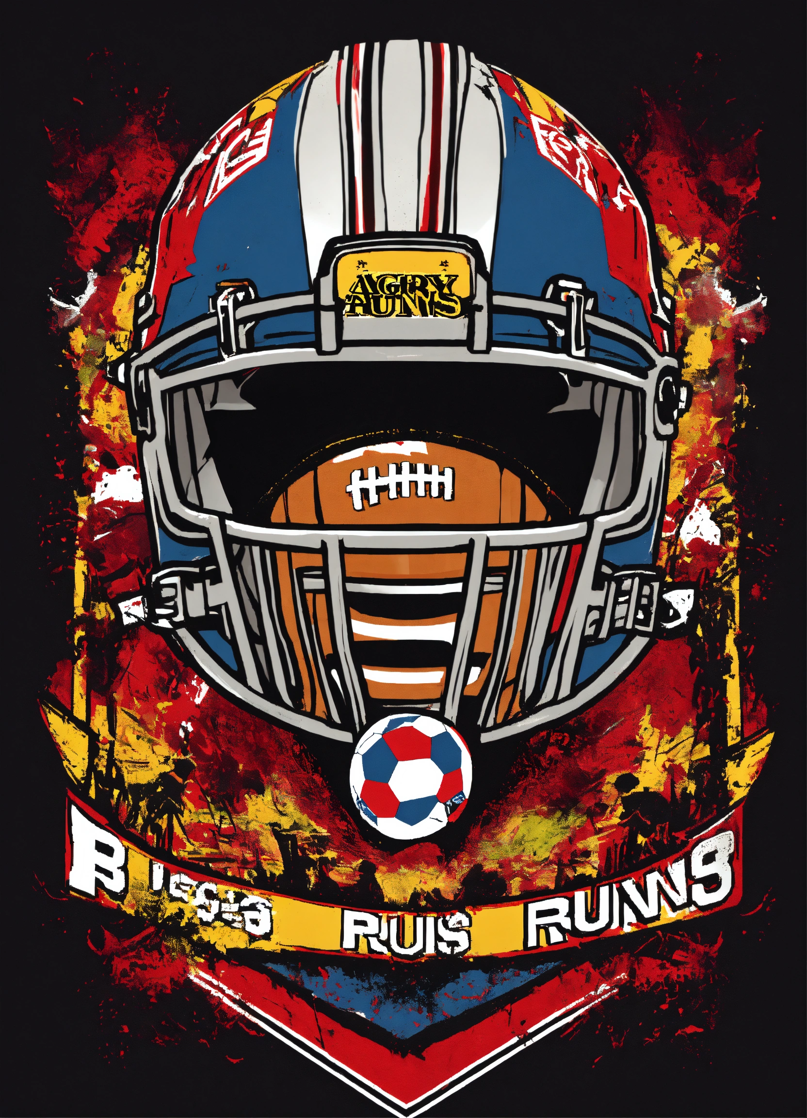 Distressed design for a black t-shirt with the text "angry runs" in a colorful font. the design should be eye-catching and visually appealing, and it should convey the meaning of the term "angry runs, " which is a football term used to describe a determined and aggressive ball carrier who refuses to go down easily. us flag in background here are some specific ideas for the design the text "angry runs" could be written in a large, bold font in the center of the shirt. the text could be surrounded by a distressed effect, such as cracks or tears in the fabric. the text could be colored in a variety of bright colors, such as red, orange, and yellow. the design could also include other football-related elements, such as a football helmet, cleats, or a yard line. overall, the design should be eye-catching and visually appealing, and it should convey the meaning of the term "angry runs."