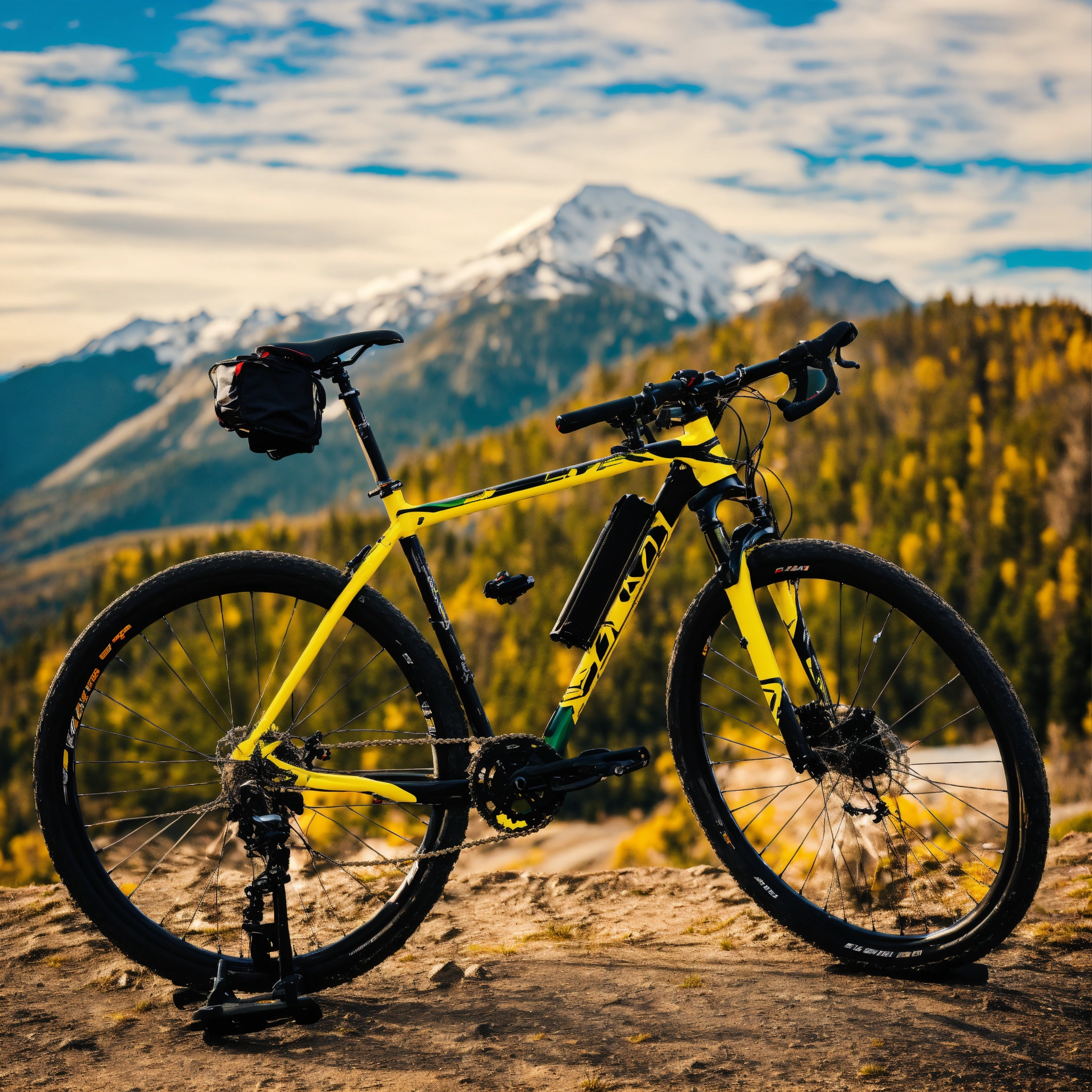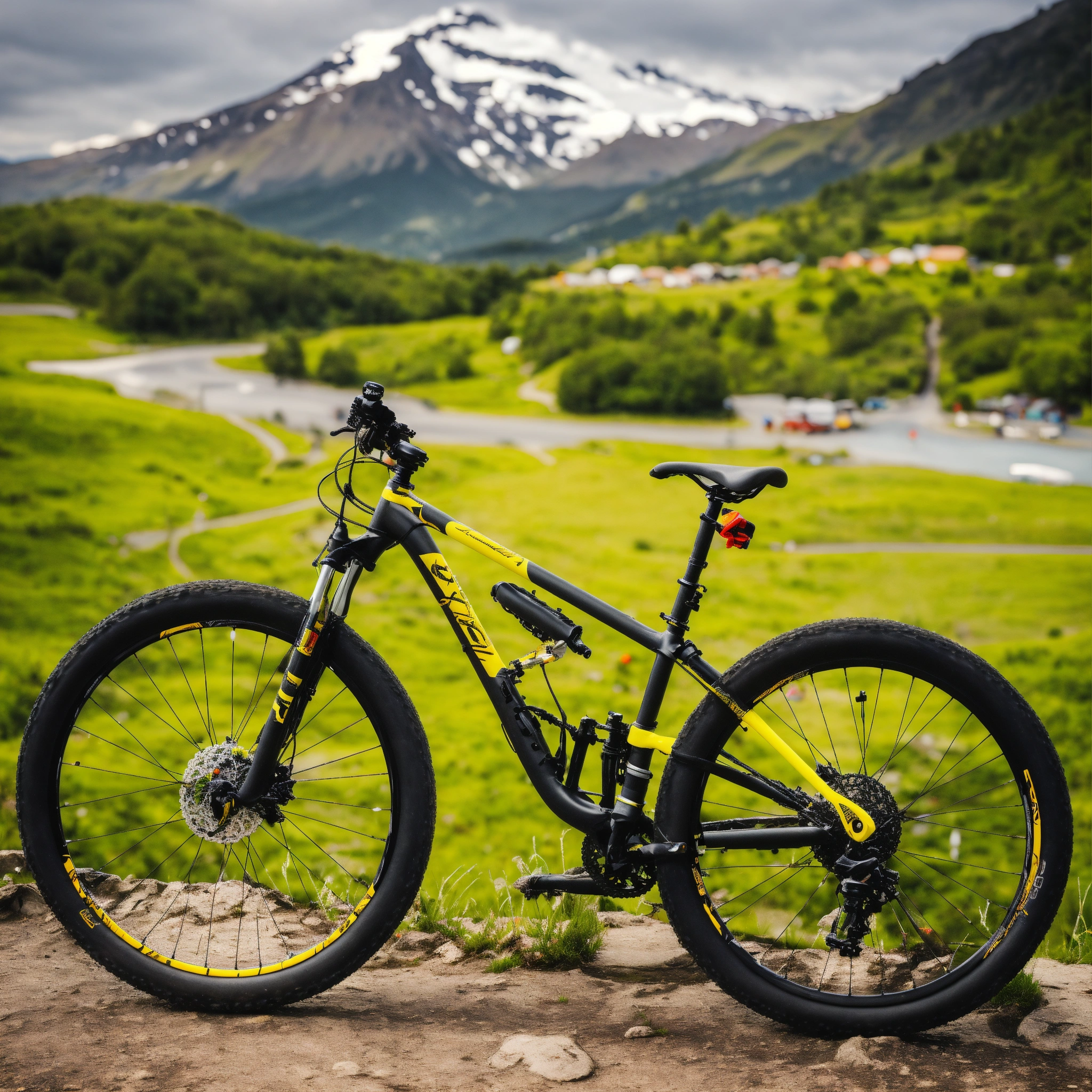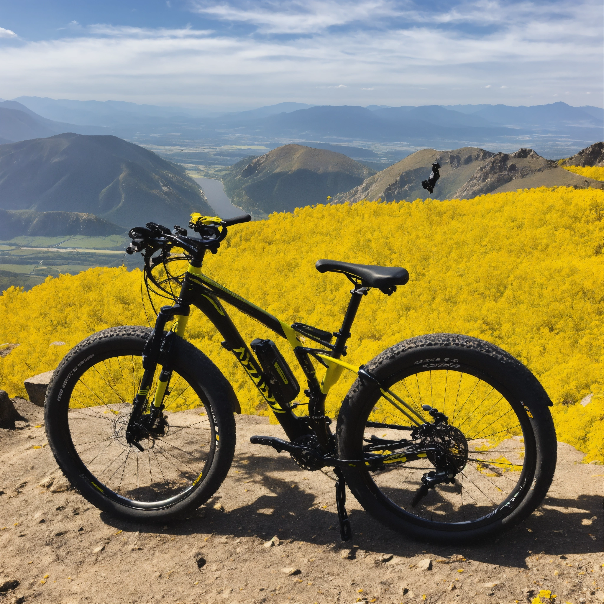 A photo of a bicycle, the bicycle is a black mountain bike with a yellow frame, the bicycle is parked in front of a mountain