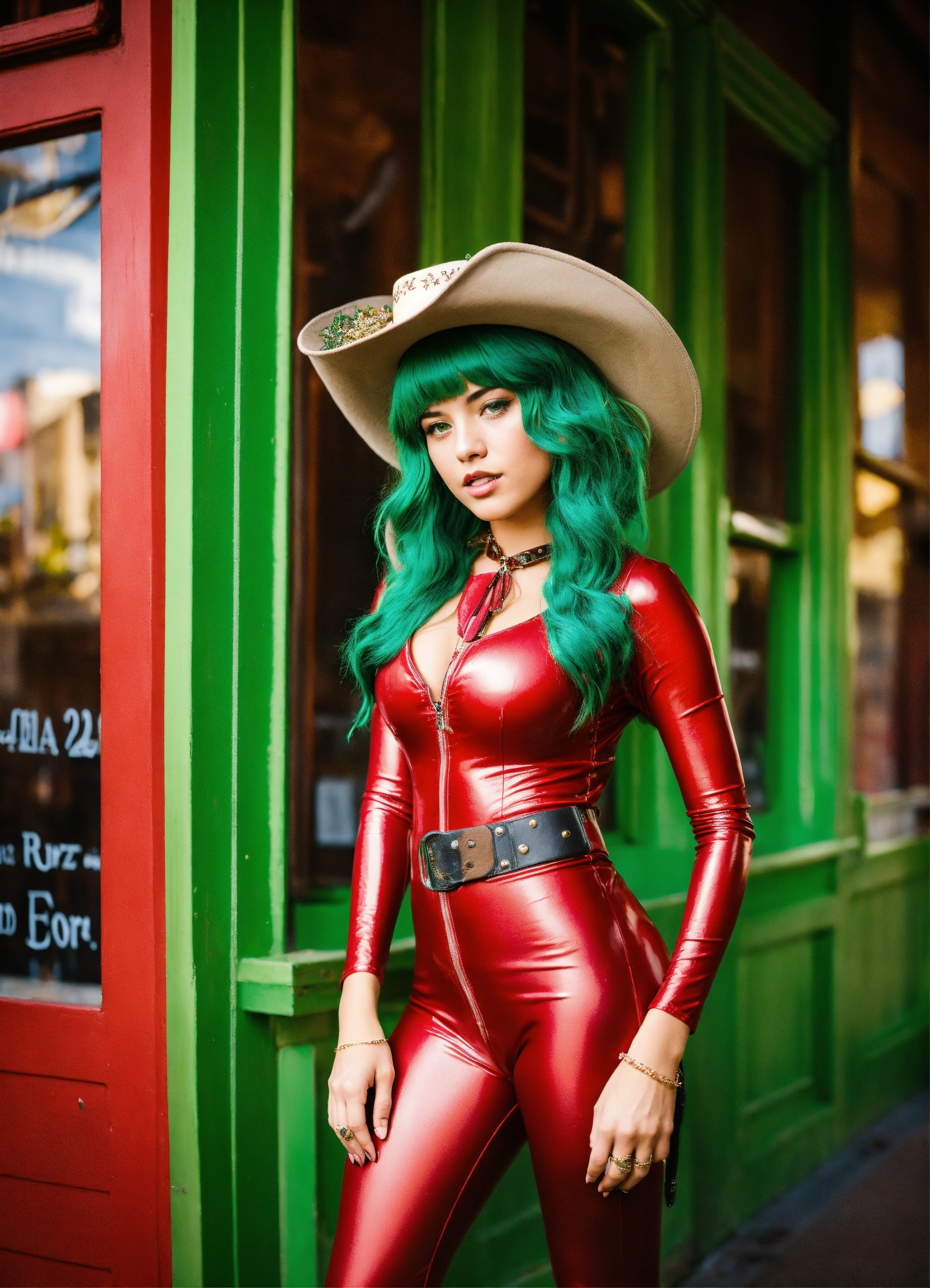 A real photo of a hot 21 year old girl with bright soft green hair, she is wearing very tight red catsuit and a cowboy-hat, she stands in an old western town