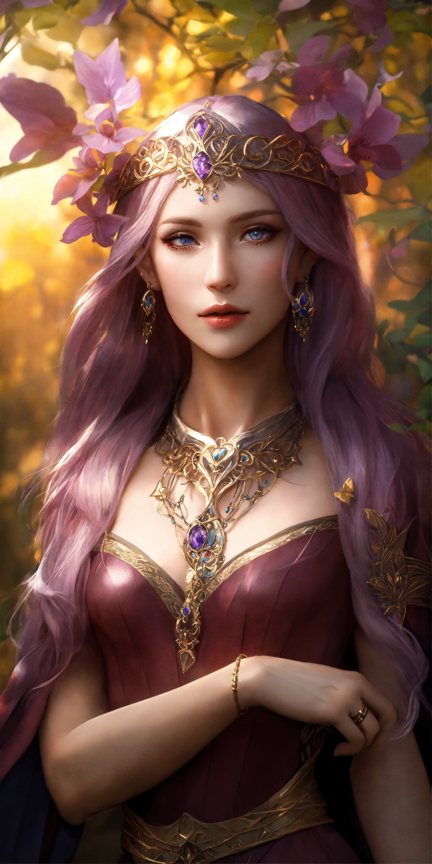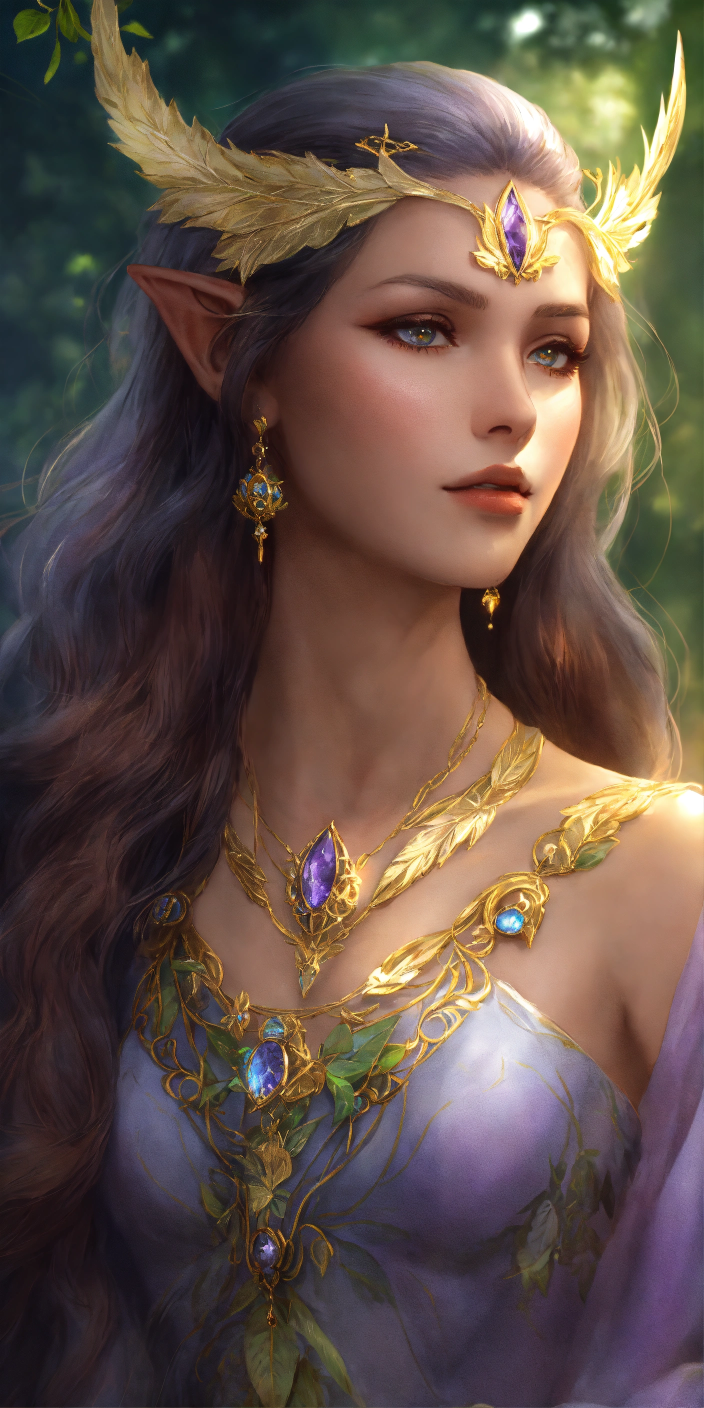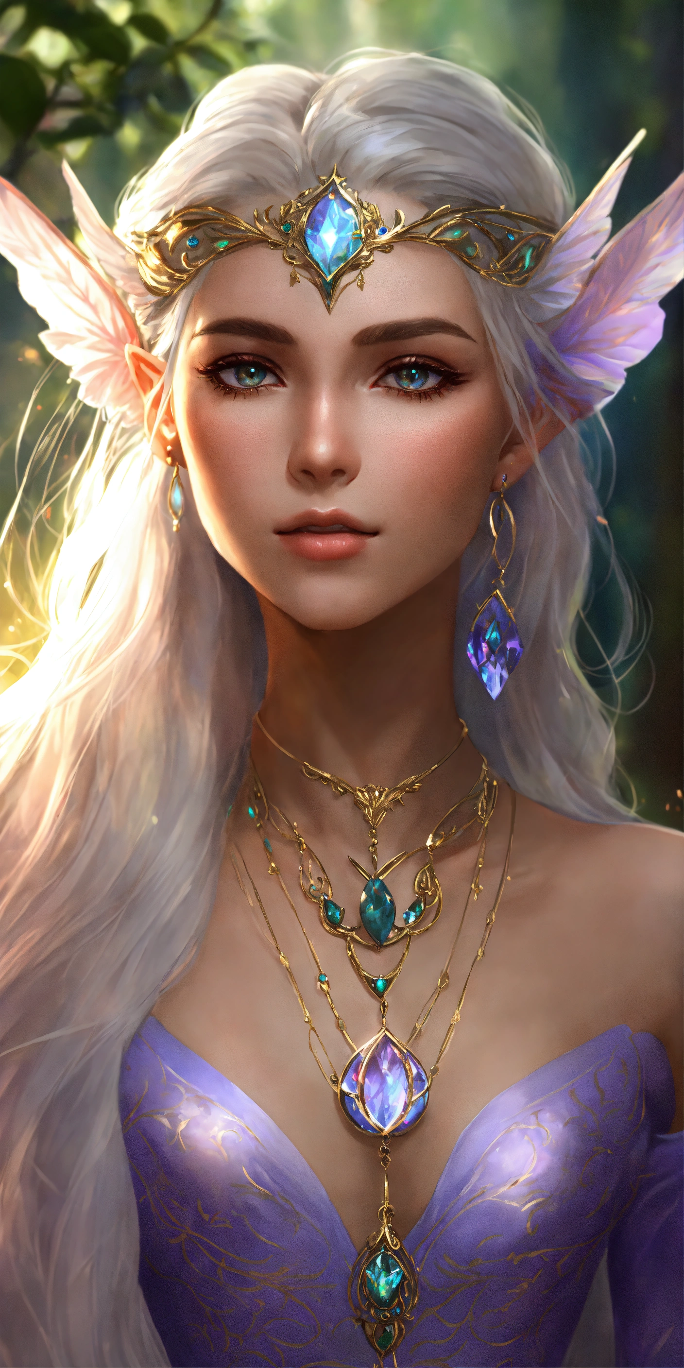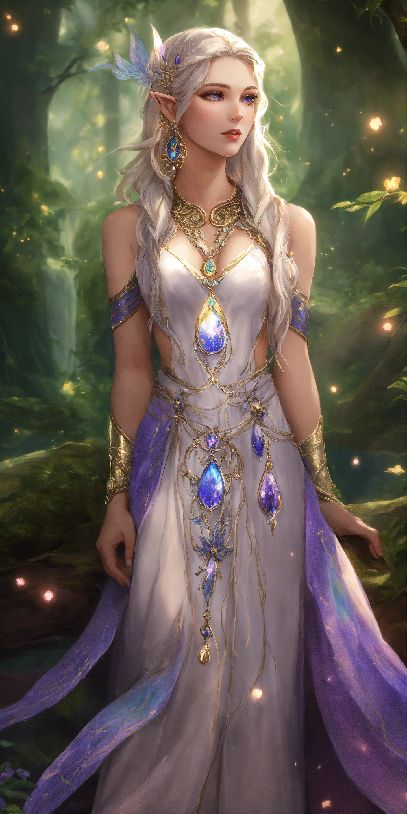Eladrin elf of the feywild, young adult, slender and lithe bodyframe, aura of wisdom and serenity, pointed ears tapering elegantly to delicate tips, pale white complexion reminiscent of moonlight. her face is heart-shaped, with high cheekbones, a sculpted jawline, and a pert nose. her eyes are captivating, with violet irises speckled with golden flecks, resembling the starlit skies of the feywild, waist-length shimmering hair pearlescent silver at the tips, mirroring changing seasons of the feywild. enchanted jewelry and accessories grace her features. rings made from enchanted leaves encircle her fingers, and a necklace with a pendant carved from a feywild gemstone hangs around her neck. these accessories shimmer with an inner light, demonstrating her connection with the feywild's mystical energies, 8k, realistic, full body