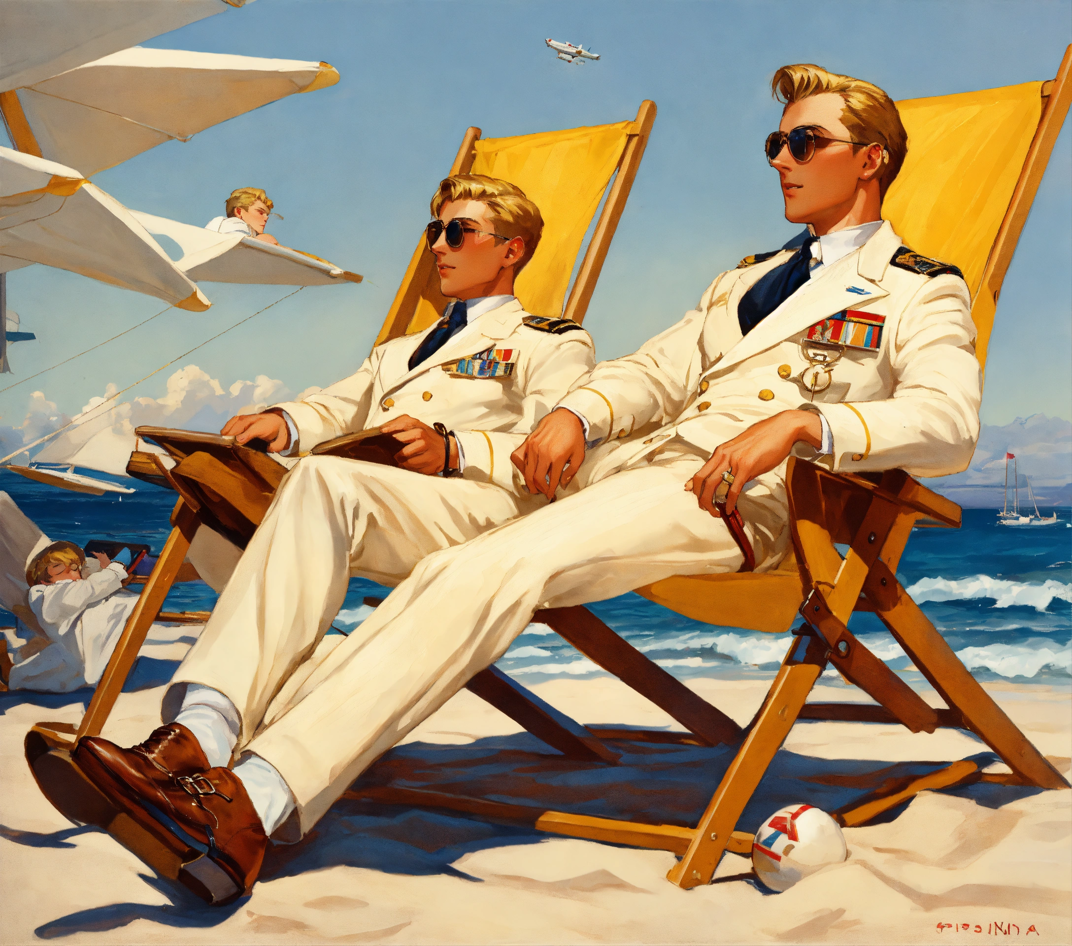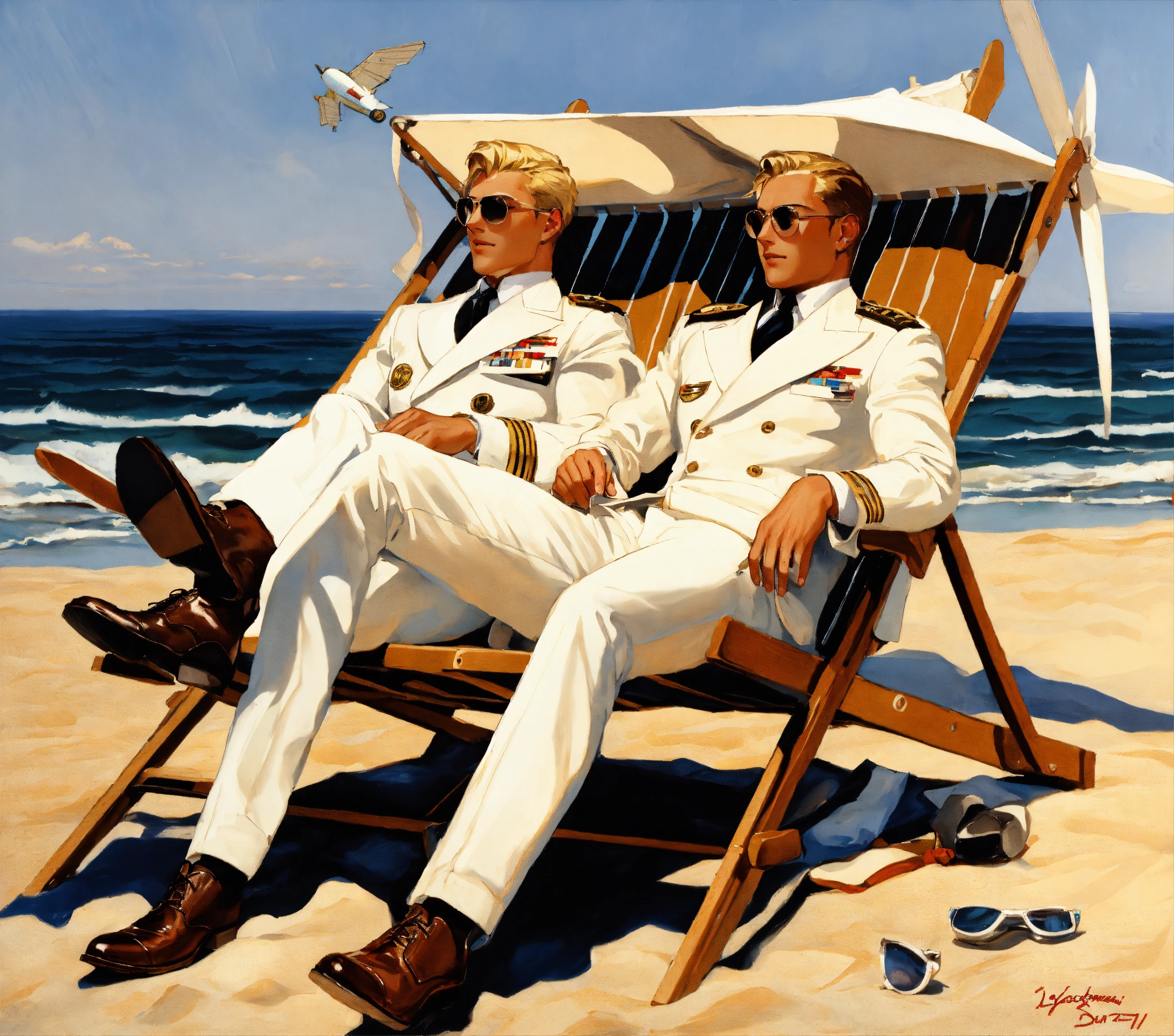 Two blonde male pilots in white suit, brown buckled shoes, lying on a deckchair on the beach, leyendecker style