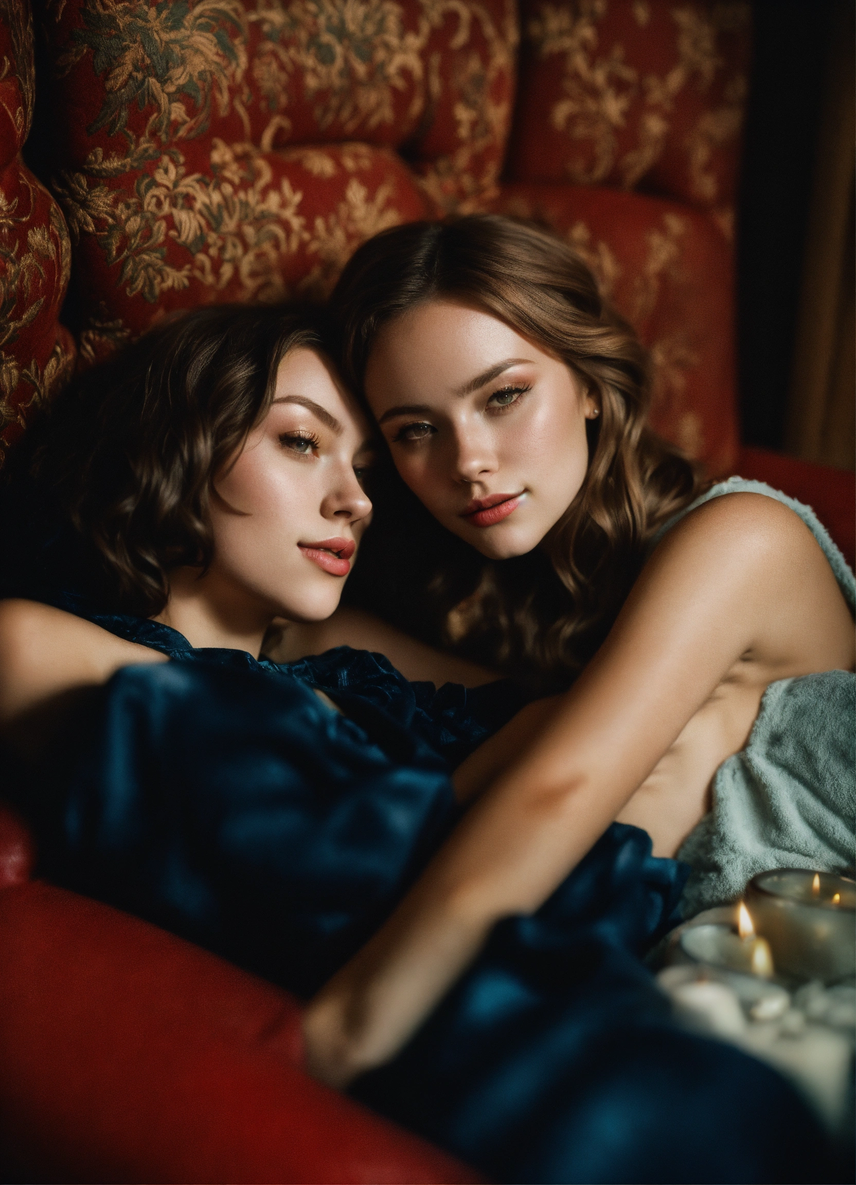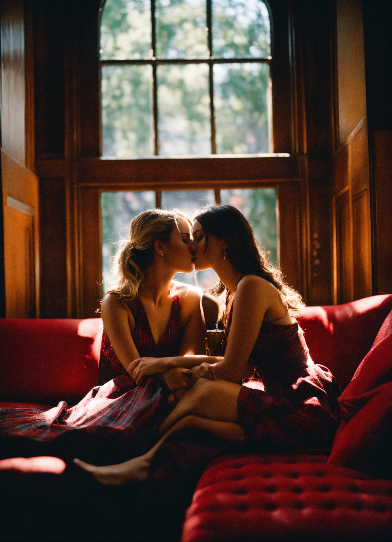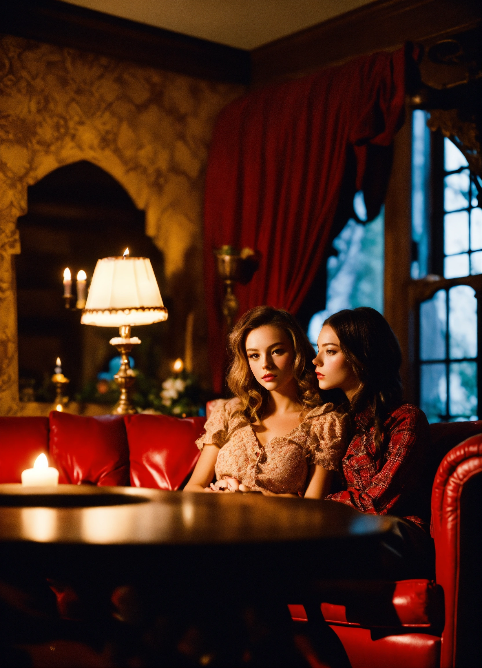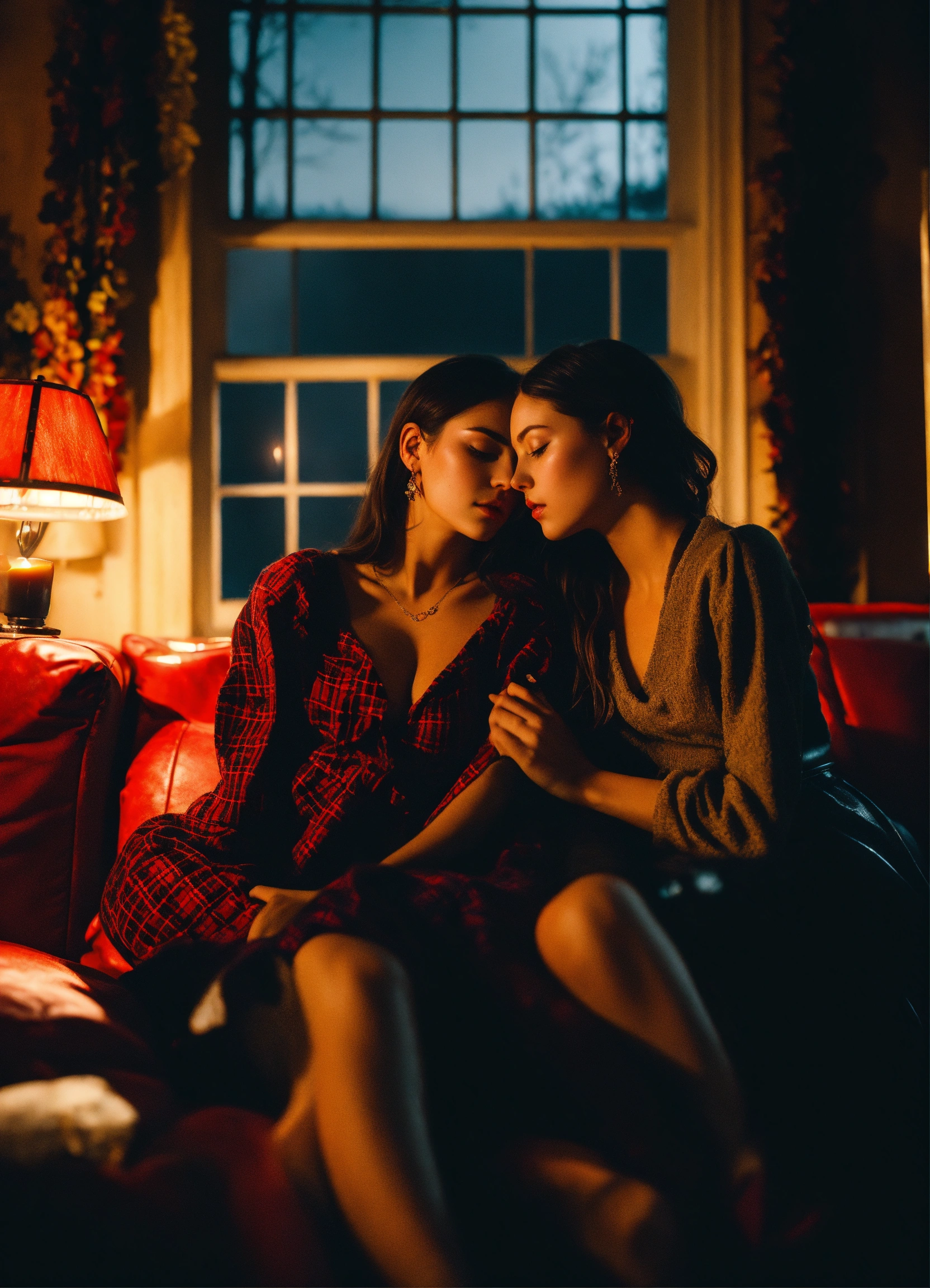 2women kodachrome two female models 1st-model=<blonde-amber(maika-monroe heard><wearing-makeup> + 2nd-model=<brunette-ksenia(effy-stonem)kahnovich><wearing-makeup> 65mm-film night portrait, laying, hugging, cozy, cuddling loving on couch, kissing, youthful looks, tartan miniskirts, december aesthetic, nighttime, candlelight subjects at distance, 19th century interior, arched windows, hanging red velvet, hardwood floors, candle on coffee table, gothic wallpaper walls, candle sconces, two youthful models on large wooden red leather lounge couch, high-depth cinematic symmetry central point of composition subsurface scattering kodak portra high quality raw exquisite textures highly detailed photograph harsh lighting sharp focus high resolution 8k uhd dslr film grain fujifilm xt3