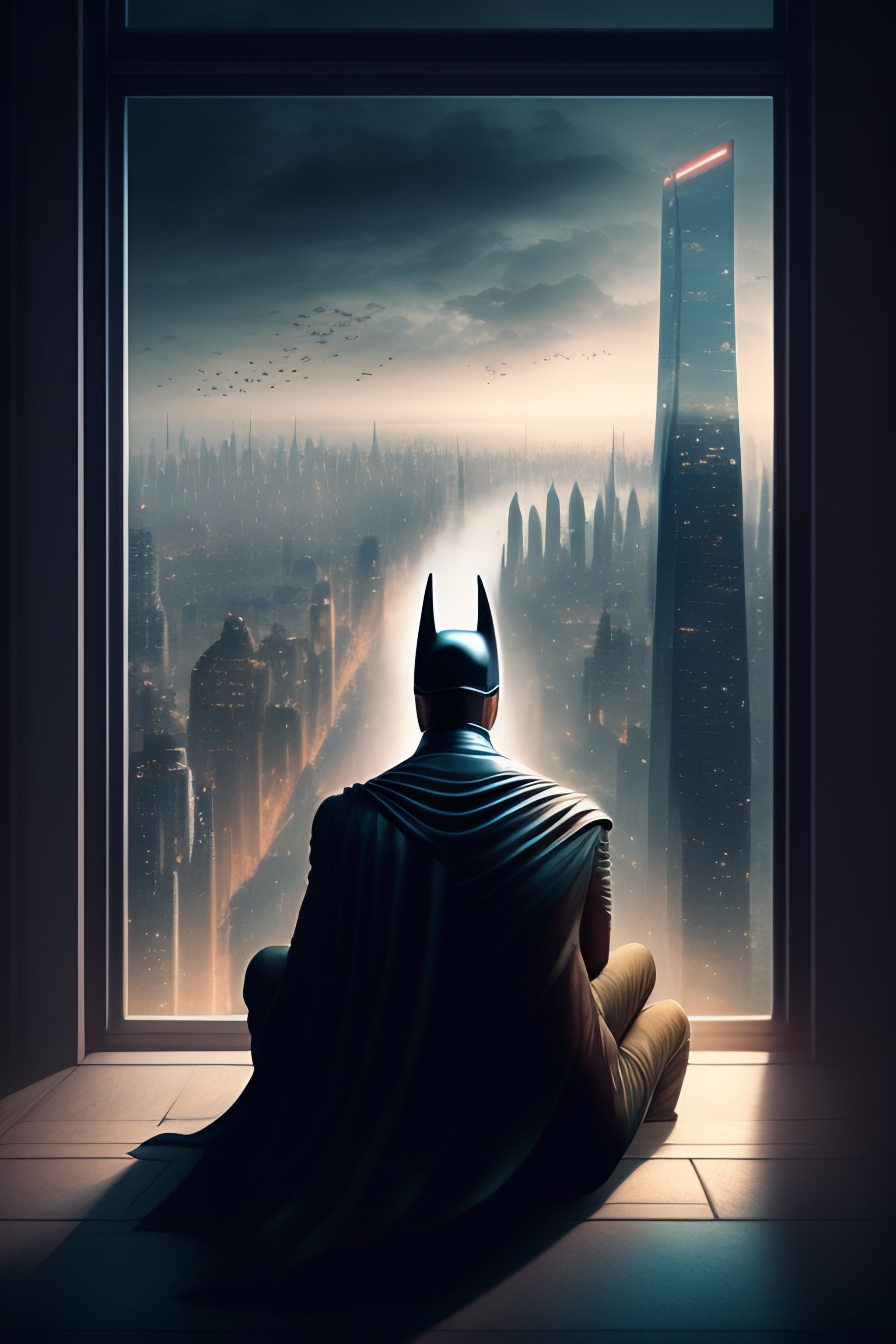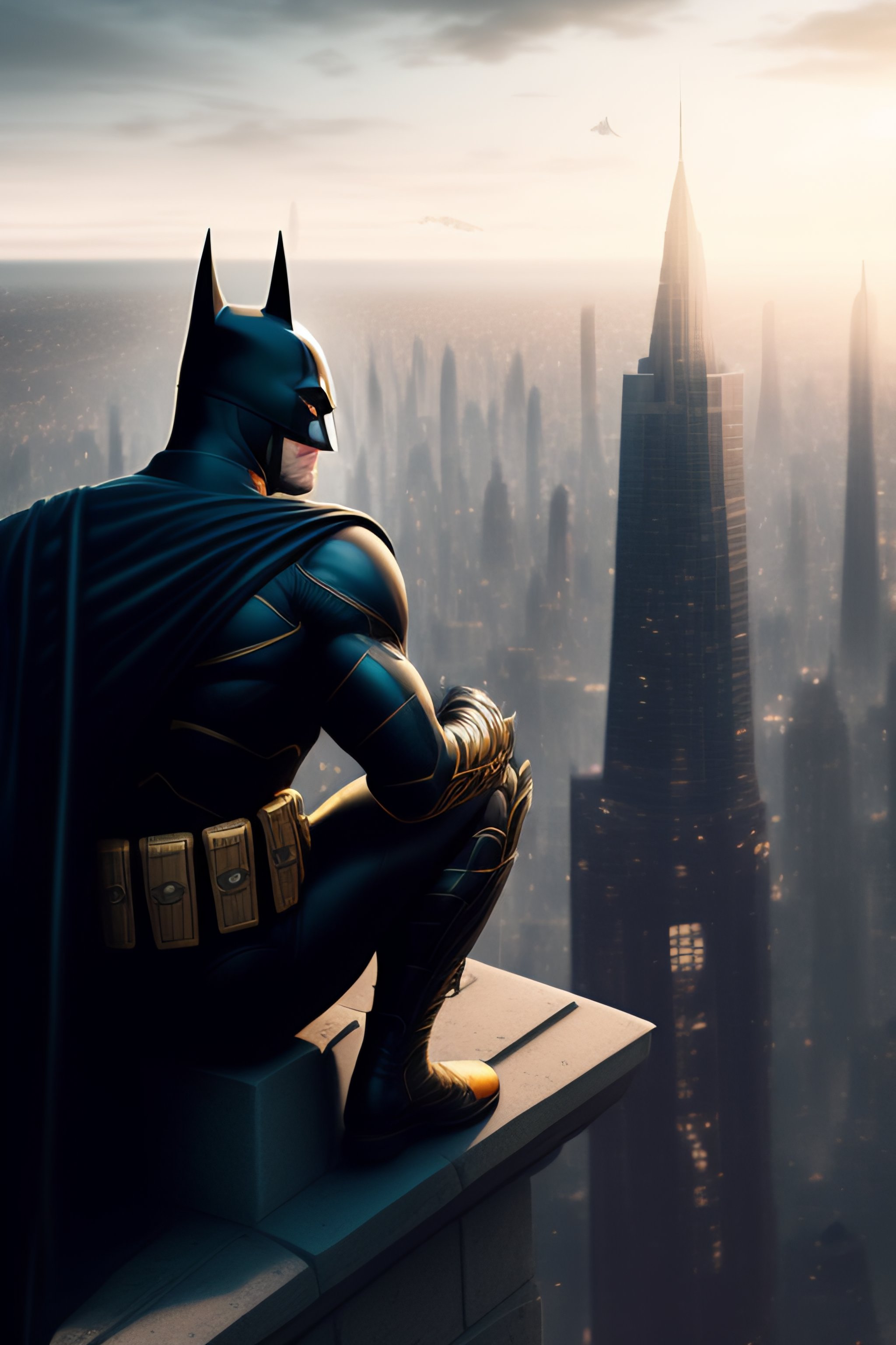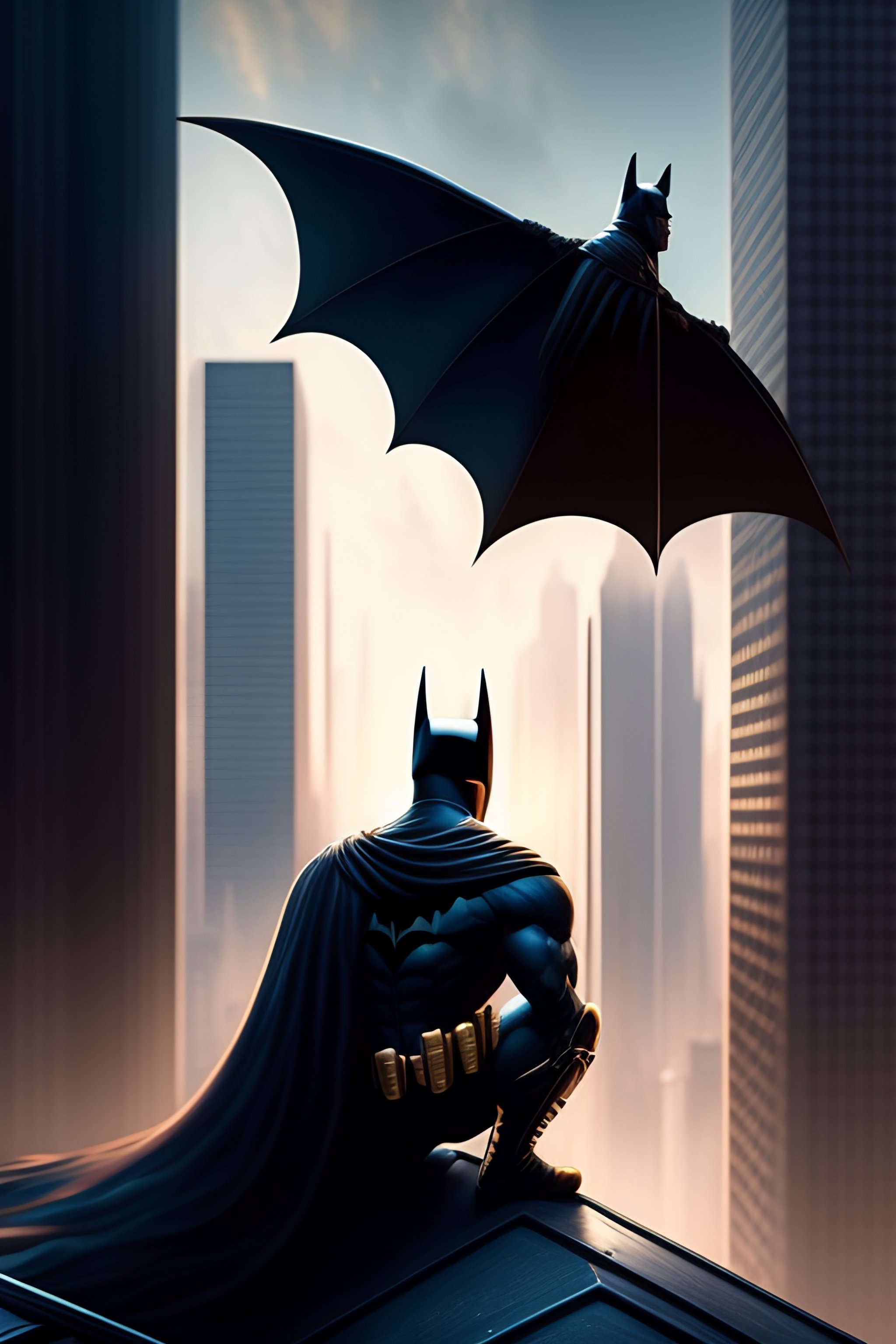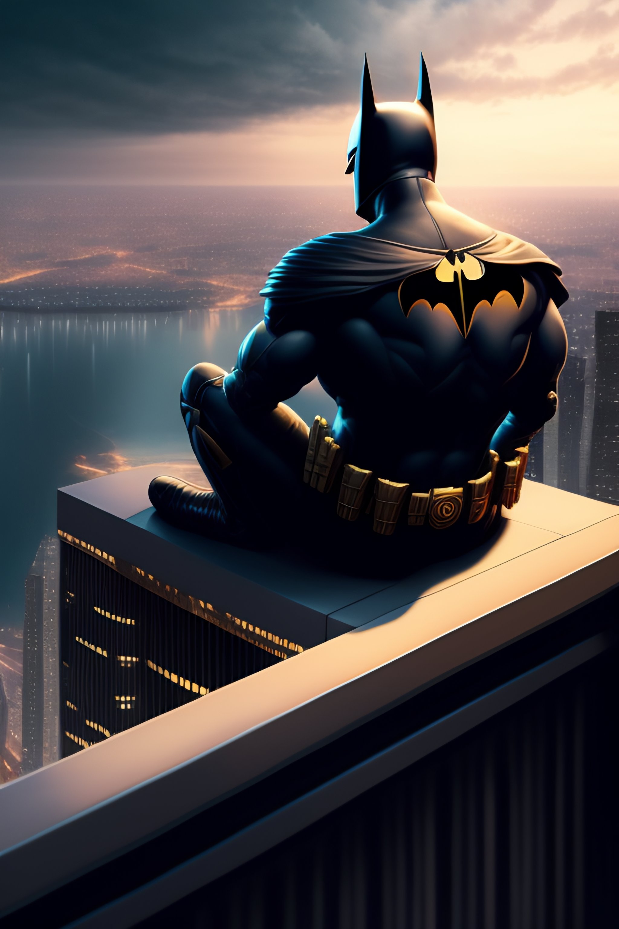 Batman sitting on a roof looking down at a city below