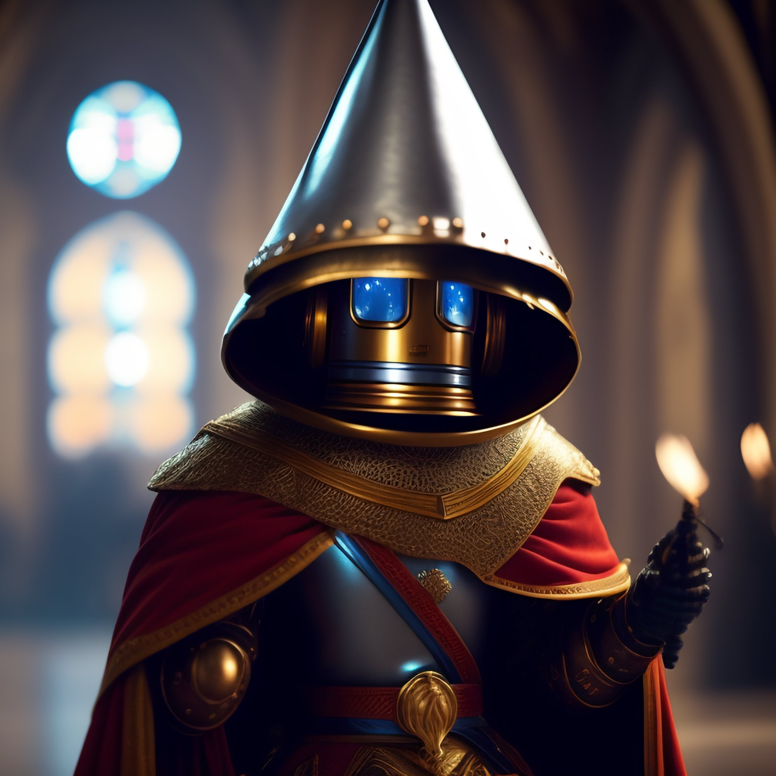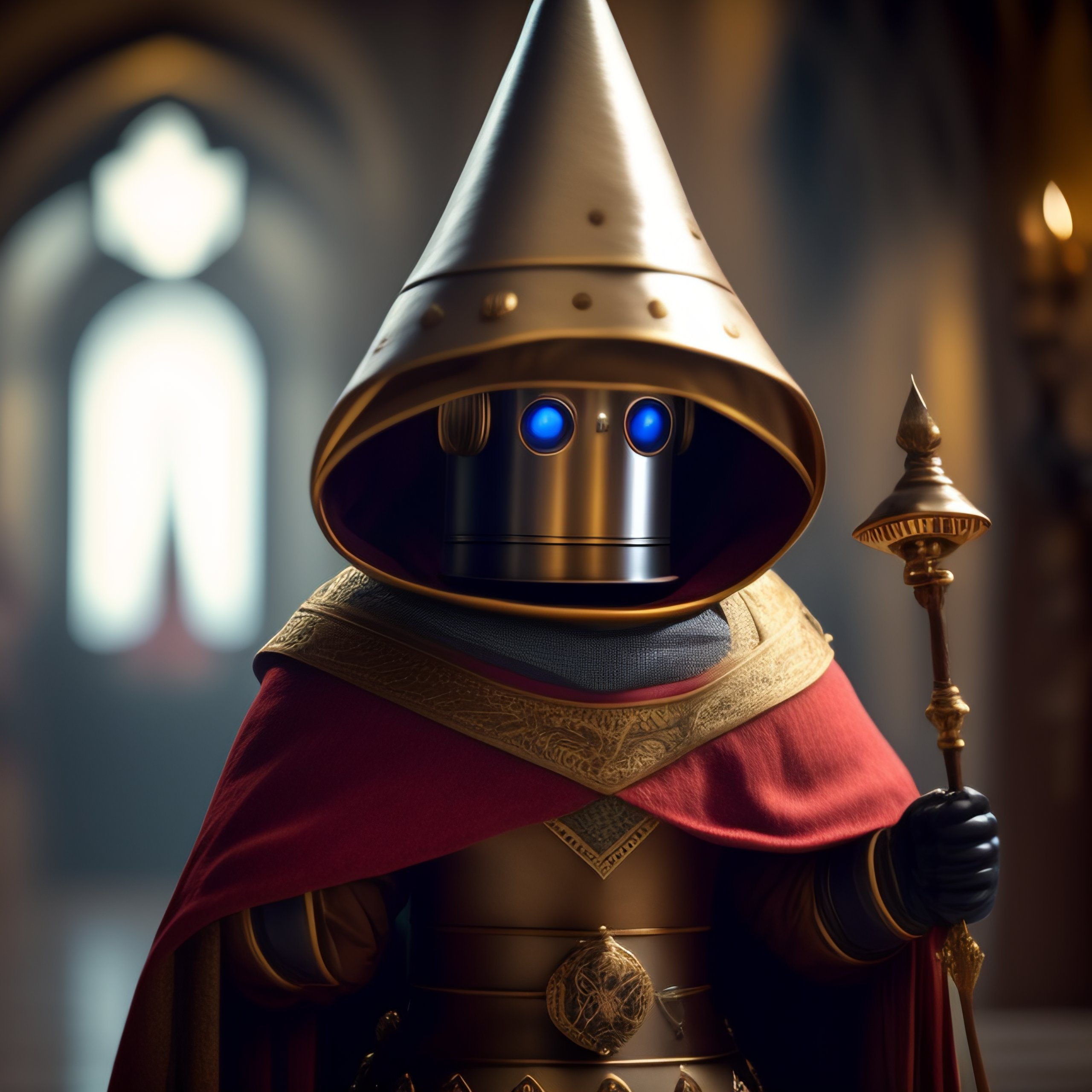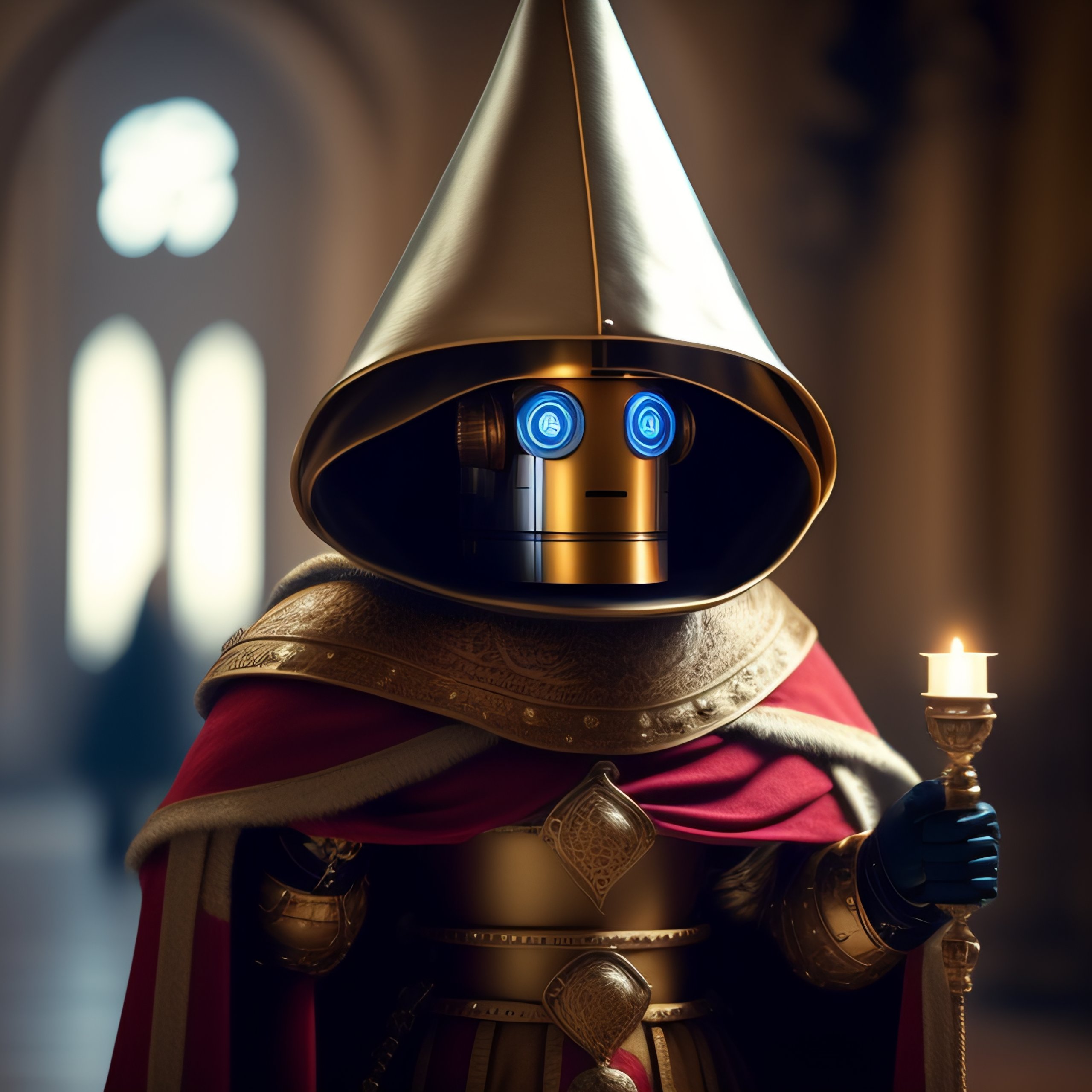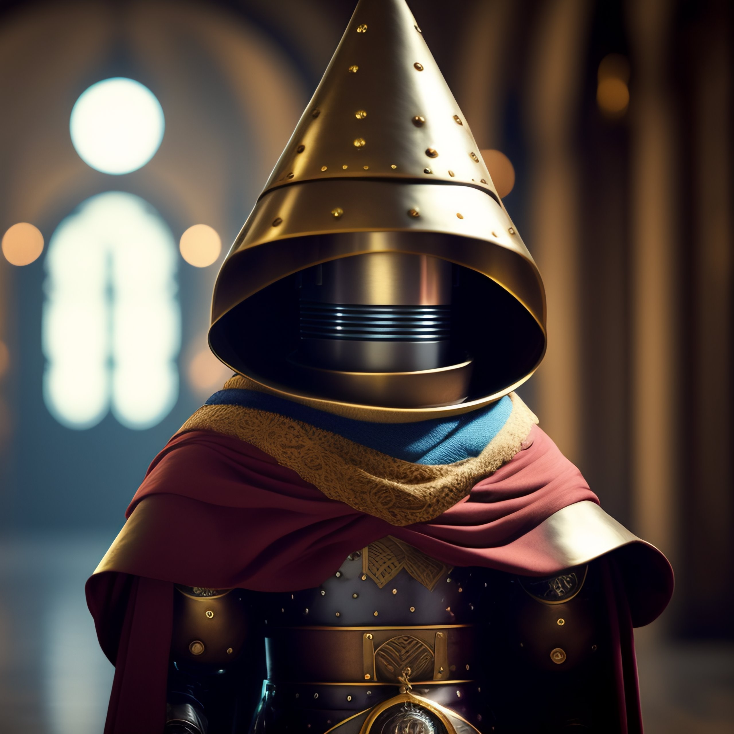 A robot puppet dressed like a medieval wizard using a misterious hood