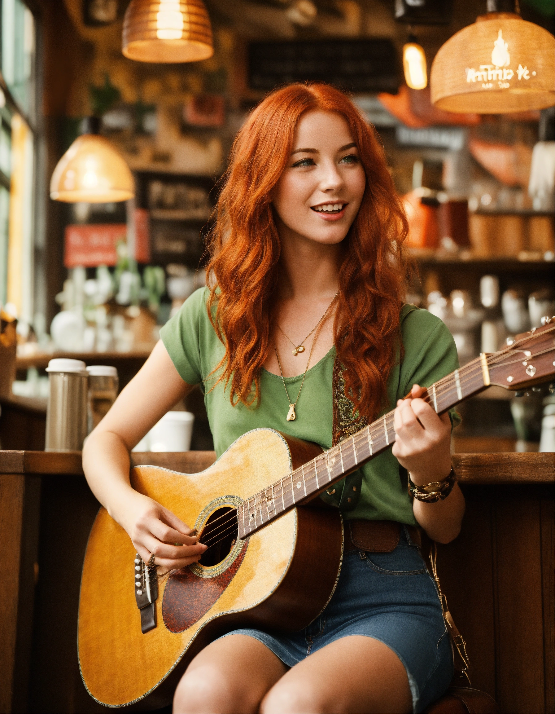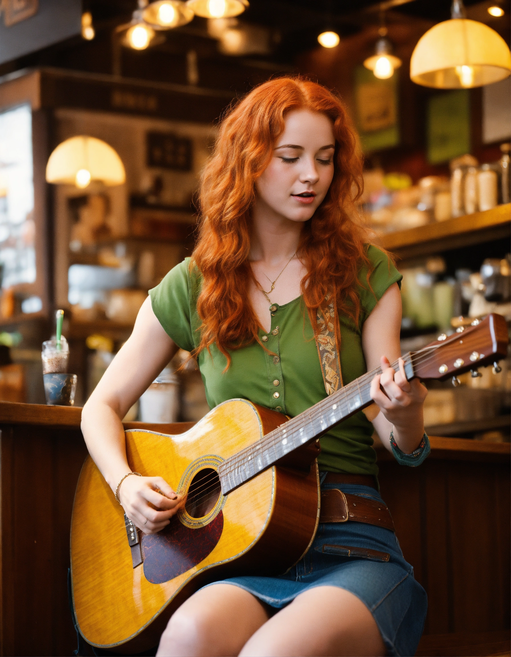 Ultra realistic full body photo of redhead female with green eyes and a roman nose playing a martin d-28 guitar and singing in a café, wearing a green tank top, a denim skirt and brown cowboy boots, with cool usual elements of folk cafés in 1970.