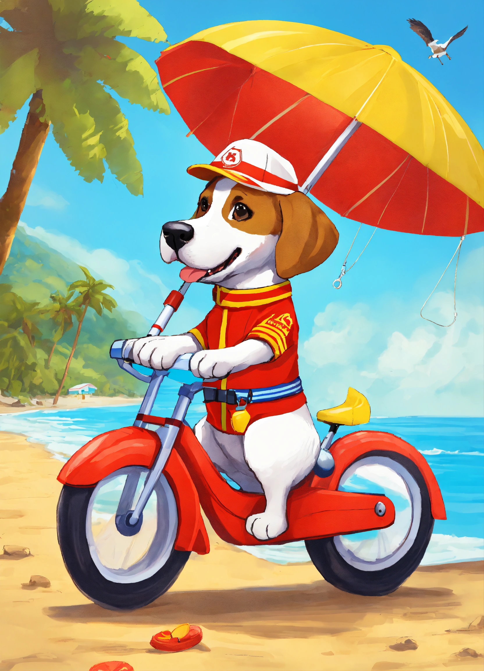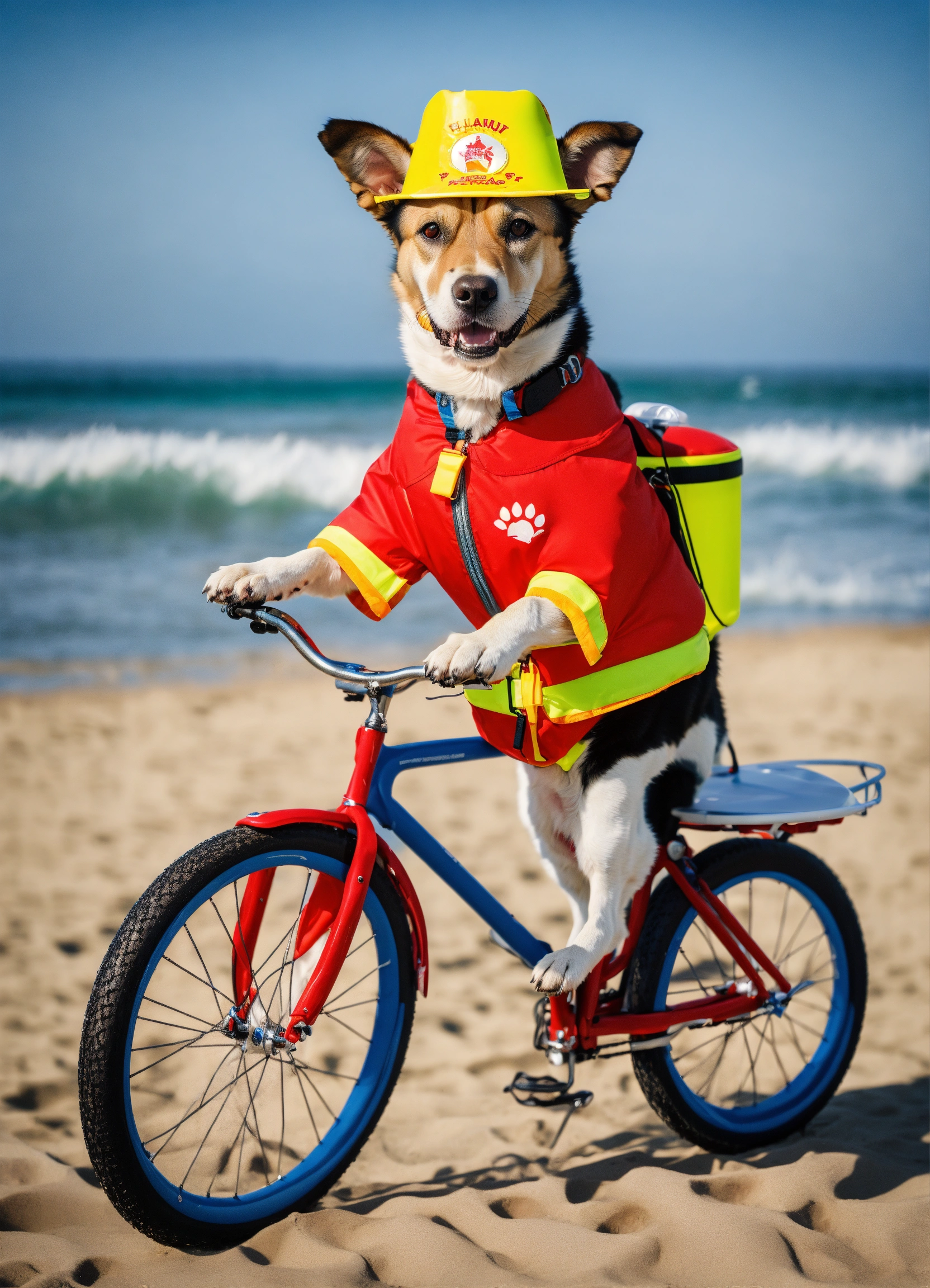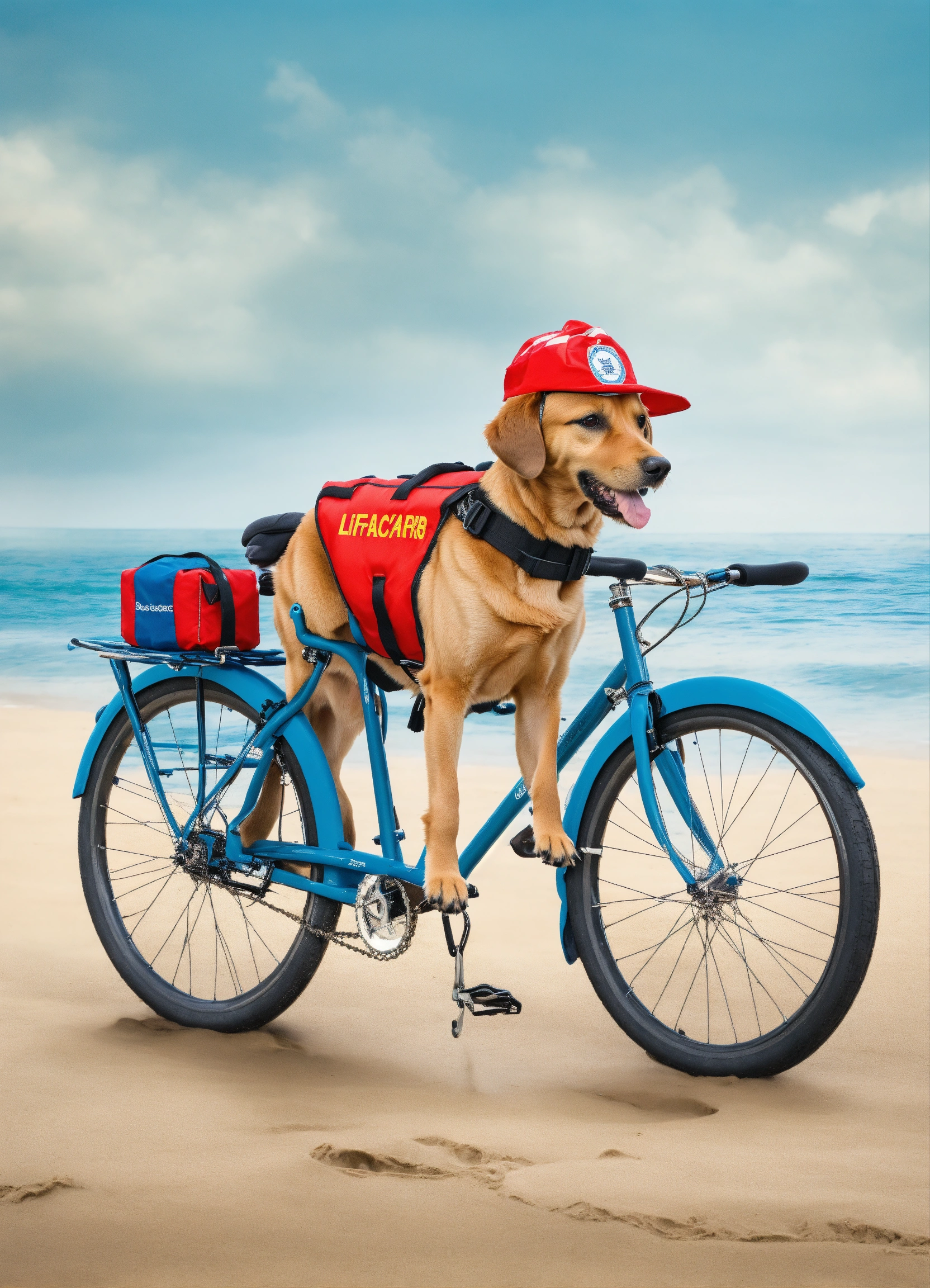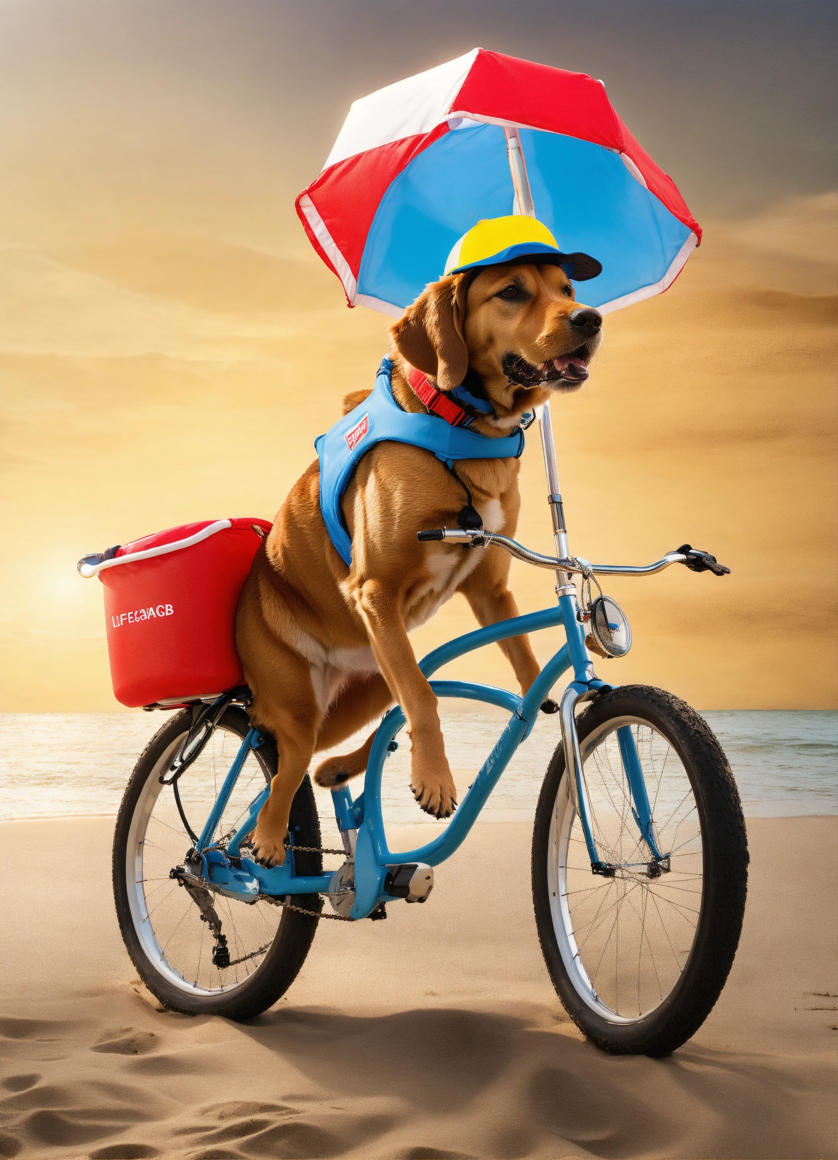 Design a picture of a dog working as a beach lifeguard on a bike, the dog is wearing a lifeguard uniform with a floatation device around its waist and a lifeguard hat