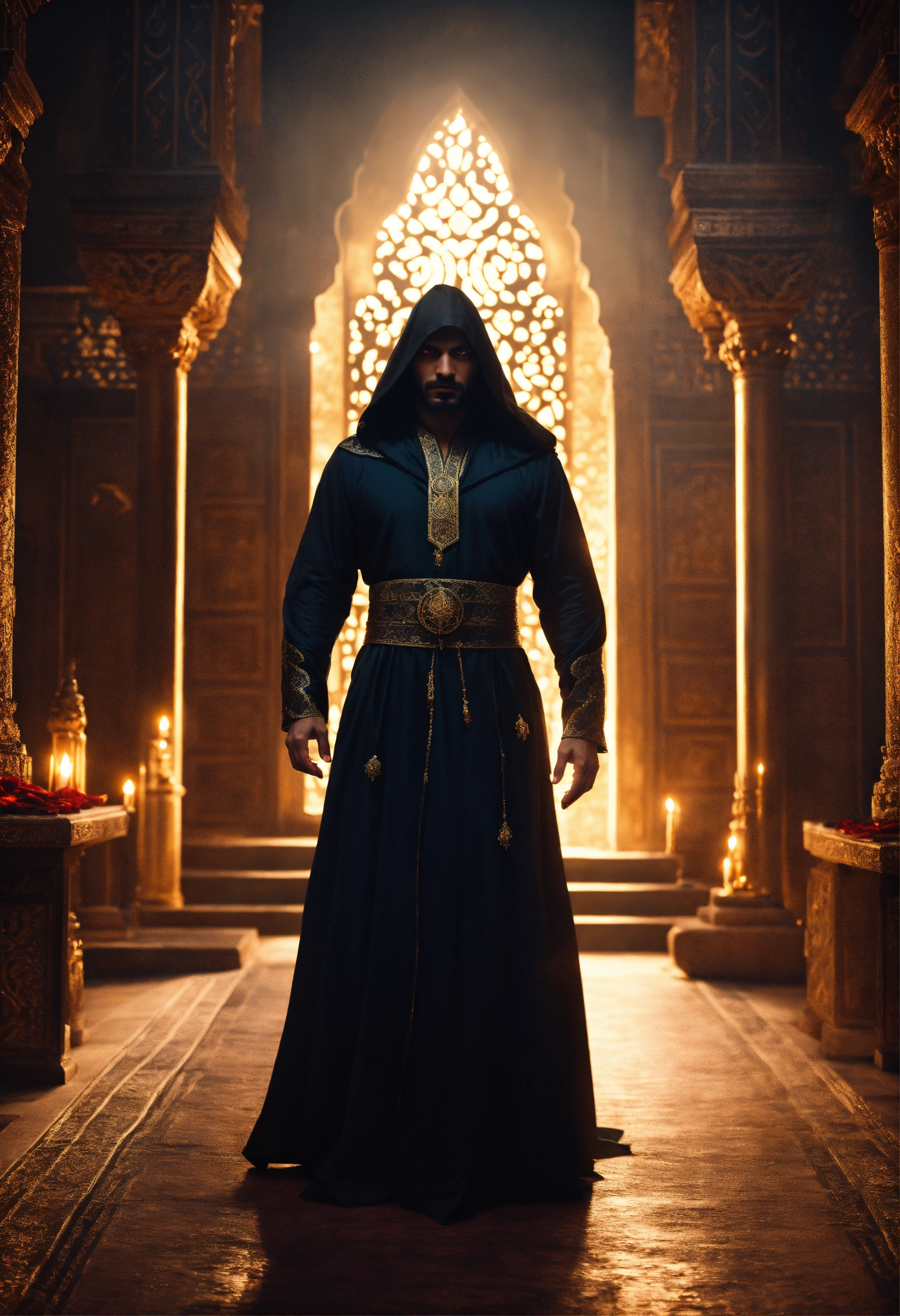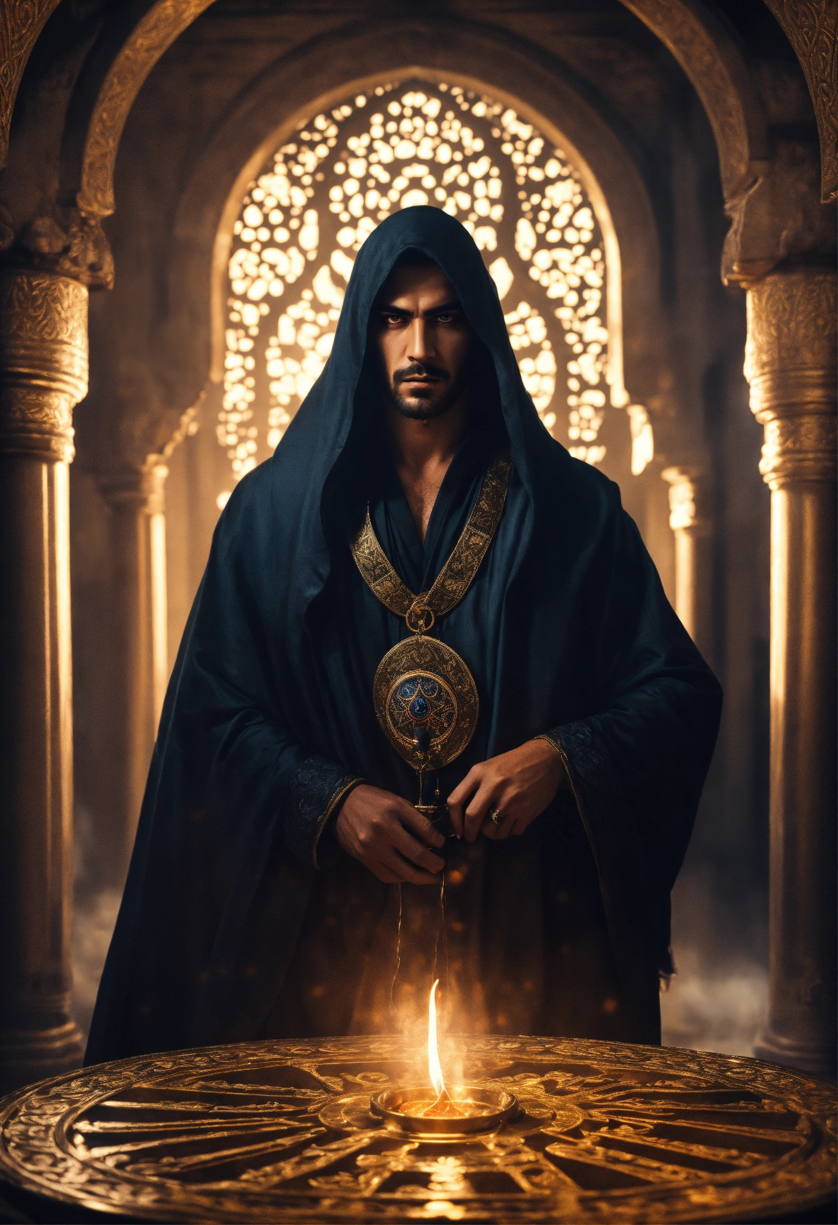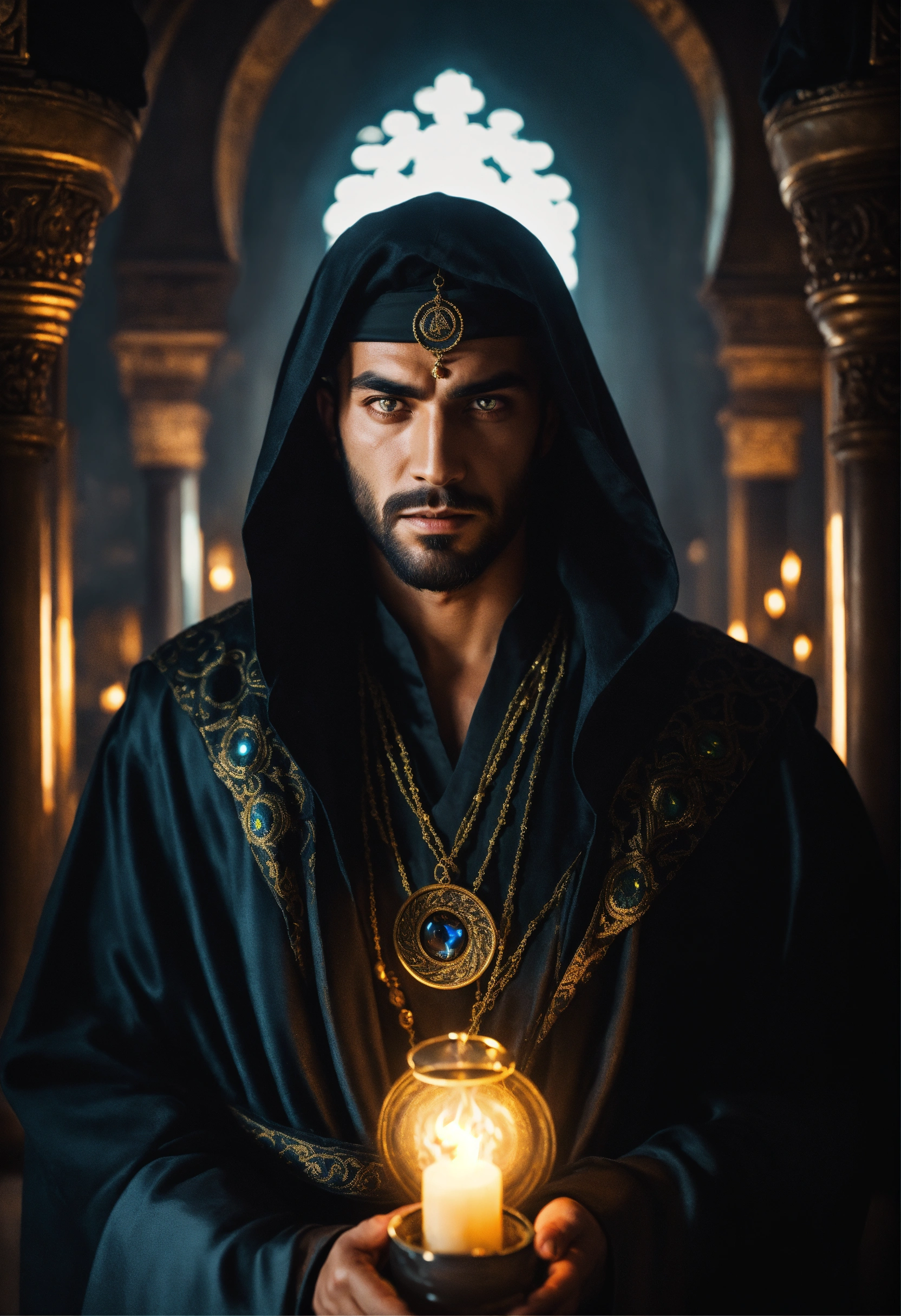 Dark, mysterious and dramatic fantasy headshot of a handsome arabic evil sorcerer with glowing hypnotic eyes in sorcerous robes in a temple of evil, gazing intensely.
