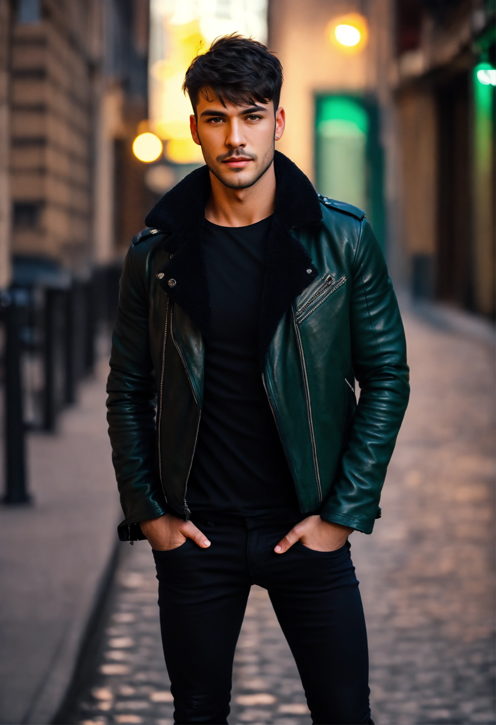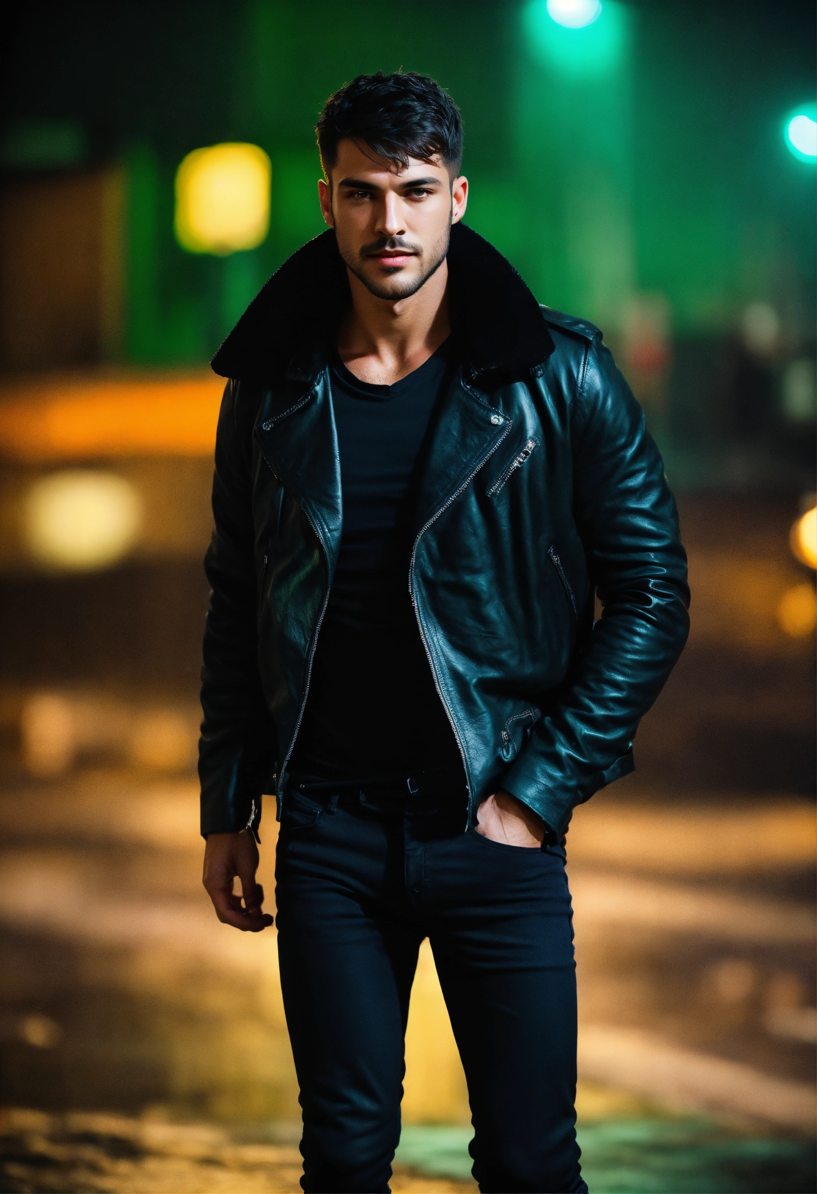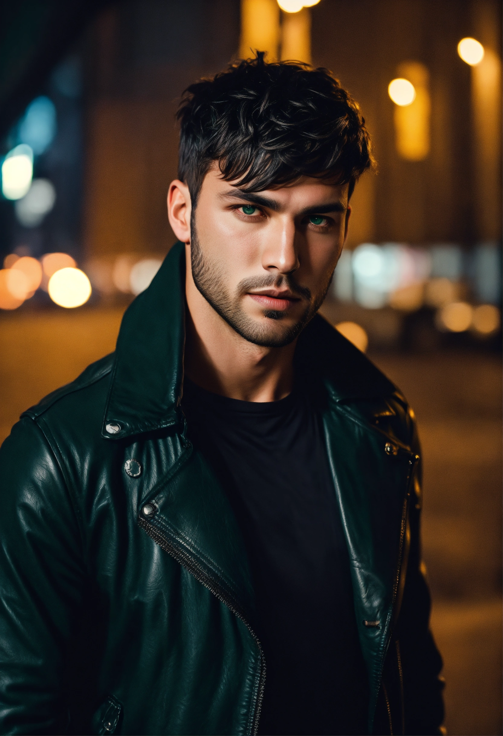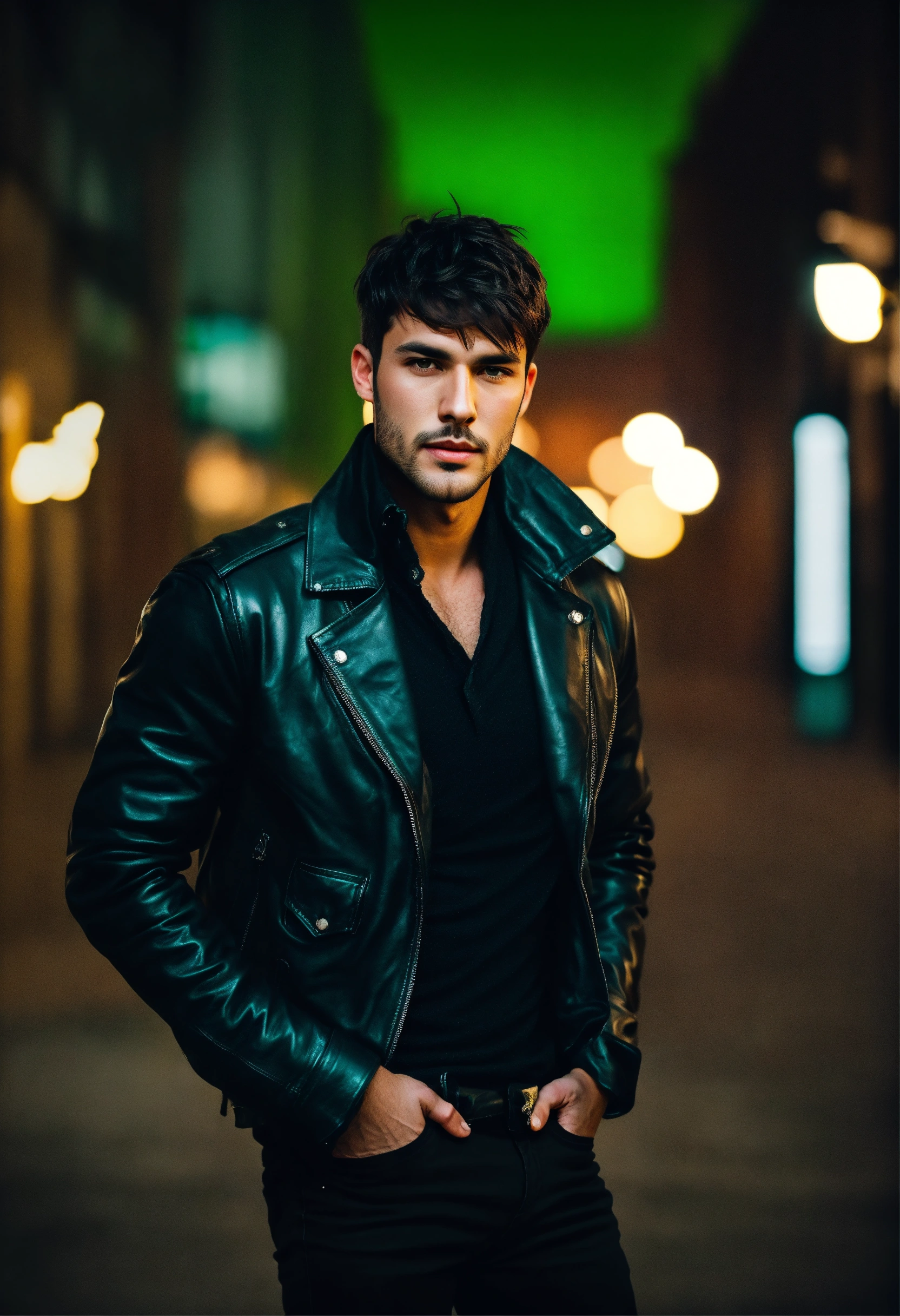 Handsome hot man with dark short hair with bangs falling on his forehead with green eyes with neat stubble in a black leather jacket black shirt and black jeans at night in the winter street