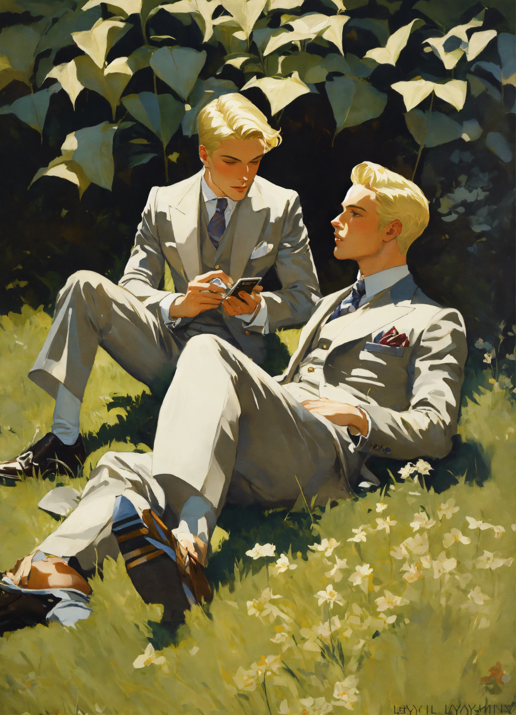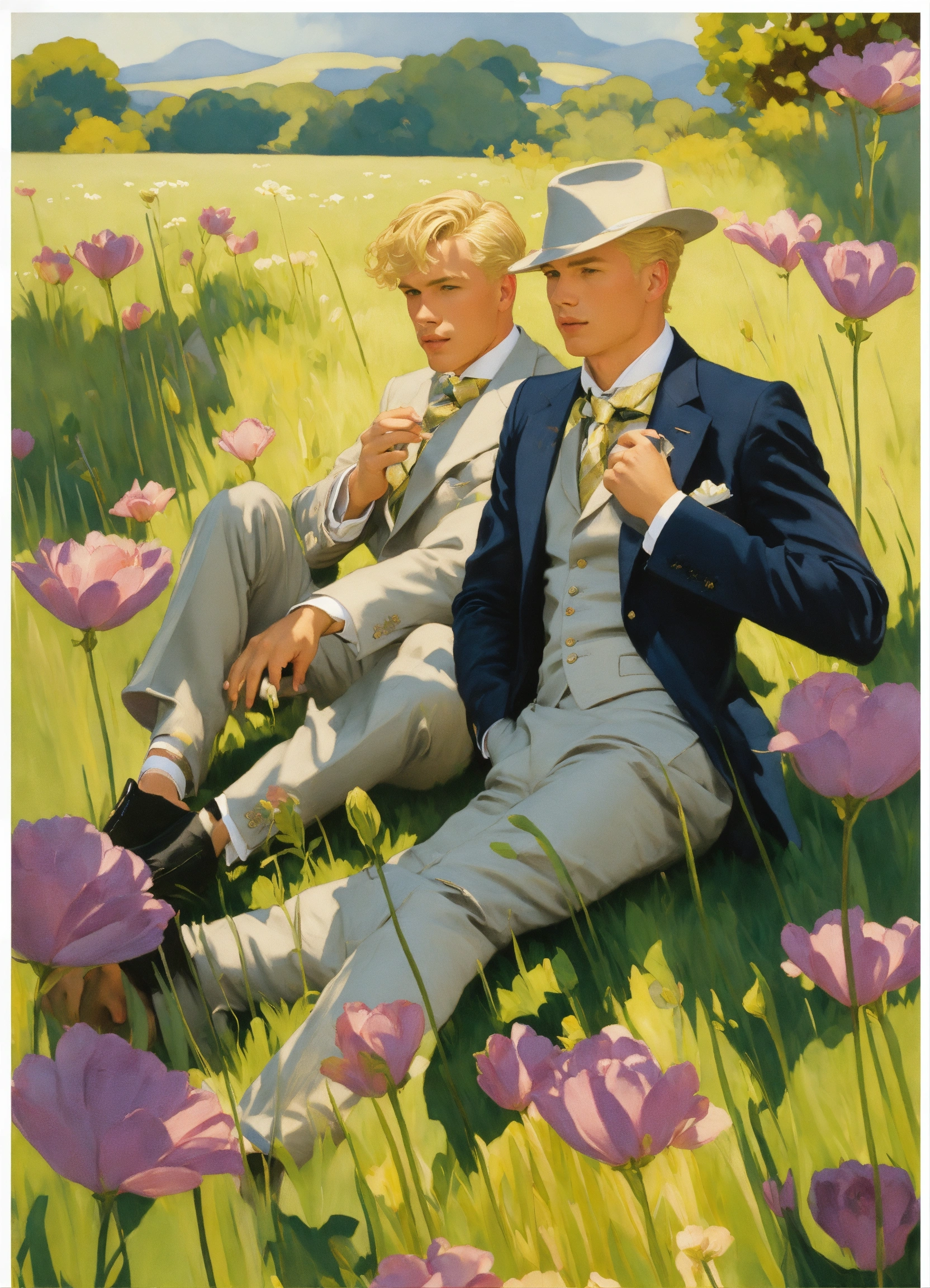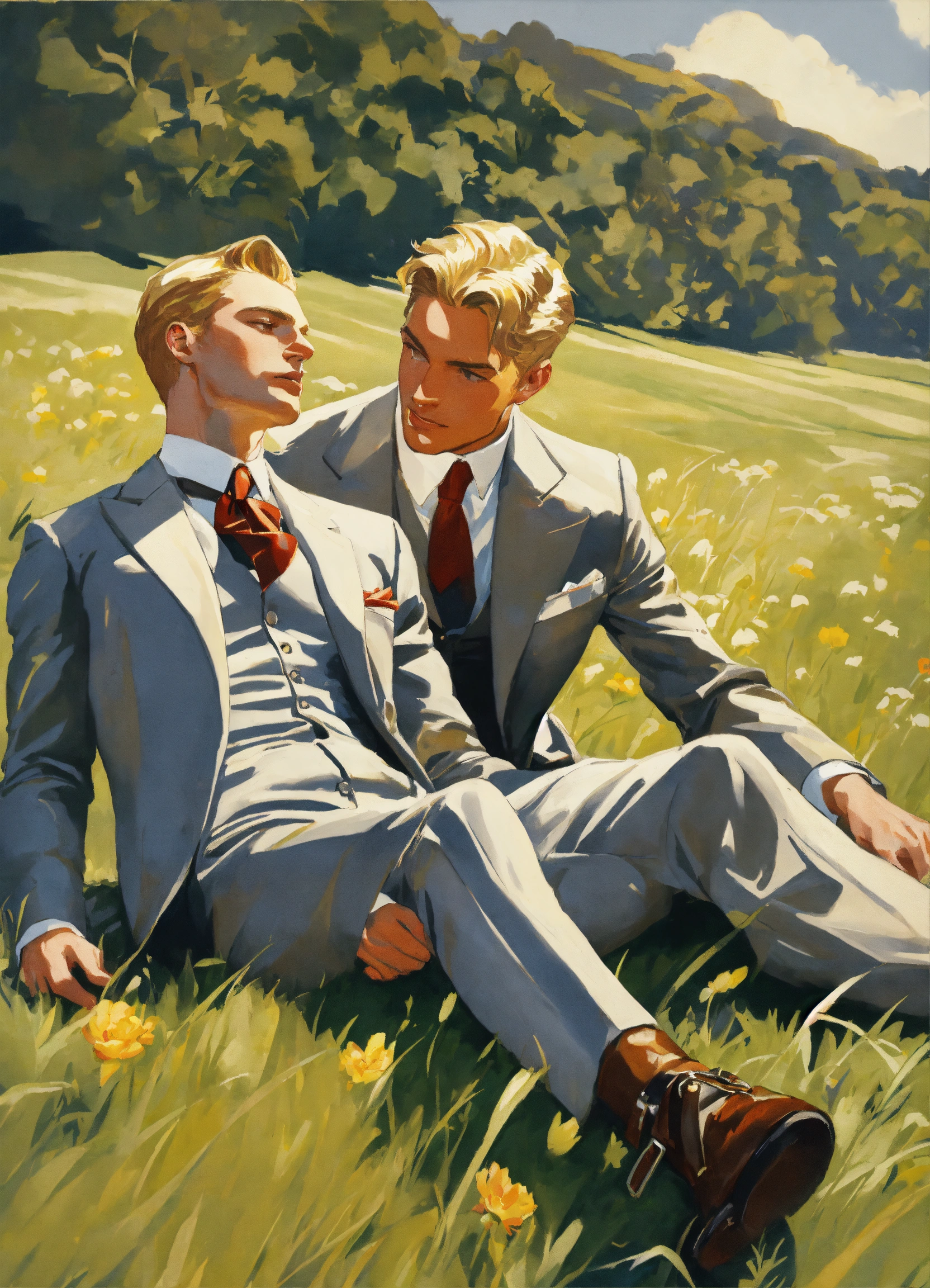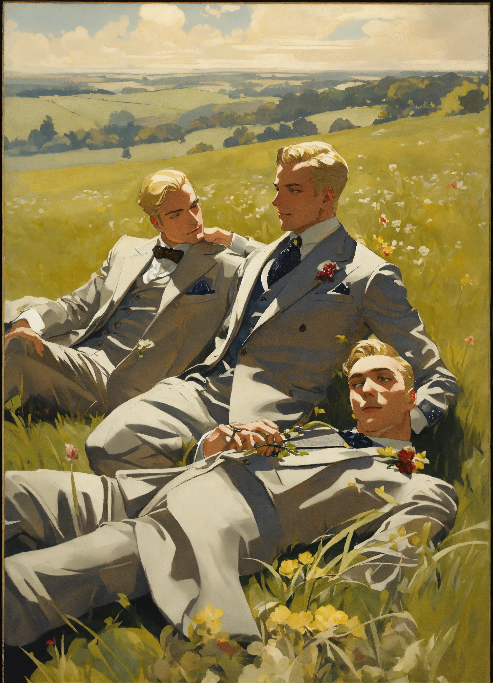 Two blonde gentlemen in grey suit lying on the grass in a meadow