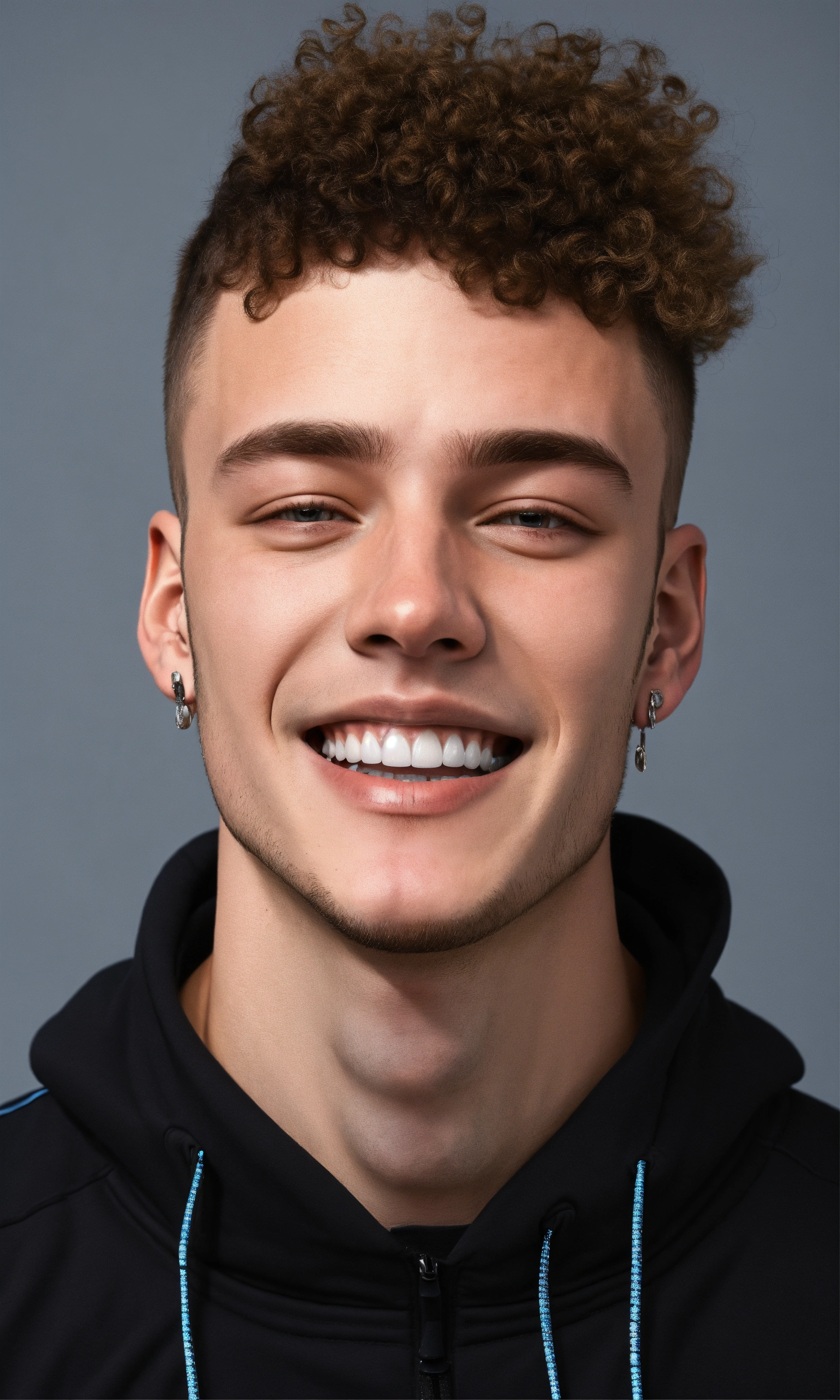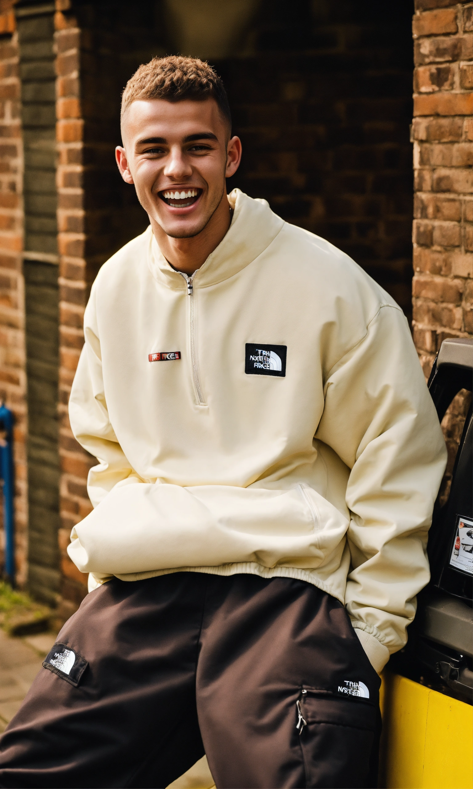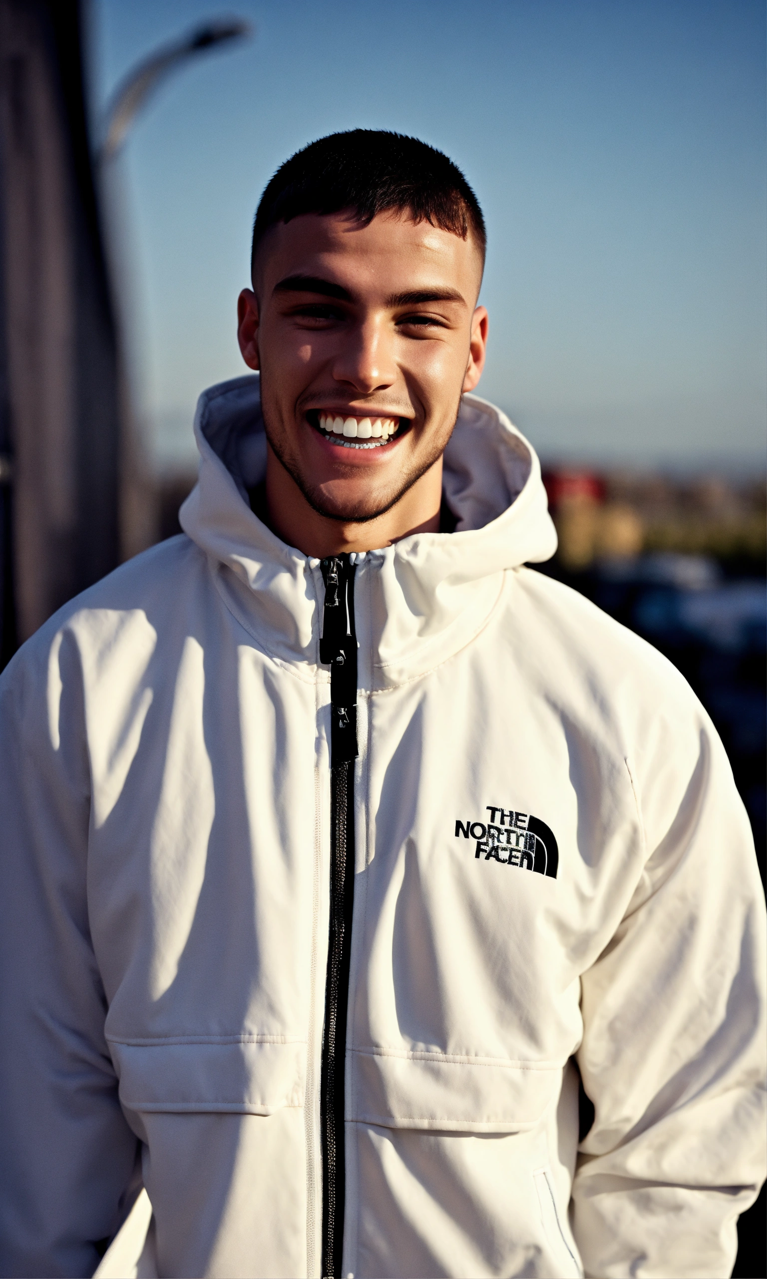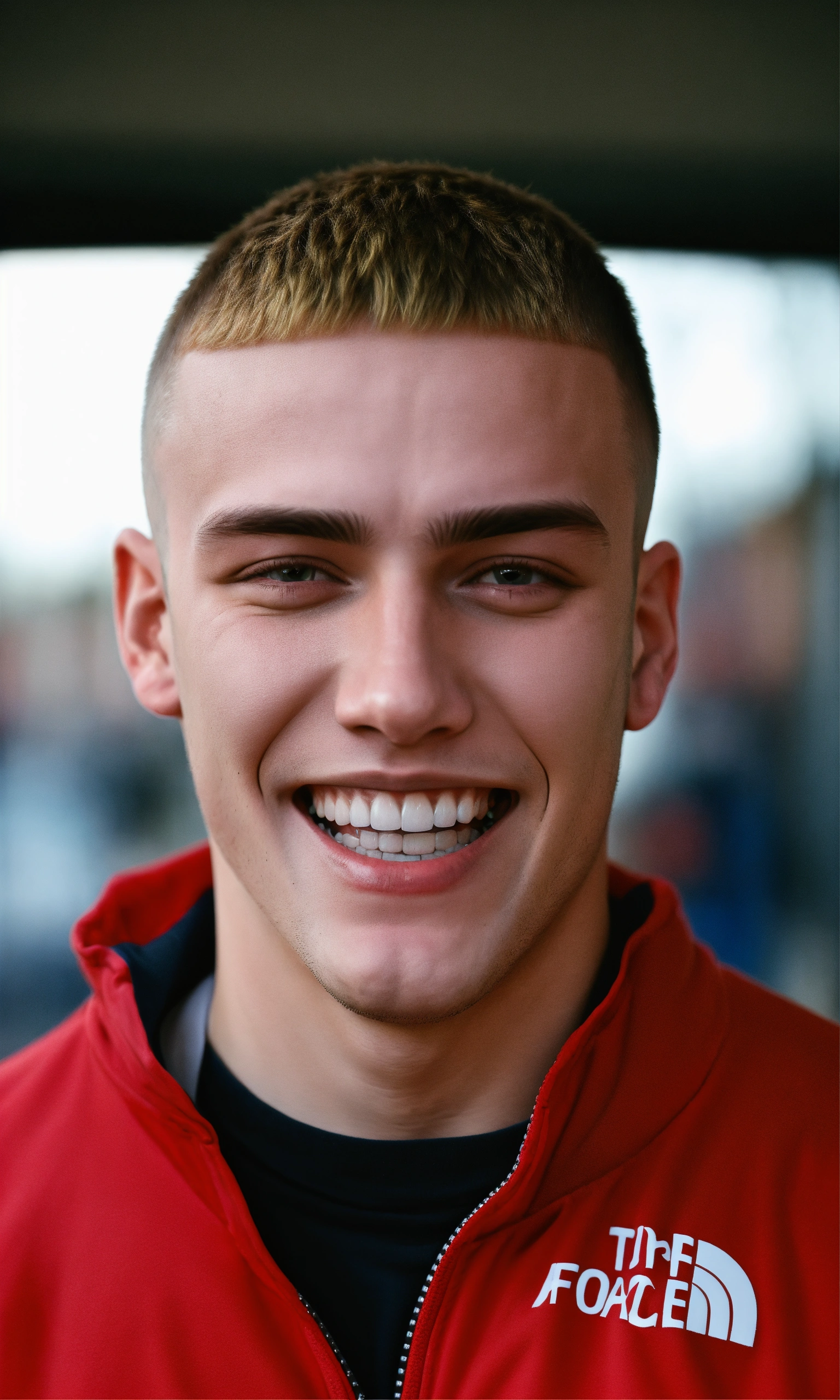 White british roadman chav, aged 21, he is wearing a north face tracksuit, he is showing off his huge white teeth