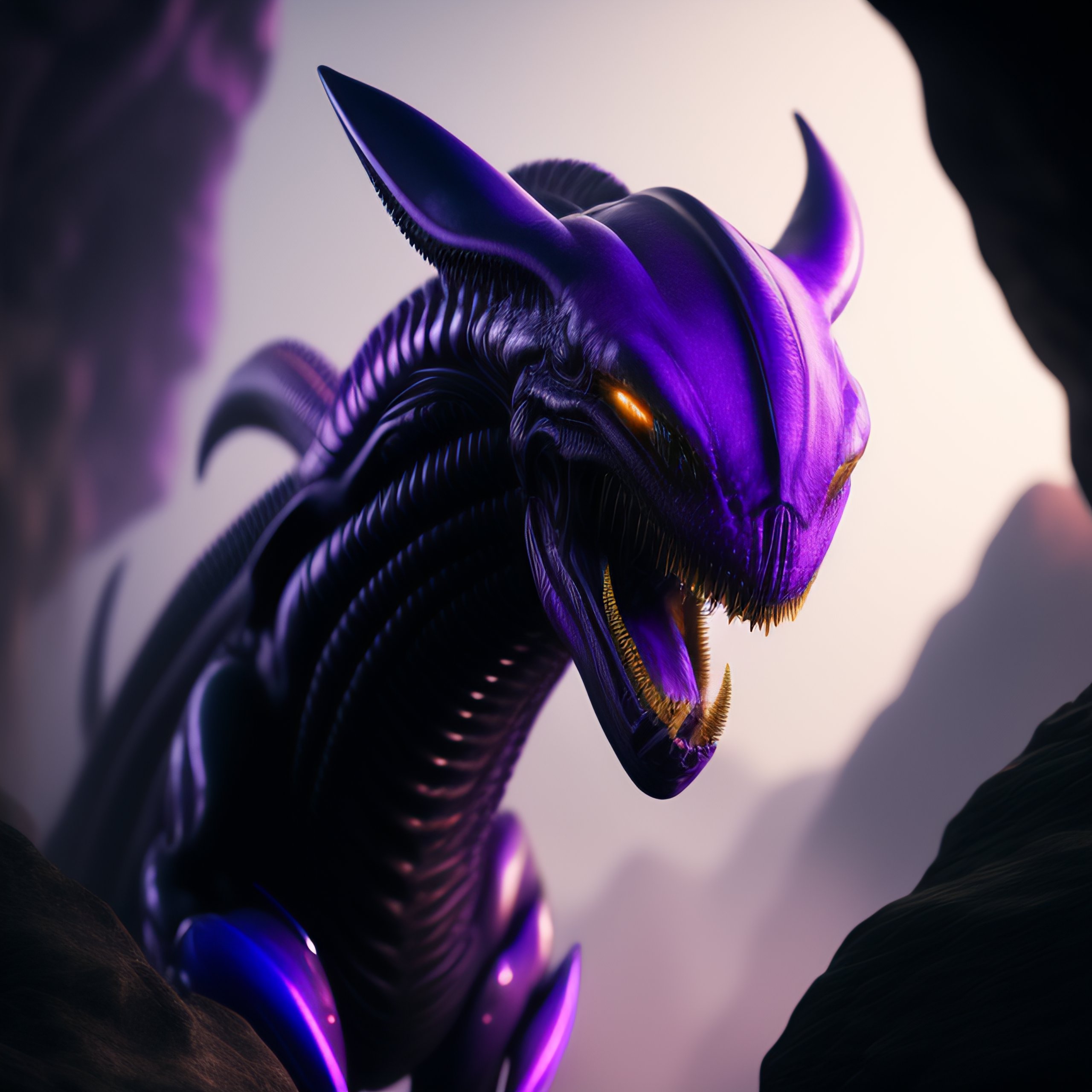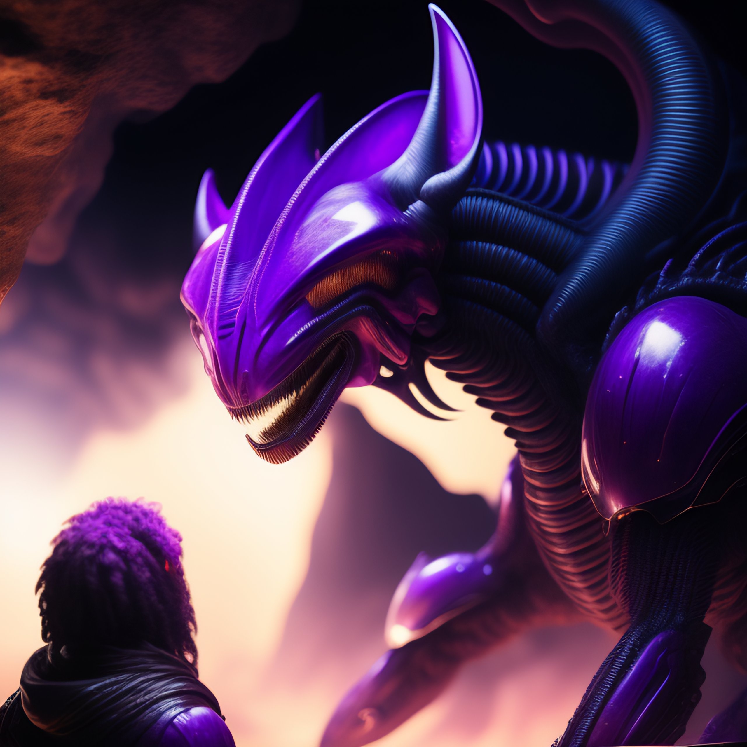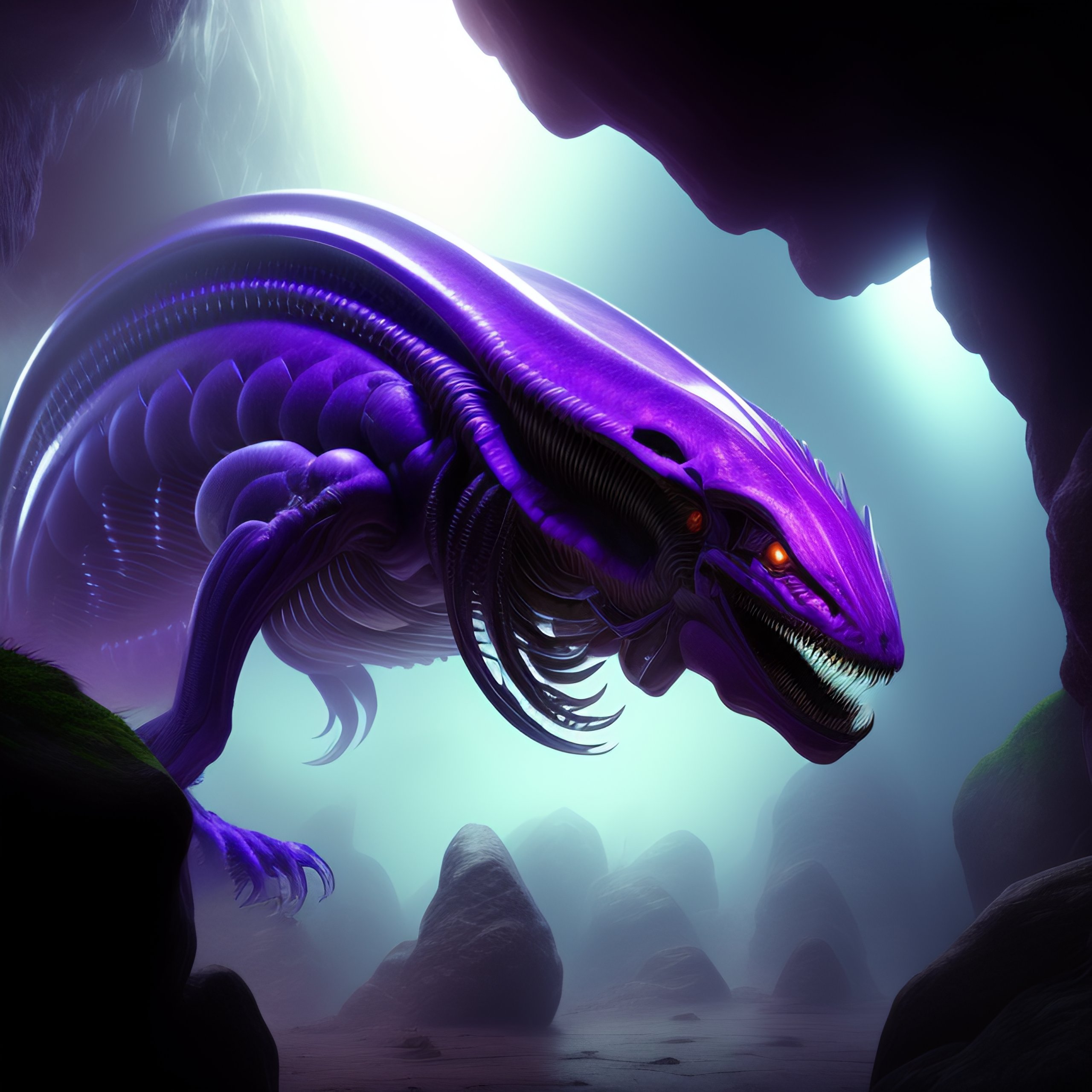 Puple humanoid xenomorph swarm crawling in cave, photorealism, dynamic lights, hr giger, alien, sci-fi monster, huge claws, big teeth, long head