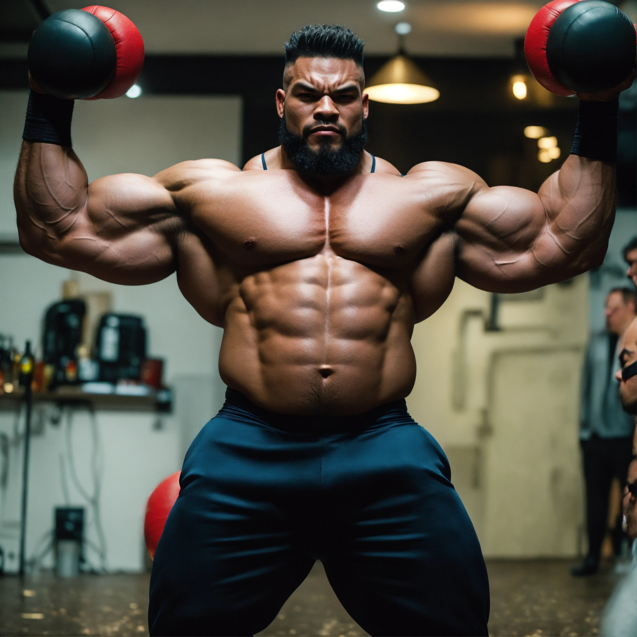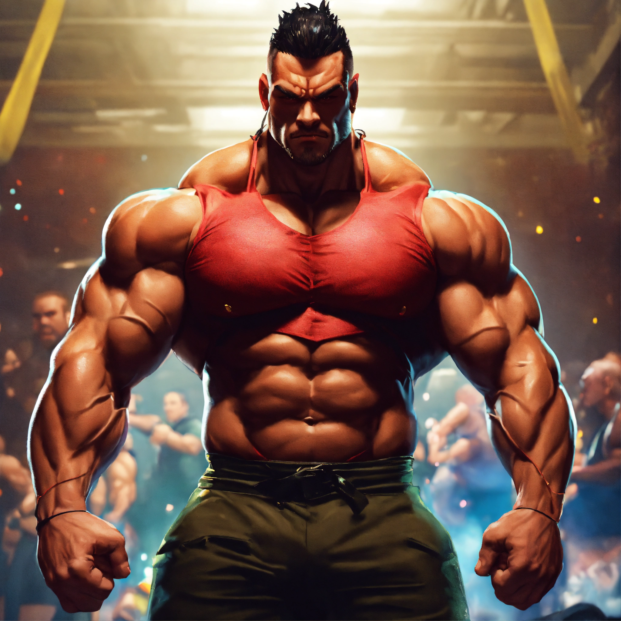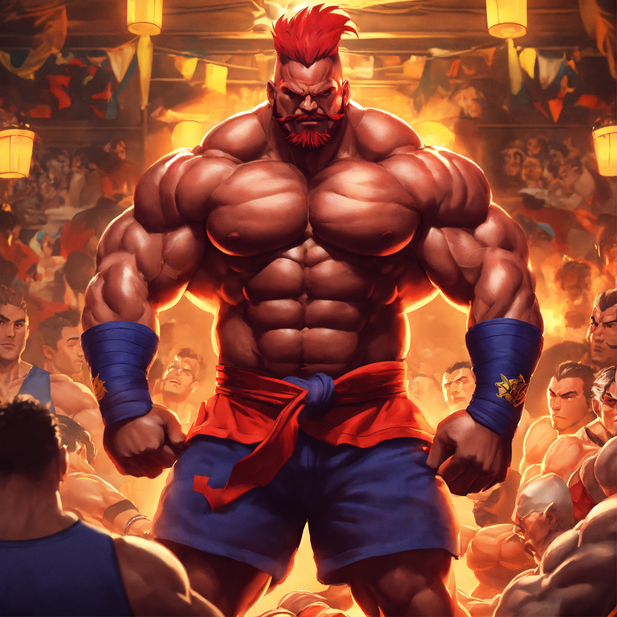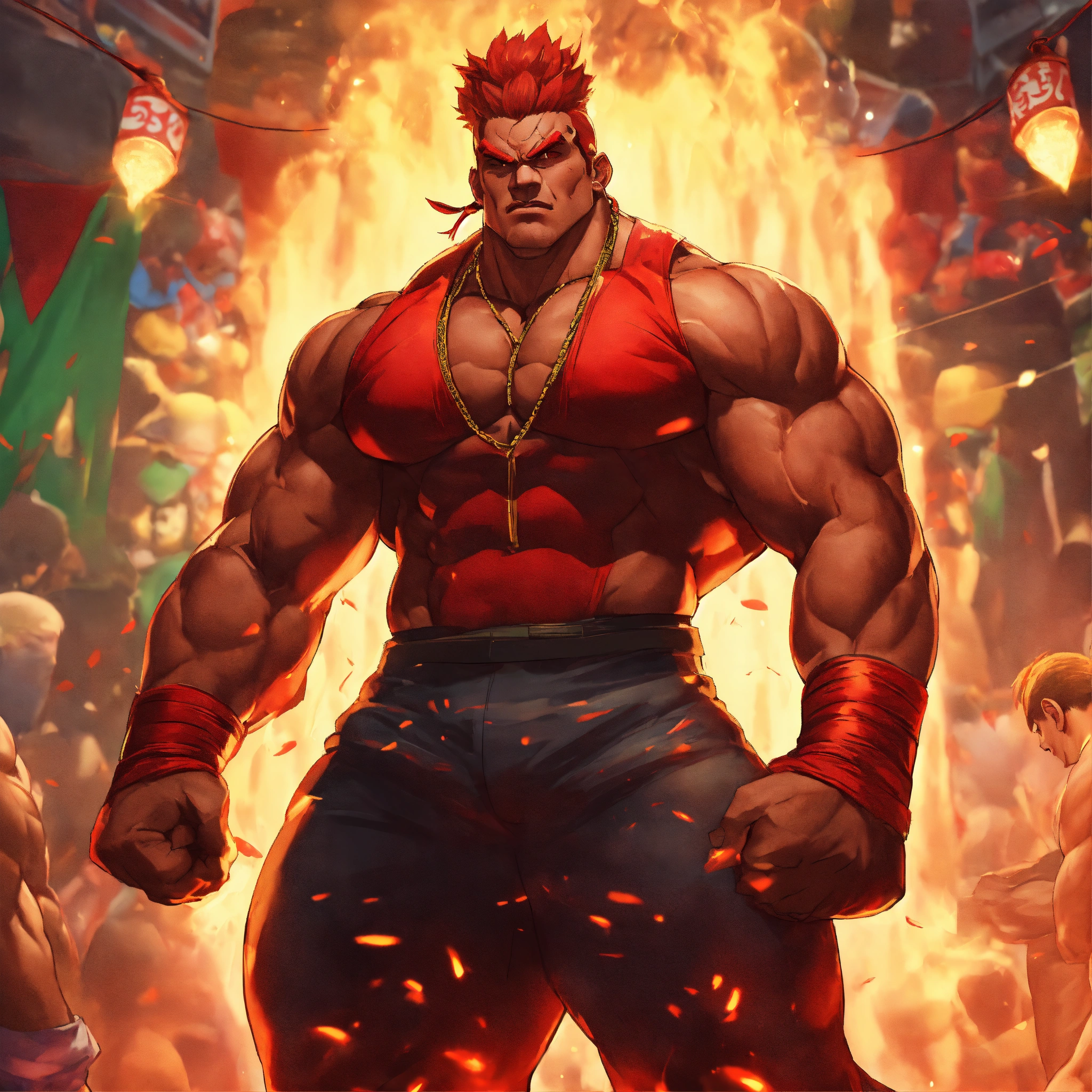 30-year-old man with big muscles, big bodybuilder, body like a wrestler, akuma from street fighter, at a party