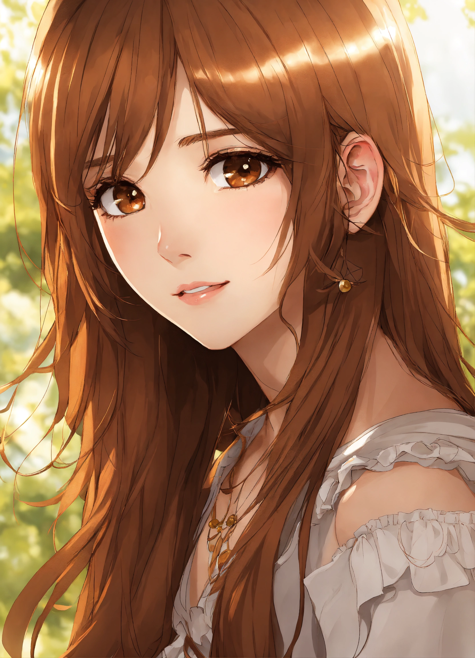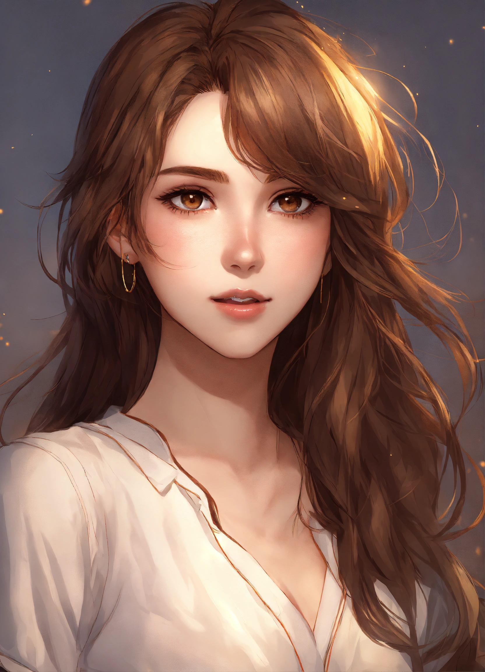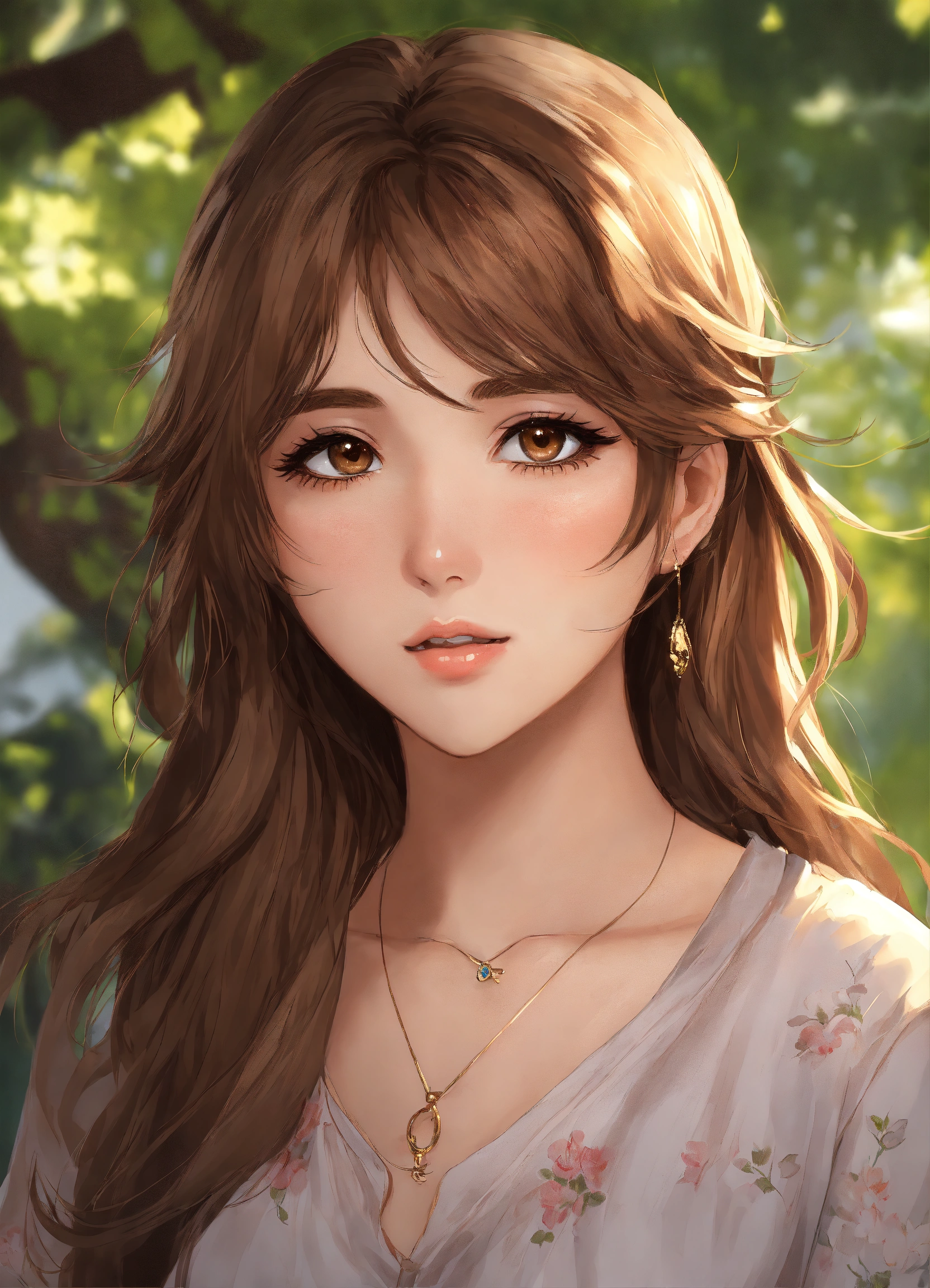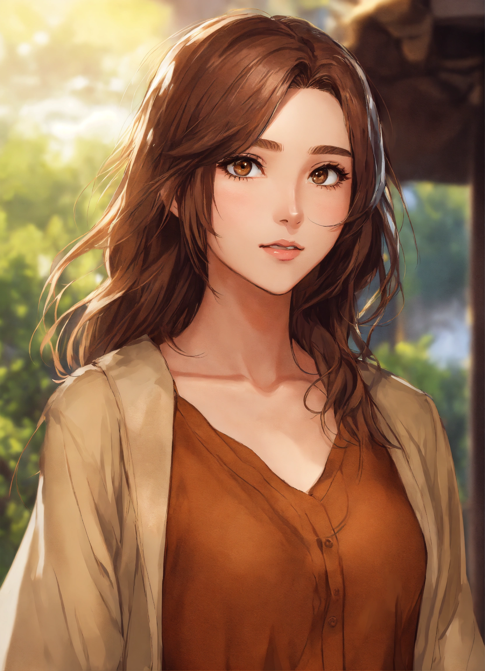 Woman 18 years old, shoulder length brown hair, beautiful face, soft facial features, height 175, feminine figure, brown eyes, anime reskin style
