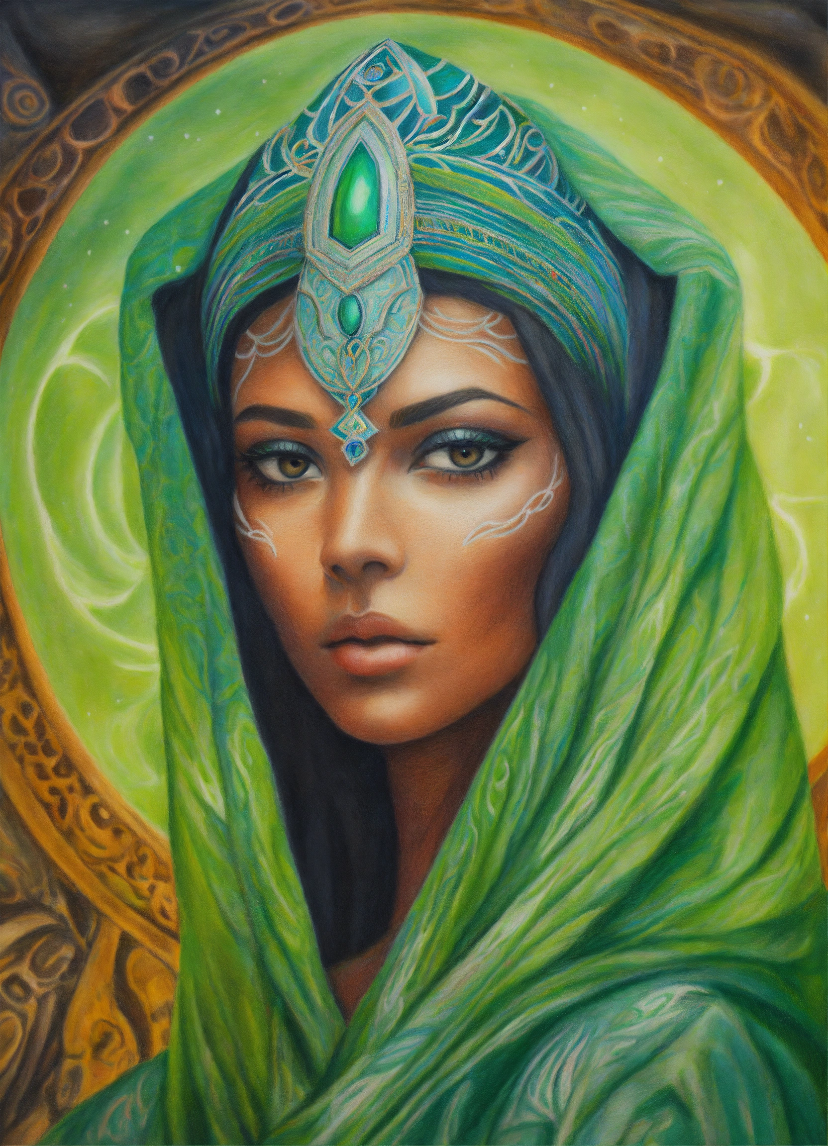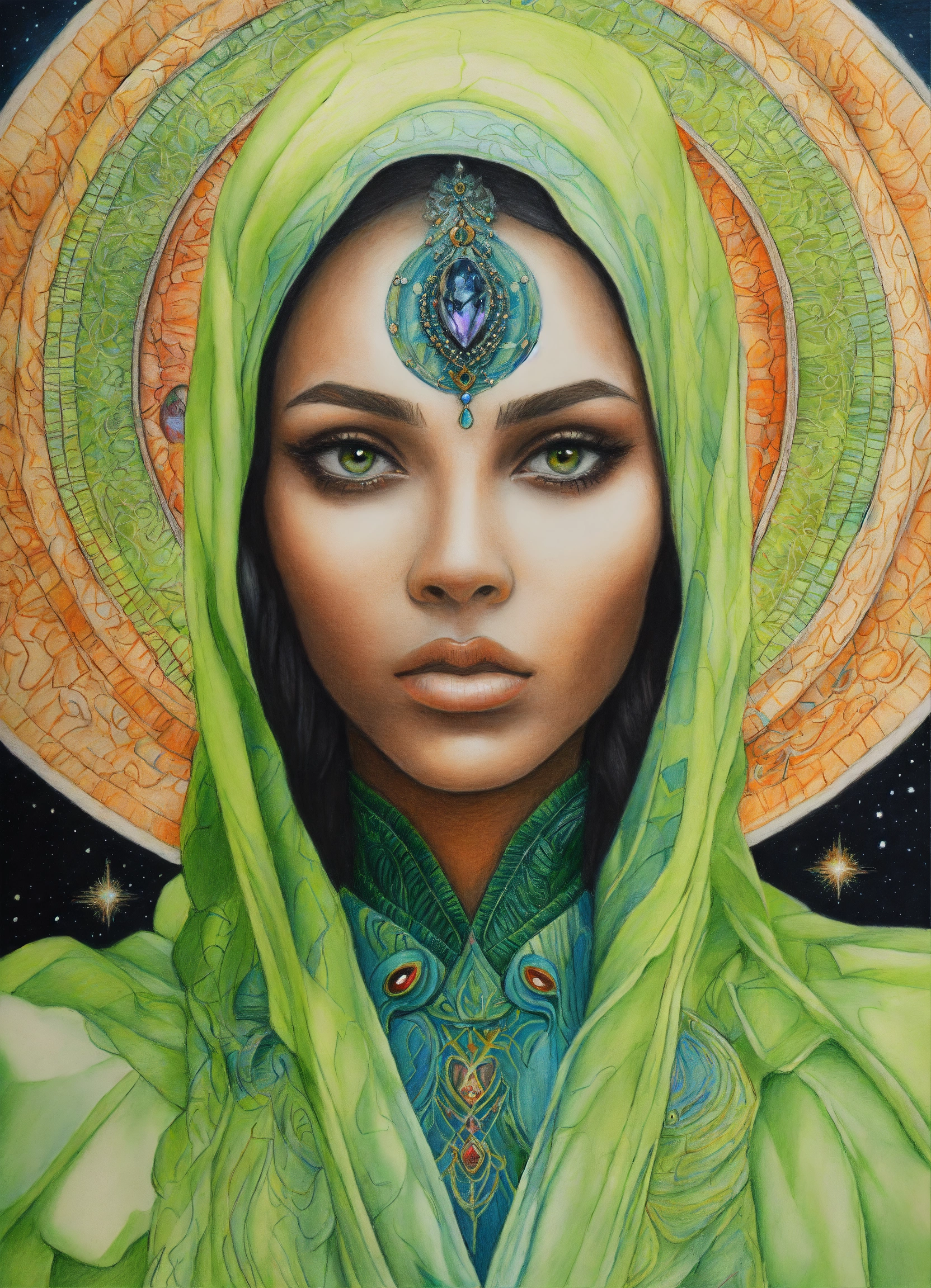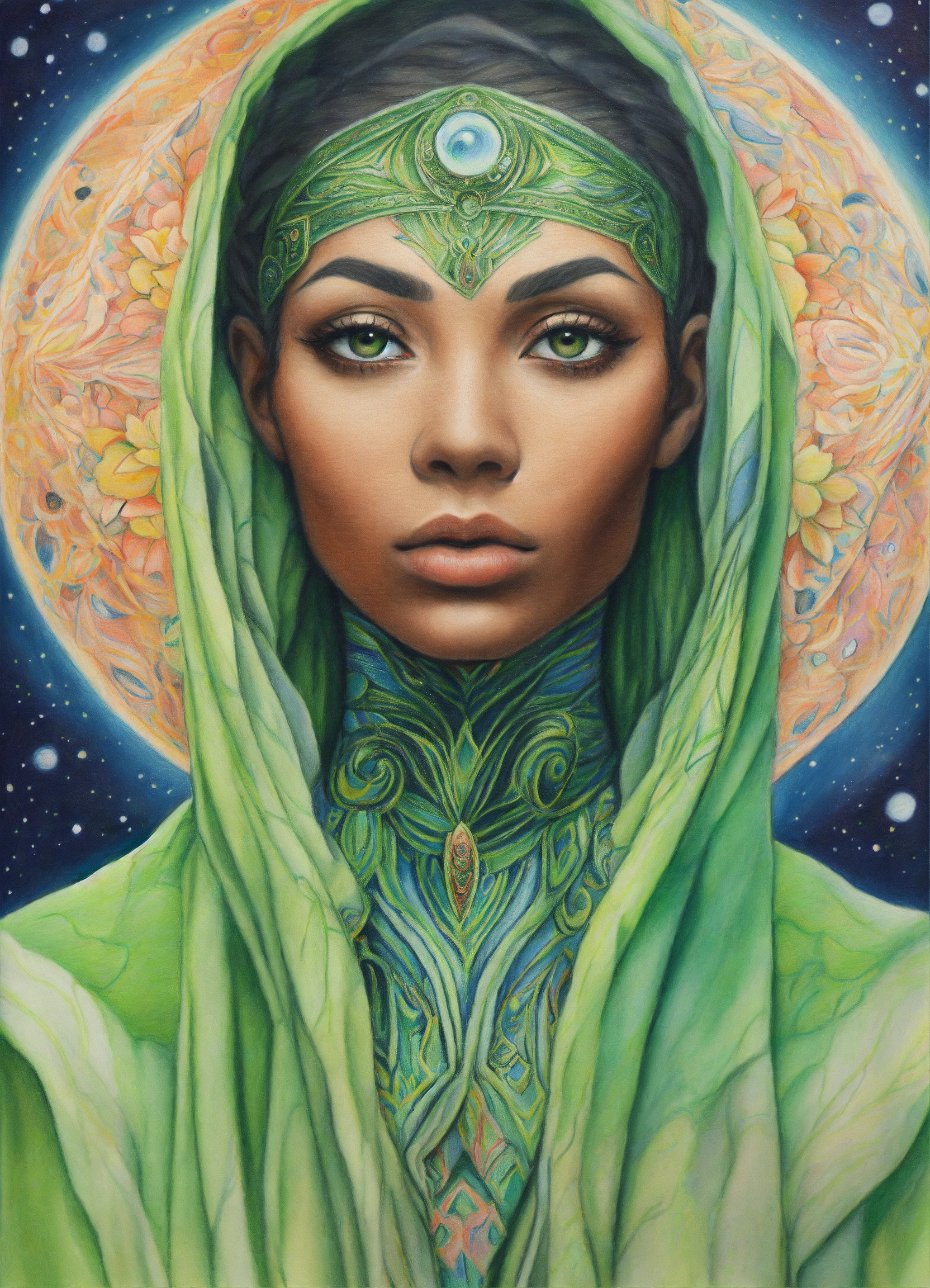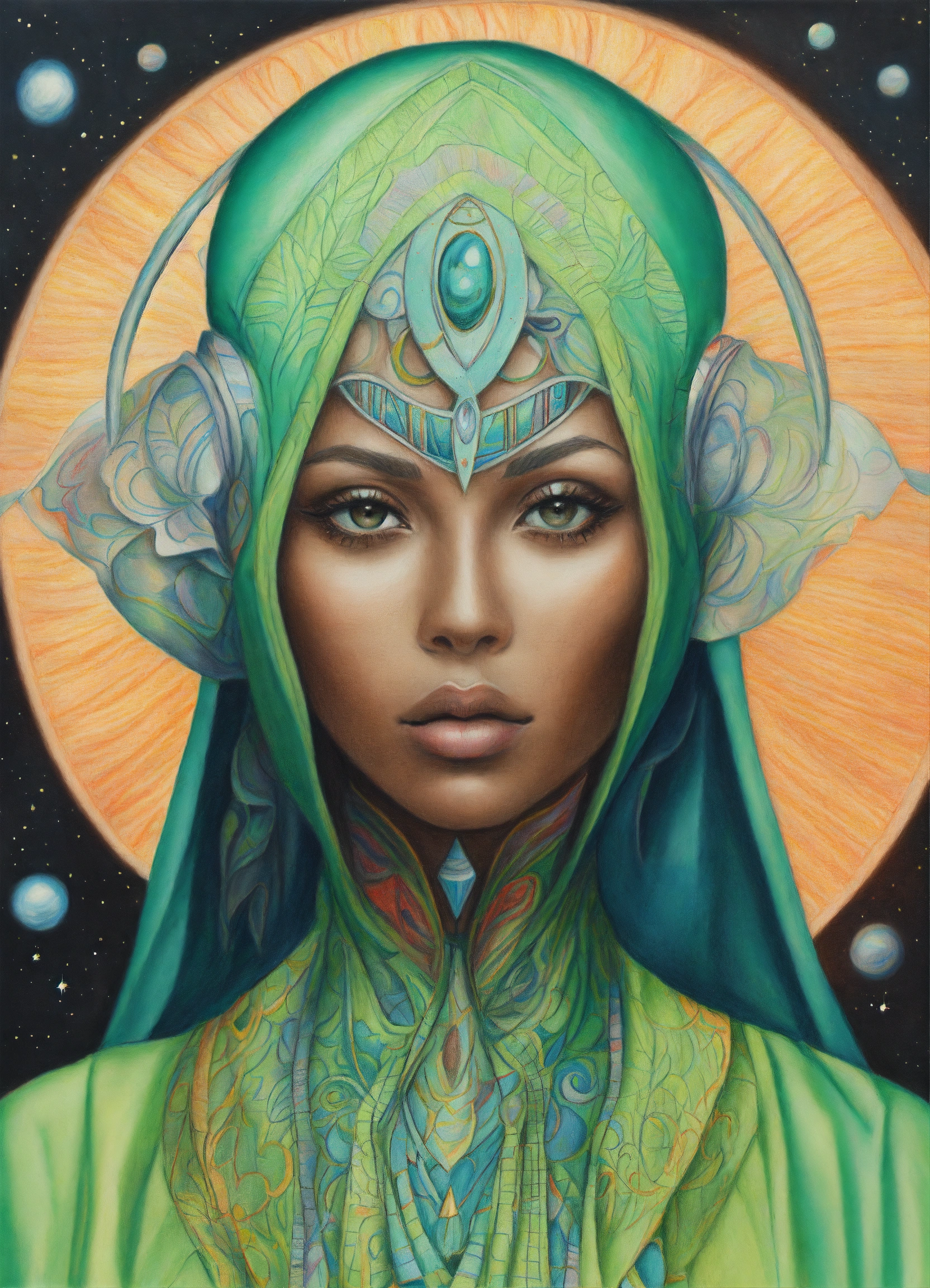 Colored pencil drawing of a portrait of a exotic face alien woman with loving black eyes, wearing a light green robe.spiritual art. cosmic elements.