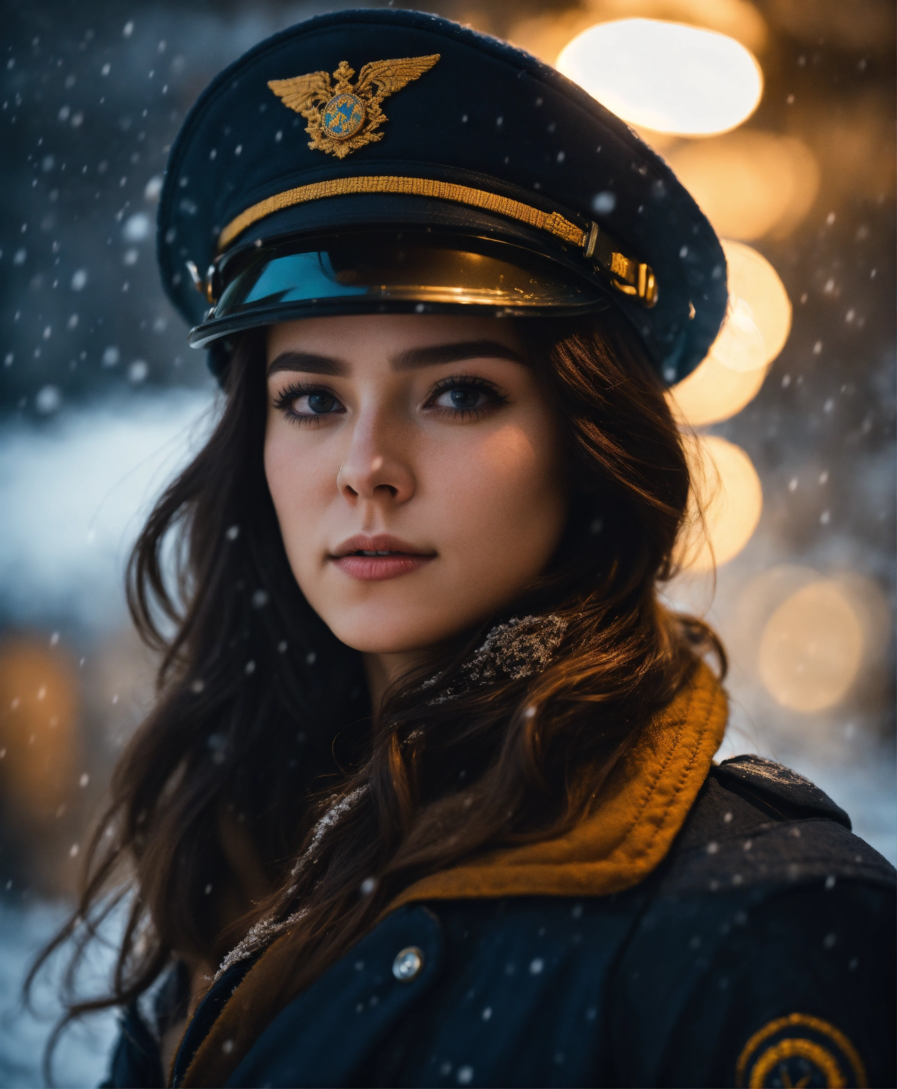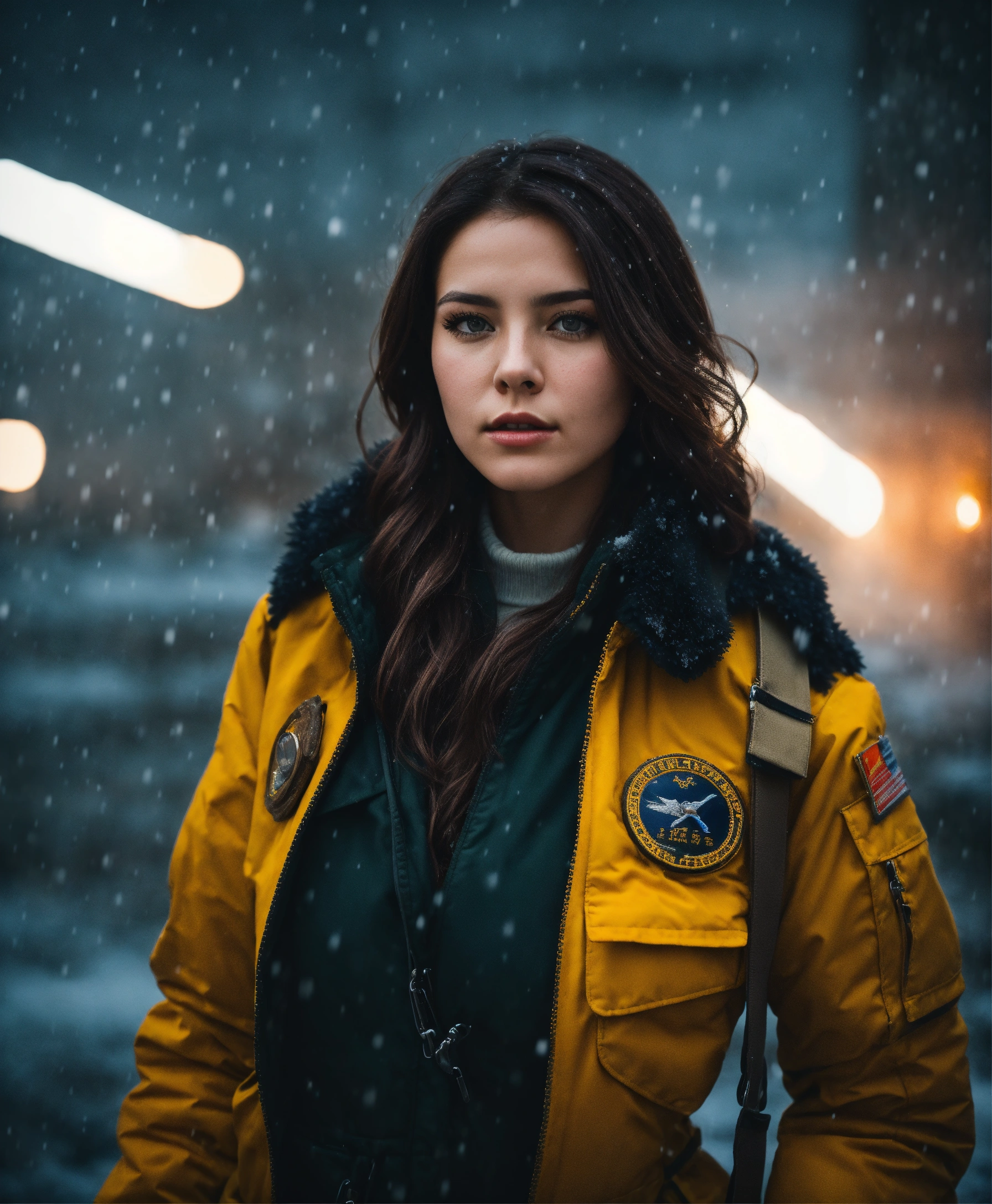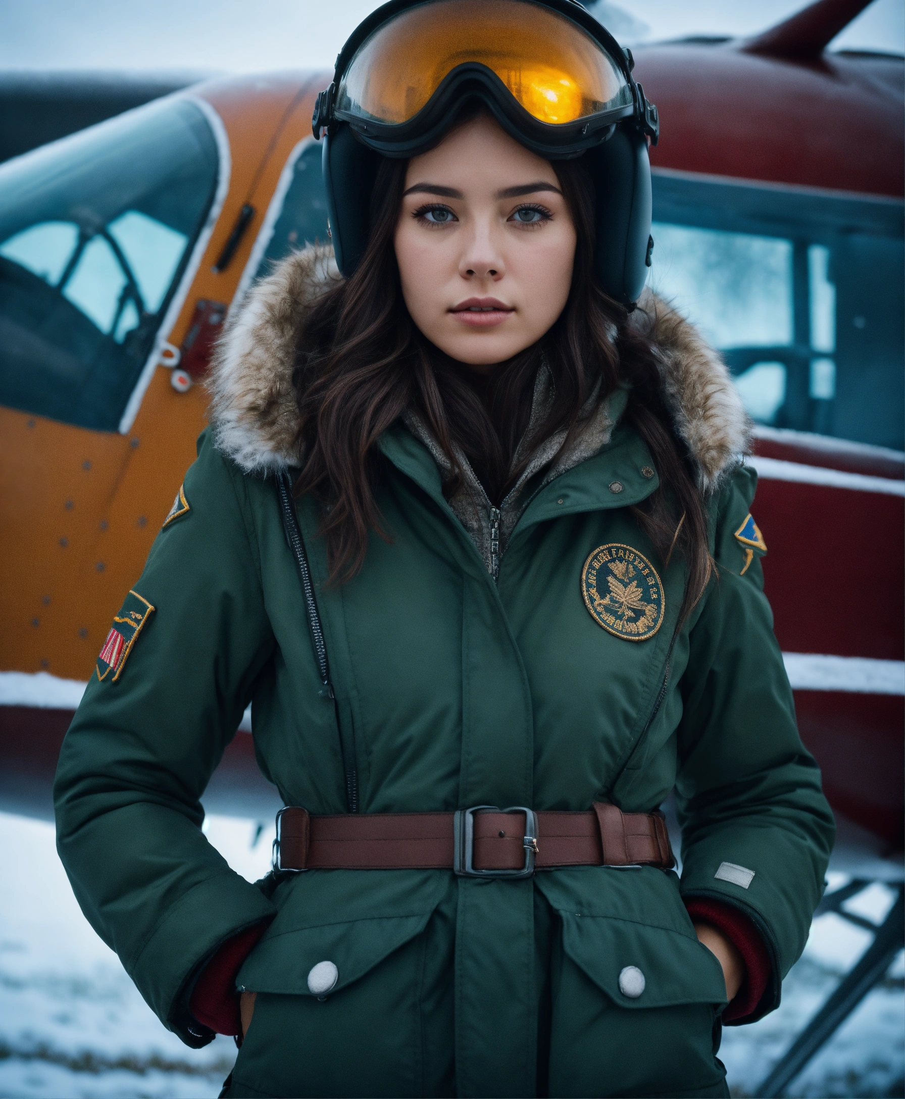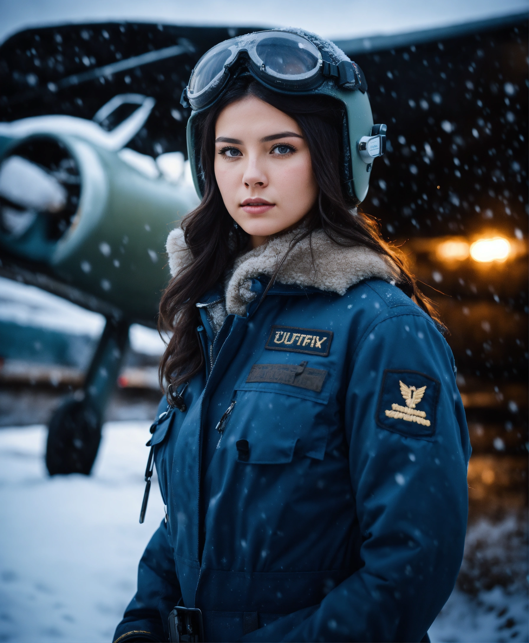 A beautiful brunette pilot girl, beautiful, moody lighting, best quality, full body portrait, real picture, intricate details, depth of field, in a cold snowstorm, fujifilm xt3, outdoors, bright day, beautiful lighting, raw photo, 8k uhd, film grain, unreal engine 5, ray travig