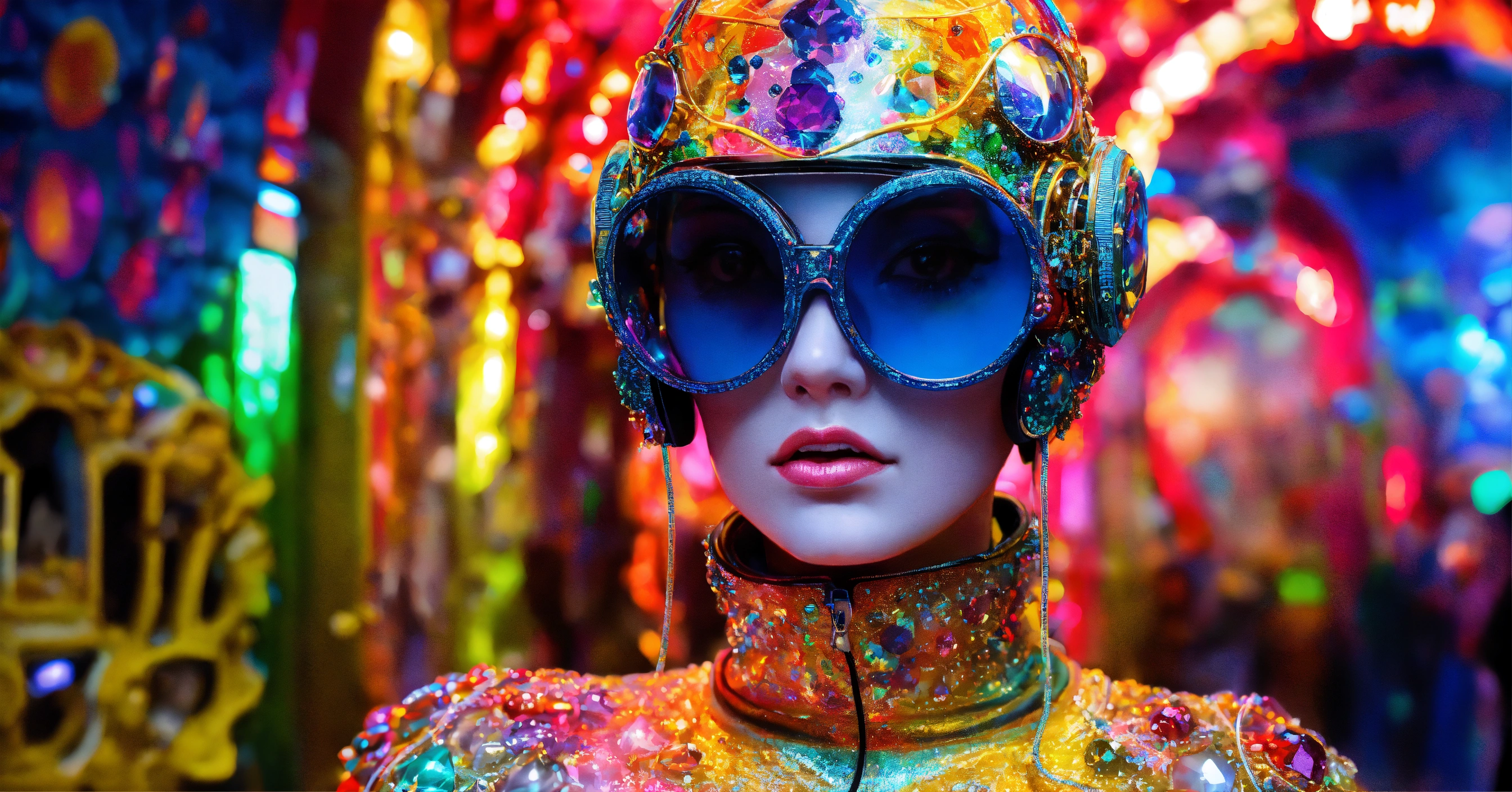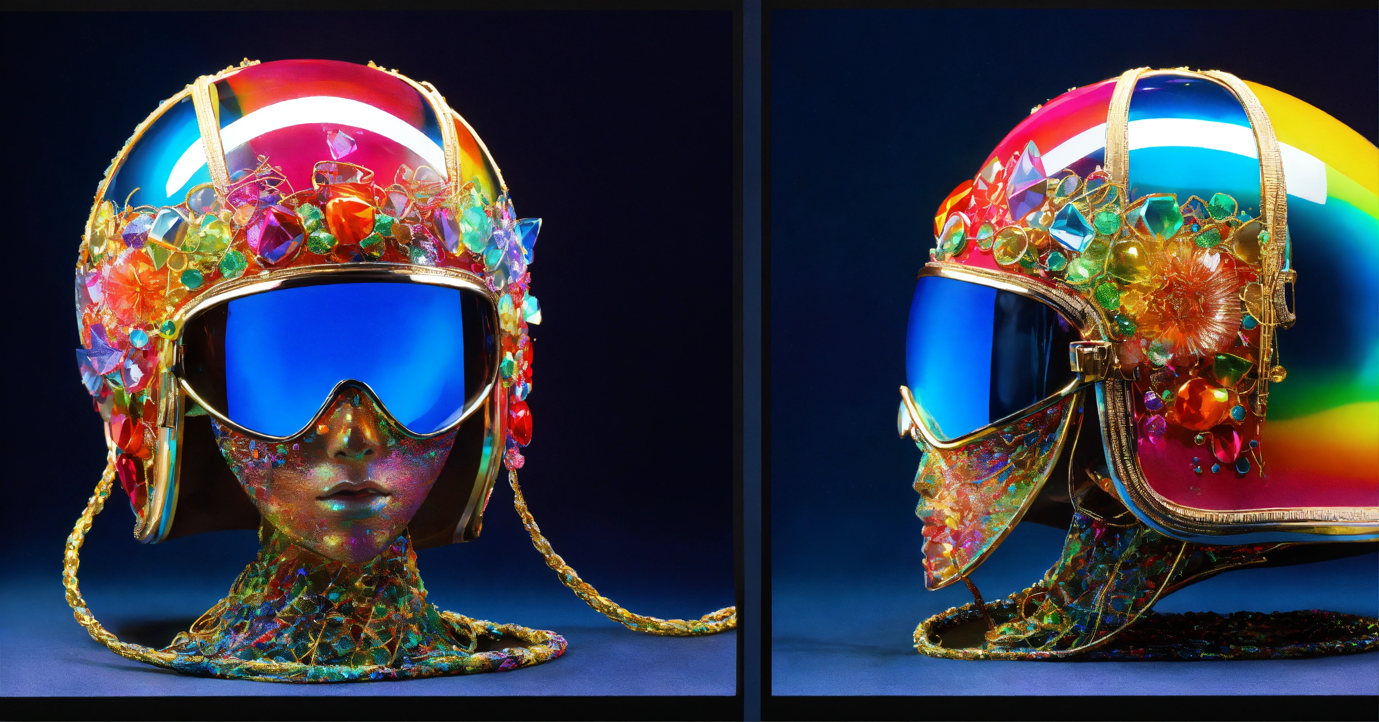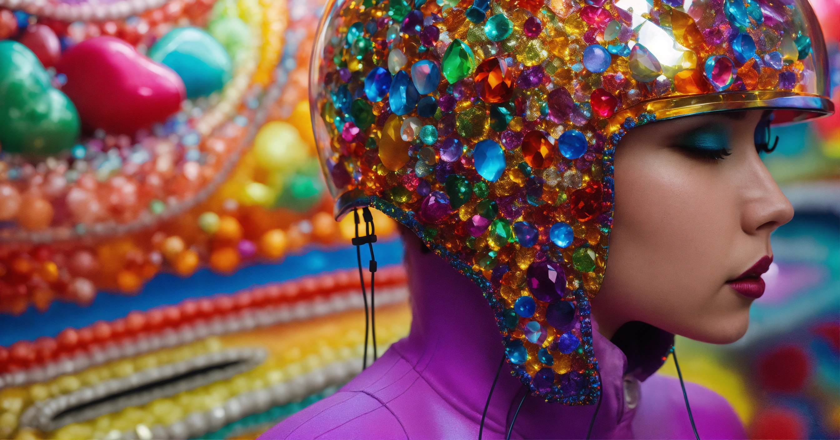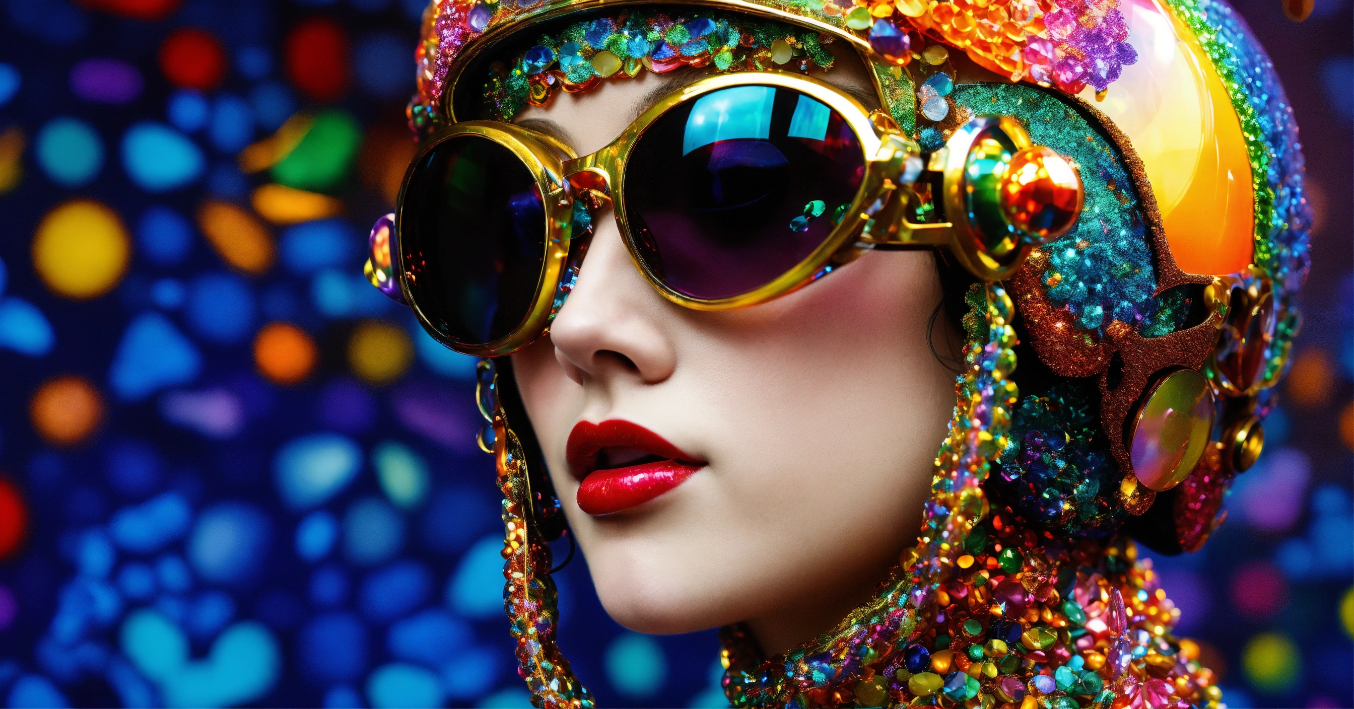 Sergio lopez, natalie shau, pop art, intricate crystal-clear helmet with holographic patterns profile of an eccentric individual, environment map with large multicolor gemstones and, in a vibrant rainbow colors with metallic accents rounded cables and wires, transparent color shells crystal-clear helmet with holographic patterns profile of an eccentric individualenvironment map with large multicolor gemstones and, in a vibrant rainbow colors with metallic accents rounded cables and wires, transparent color shells and wires shape a full 16k wearing a big full highly detailed colorful sunglasses, volumetric lighting, art by yayoi kusama, phuoc quan