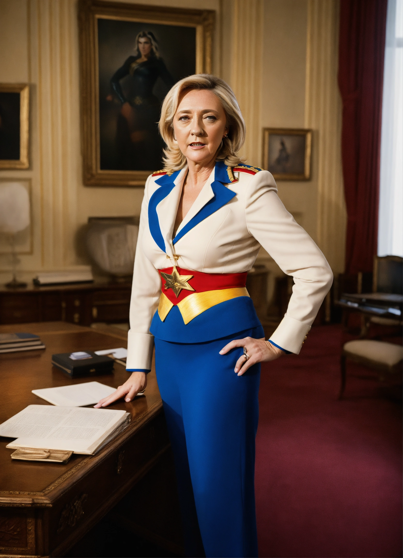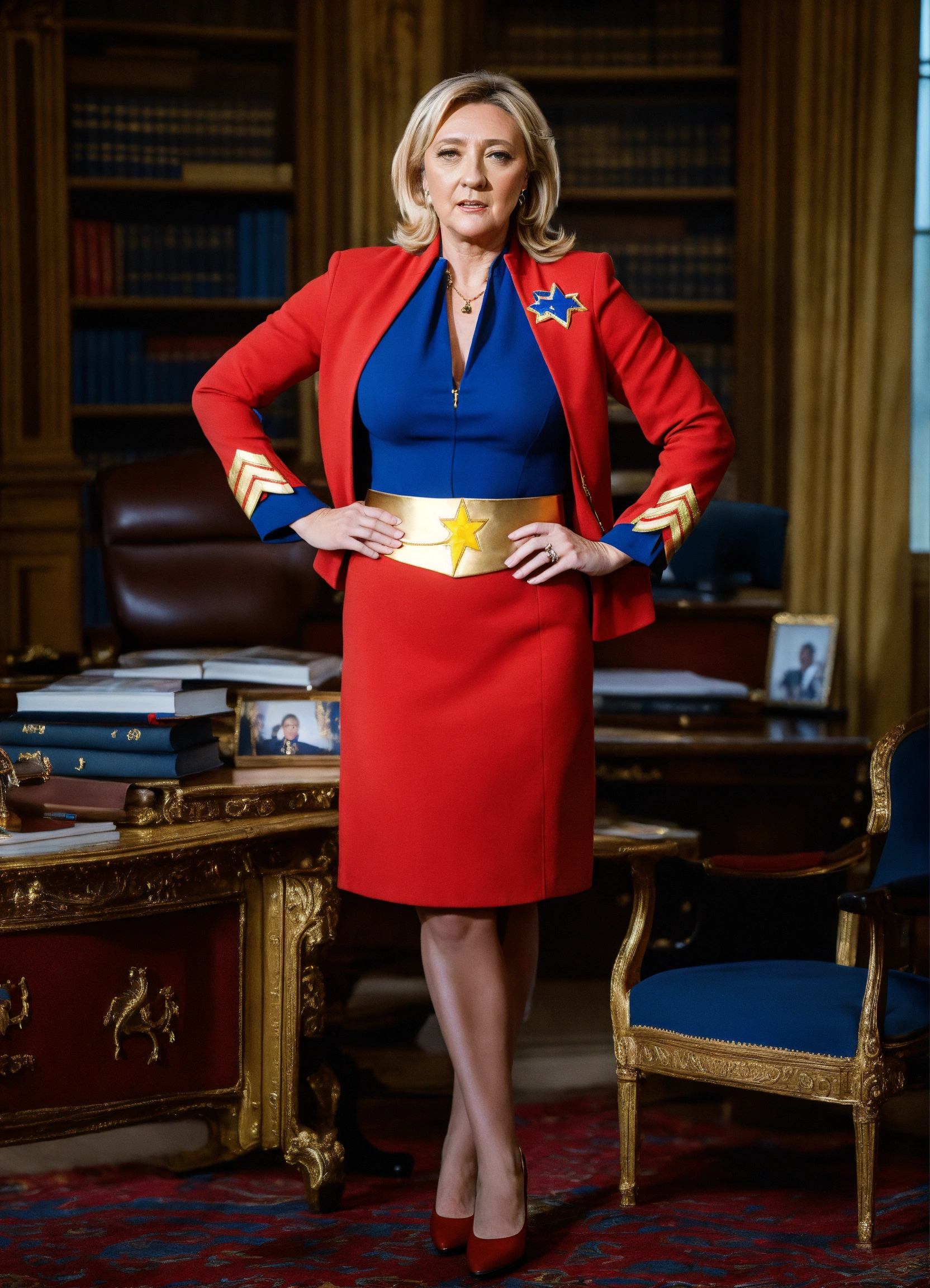 Full body photography of marine le pen in her president office dressed in the style of lynda carter in wonder woman