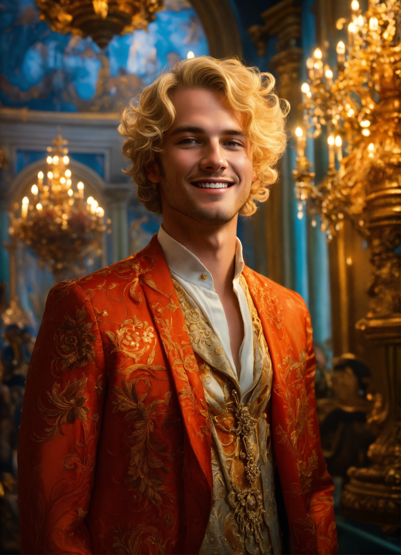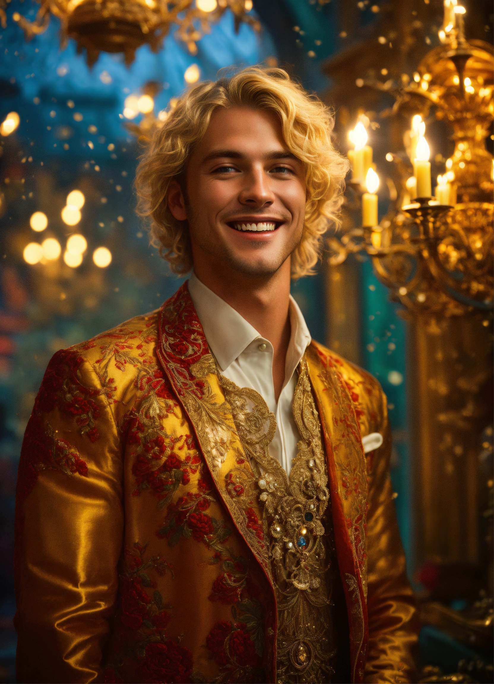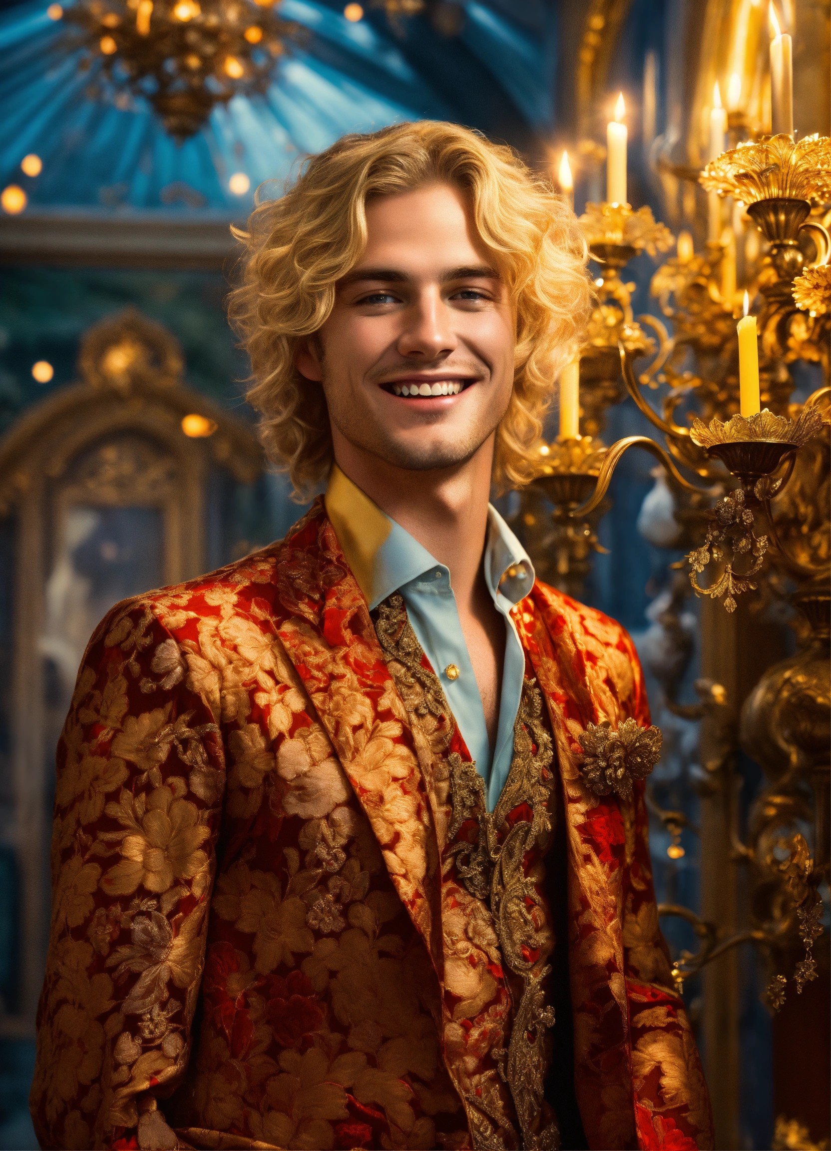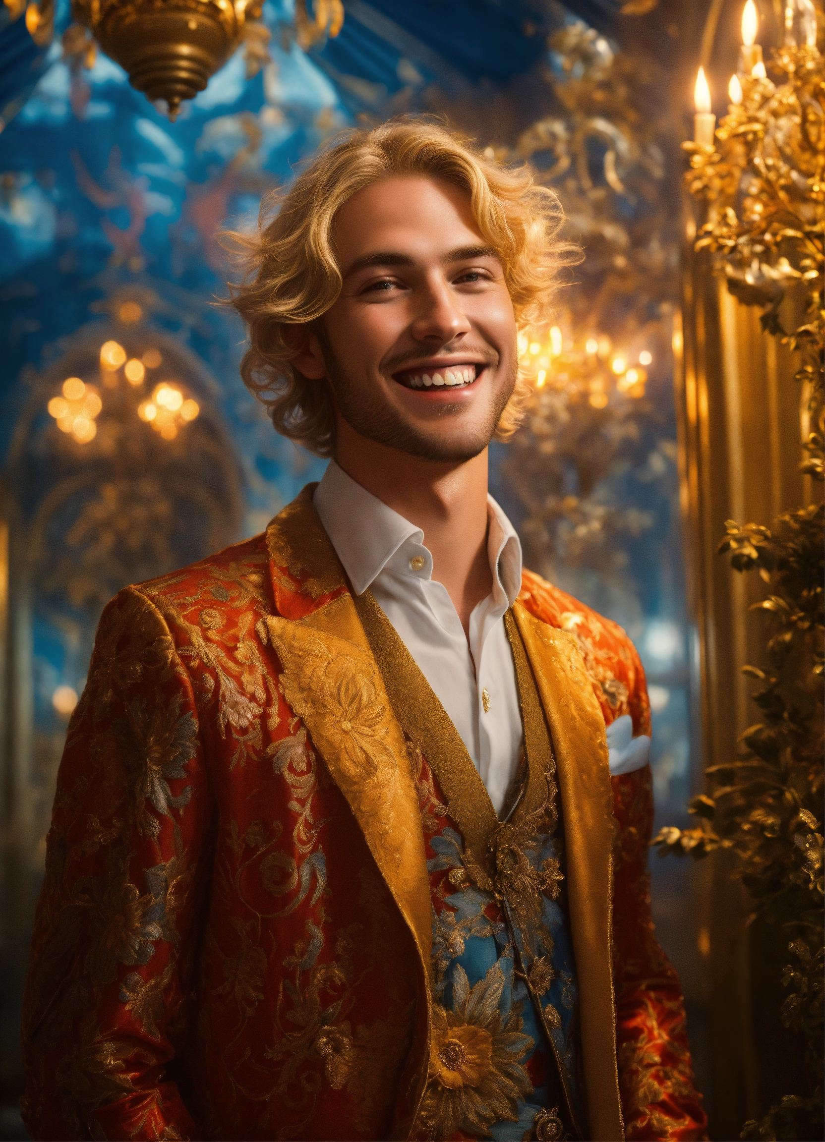 Man with blonde smiling photography, hyperrealistic, cinematic, detailed, high definition, classical, sunburst in heaven, in the style of lachapelle and aldridge ornate, dynamic, particulate, rich colors, intricate, elegant, highly detailed, the vogue, harper's bazaar art, fashion magazine, smooth, sharp focus, high definition, octane render