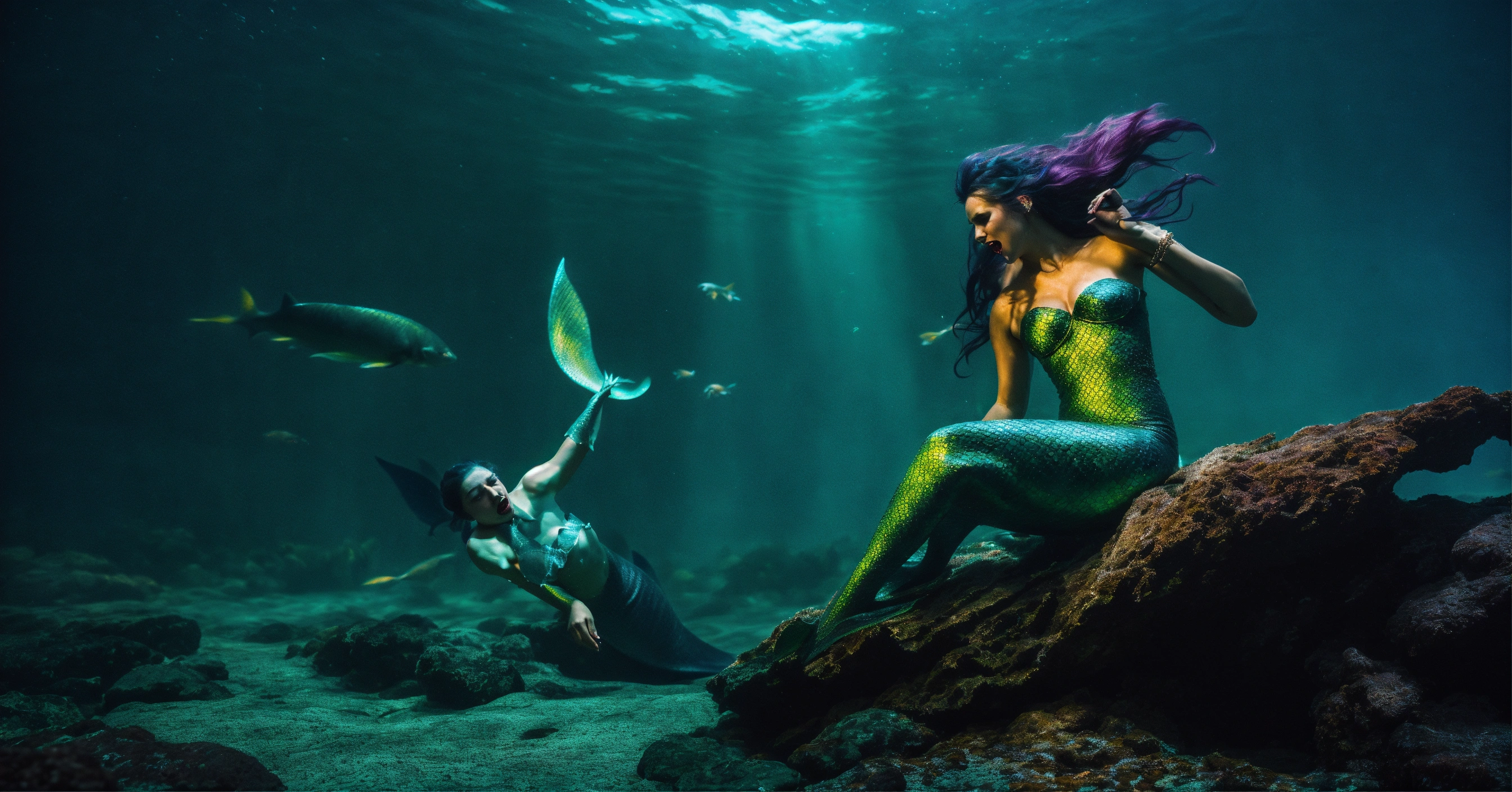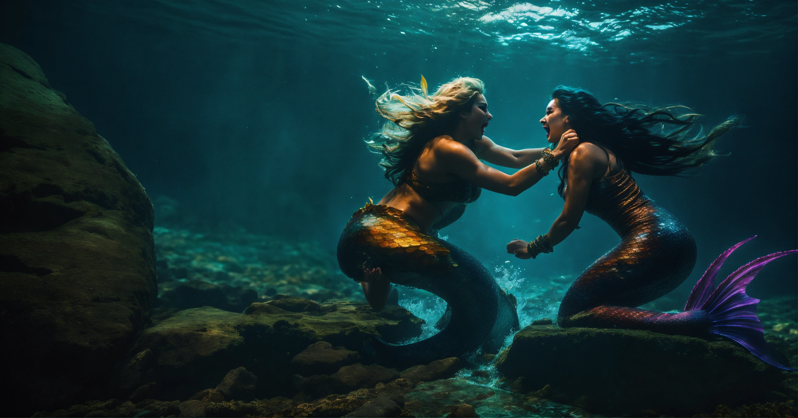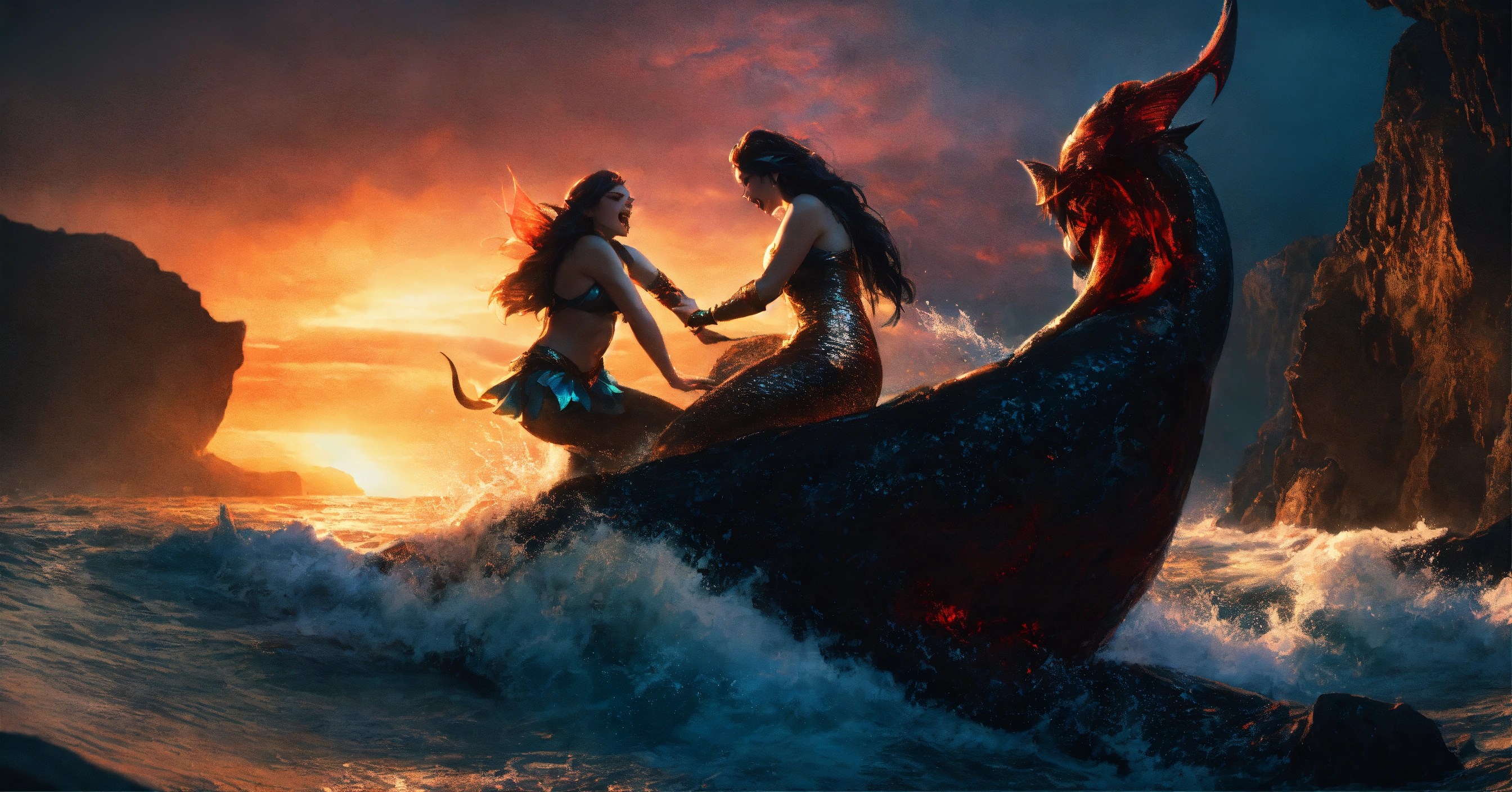 Create a 4k detailed photo of two evil mermaids fighting each other, dramatic lighting, mermaid tali, vampire fangs, rocky coast